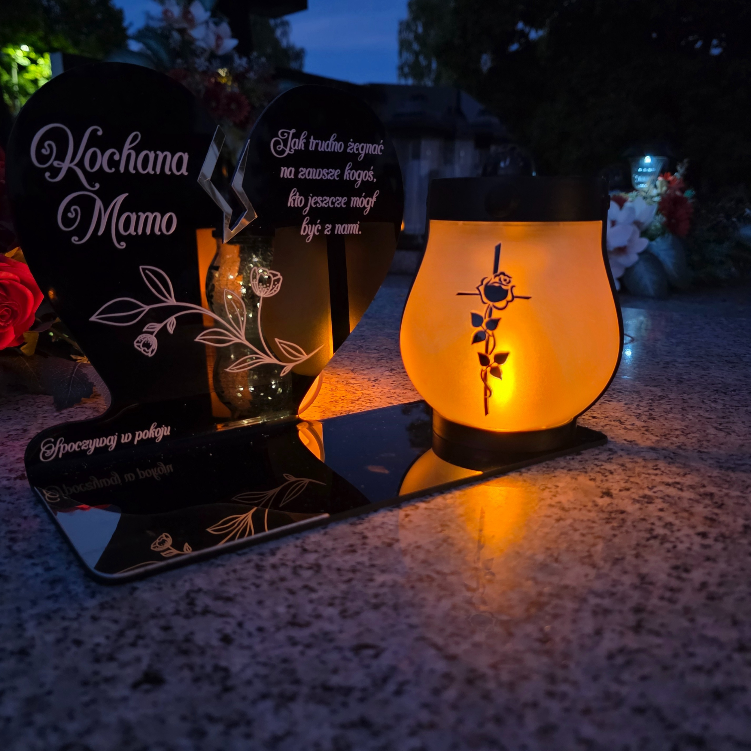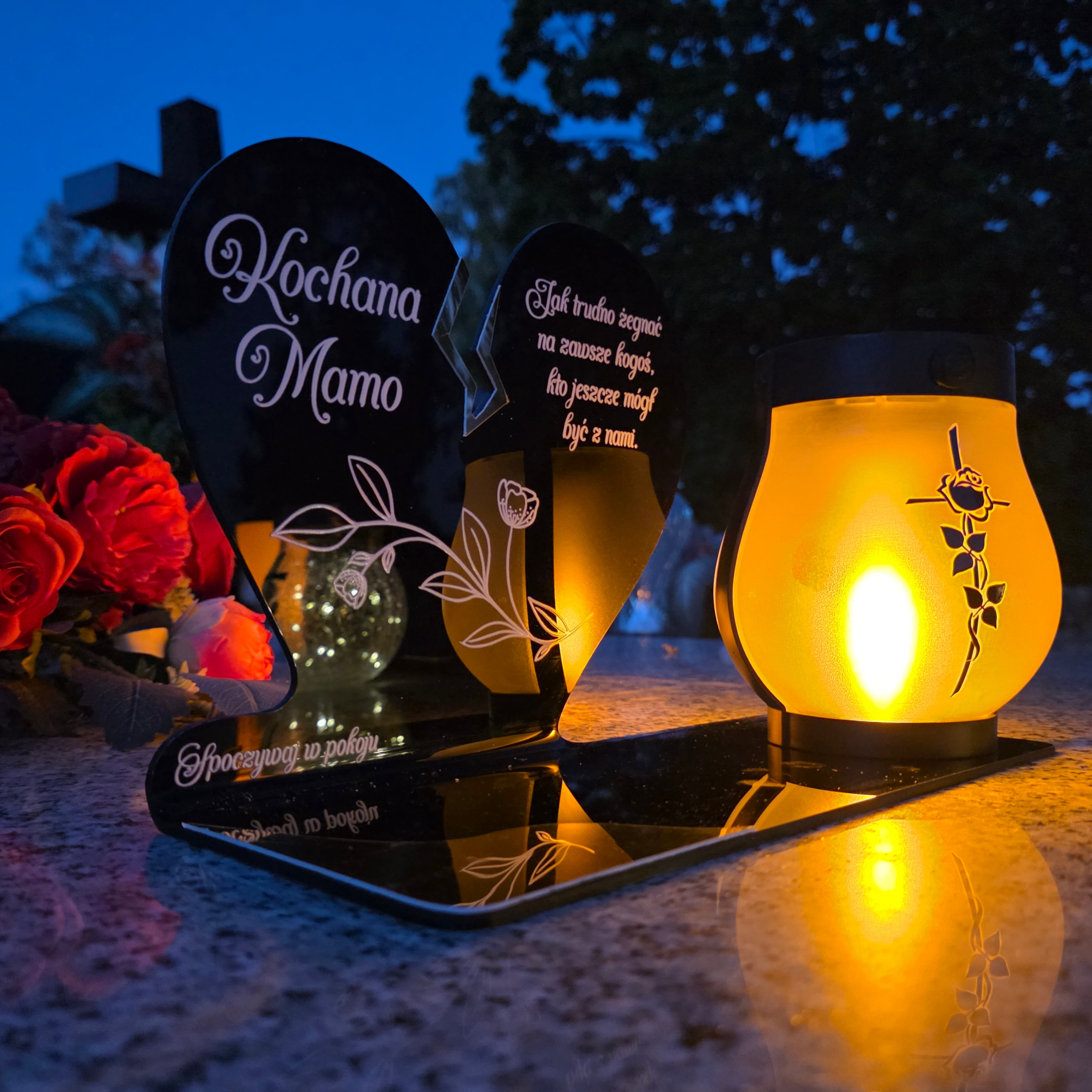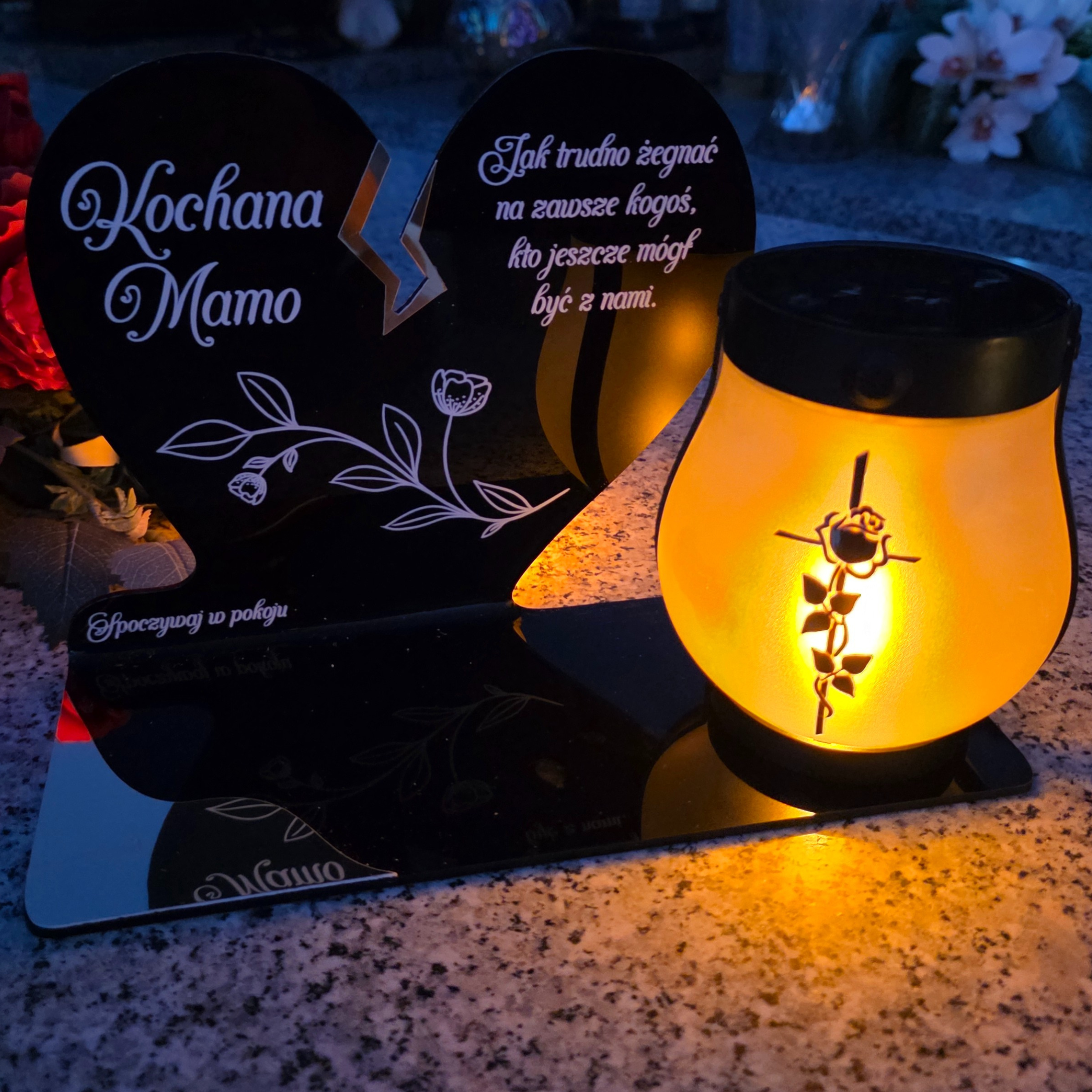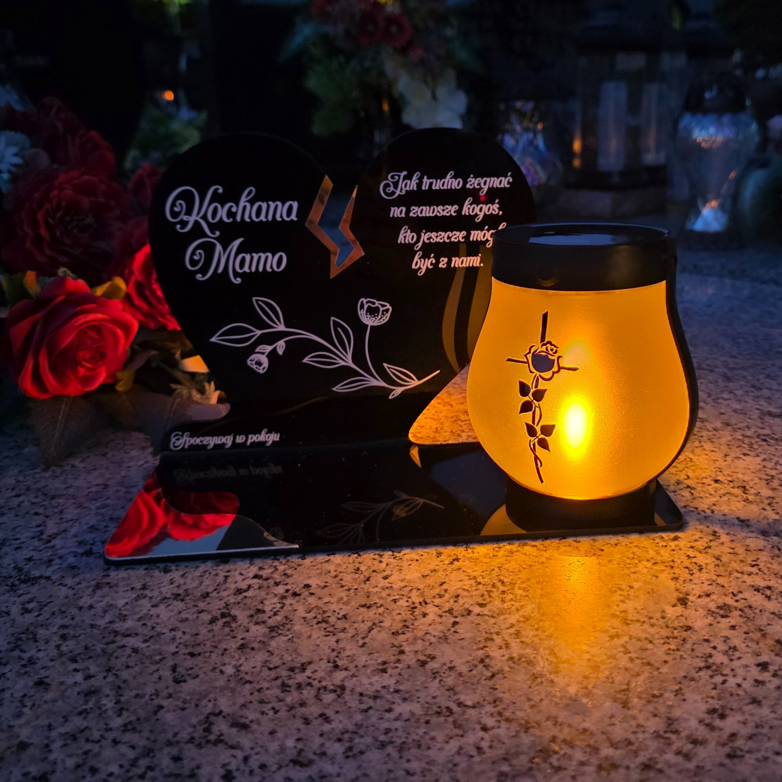 Wyjątkowy znicz nagrobny w formie czarnego serca z delikatnym złotym pęknięciem to symbol miłości, pamięci i szacunku. Elegancka forma połączona z nowoczesną, solarną lampką LED tworzy kompozycję, która po zmroku rozświetla pomnik ciepłym, bursztynowym blaskiem. Lampka ma dwa tryby świecenia (efekt płomienia lub światło stałe) i działa również po doładowaniu USB-C.