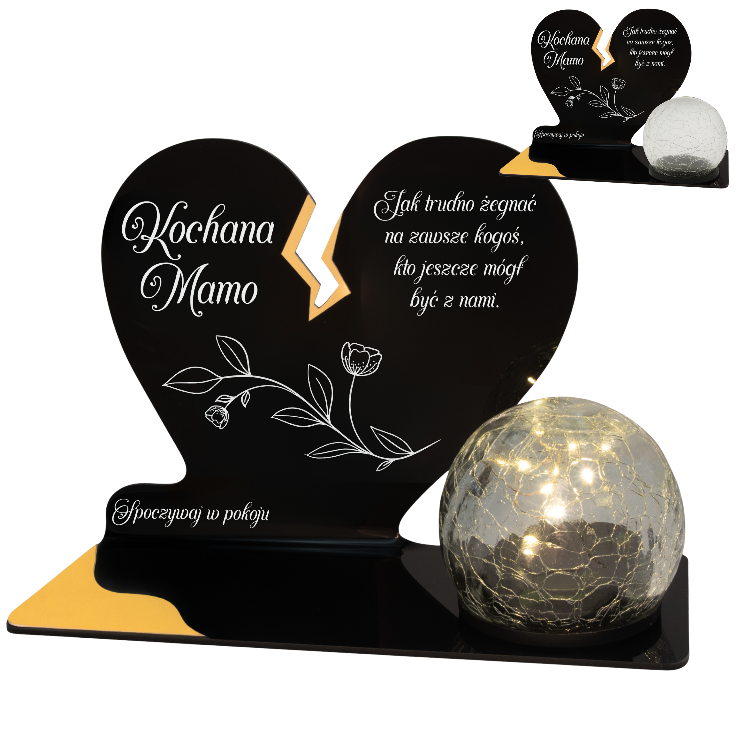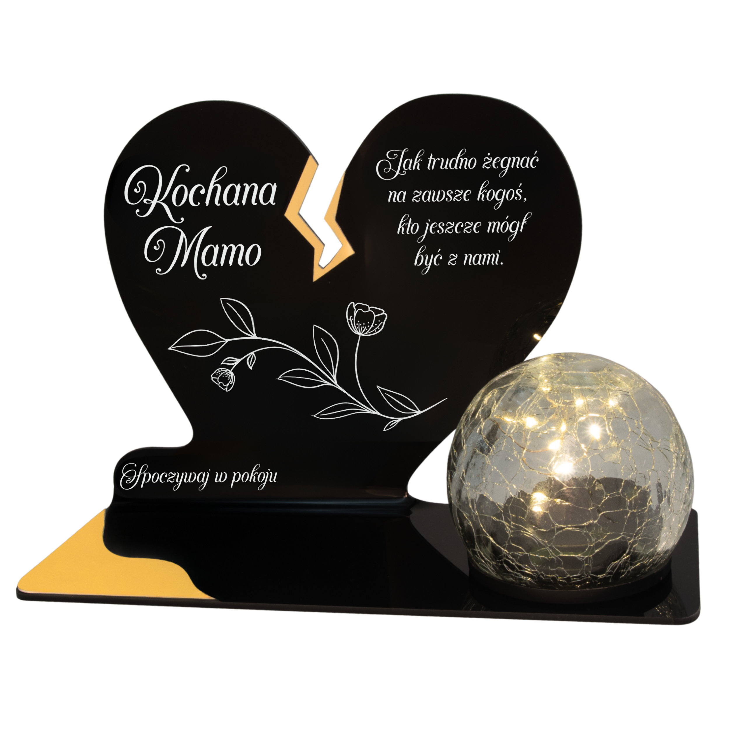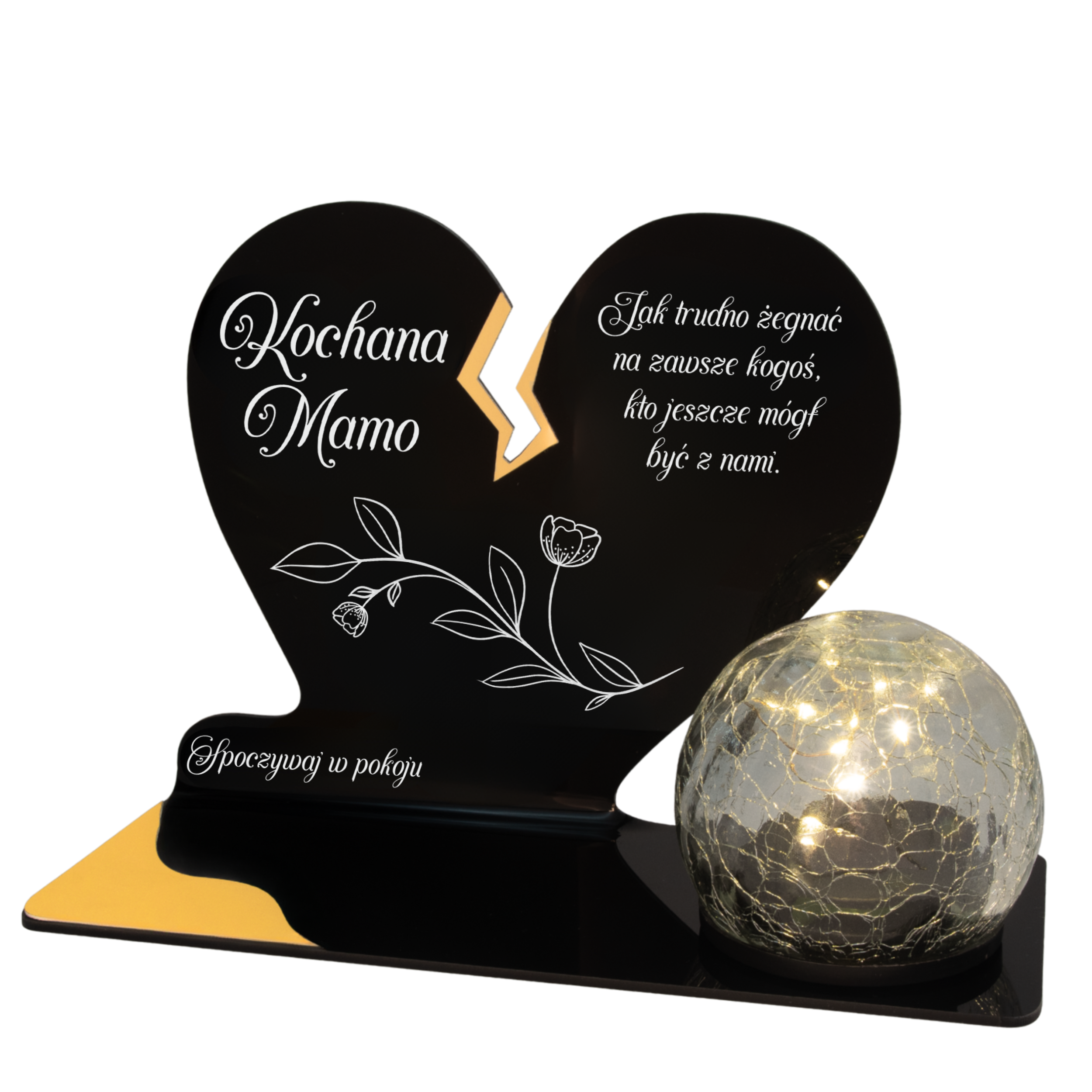 Elegancki znicz nagrobny dla Mamy – serce ze złotymi akcentami i solarną kulą LED
