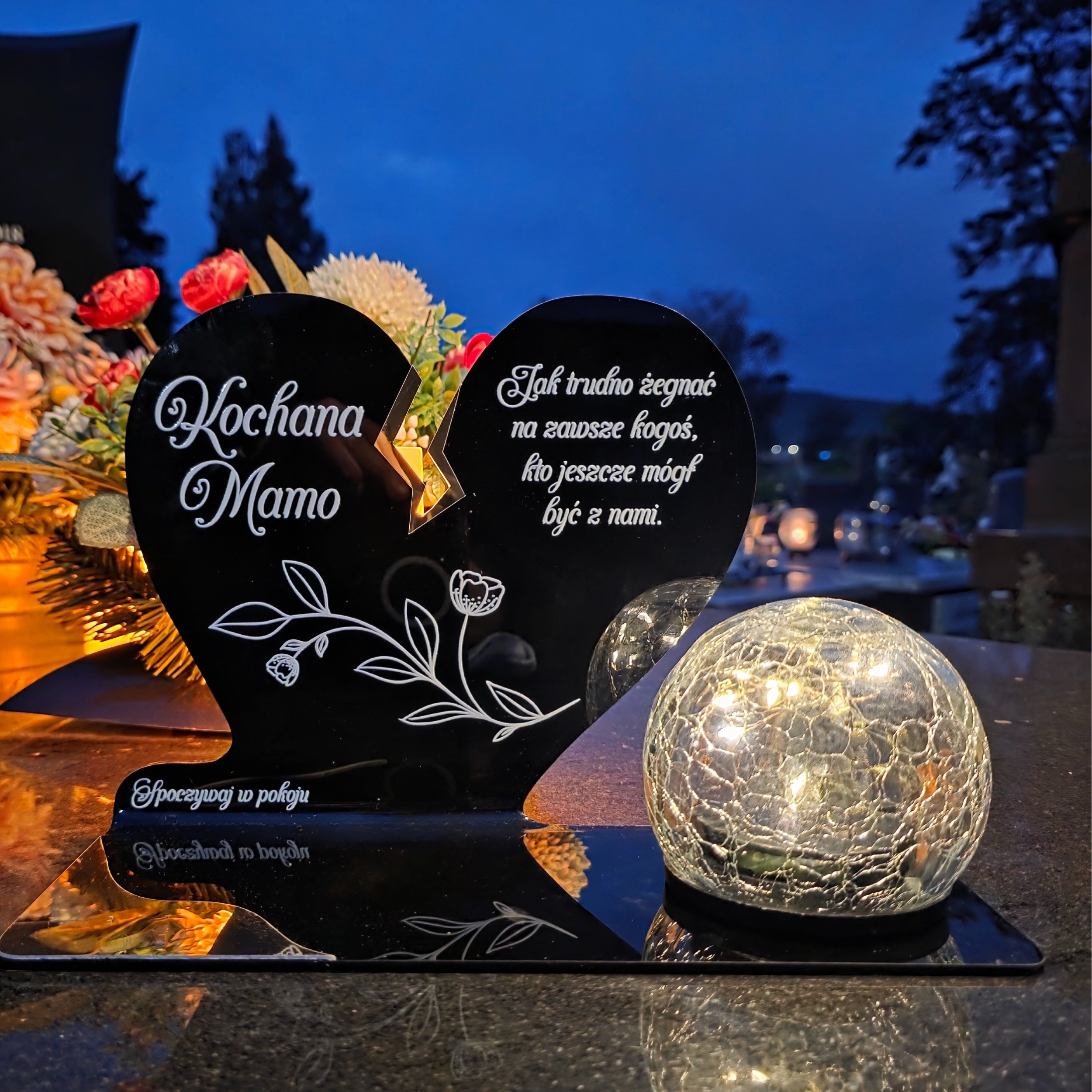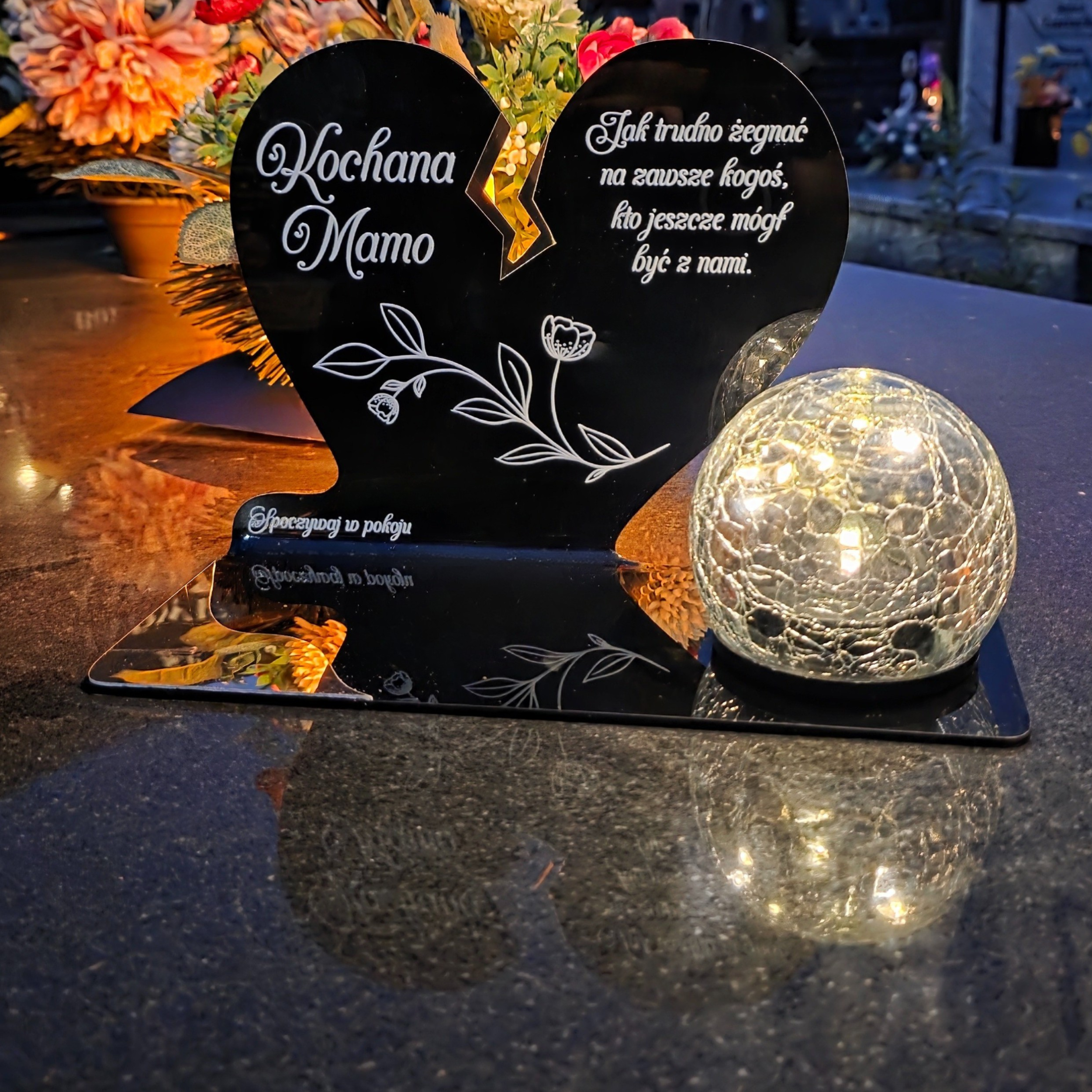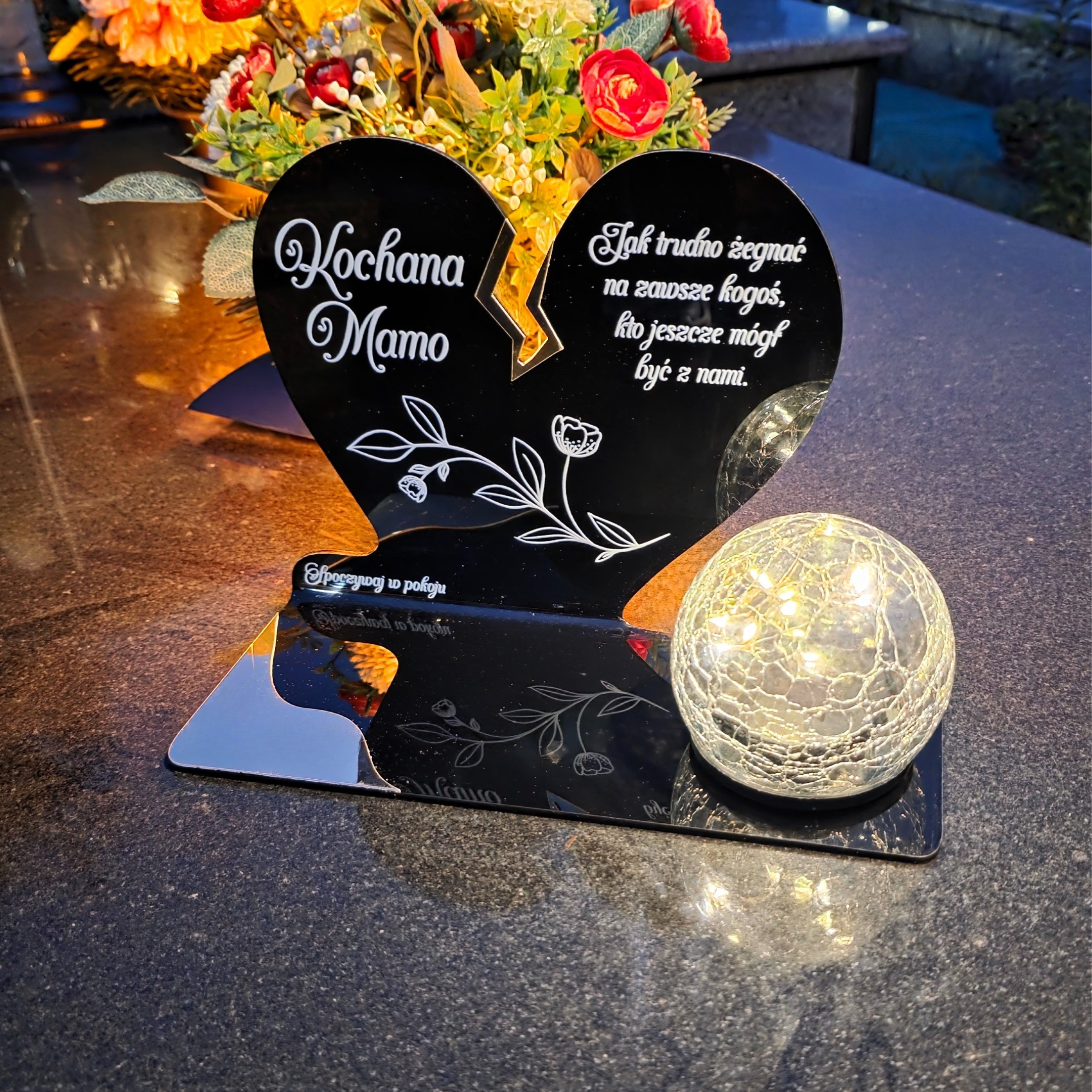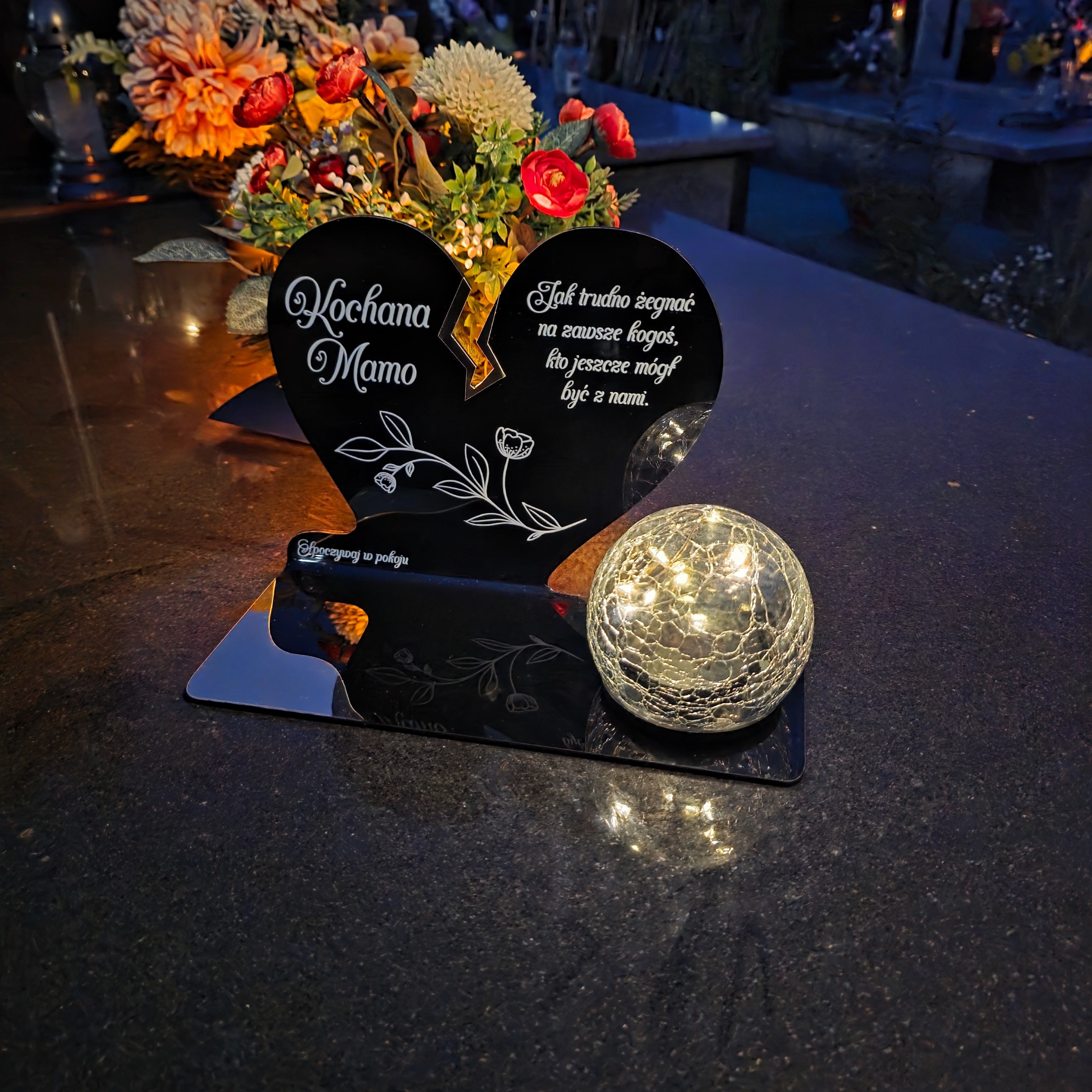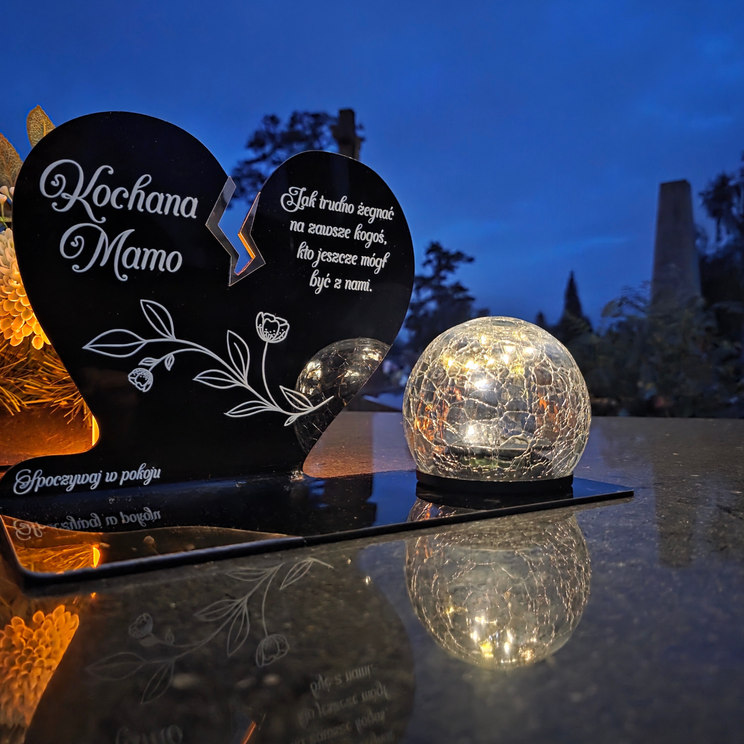 Kompozycję dopełnia solarna kula LED wykonana ze szkła dekoracyjnego typu crackle. Po zmroku rozświetla nagrobek ciepłym światłem, tworząc atmosferę zadumy i spokoju, a dzięki zasilaniu słonecznemu nie wymaga wkładów ani baterii.