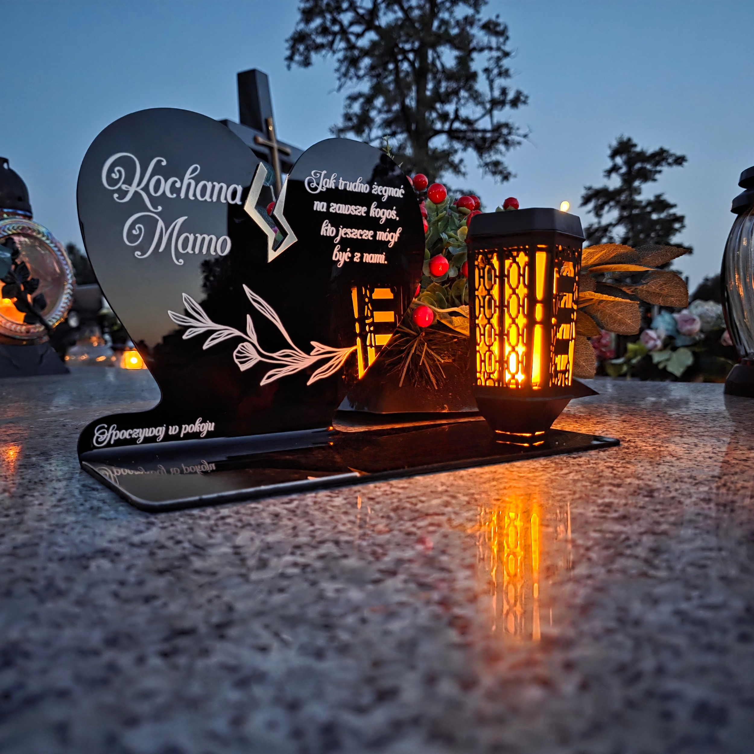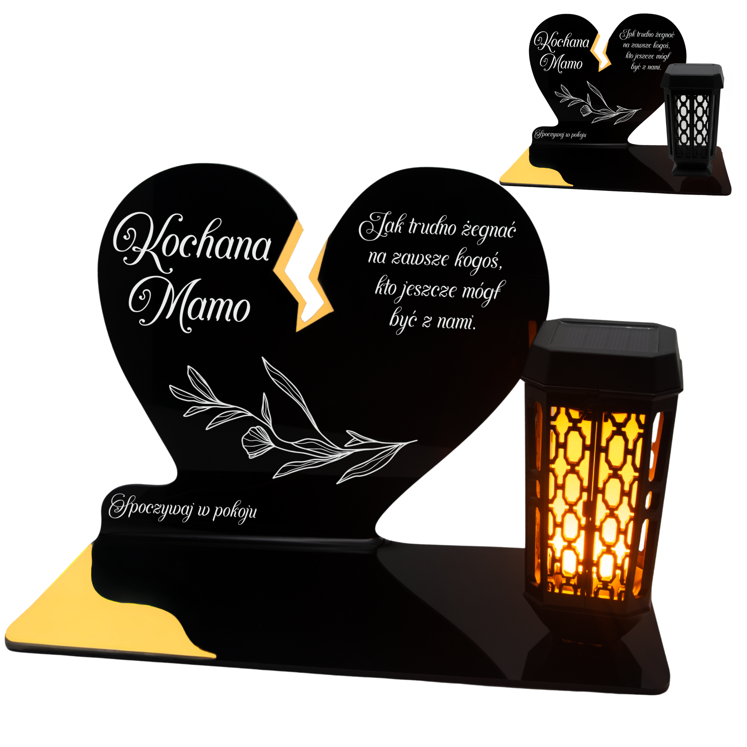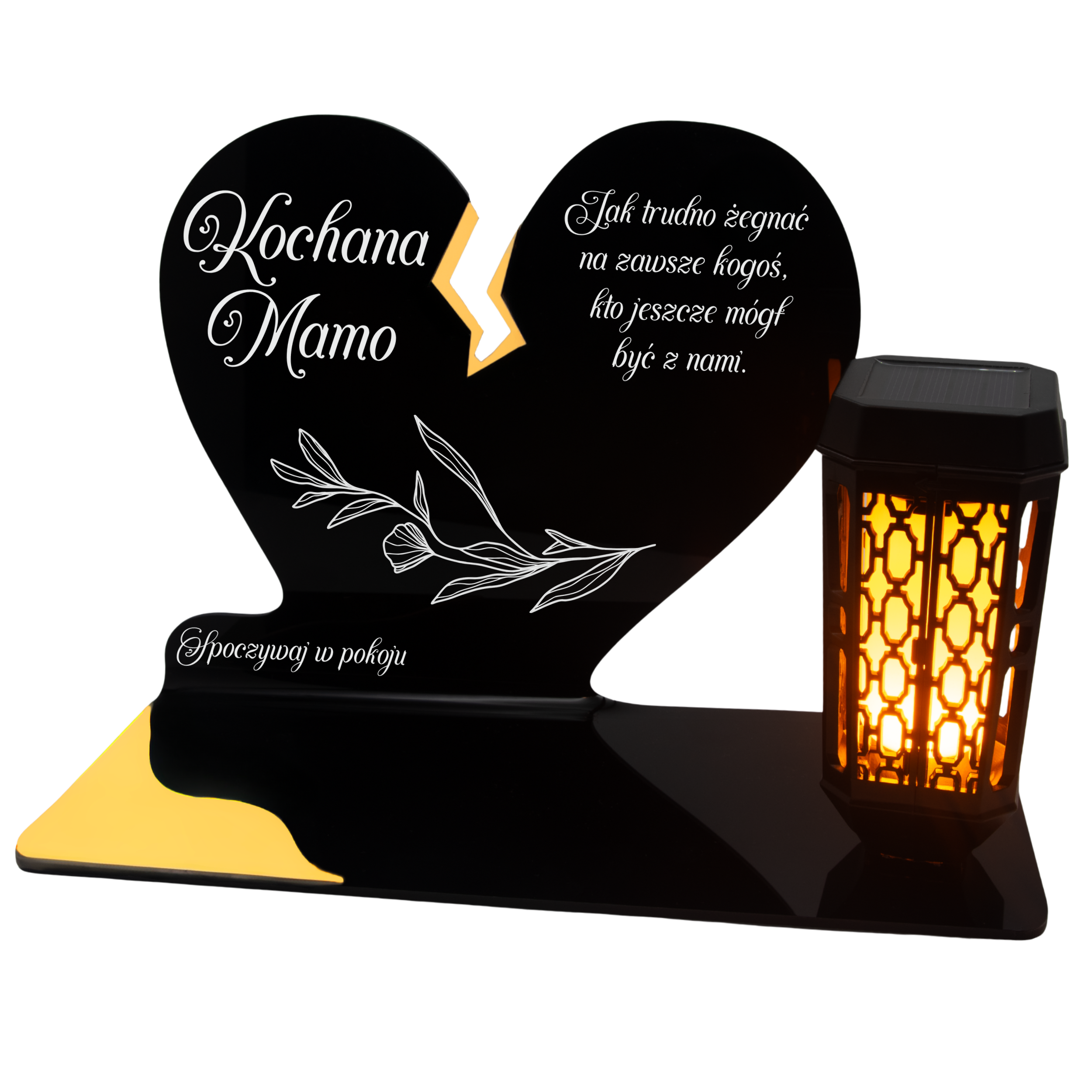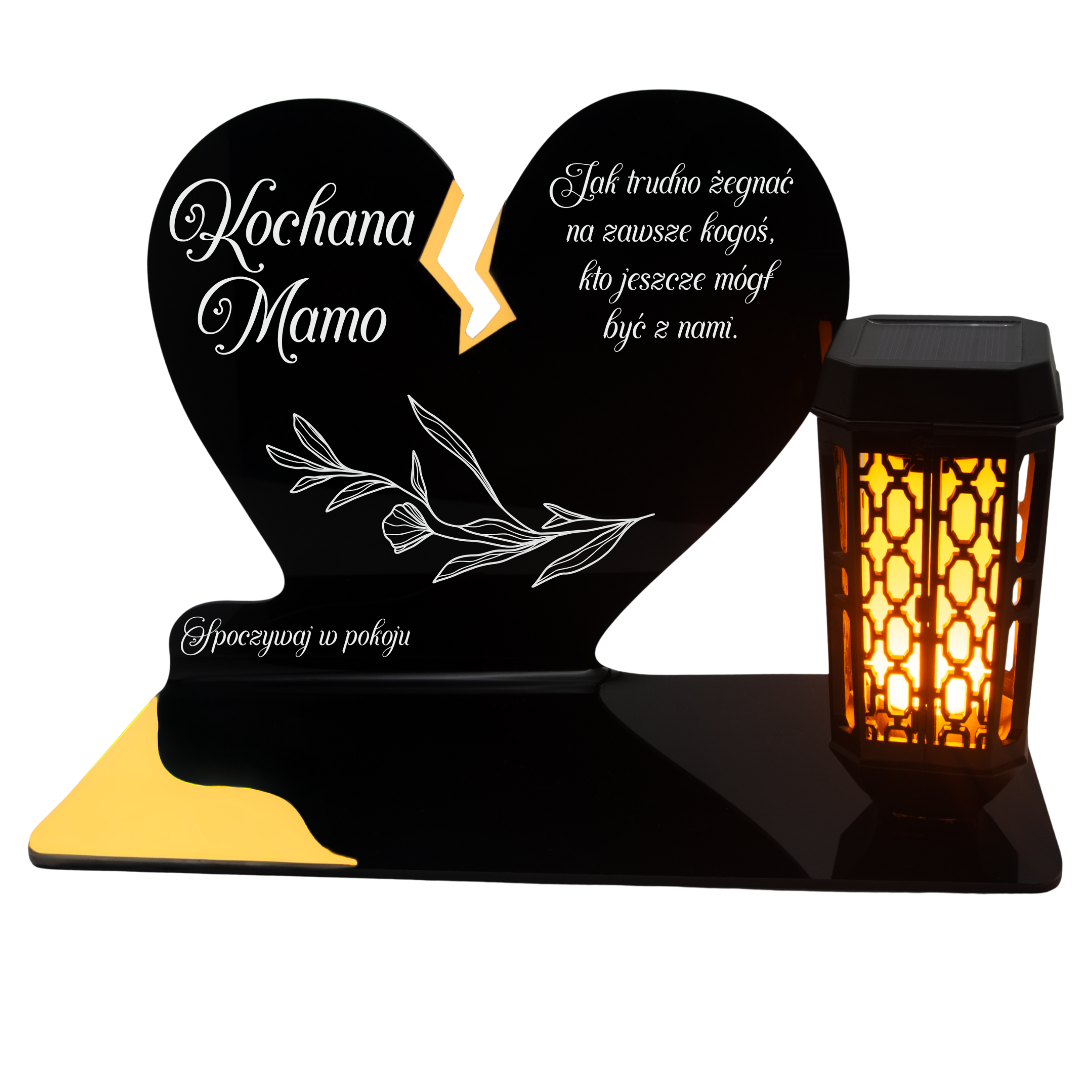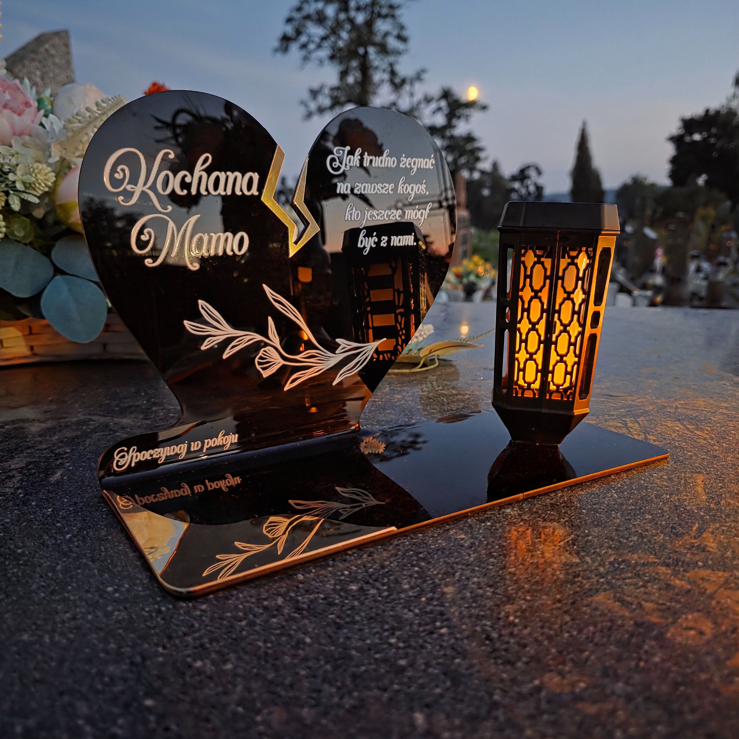 Ten wyjątkowy znicz nagrobny w formie czarnego serca z delikatnym złotym pęknięciem to piękny symbol miłości i pamięci, która nigdy nie gaśnie. Dedykacja „Kochana Mamo” oraz subtelny ornament sprawiają, że całość nabiera wzruszającego i eleganckiego charakteru. Zestaw dopełnia nowoczesna lampka solarna LED, która po zmroku rozświetla pomnik ciepłym blaskiem, tworząc atmosferę zadumy i spokoju.