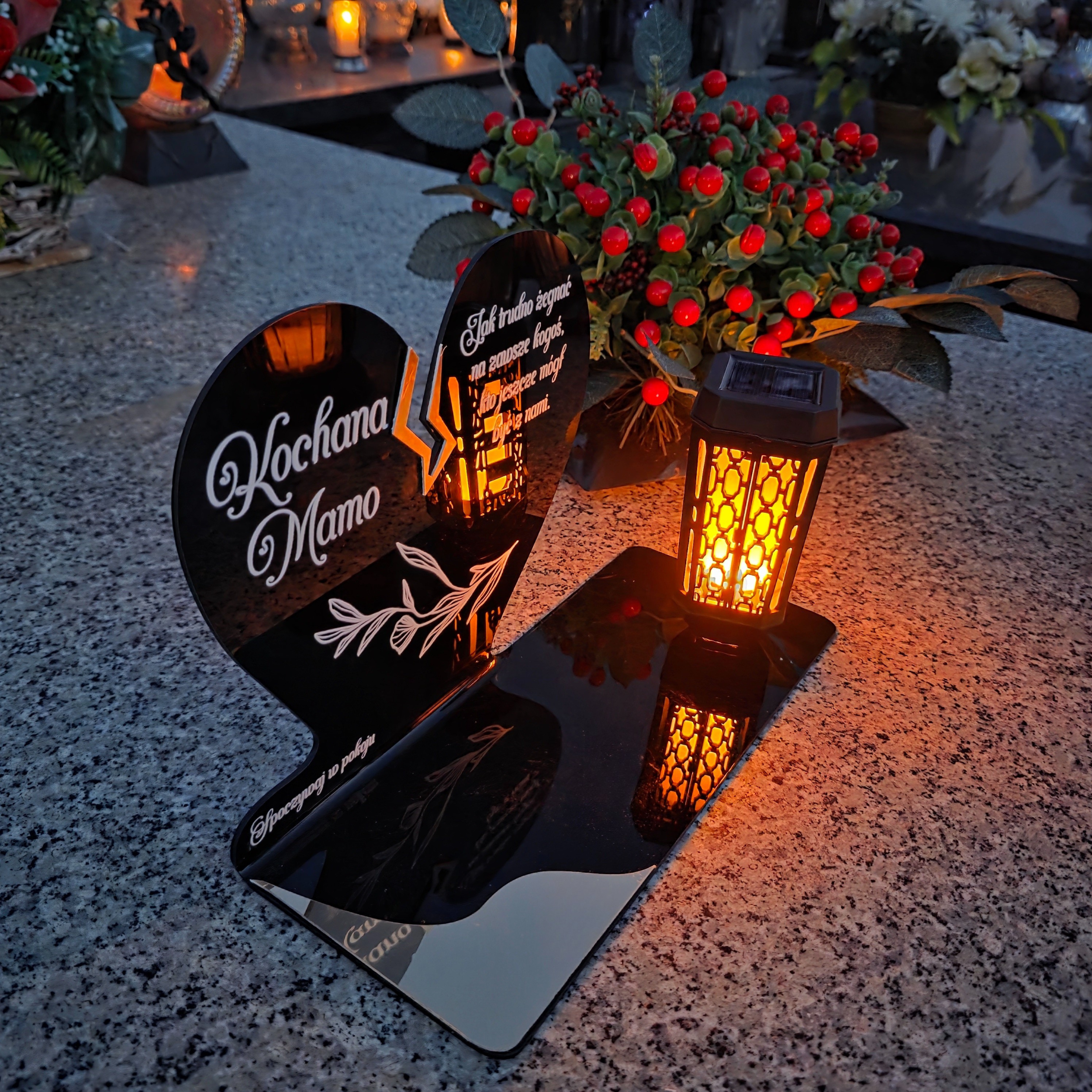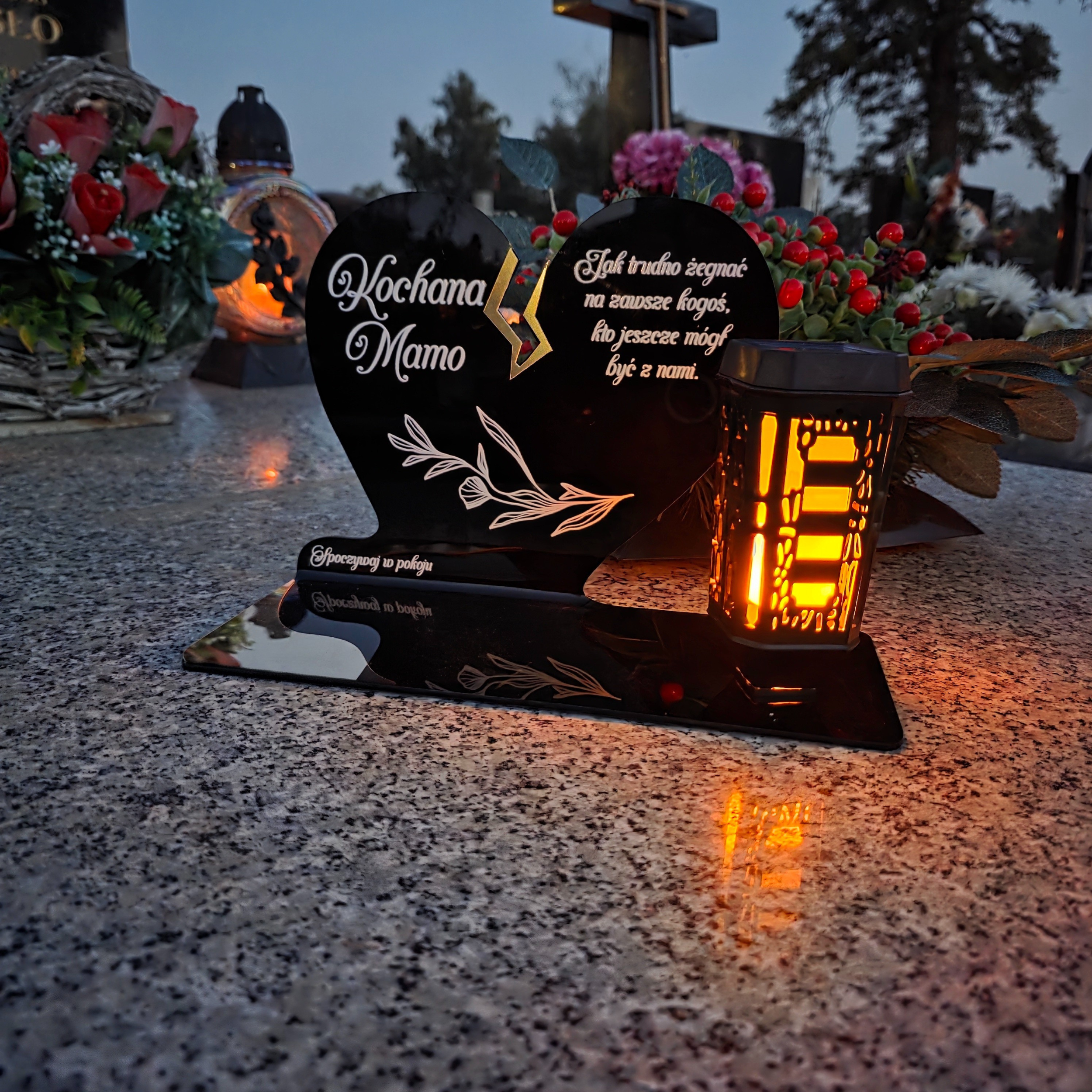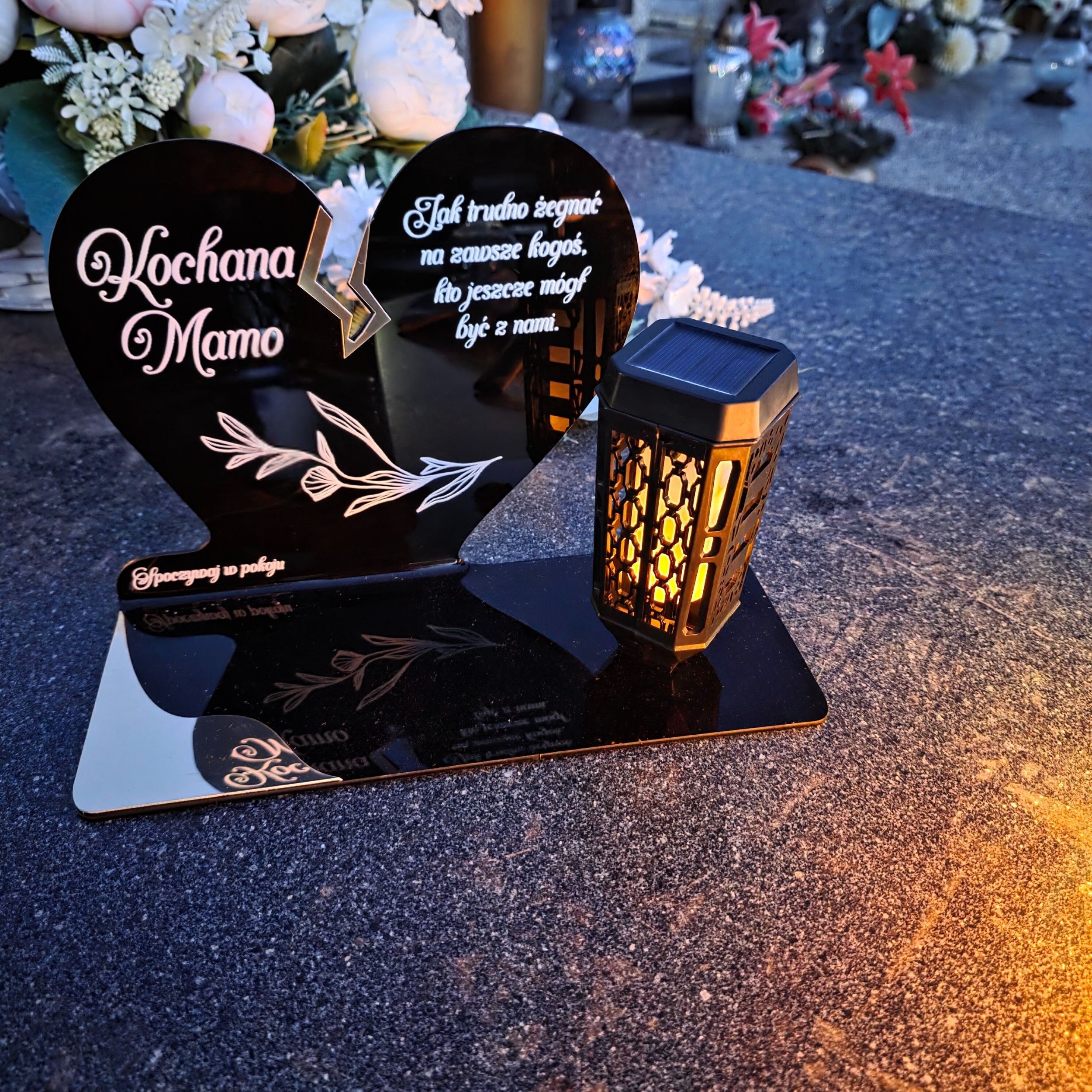 To nie tylko klasyczny znicz, ale piękna, trwała pamiątka, która wyróżnia się elegancją i unikalnym designem. Dzięki zasilaniu solarnemu nie wymaga wymiany wkładów ani baterii – zawsze rozświetli grób Mamy w ciepły i wzruszający sposób.