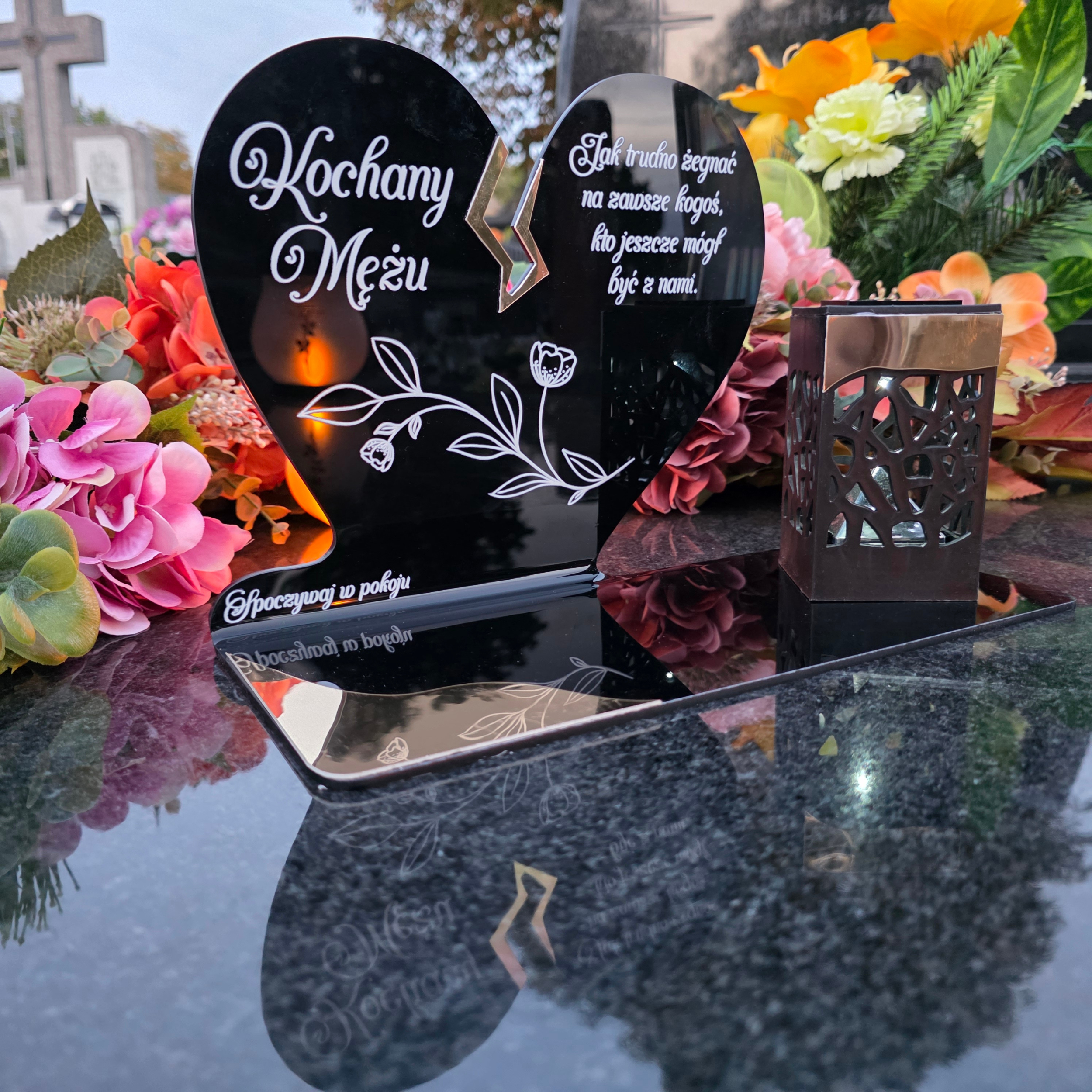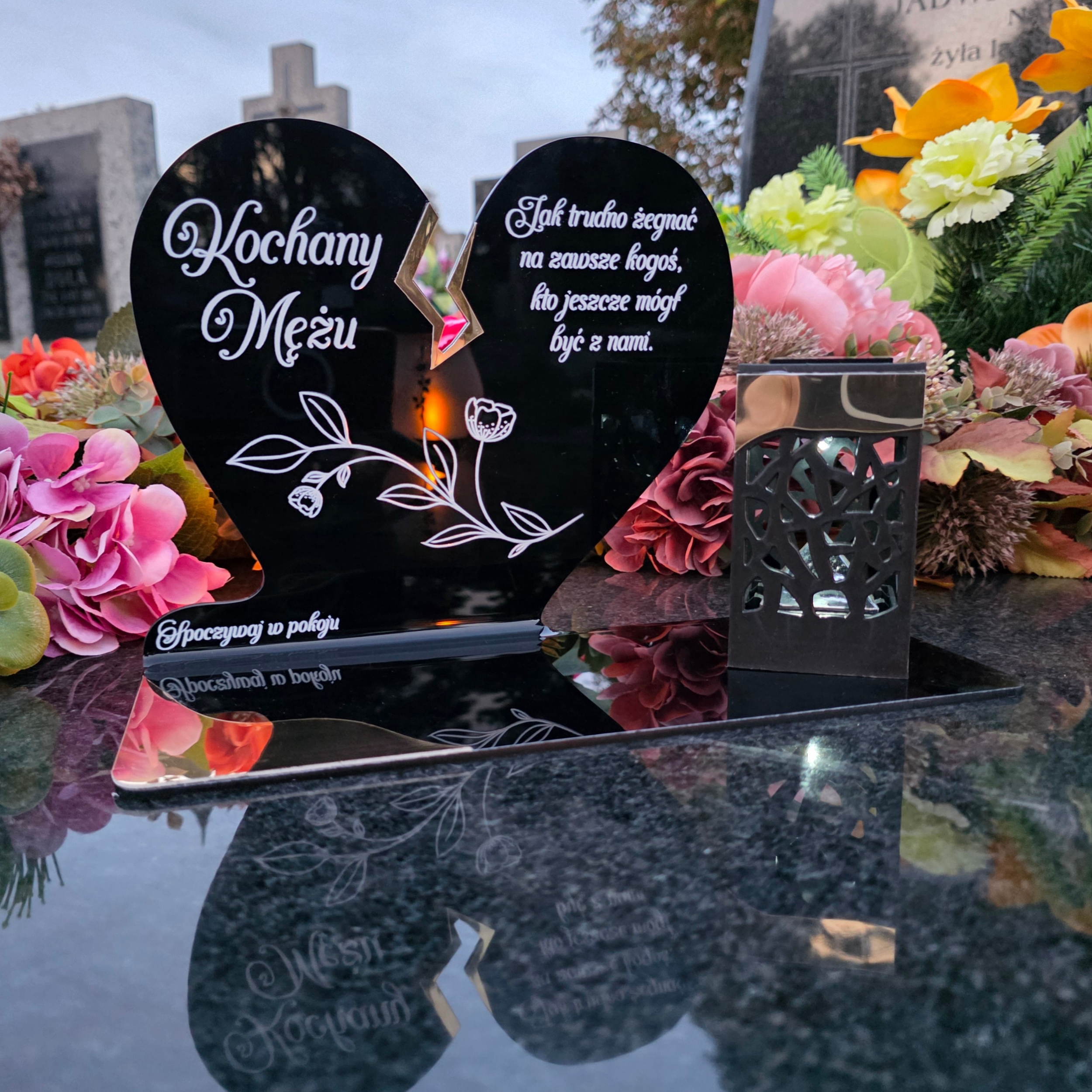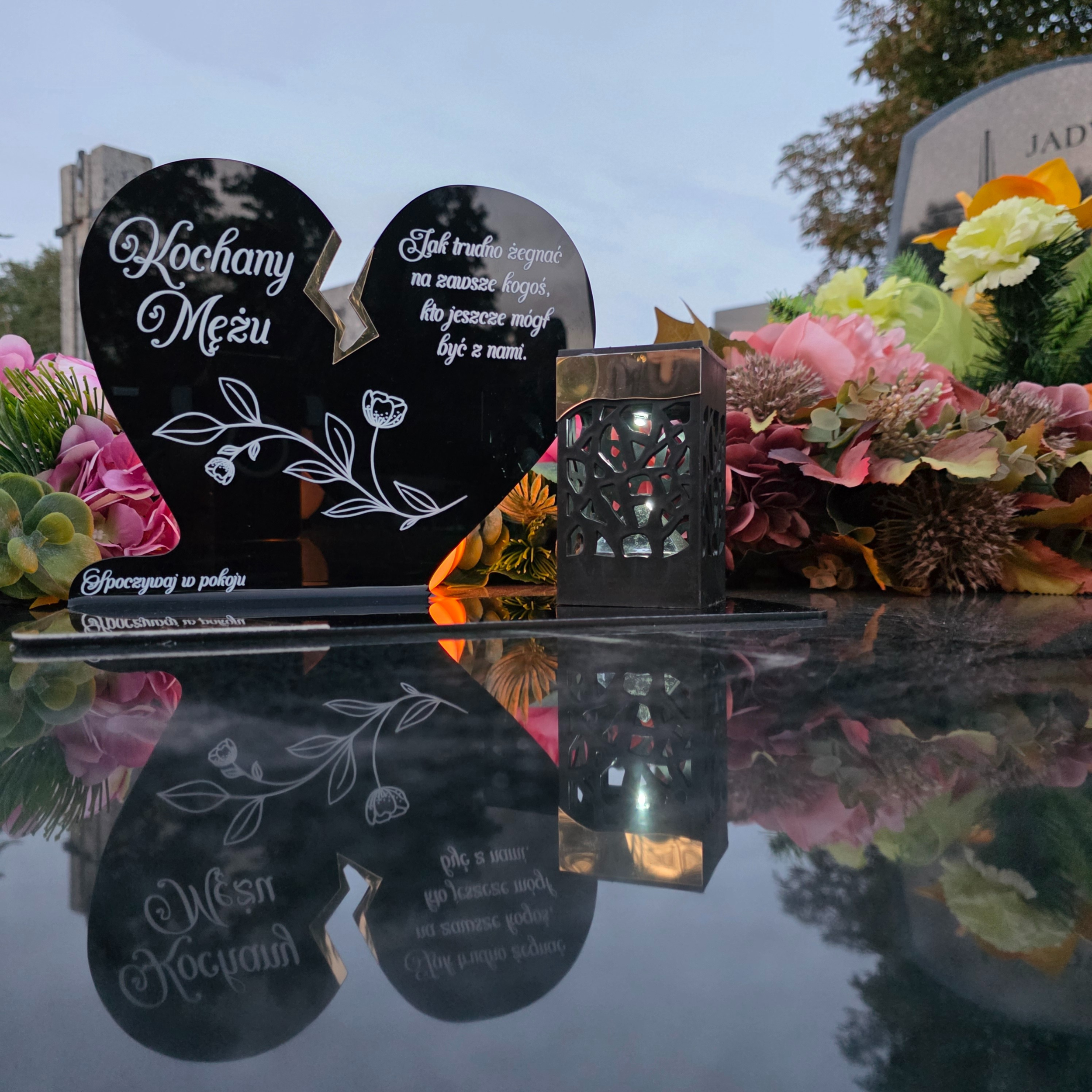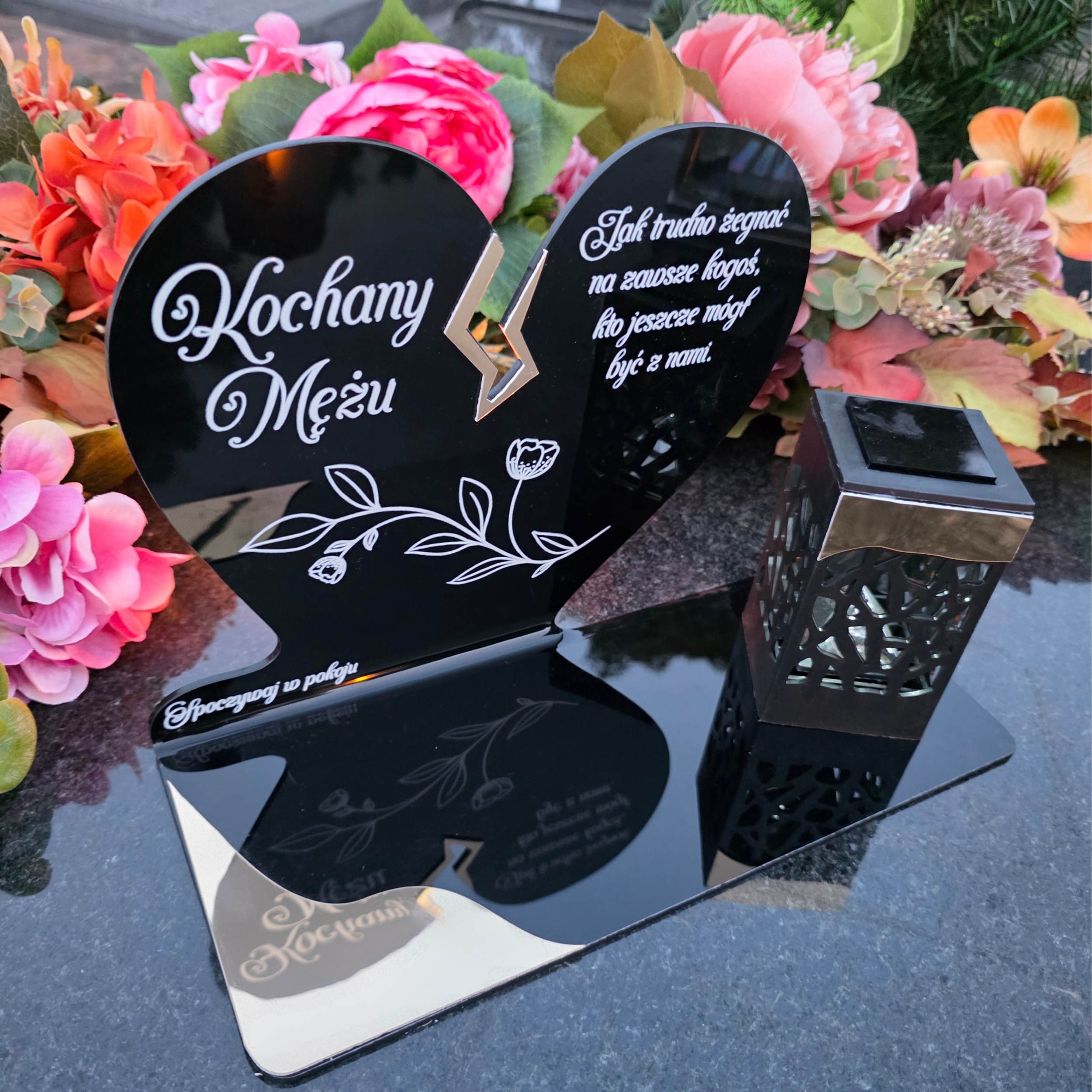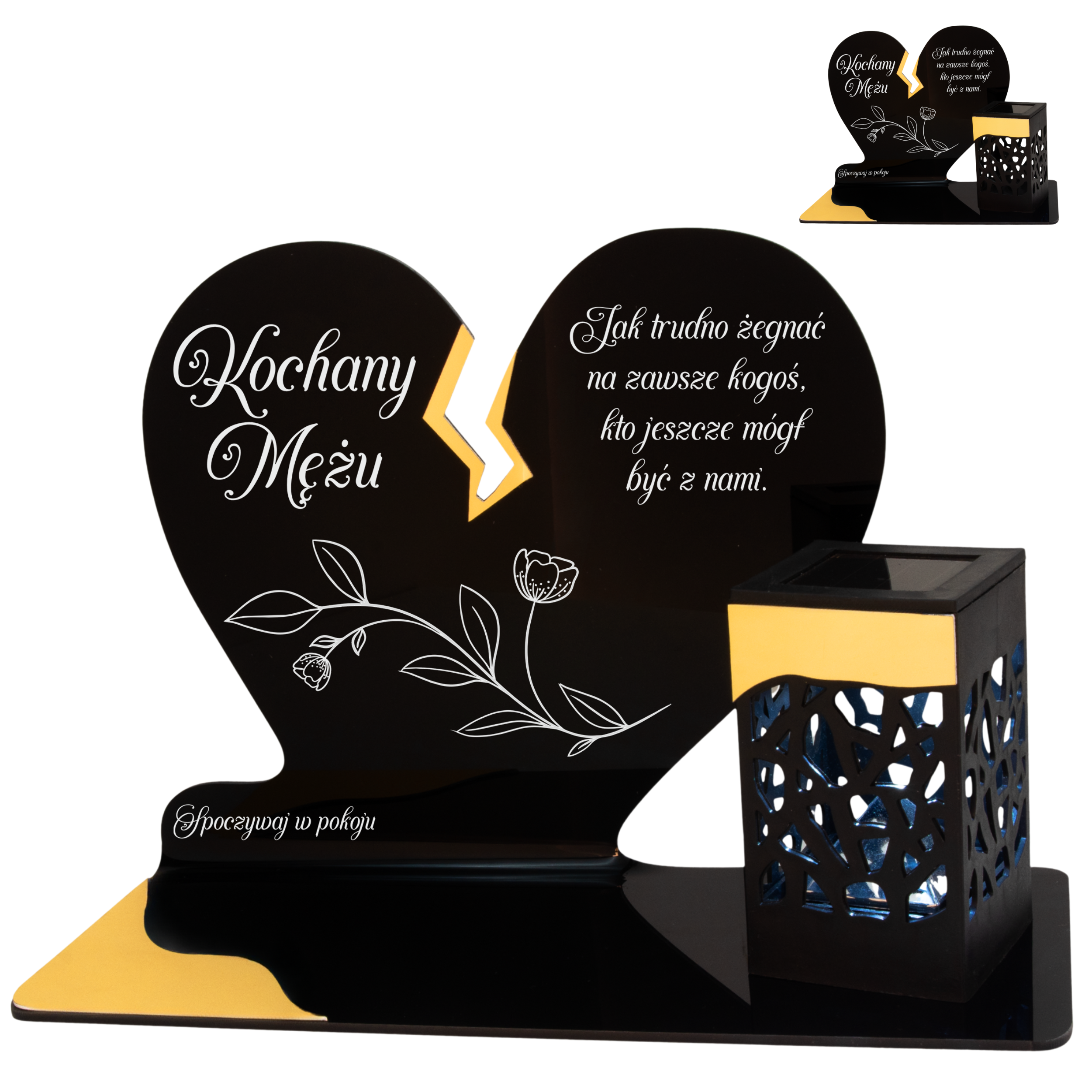 Elegancki znicz nagrobny dla Męża– serce ze złotymi akcentami i solarną lampką LED