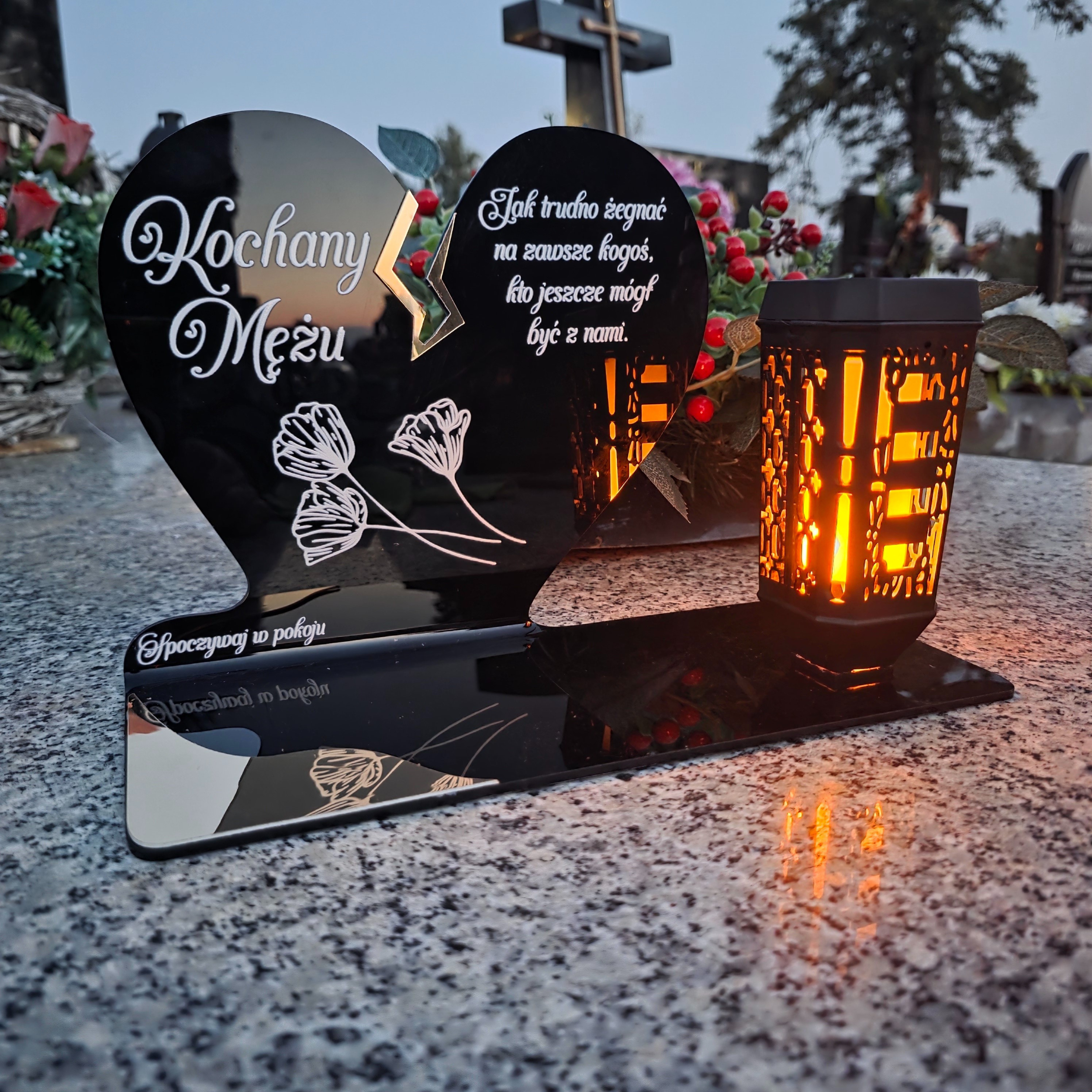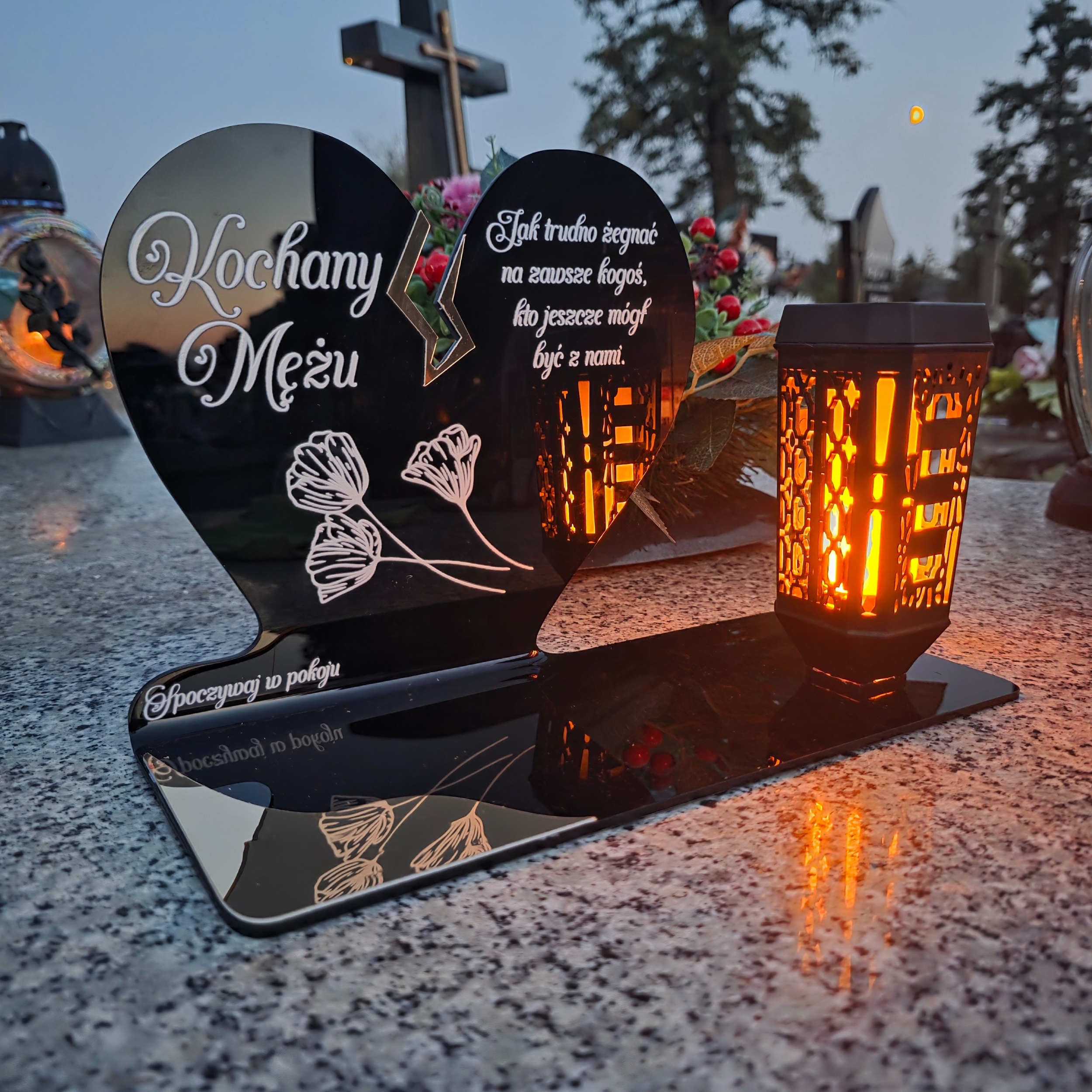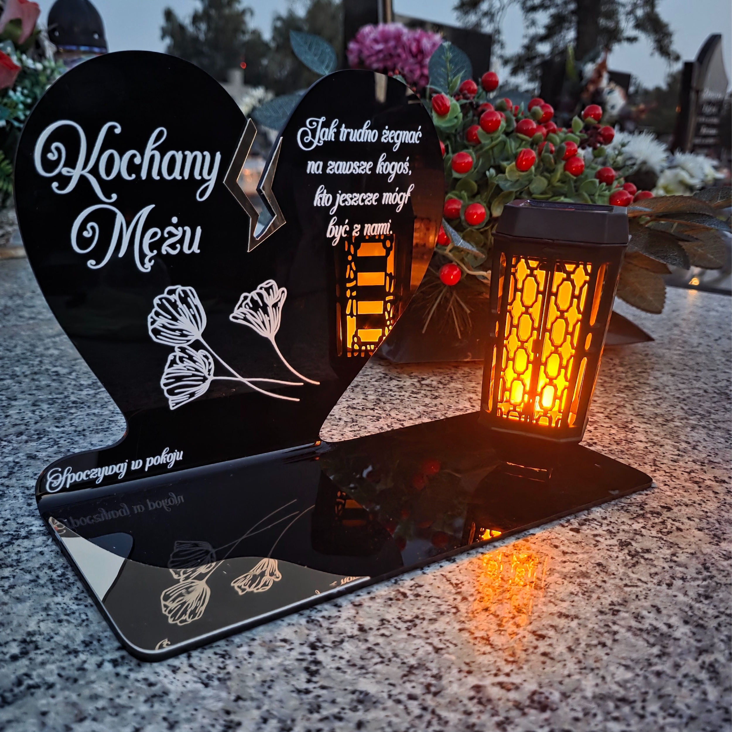 Ten wyjątkowy znicz nagrobny w formie czarnego serca z delikatnym złotym pęknięciem to piękny symbol miłości i pamięci, która nigdy nie gaśnie. Dedykacja „Kochany Mężu” oraz subtelny motyw kwiatowy nadają całości wzruszającego i eleganckiego charakteru. Zestaw dopełnia nowoczesna lampka solarna LED, która po zmroku rozświetla pomnik ciepłym blaskiem, tworząc atmosferę zadumy i spokoju.
