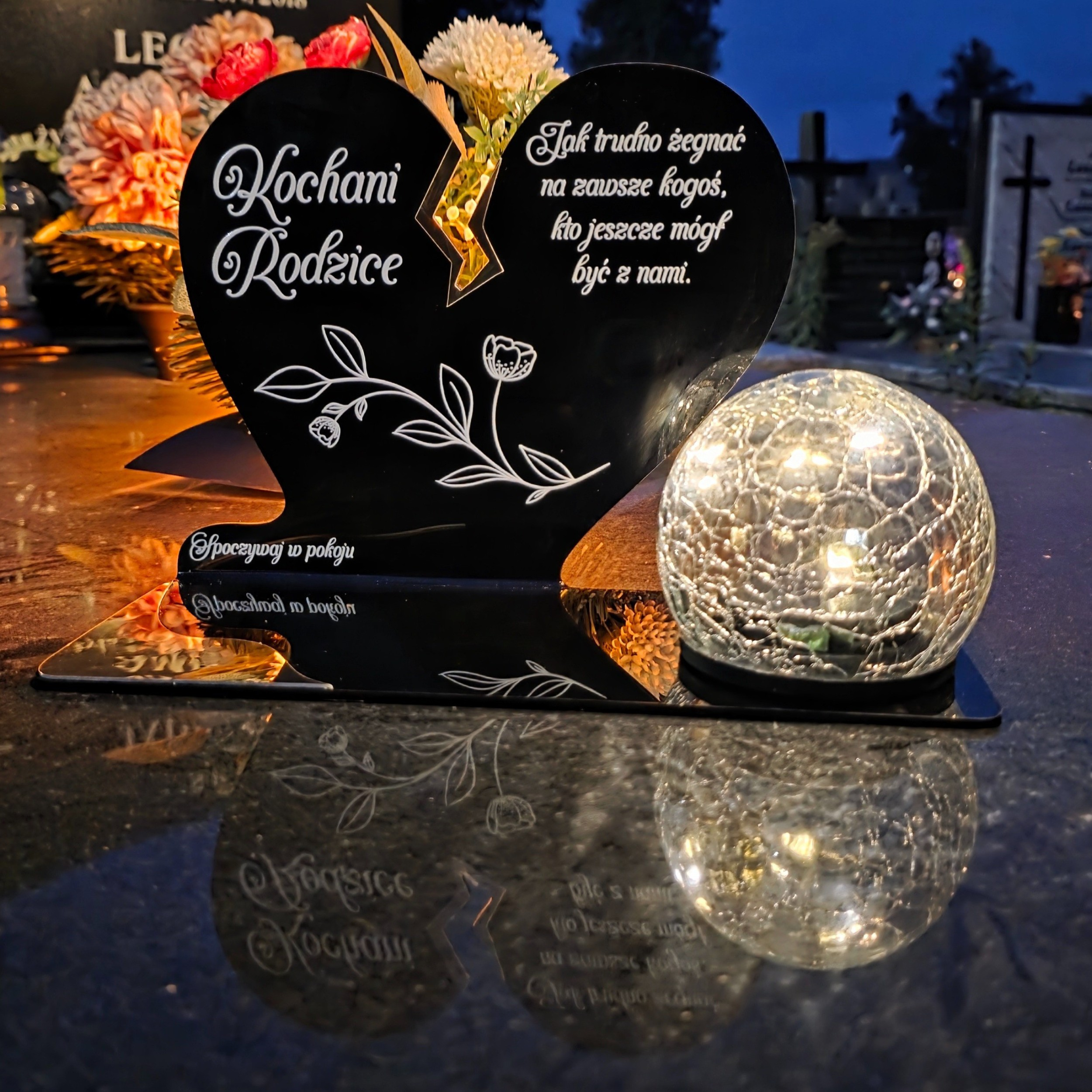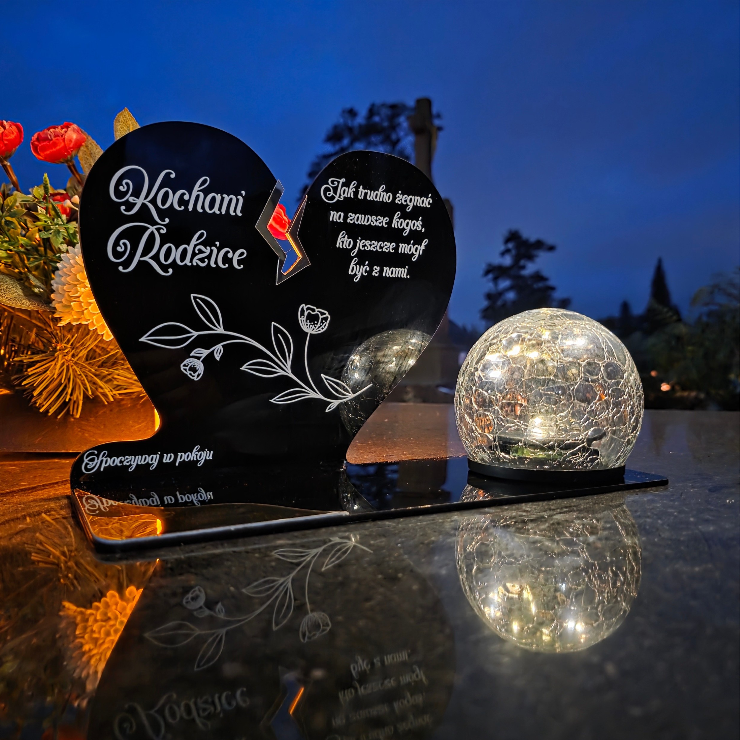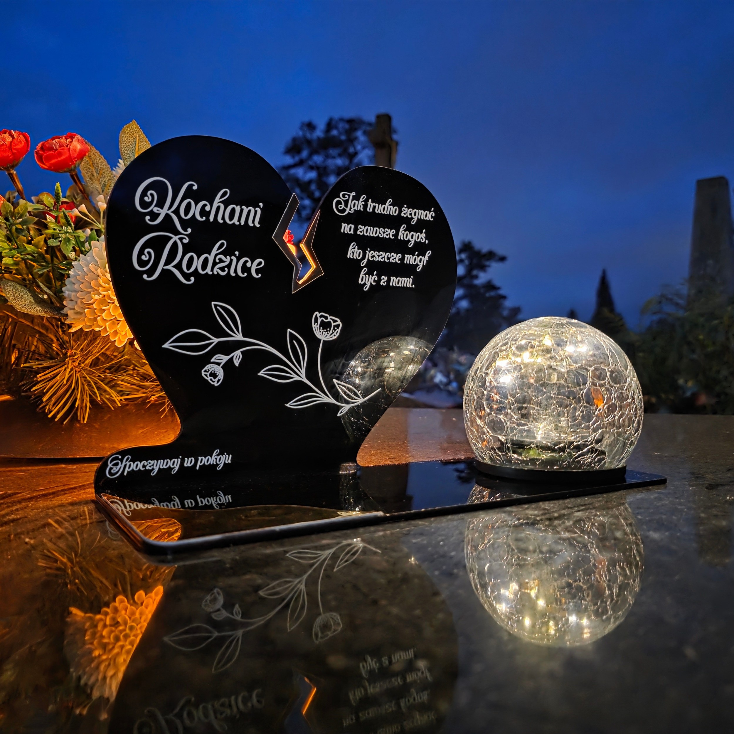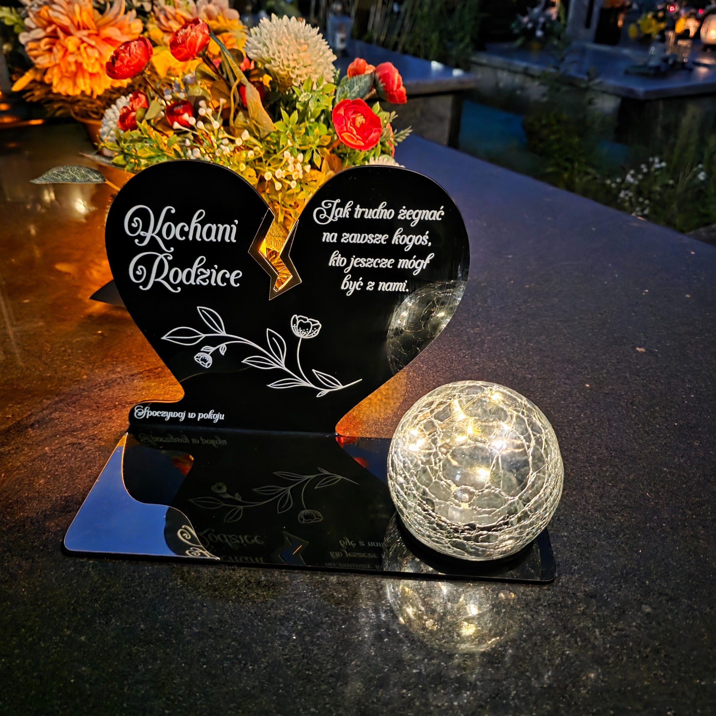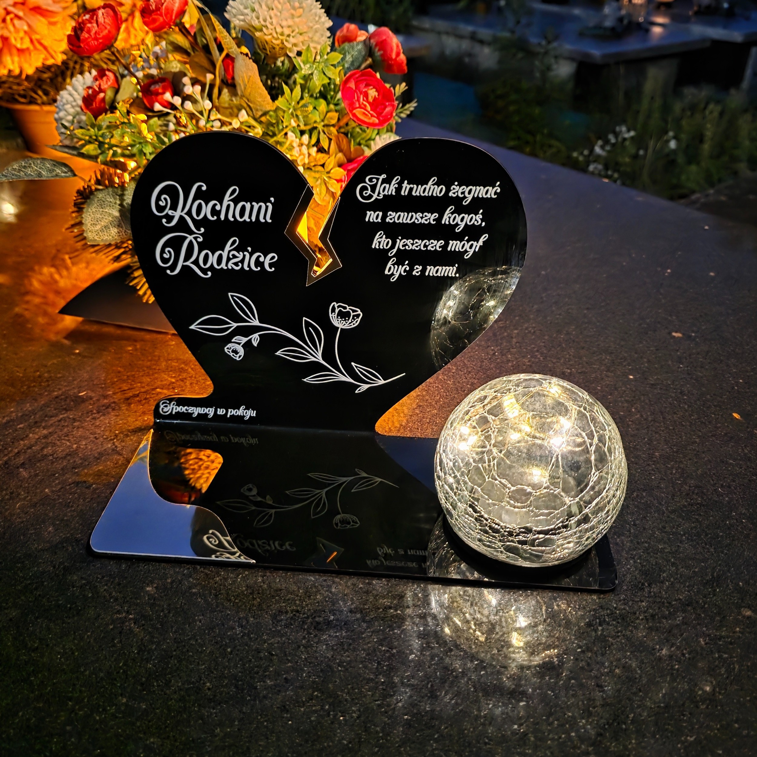 Kompozycję dopełnia solarna kula LED wykonana ze szkła dekoracyjnego typu crackle. Po zmroku rozświetla nagrobek ciepłym światłem, tworząc atmosferę zadumy i spokoju, a dzięki zasilaniu słonecznemu nie wymaga wkładów ani baterii.