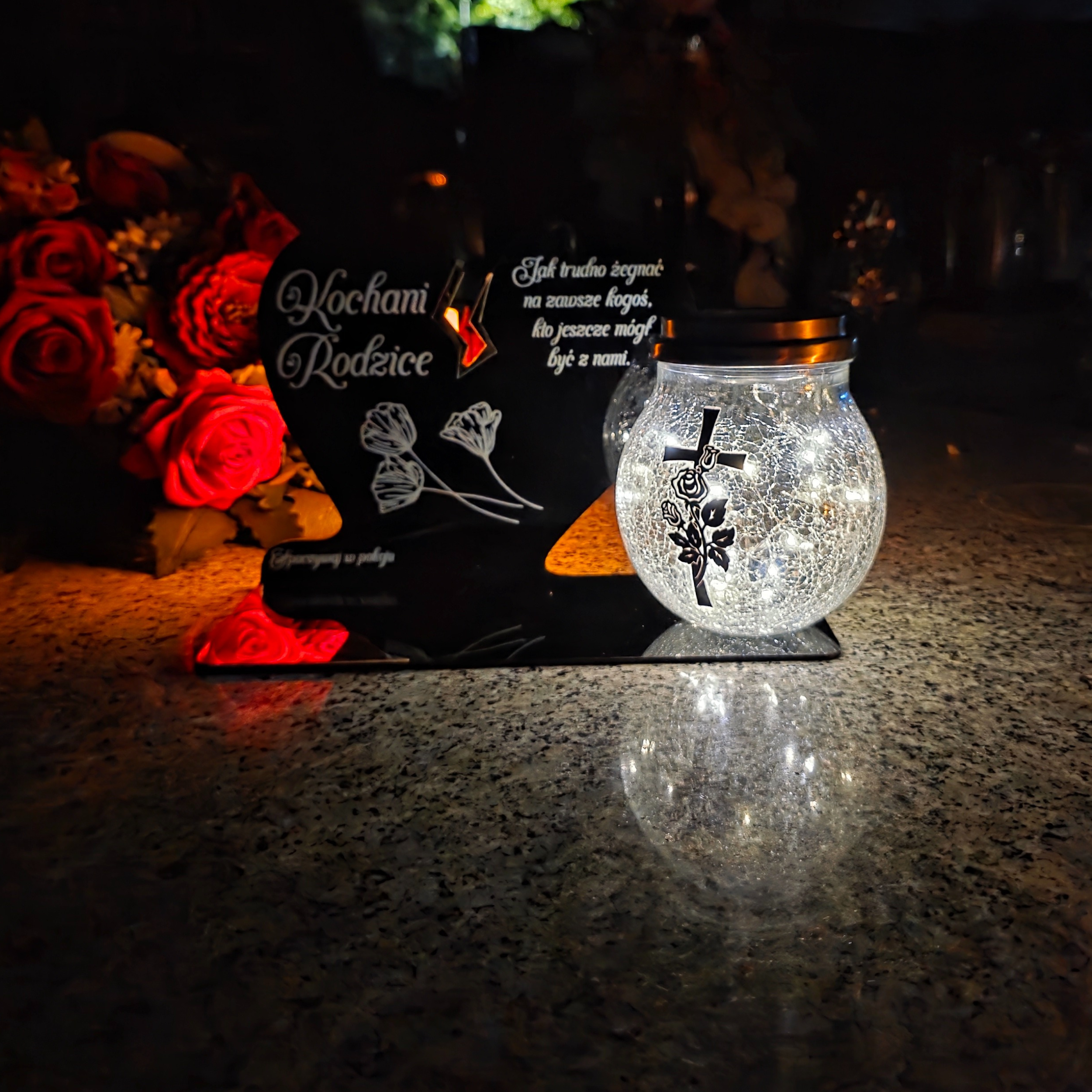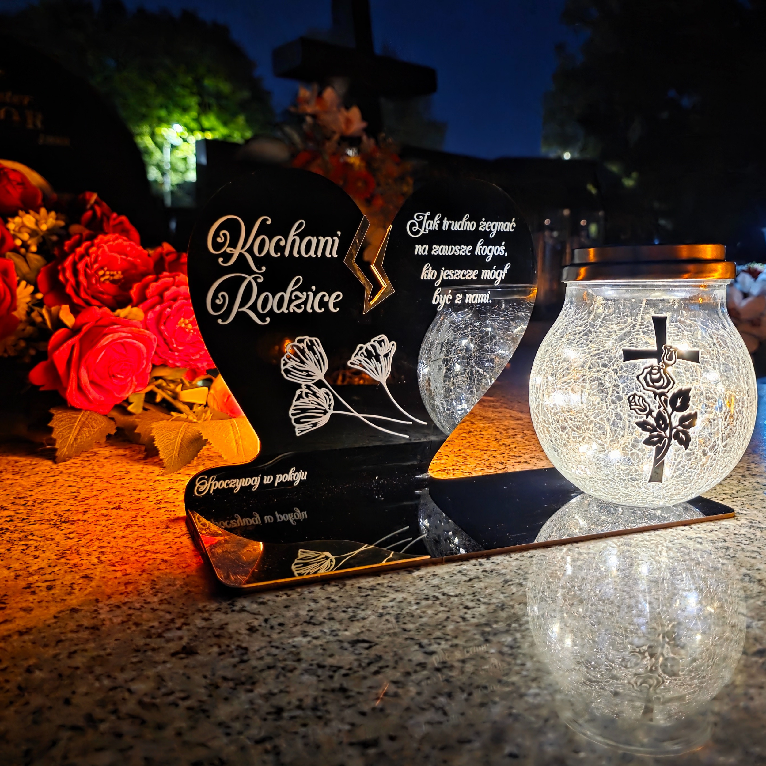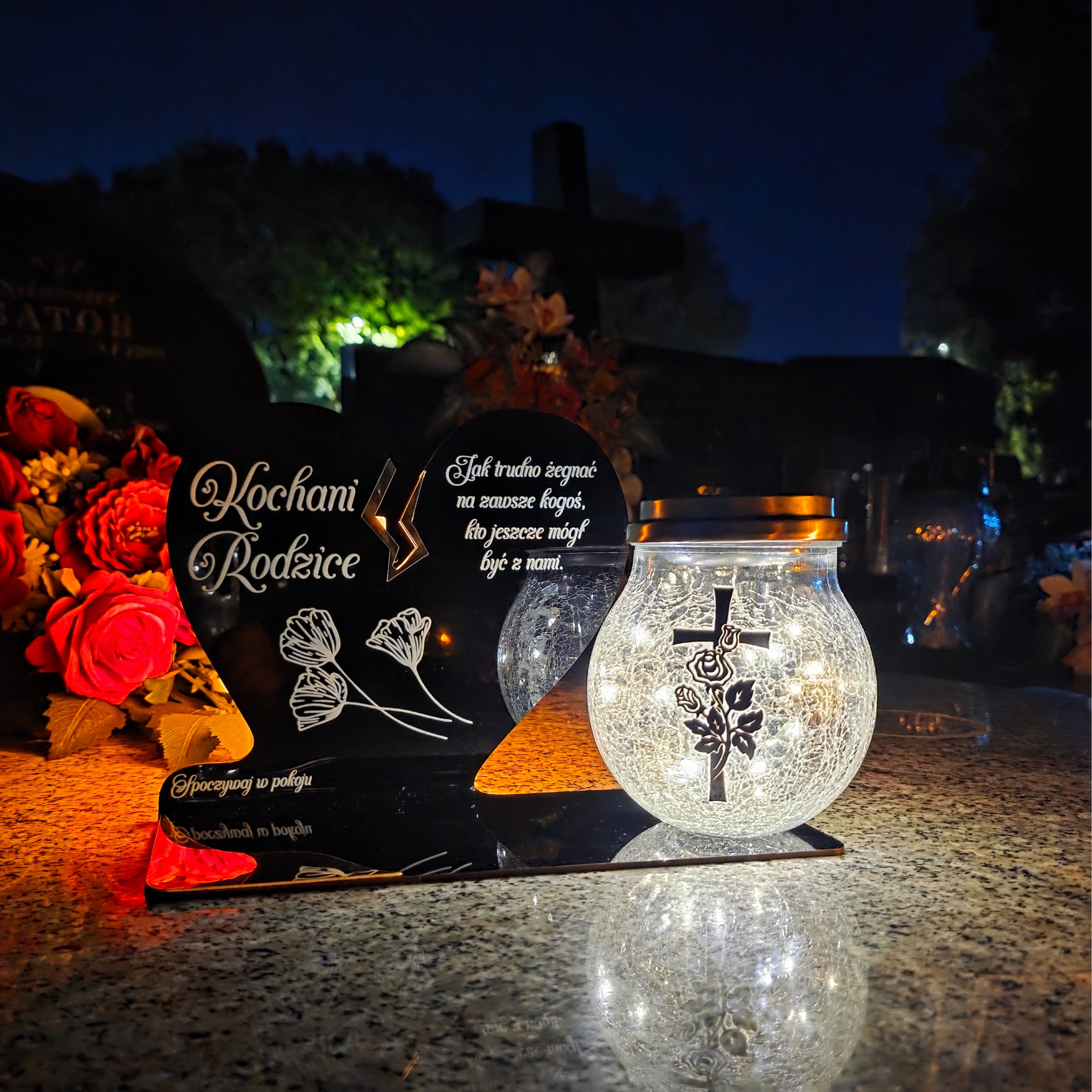 To wyjątkowa pamiątka, która łączy klasyczny wygląd z nowoczesnym rozwiązaniem. Serce ze złotym akcentem i dużą szklaną lampką crackle tworzy kompozycję, która nie tylko pięknie zdobi nagrobek, ale także zapewnia światło pamięci przez cały rok – bez potrzeby wymiany wkładów.