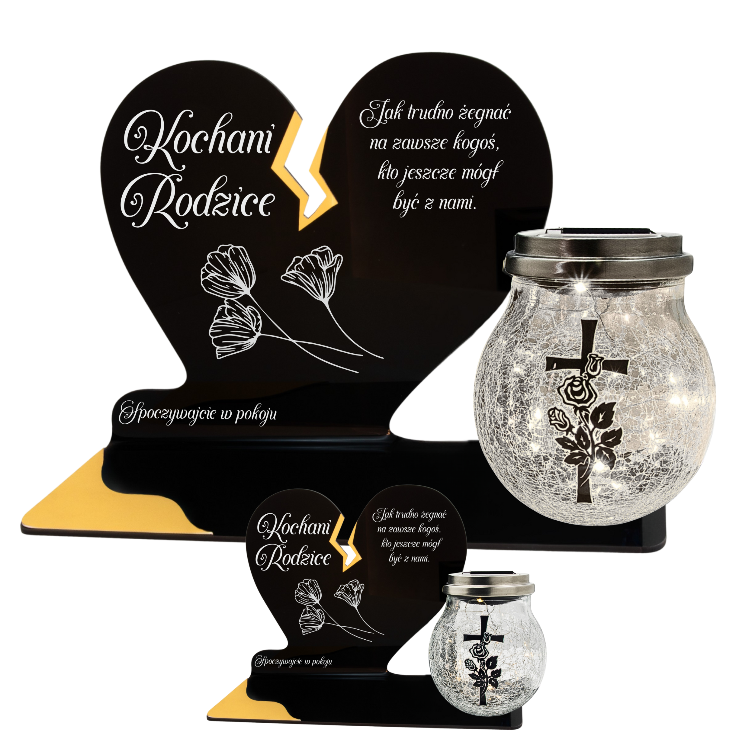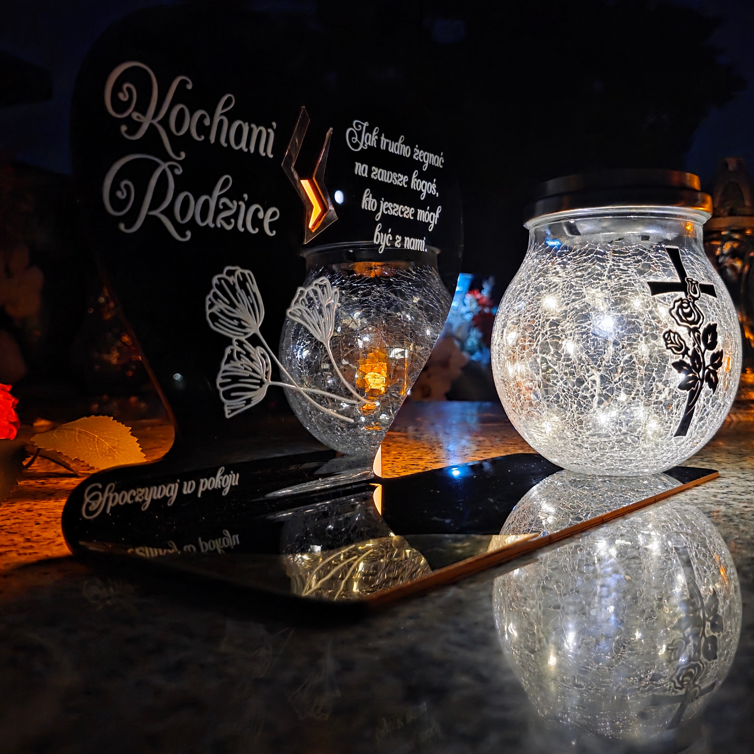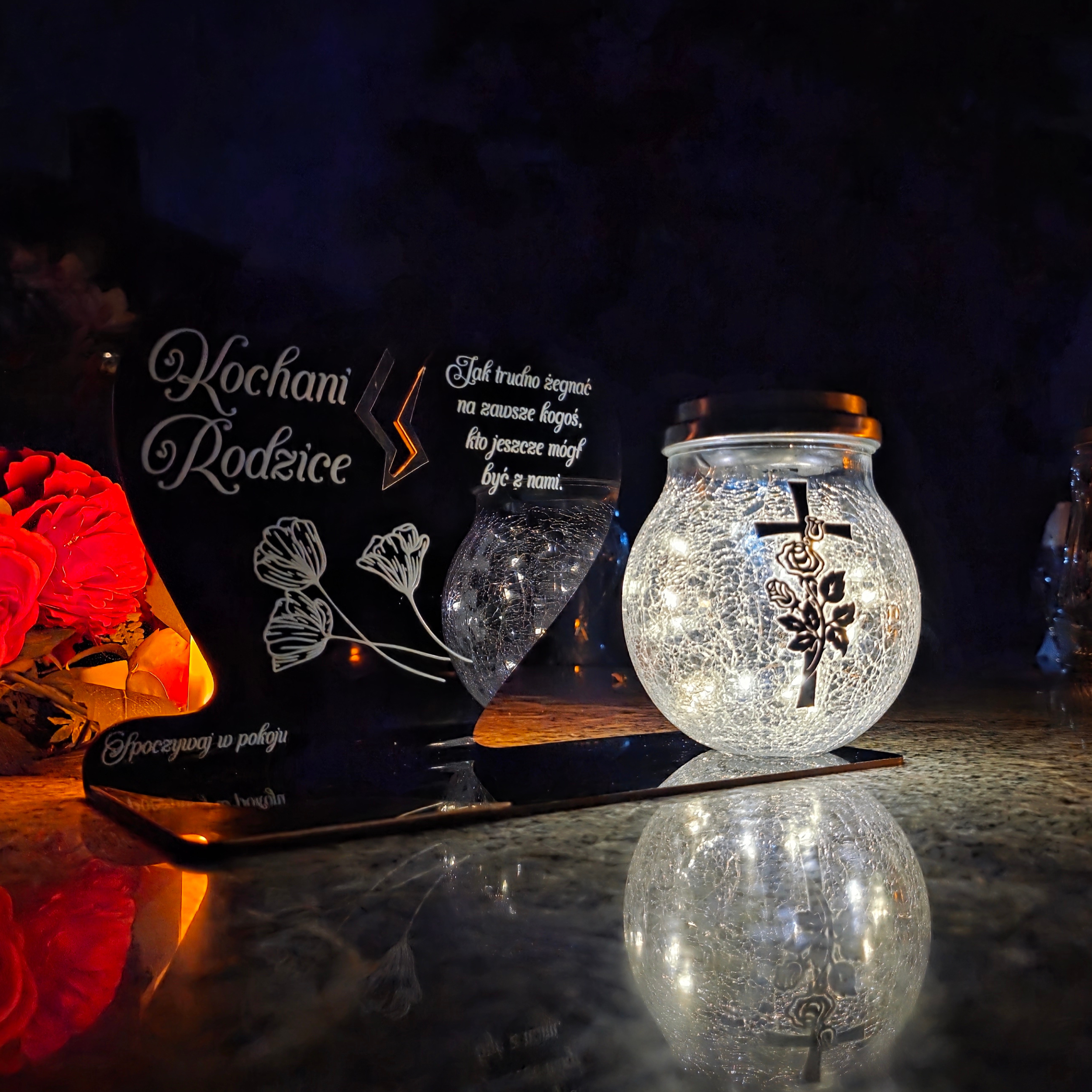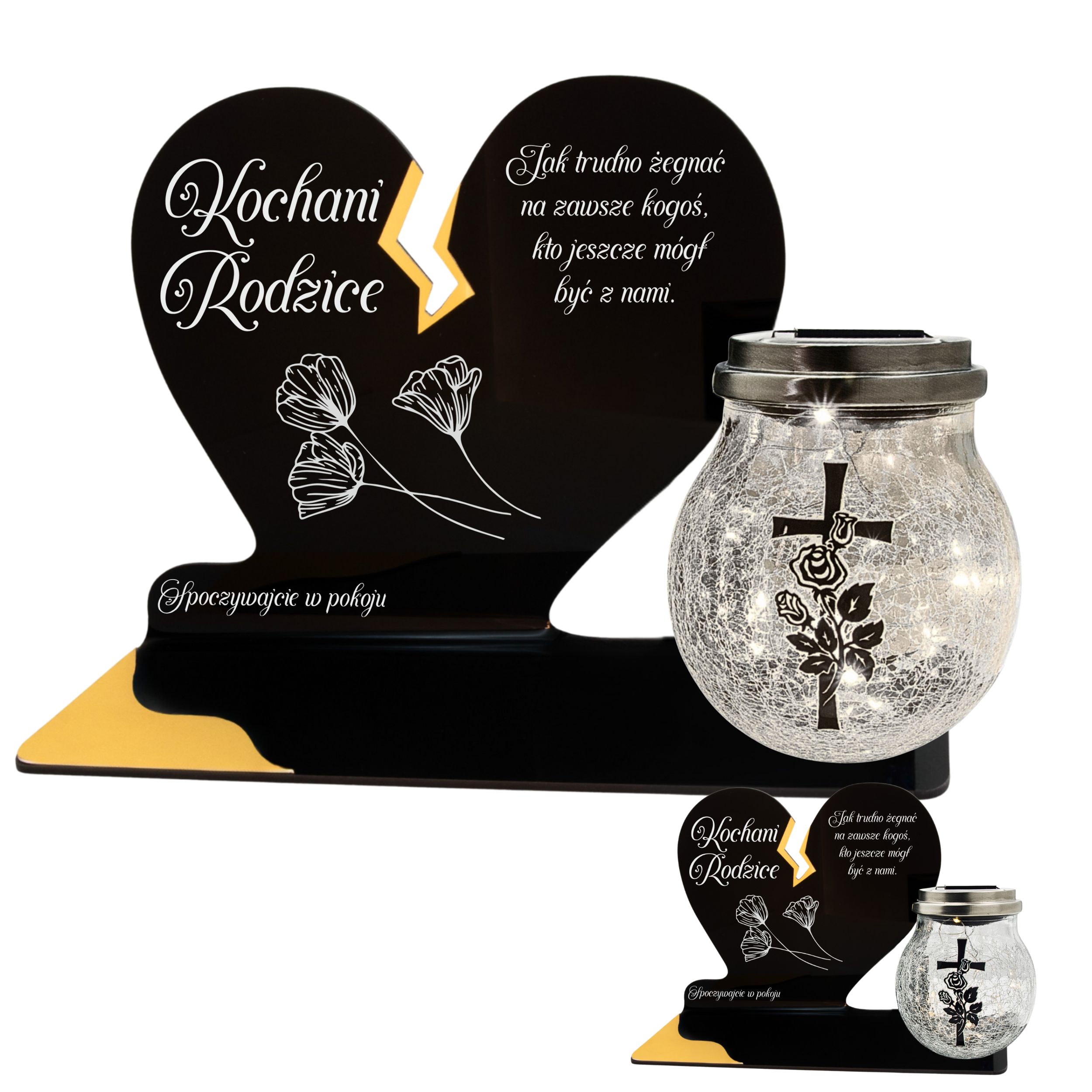 To wyjątkowa pamiątka, która łączy klasyczny wygląd z nowoczesnym rozwiązaniem. Serce ze złotym akcentem i dużą szklaną lampką crackle tworzy kompozycję, która nie tylko pięknie zdobi nagrobek, ale także zapewnia światło pamięci przez cały rok – bez potrzeby wymiany wkładów.
