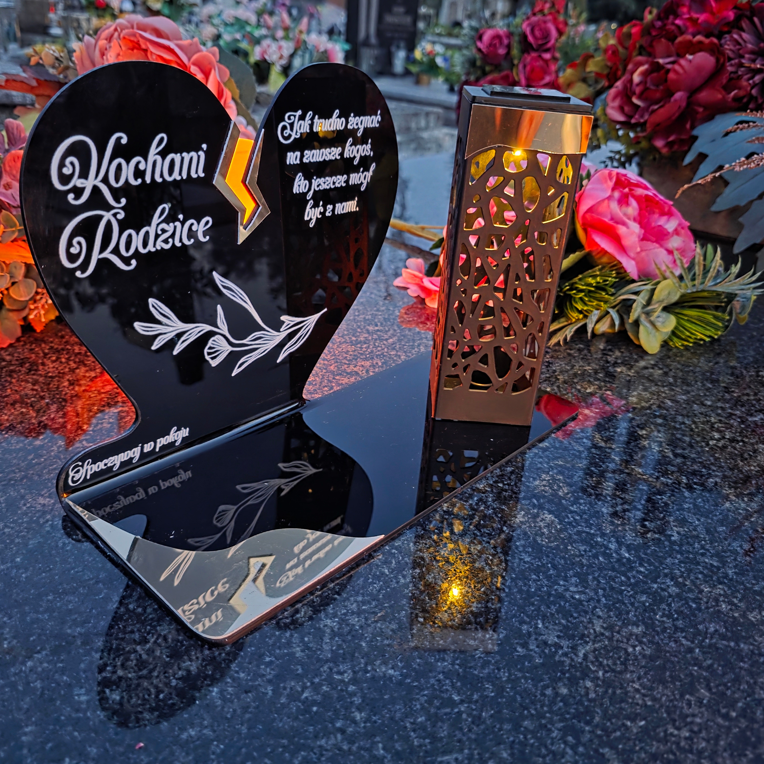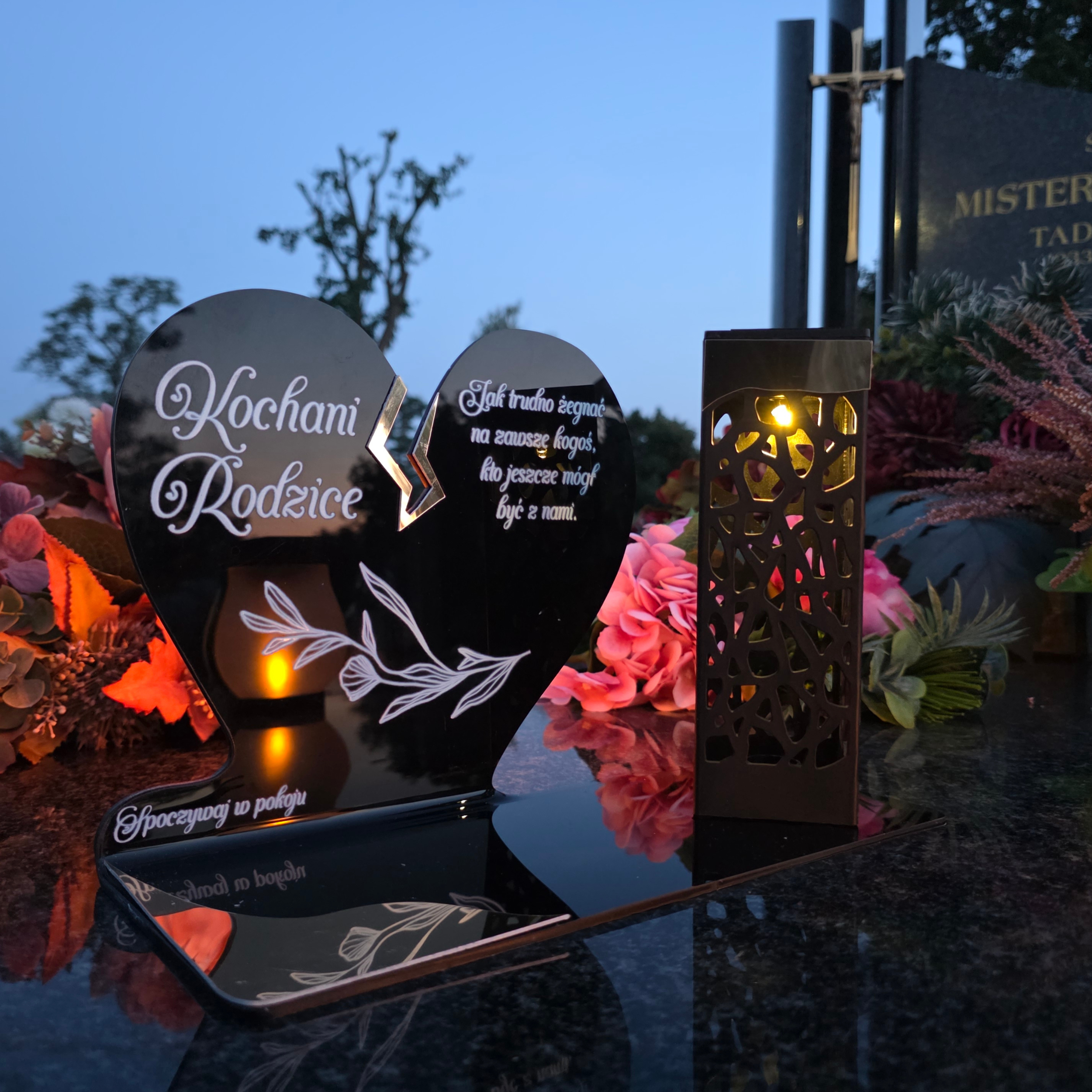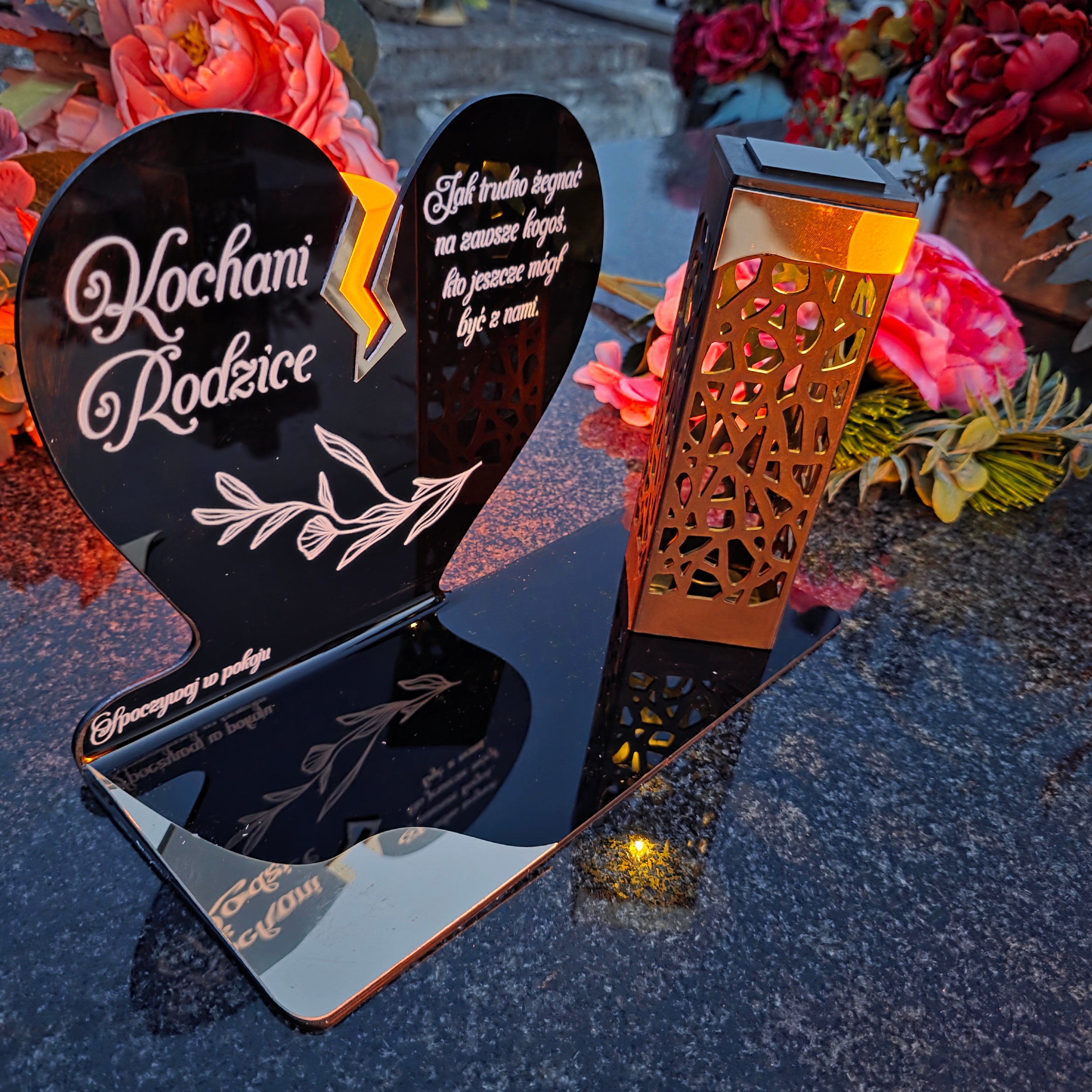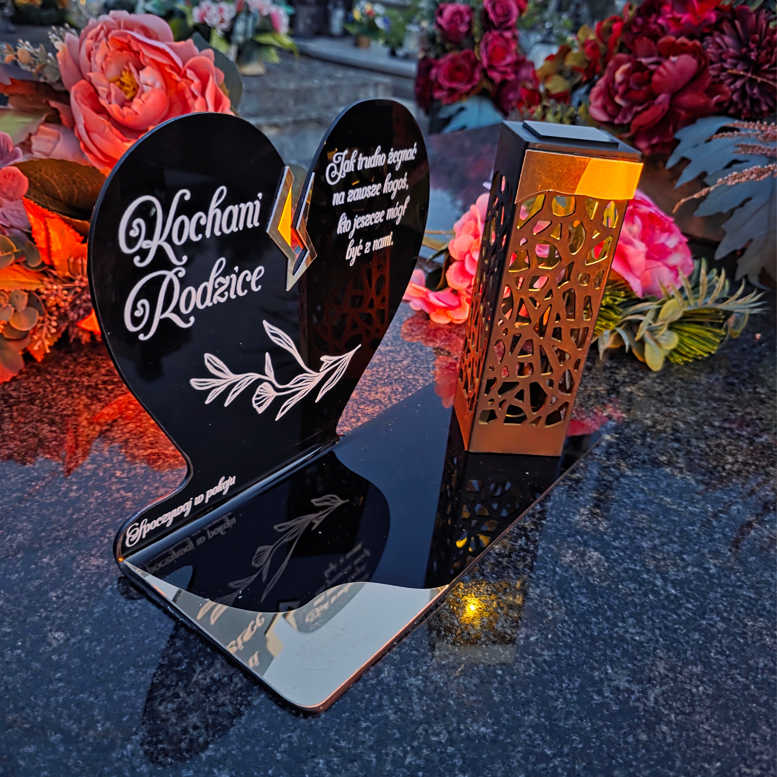 To niezwykła pamiątka łącząca tradycję z nowoczesnością. Zestawienie serca ze złotym akcentem i wysokiej lampki solarnej daje efekt elegancji oraz trwałego blasku pamięci, który rozświetla nagrobek przez cały rok – bez konieczności wymiany wkładów.