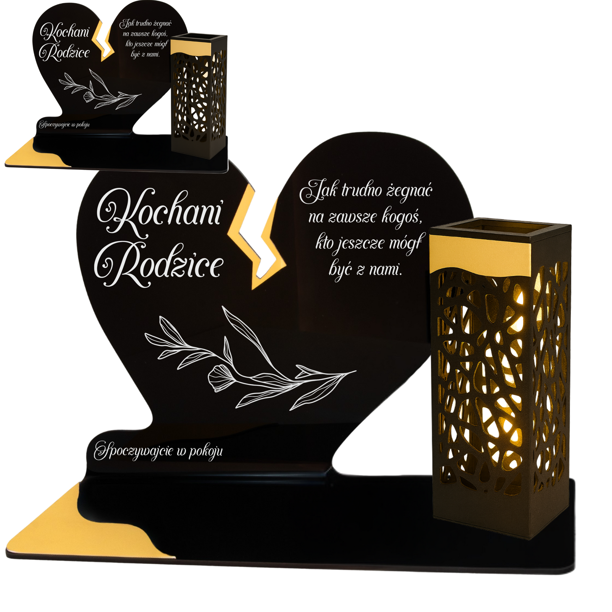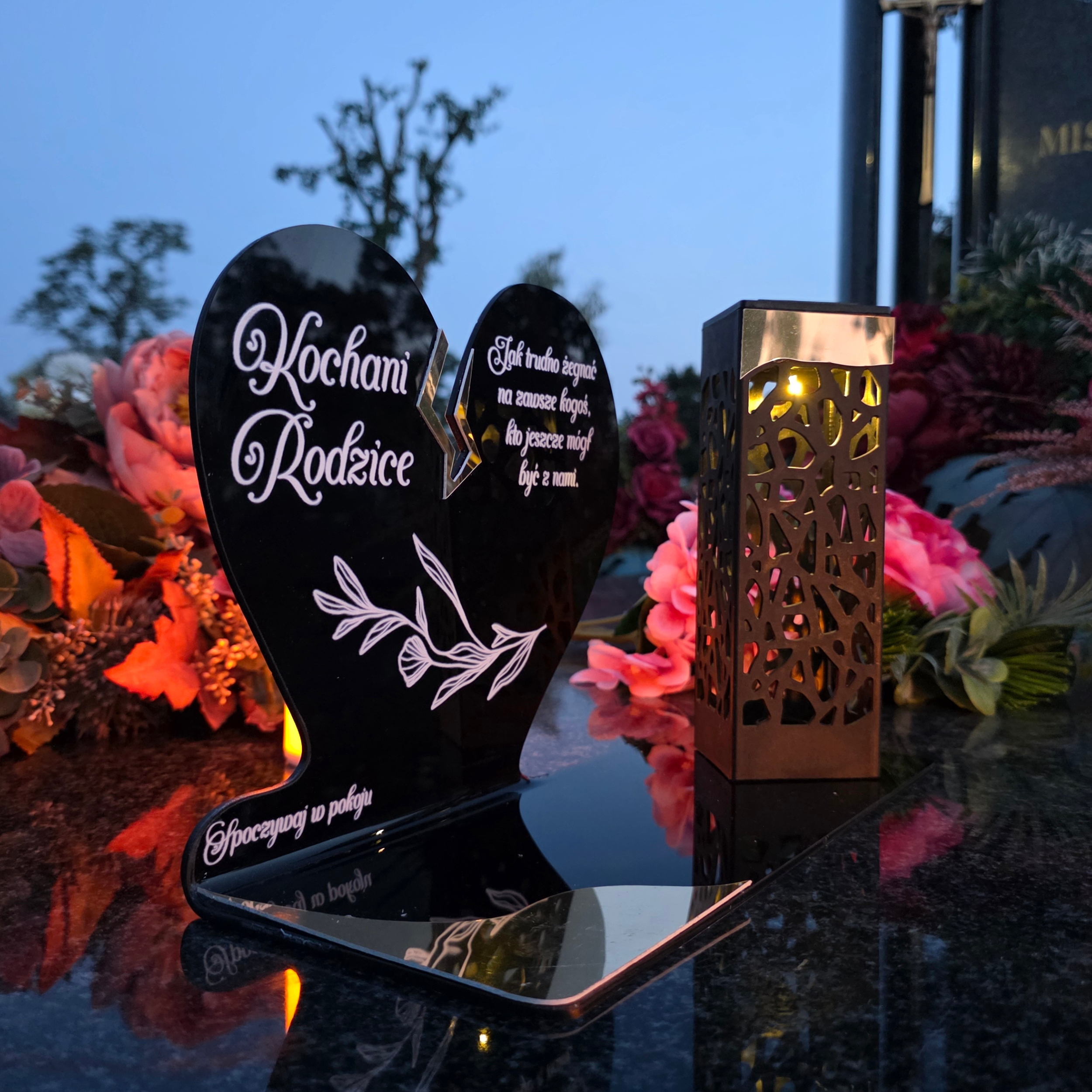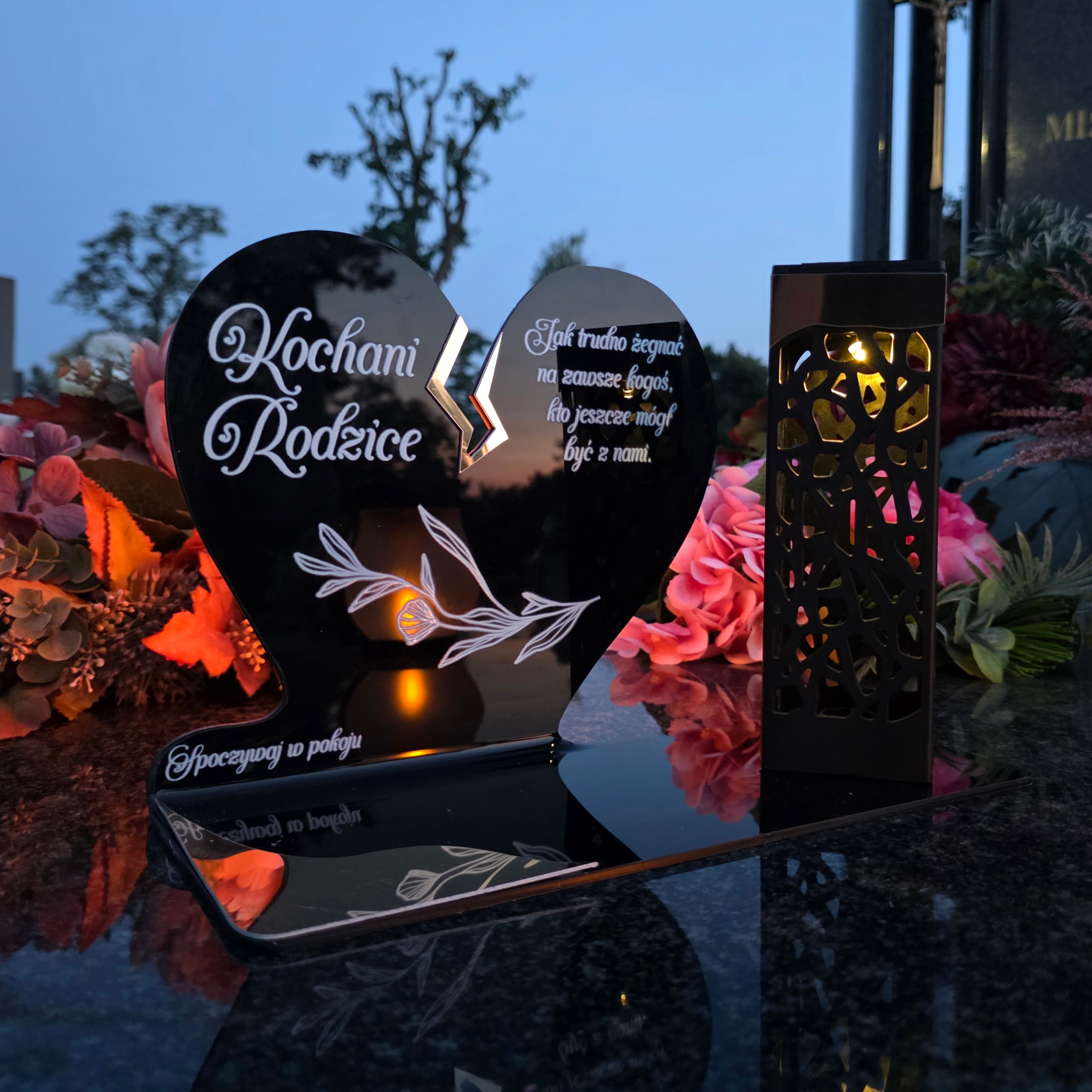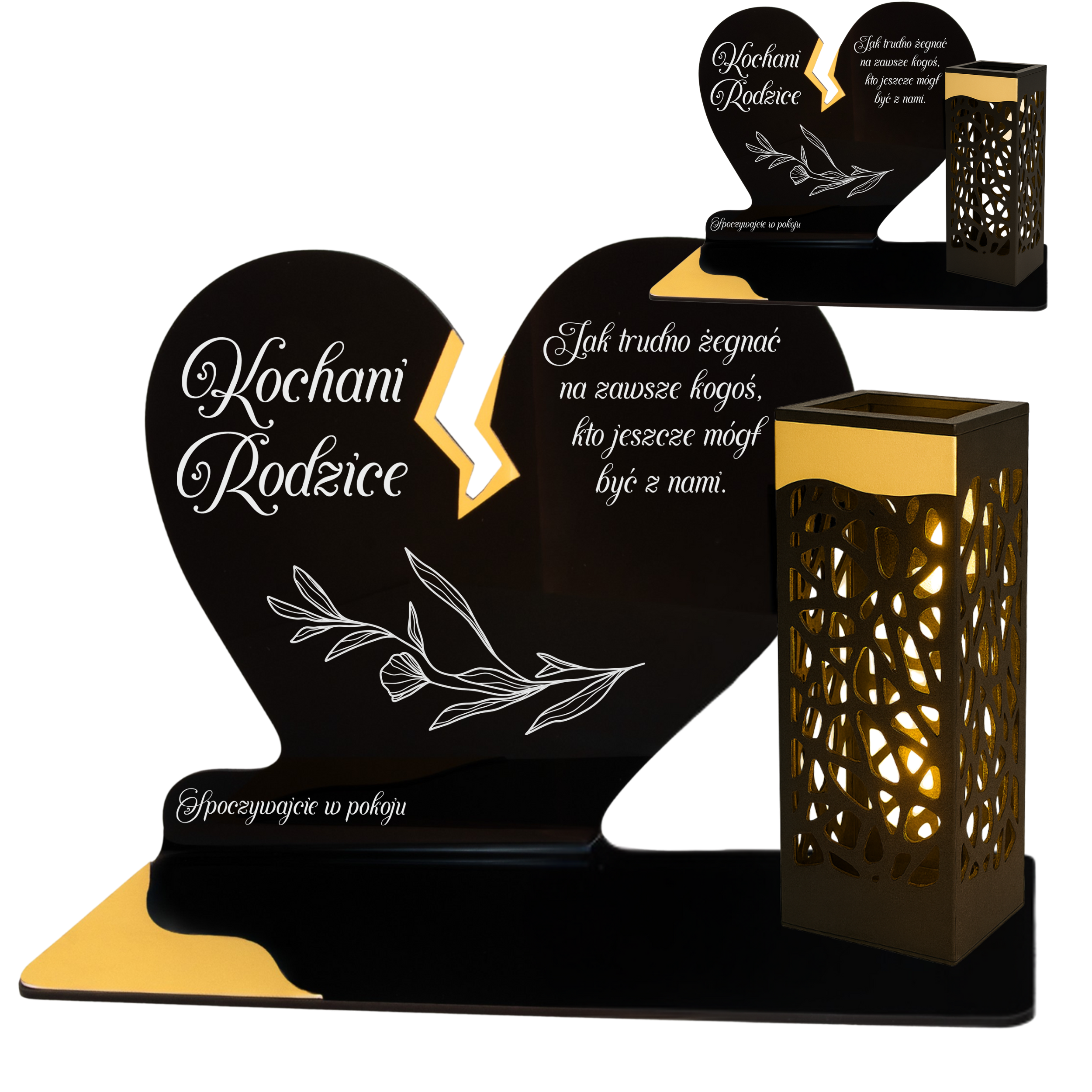 To niezwykła pamiątka łącząca tradycję z nowoczesnością. Zestawienie serca ze złotym akcentem i wysokiej lampki solarnej daje efekt elegancji oraz trwałego blasku pamięci, który rozświetla nagrobek przez cały rok – bez konieczności wymiany wkładów.