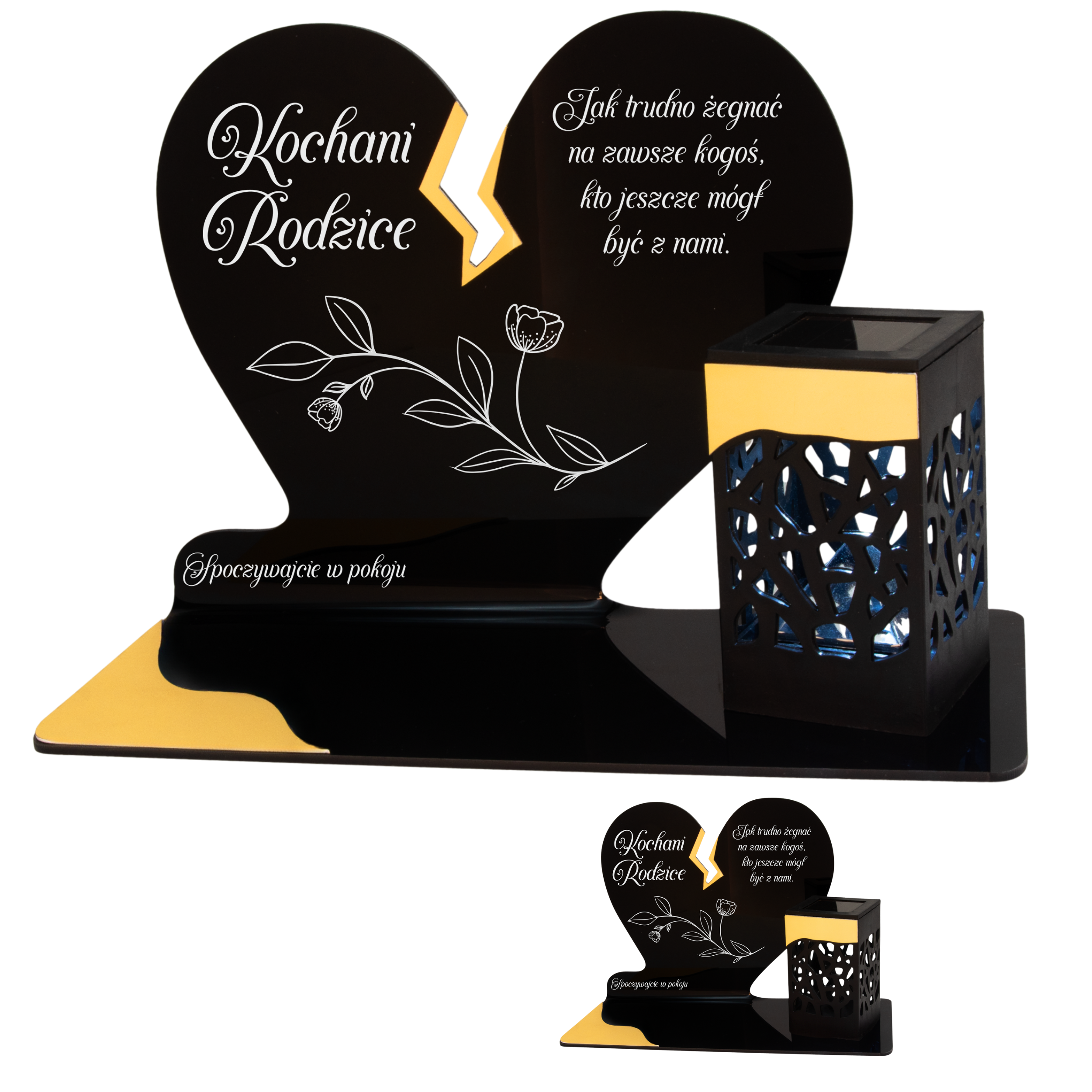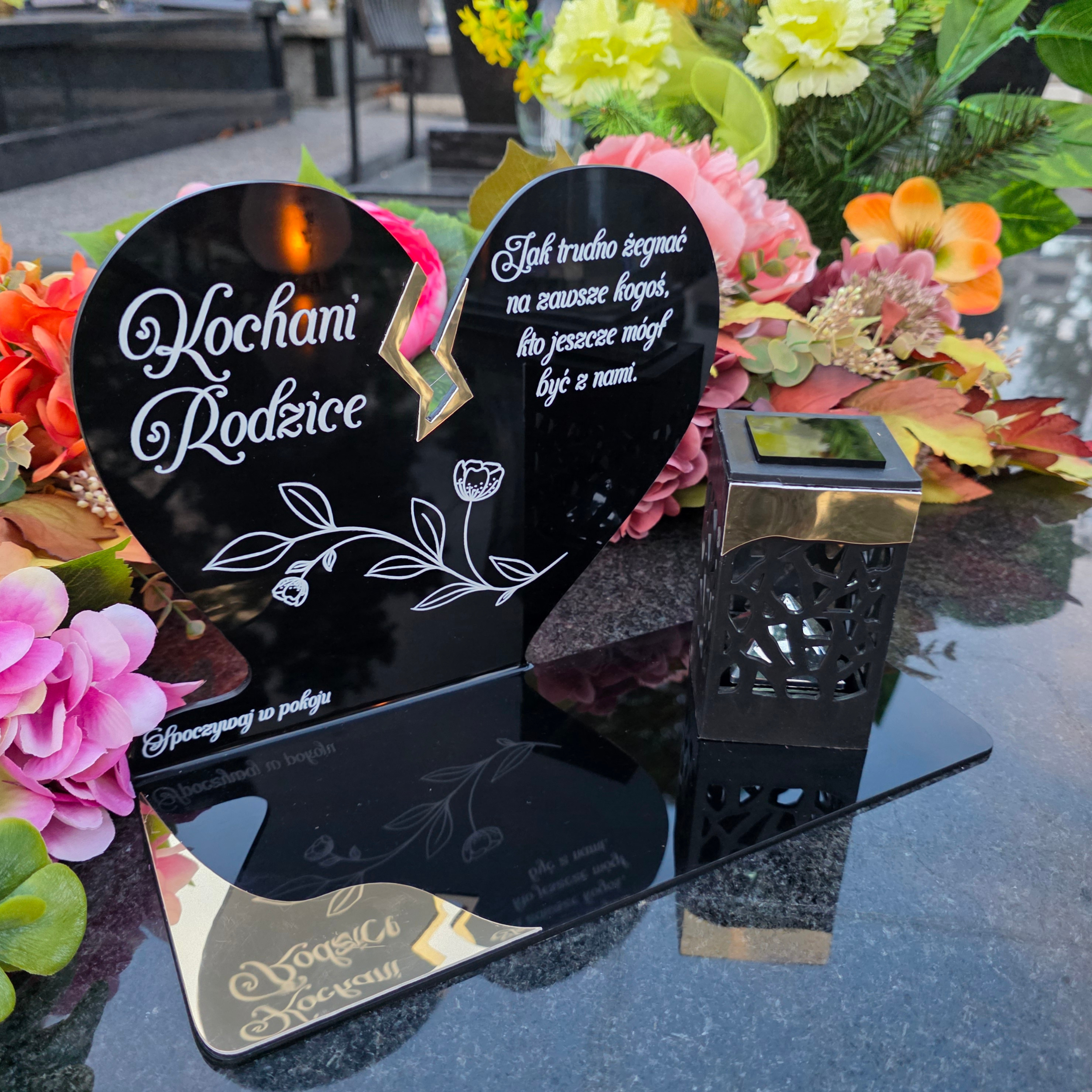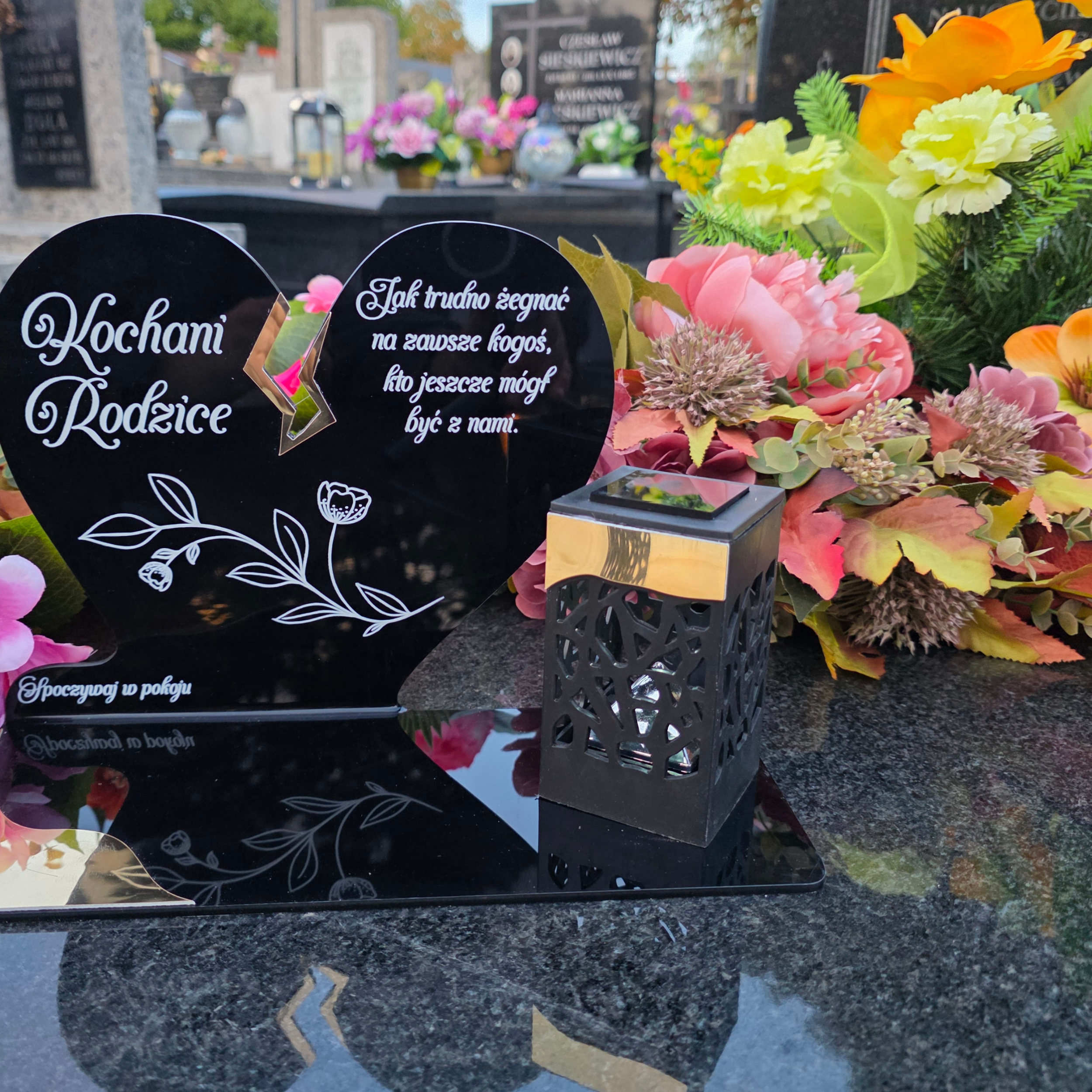 Elegancki znicz nagrobny dla Rodziców– serce ze złotymi akcentami i solarną lampką LED