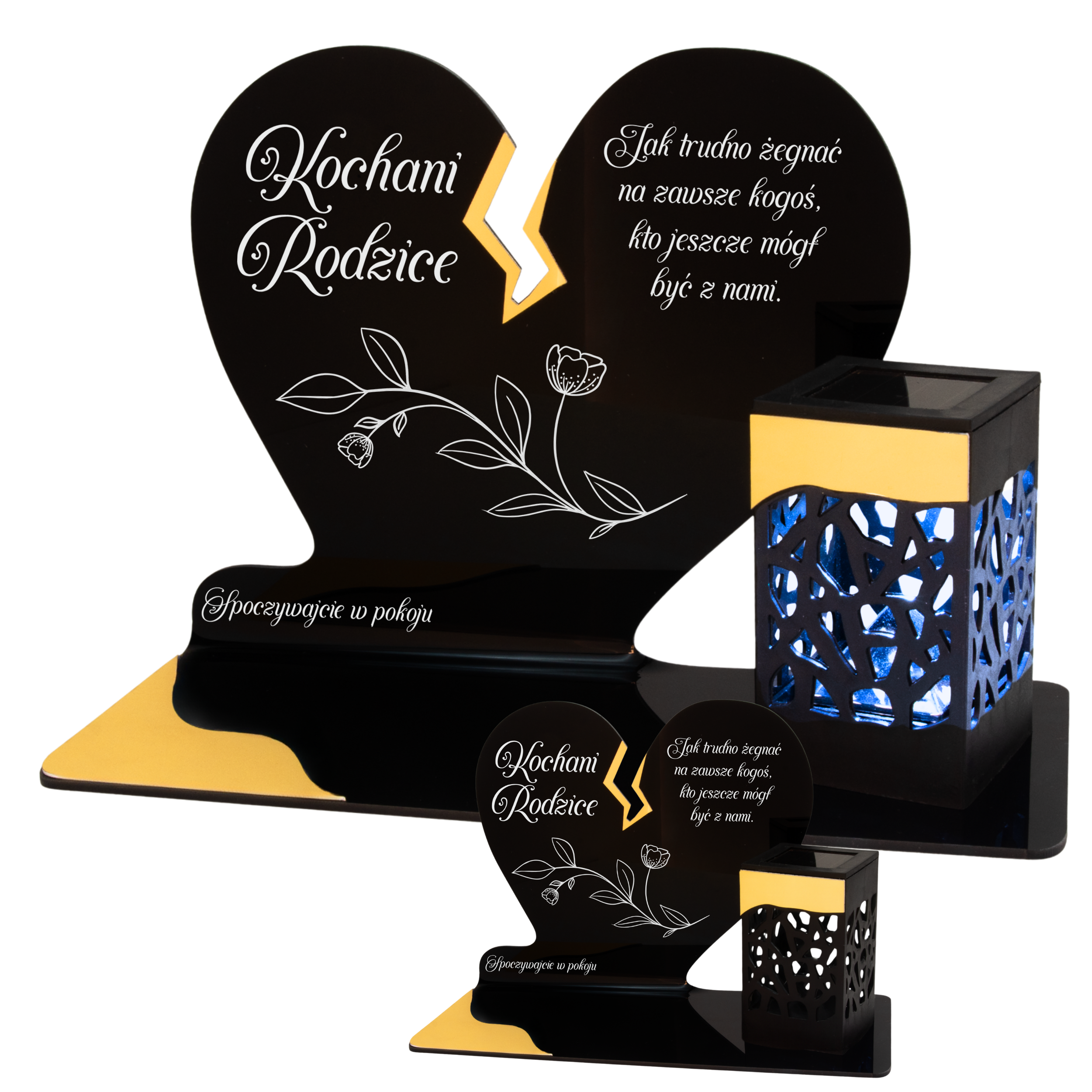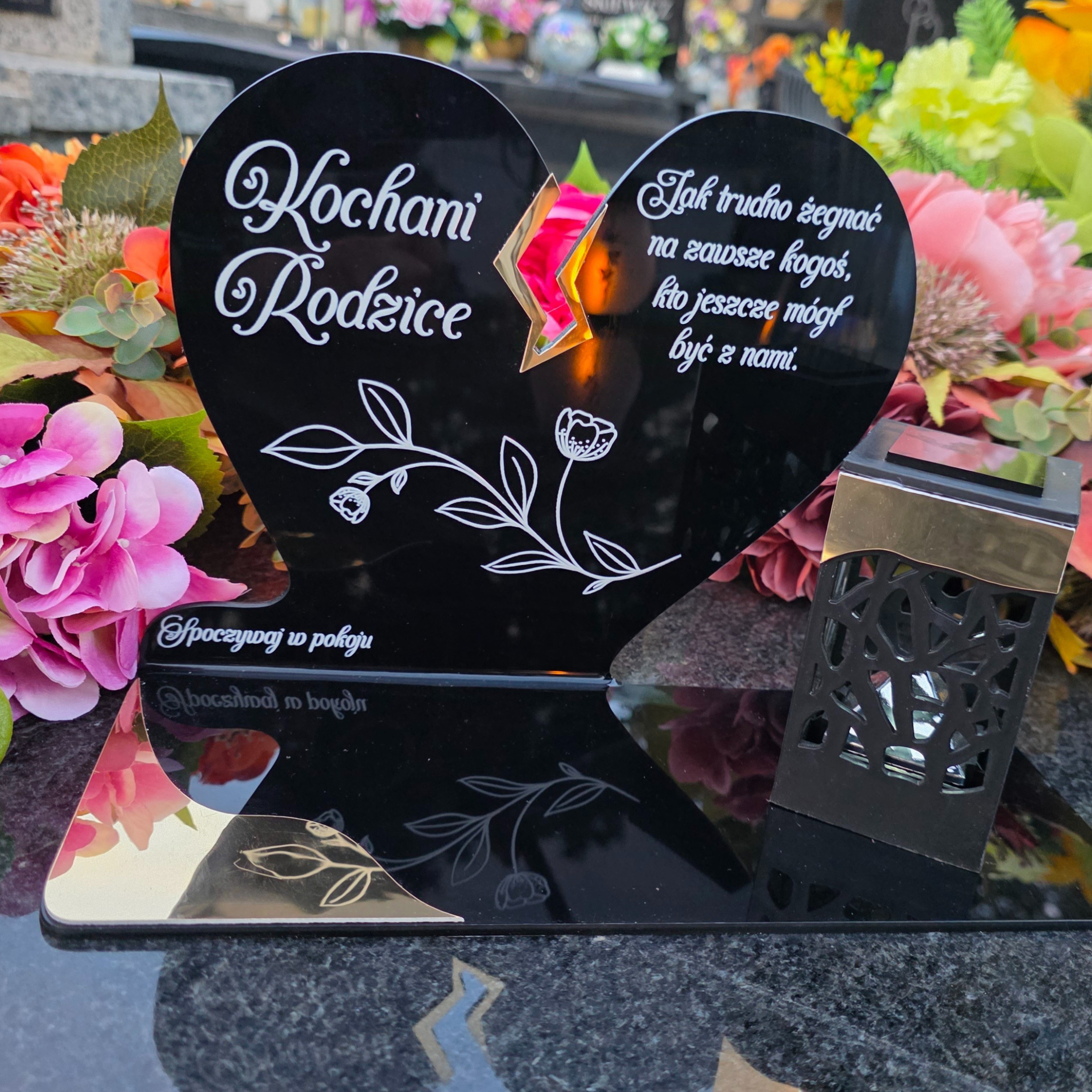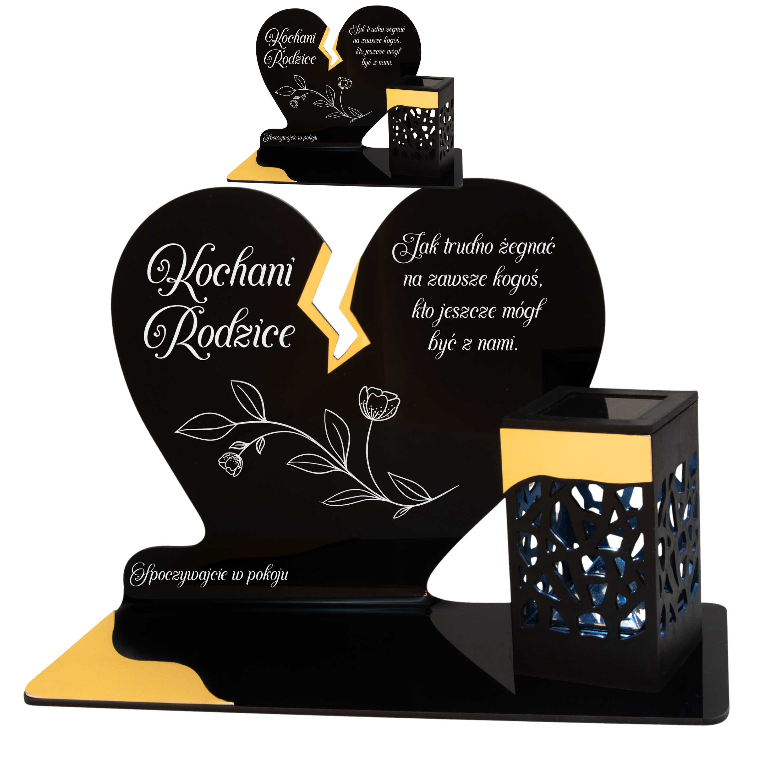 Elegancki znicz nagrobny dla Rodziców– serce ze złotymi akcentami i solarną lampką LED