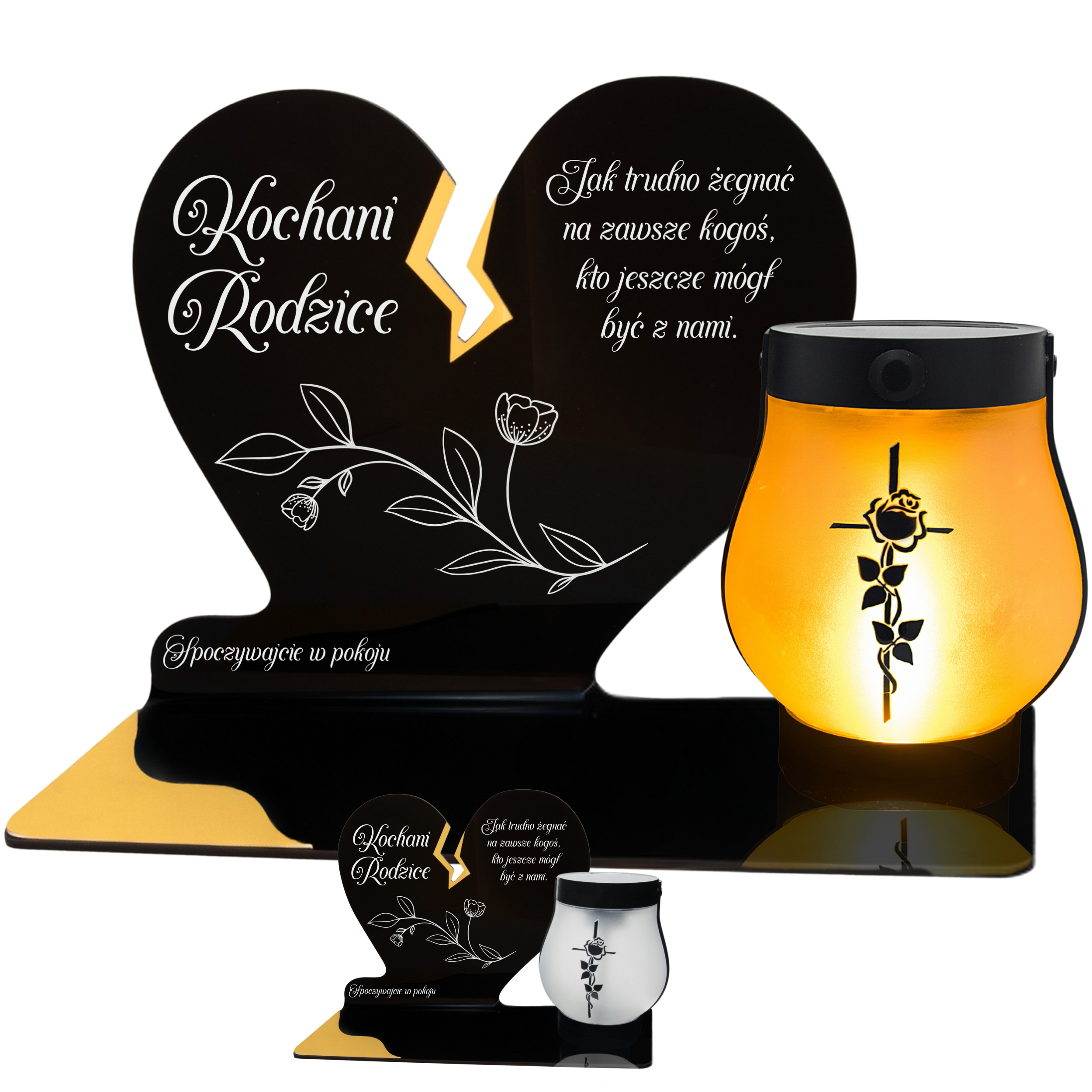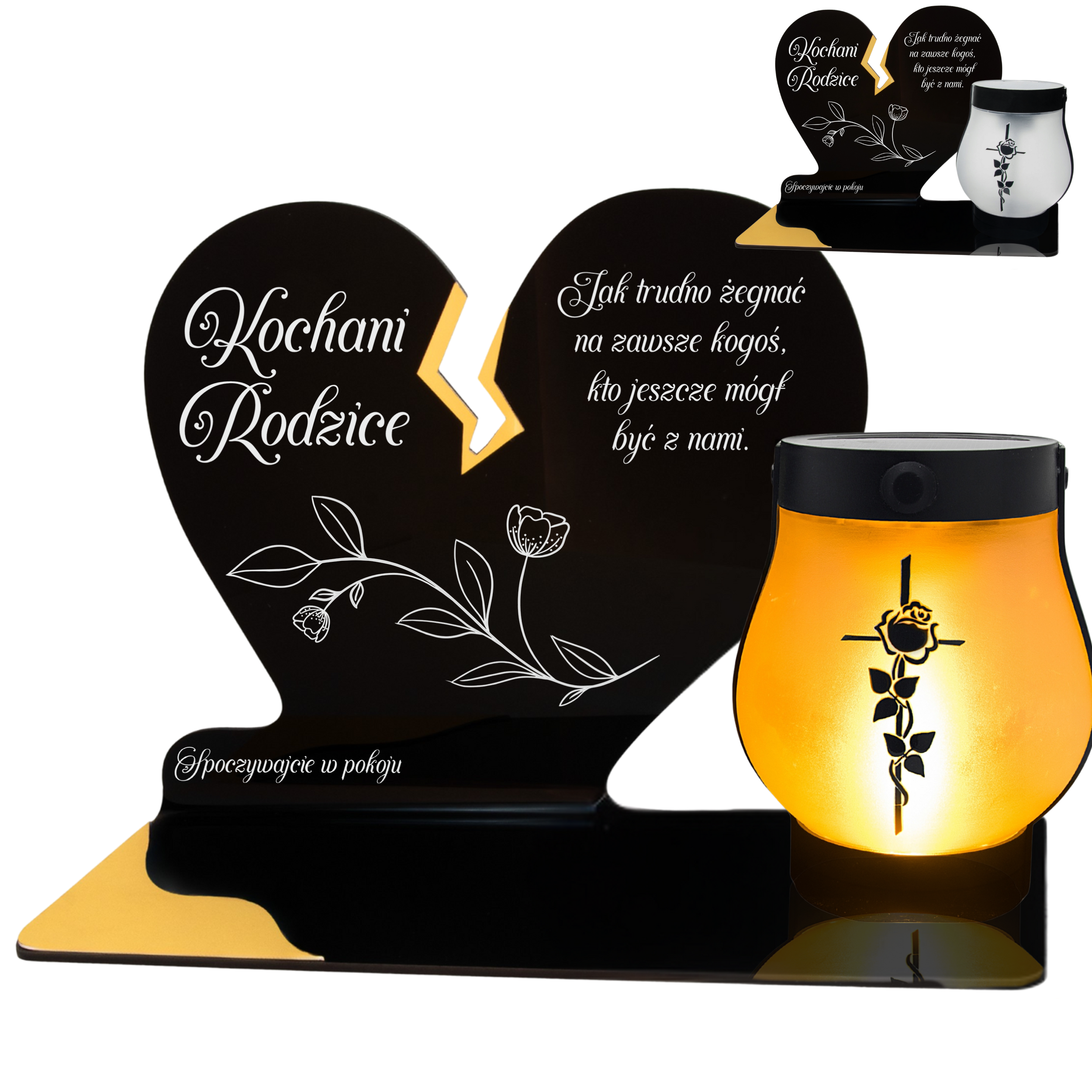 Elegancki znicz nagrobny dla Rodziców– serce ze złotymi akcentami i solarną lampką LED
