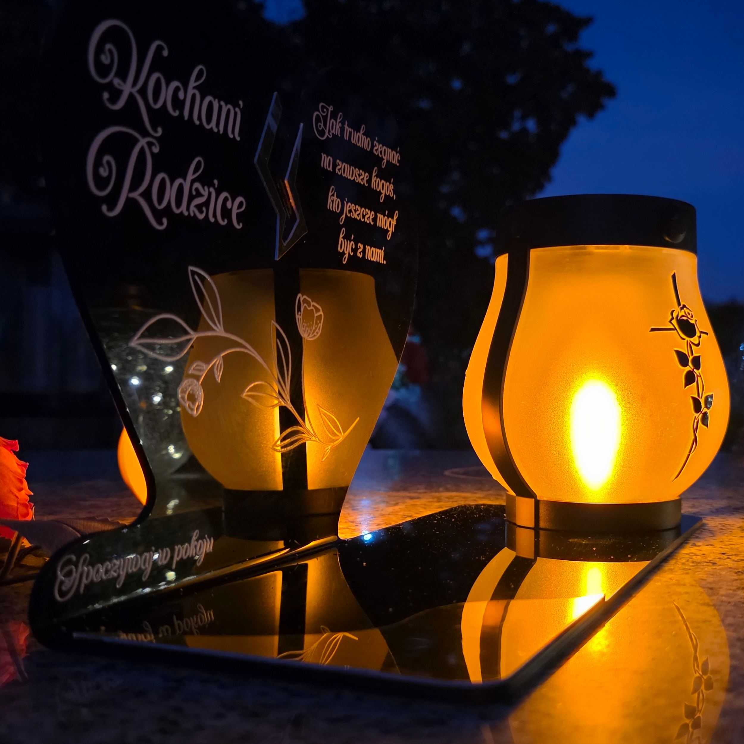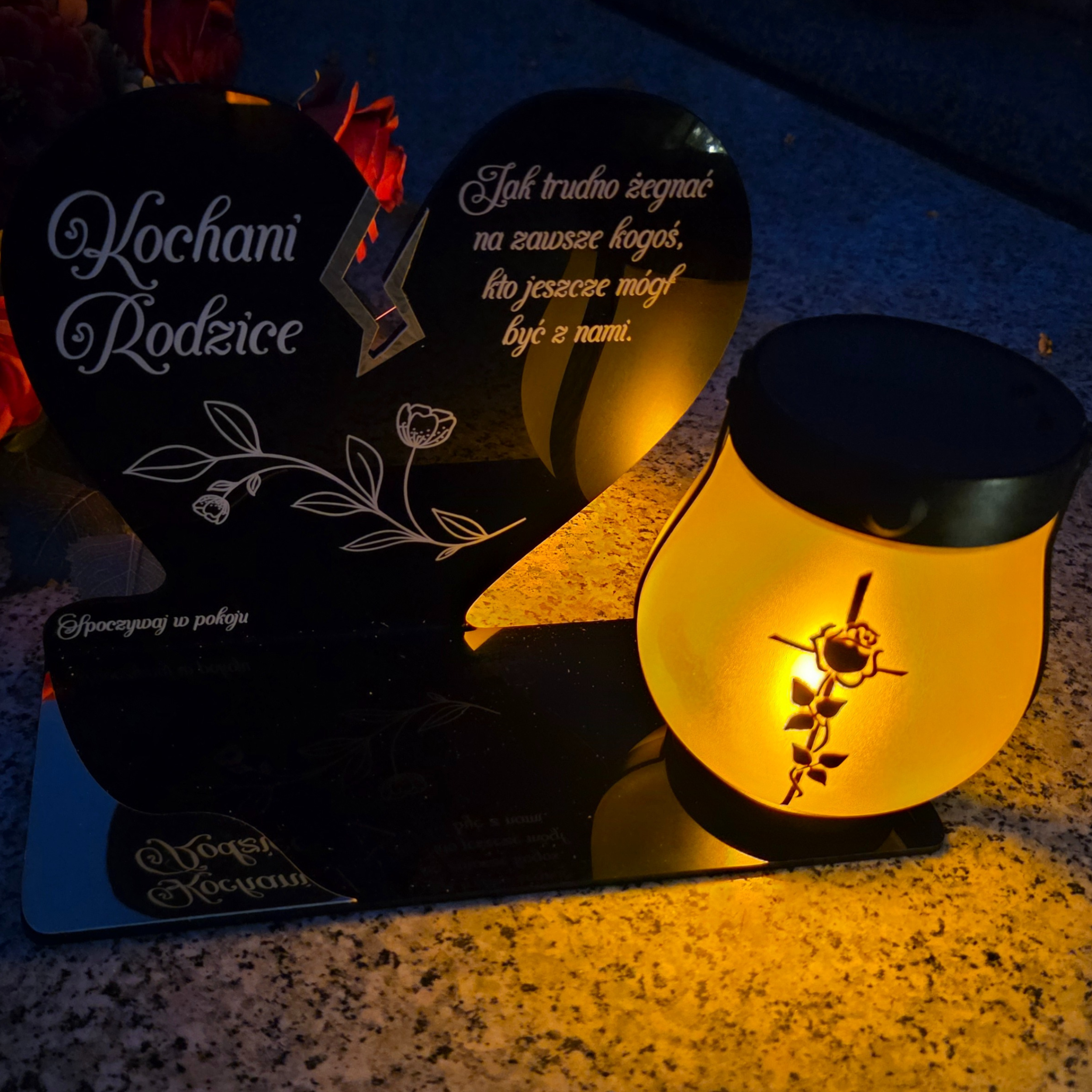 Wyjątkowy znicz nagrobny w formie czarnego serca z delikatnym złotym pęknięciem to symbol miłości, pamięci i szacunku. Elegancka forma połączona z nowoczesną, solarną lampką LED tworzy kompozycję, która po zmroku rozświetla pomnik ciepłym, bursztynowym blaskiem. Lampka ma dwa tryby świecenia (efekt płomienia lub światło stałe) i działa również po doładowaniu USB-C.