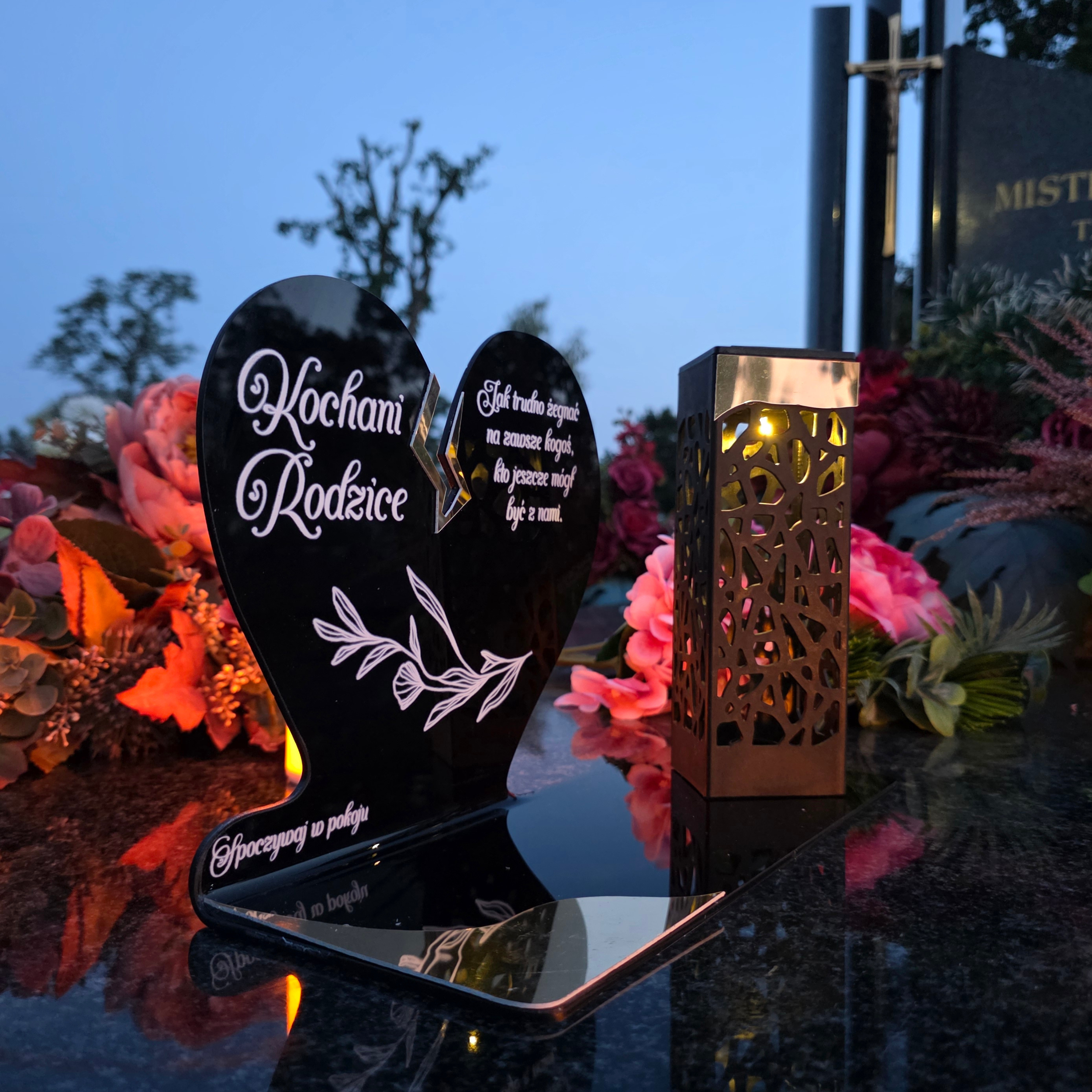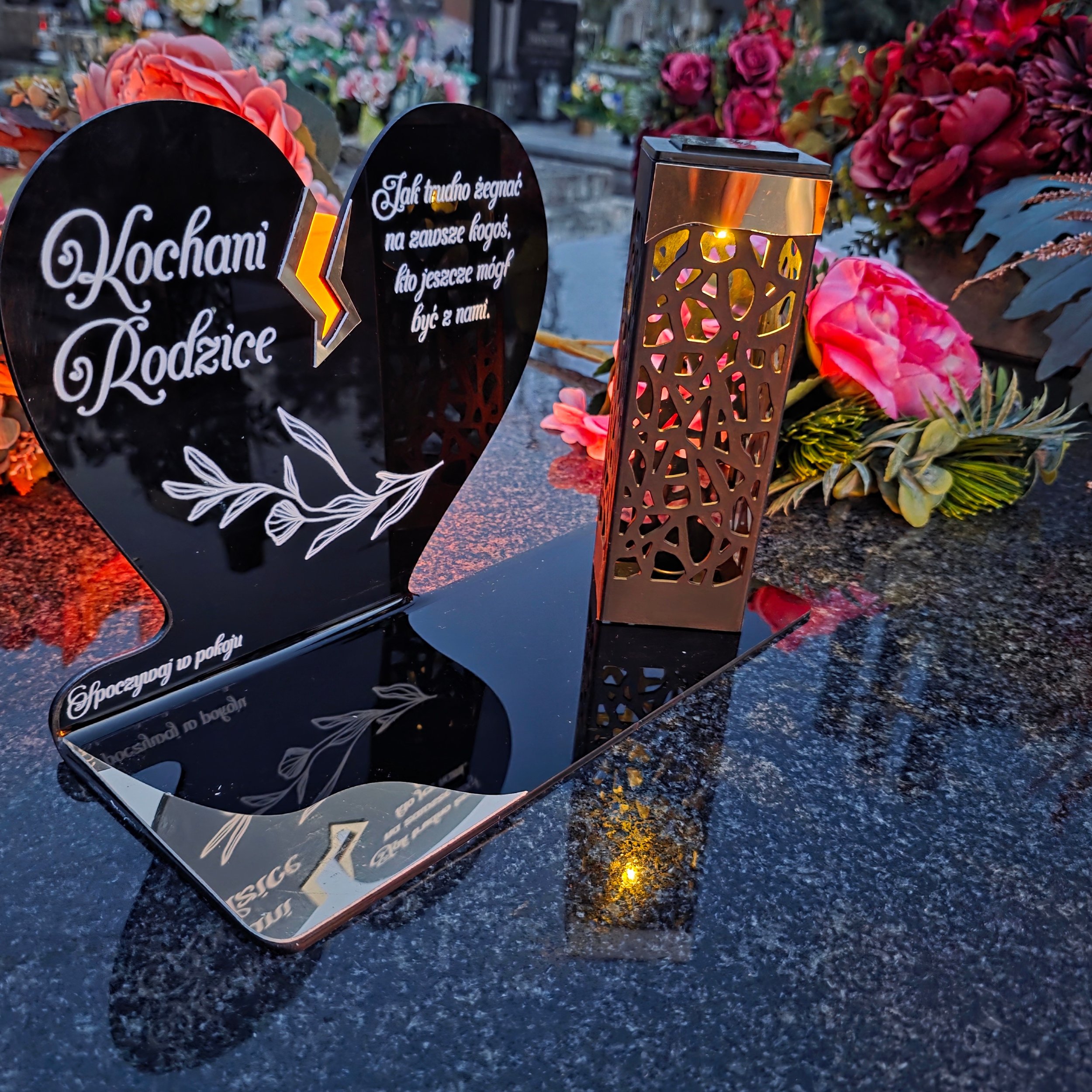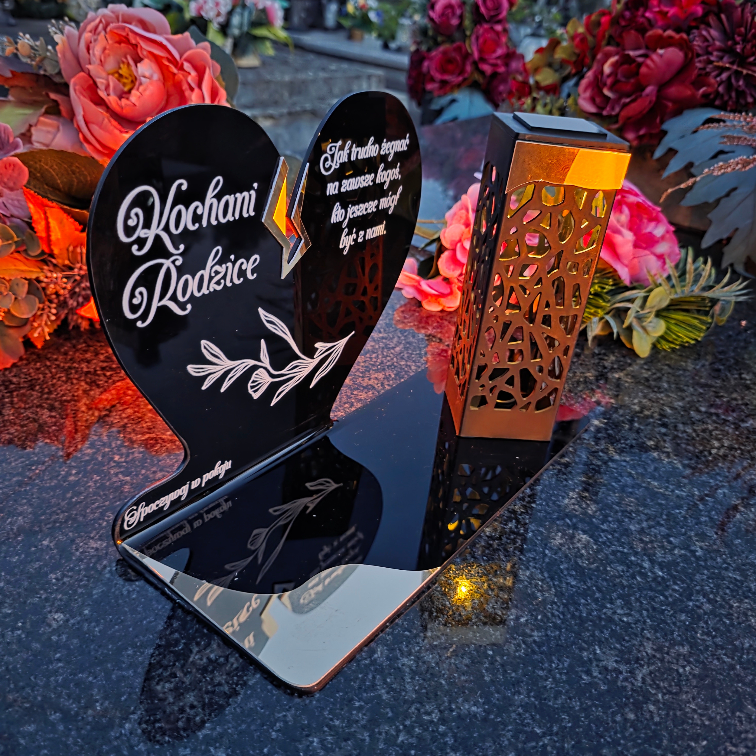 To niezwykła pamiątka łącząca tradycję z nowoczesnością. Zestawienie serca ze złotym akcentem i wysokiej lampki solarnej daje efekt elegancji oraz trwałego blasku pamięci, który rozświetla nagrobek przez cały rok – bez konieczności wymiany wkładów.