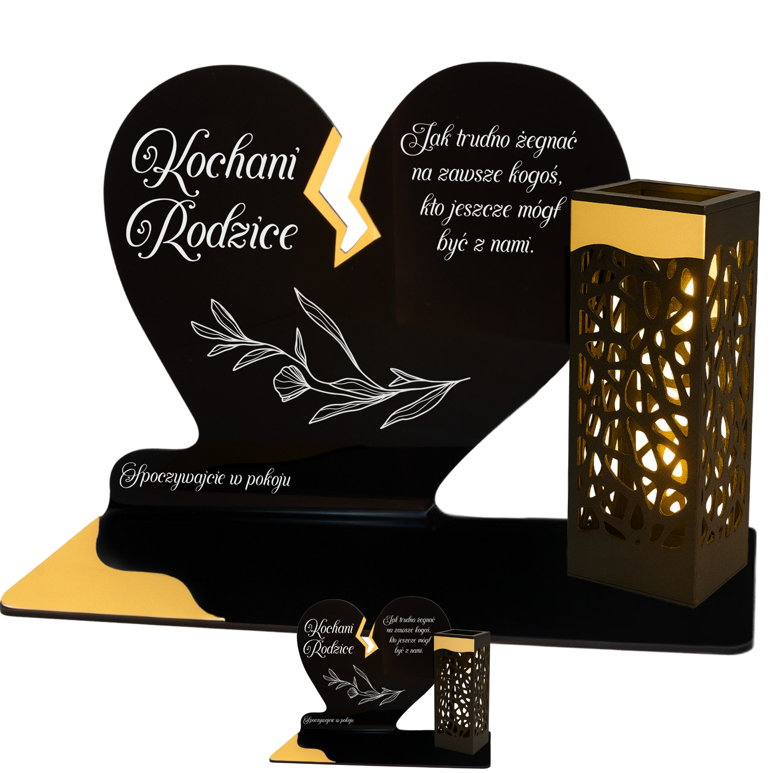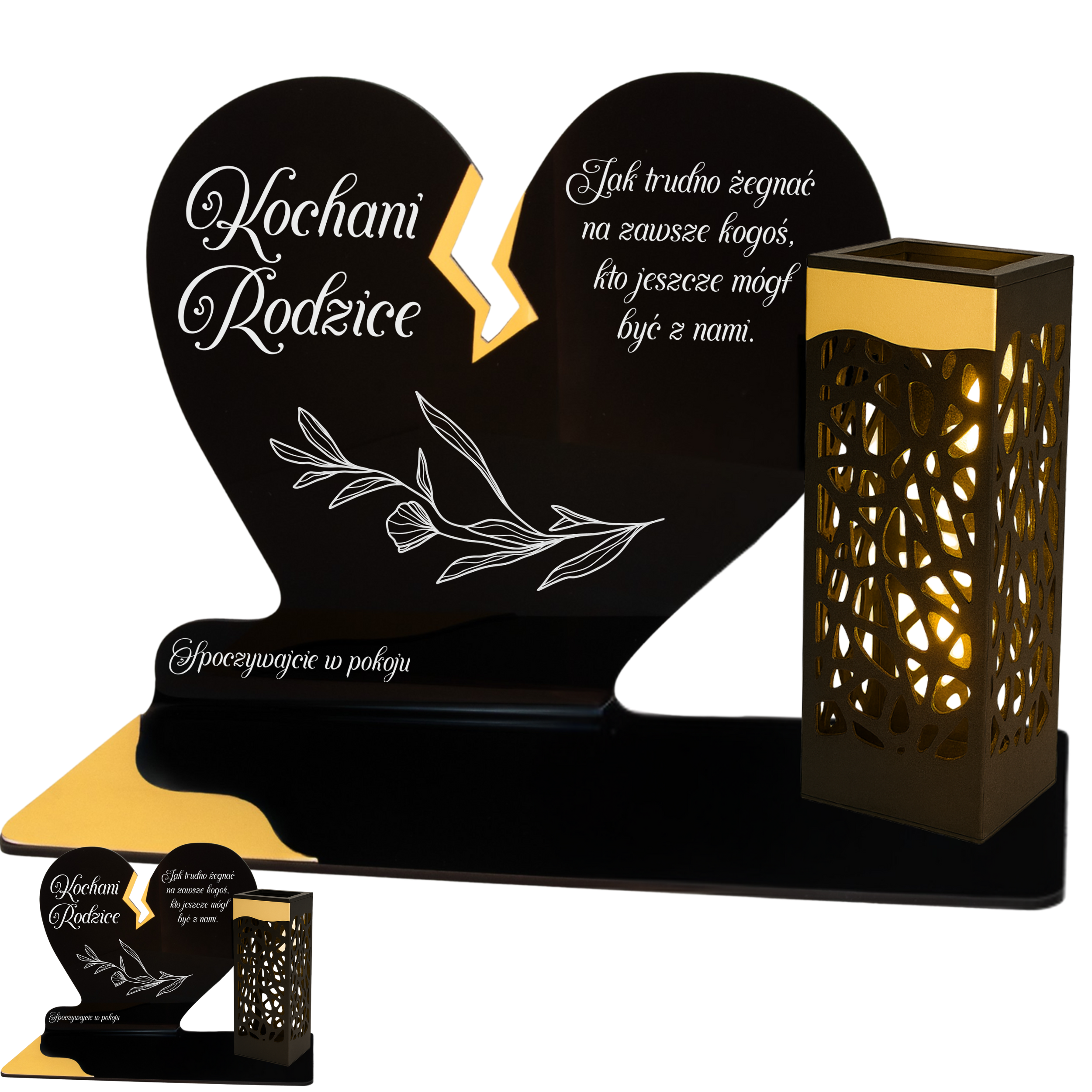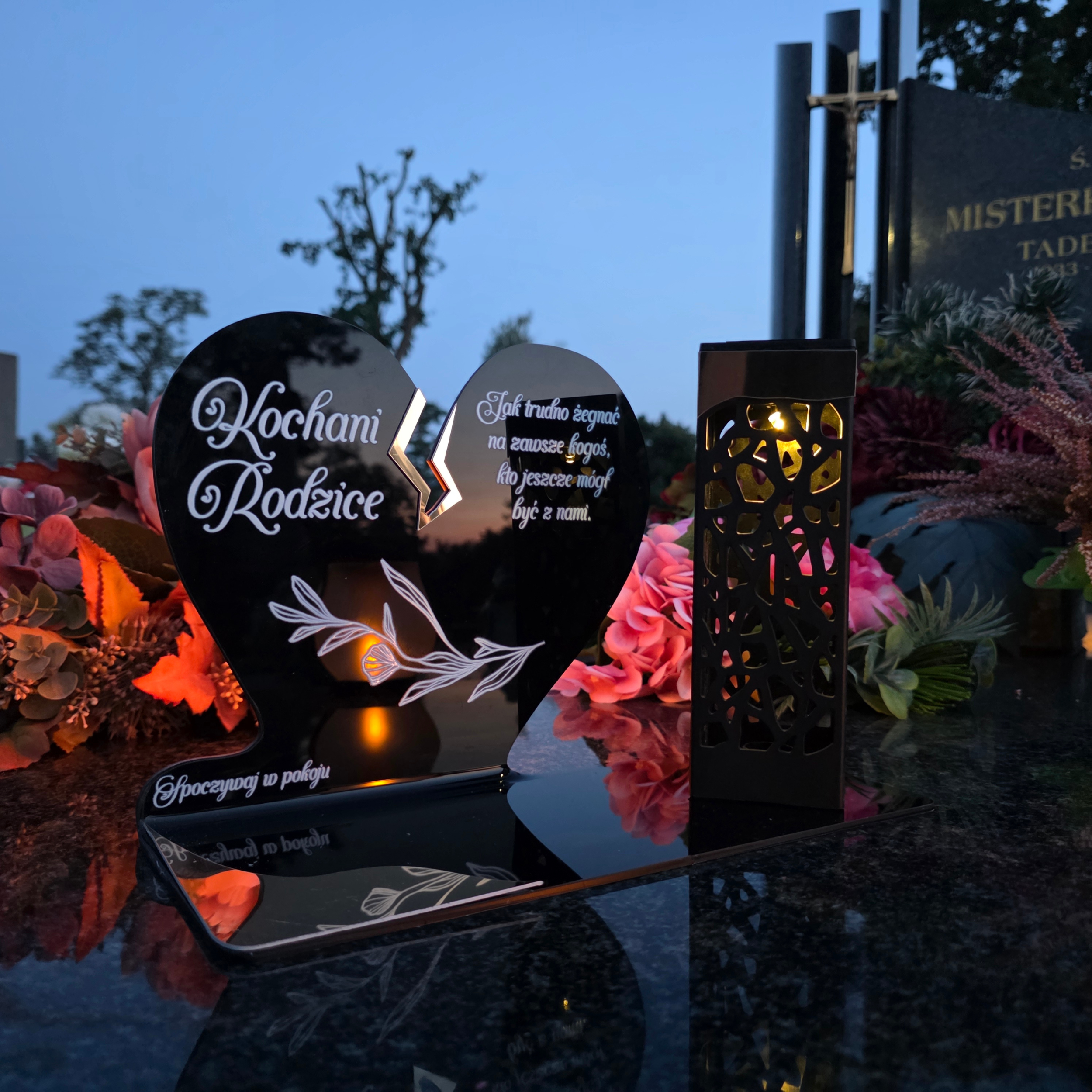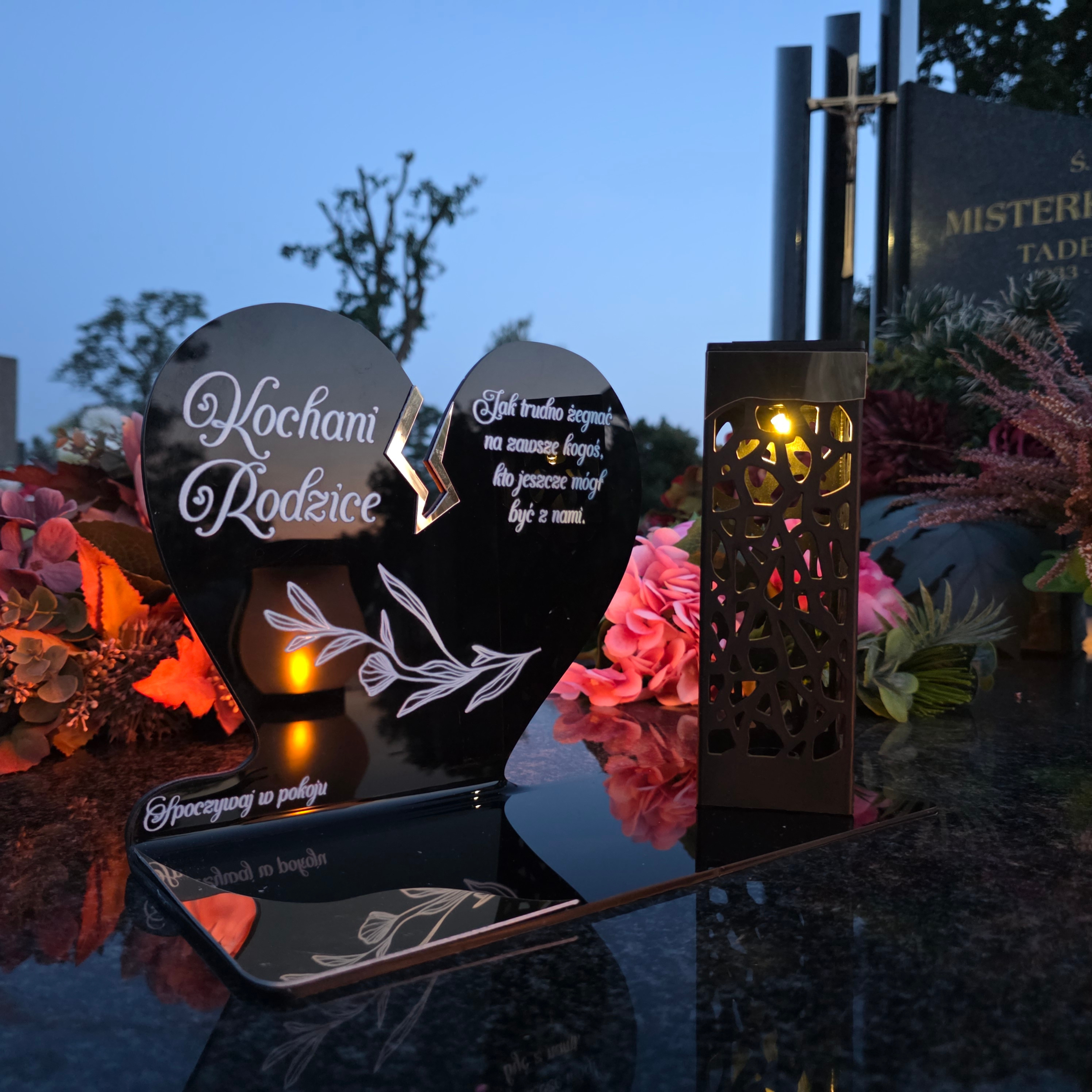 To niezwykła pamiątka łącząca tradycję z nowoczesnością. Zestawienie serca ze złotym akcentem i wysokiej lampki solarnej daje efekt elegancji oraz trwałego blasku pamięci, który rozświetla nagrobek przez cały rok – bez konieczności wymiany wkładów.