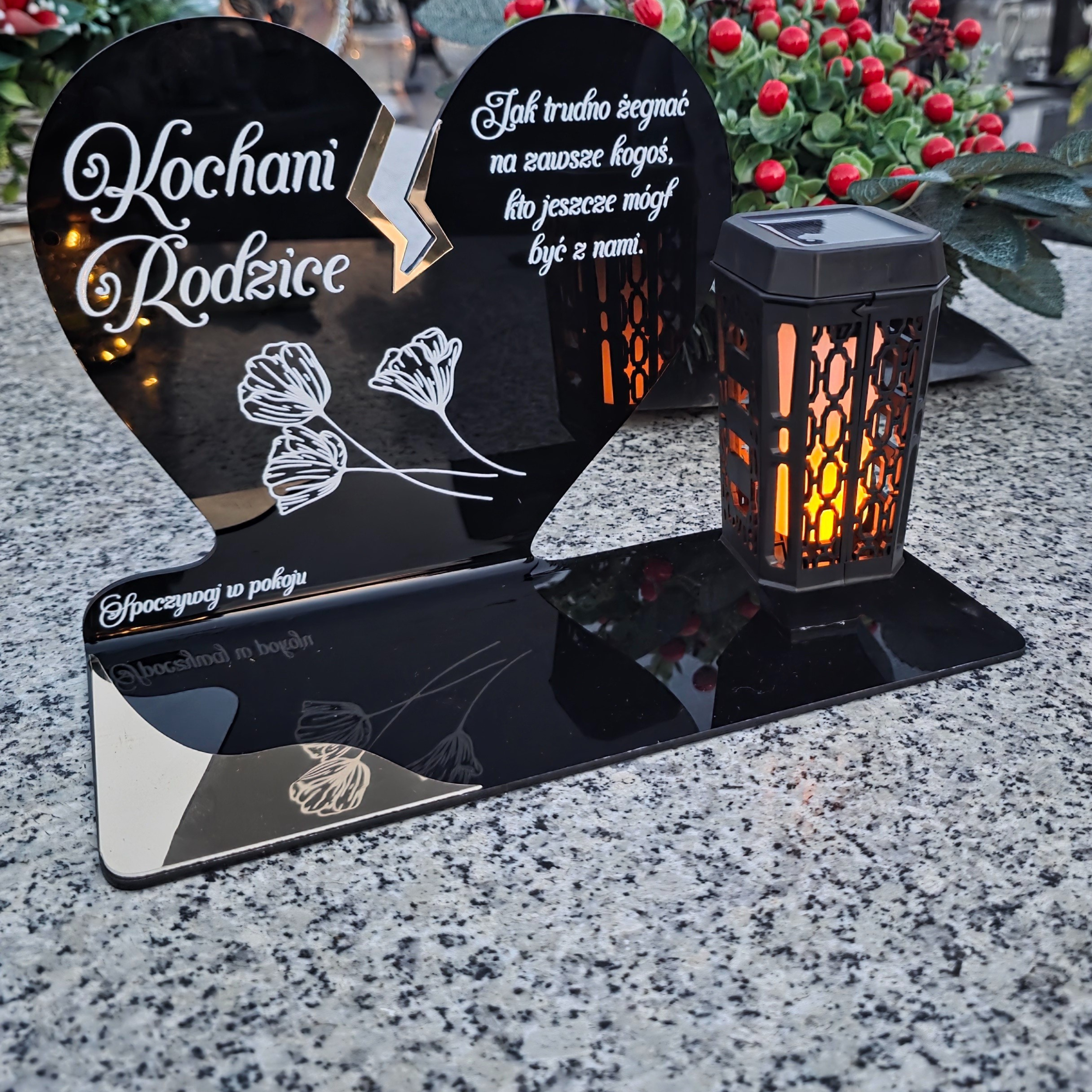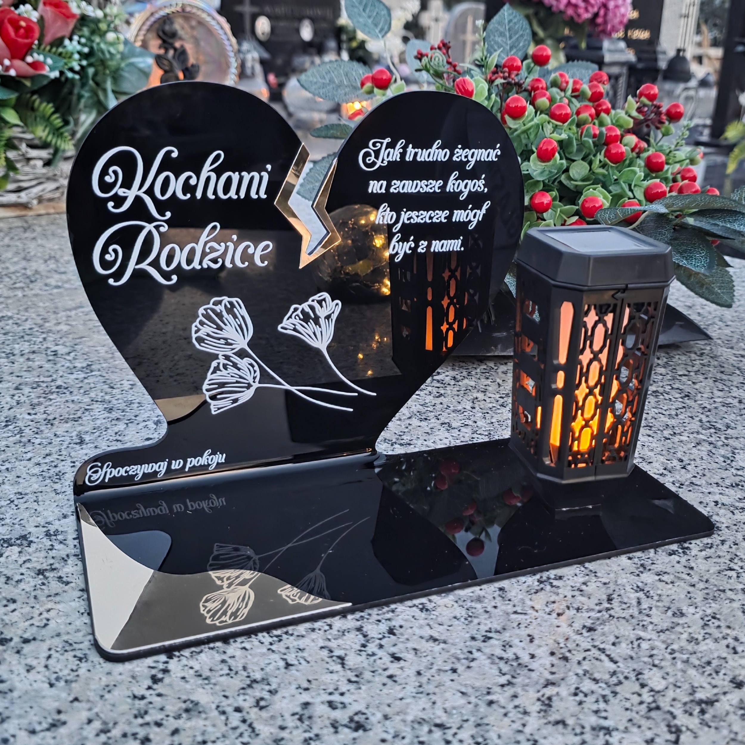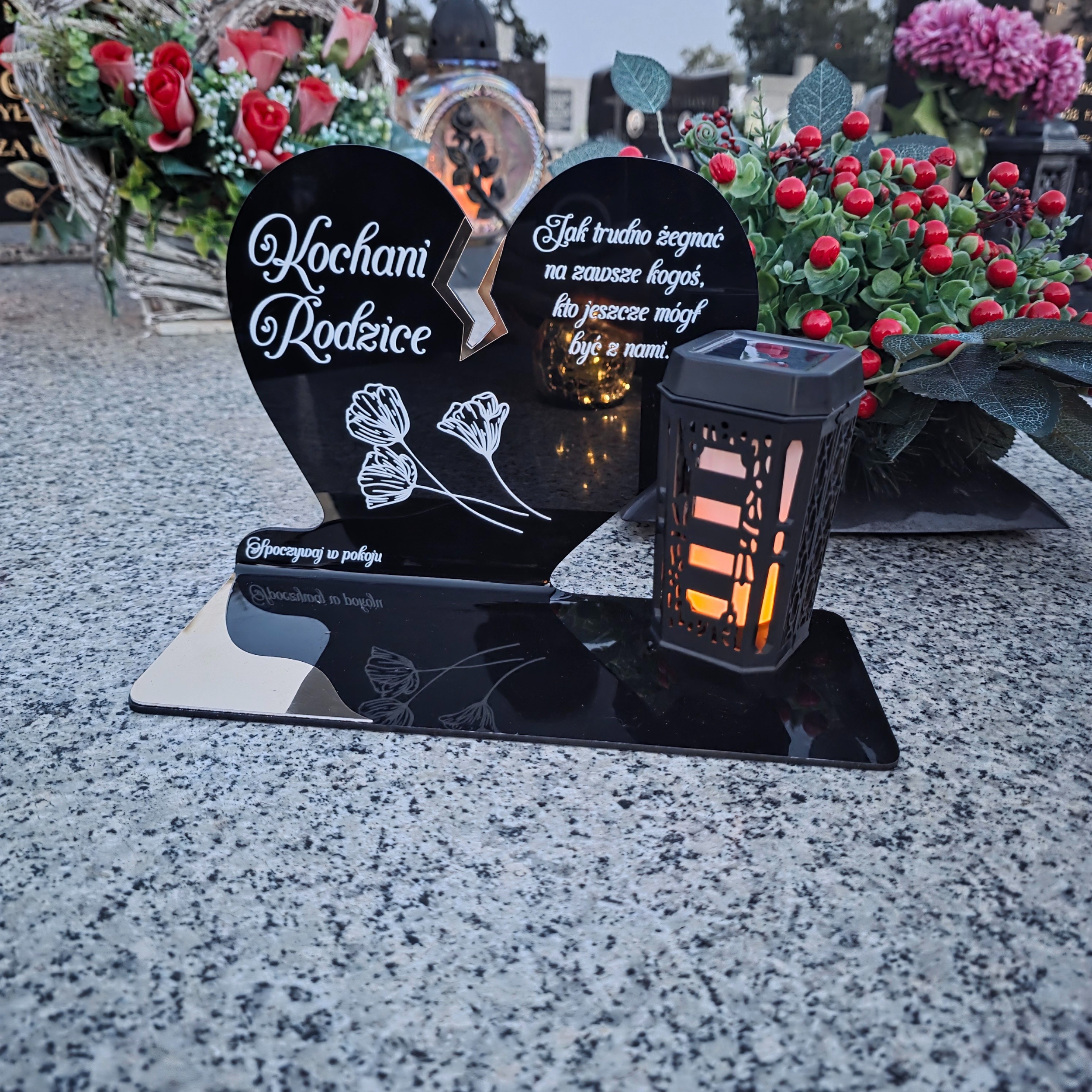 Ten wyjątkowy znicz nagrobny w formie czarnego serca z delikatnym złotym pęknięciem to piękny symbol miłości i pamięci, która nigdy nie gaśnie. Dedykacja „Kochani Rodzice” oraz subtelny motyw kwiatowy nadają całości wzruszającego i eleganckiego charakteru. Zestaw dopełnia nowoczesna lampka solarna LED, która po zmroku rozświetla pomnik ciepłym blaskiem, tworząc atmosferę zadumy i spokoju.