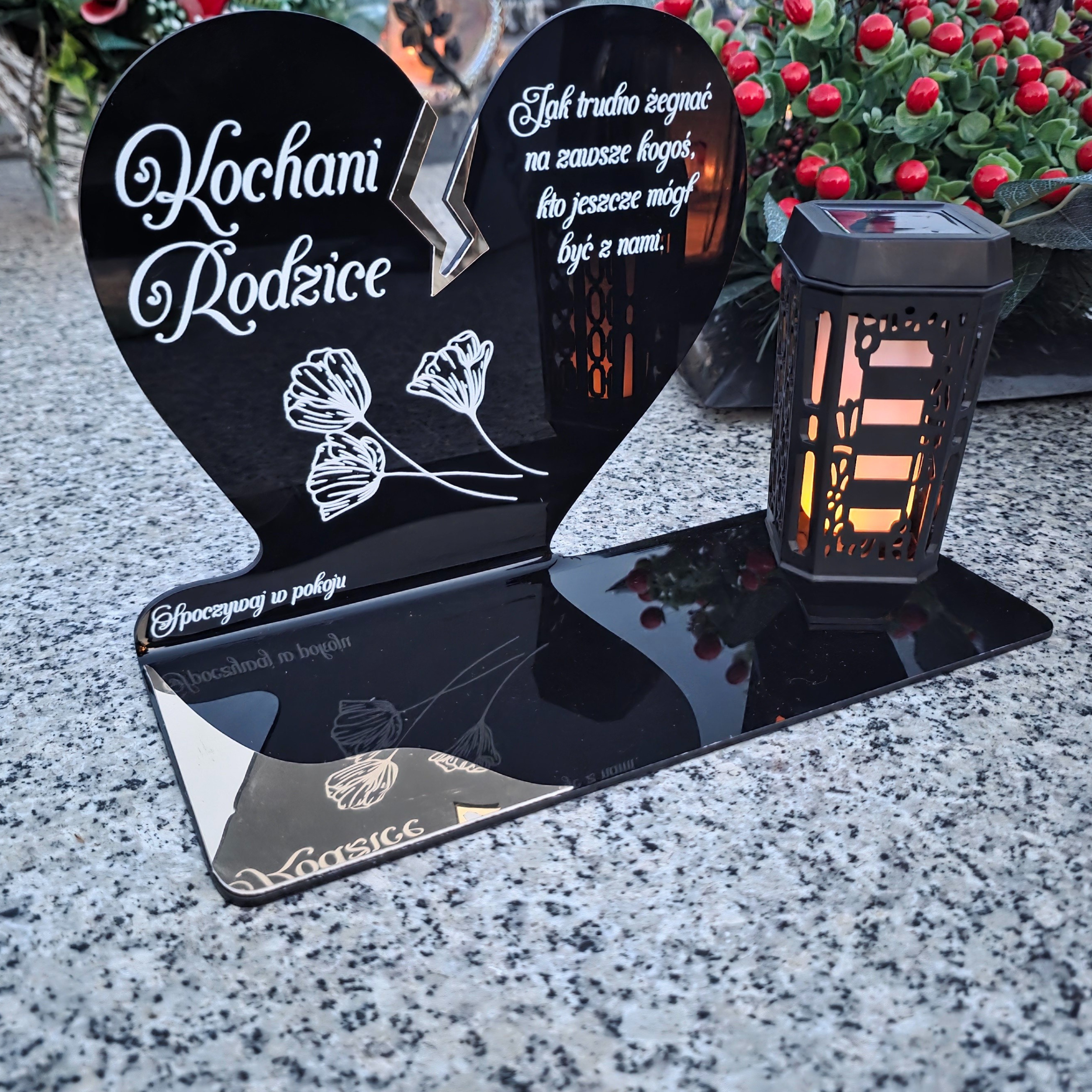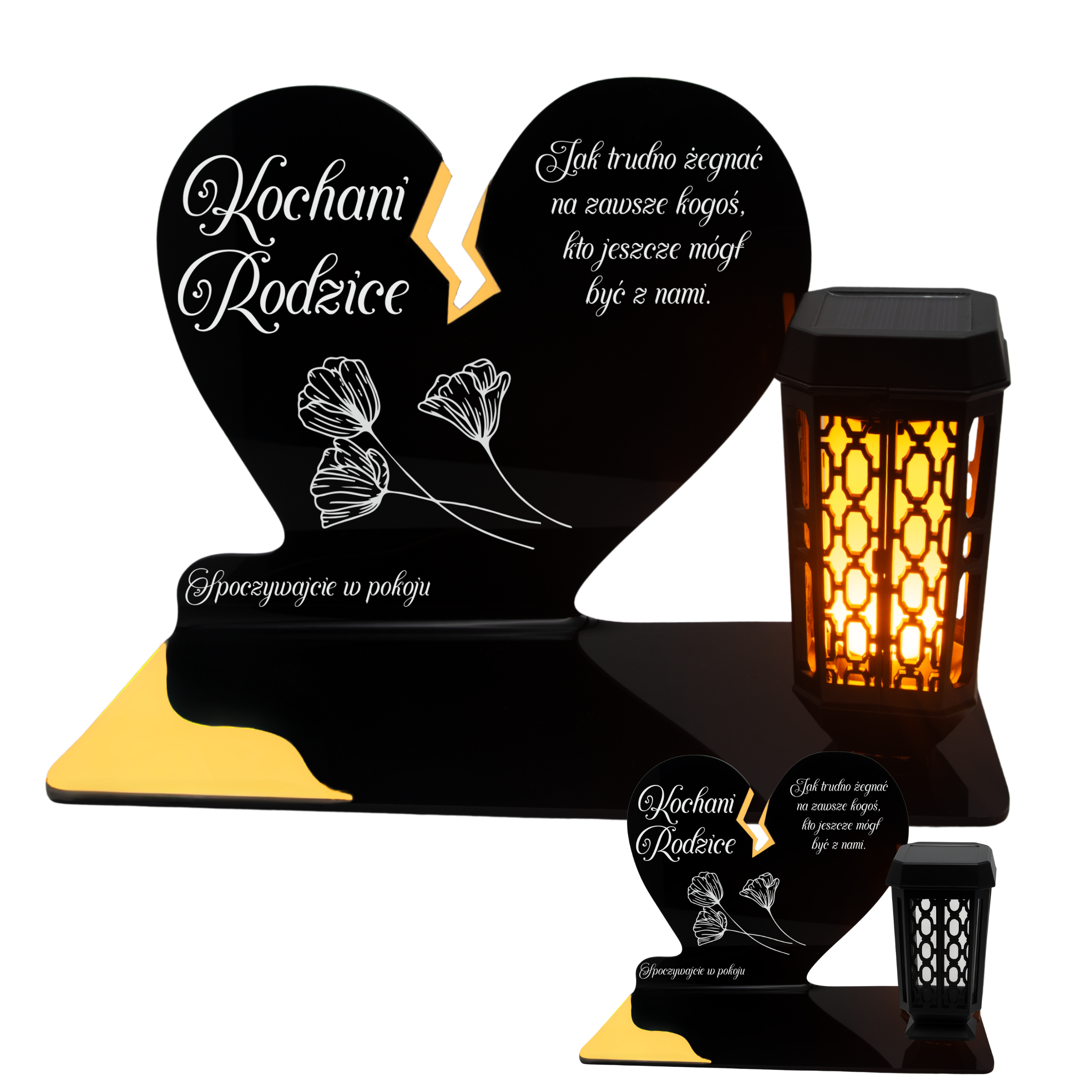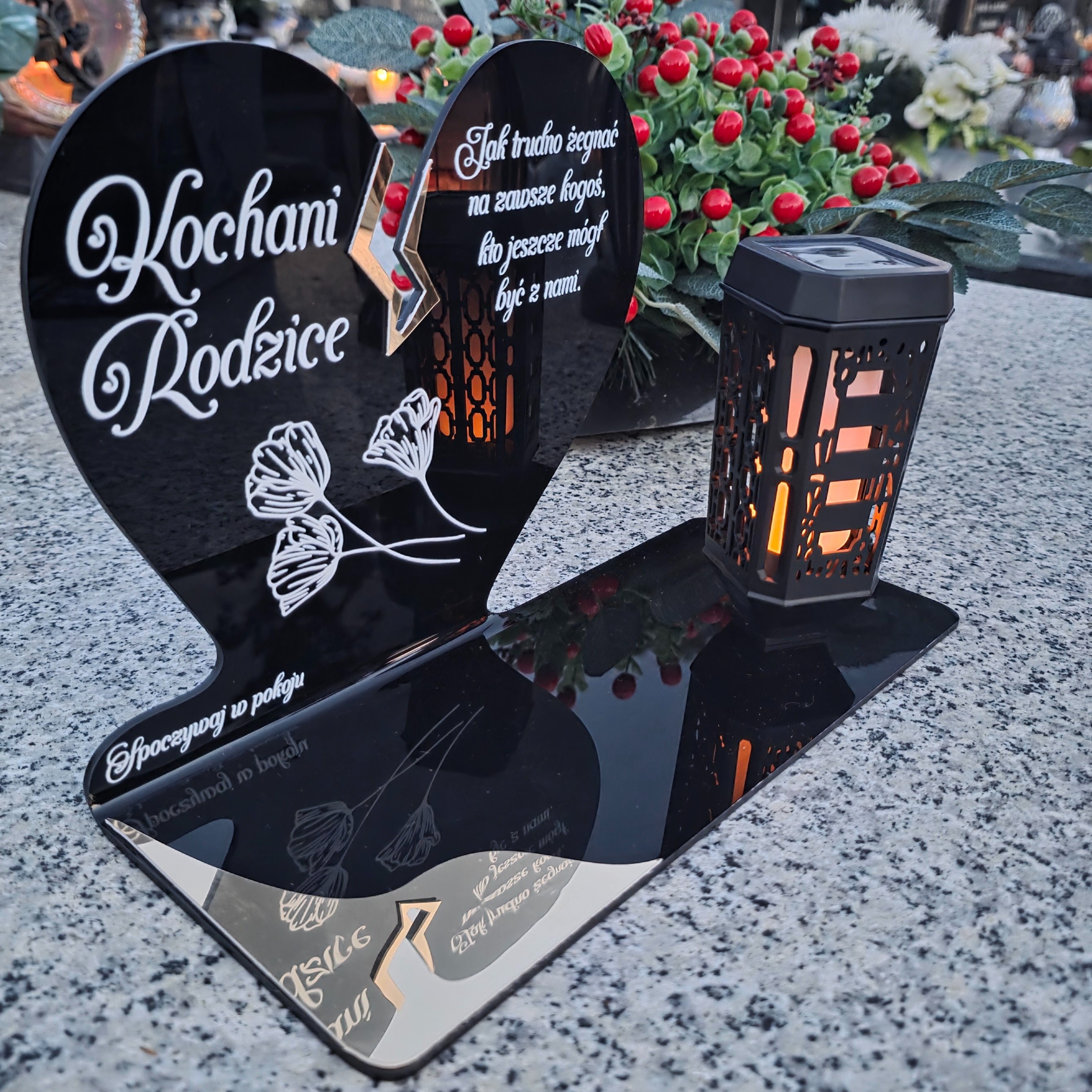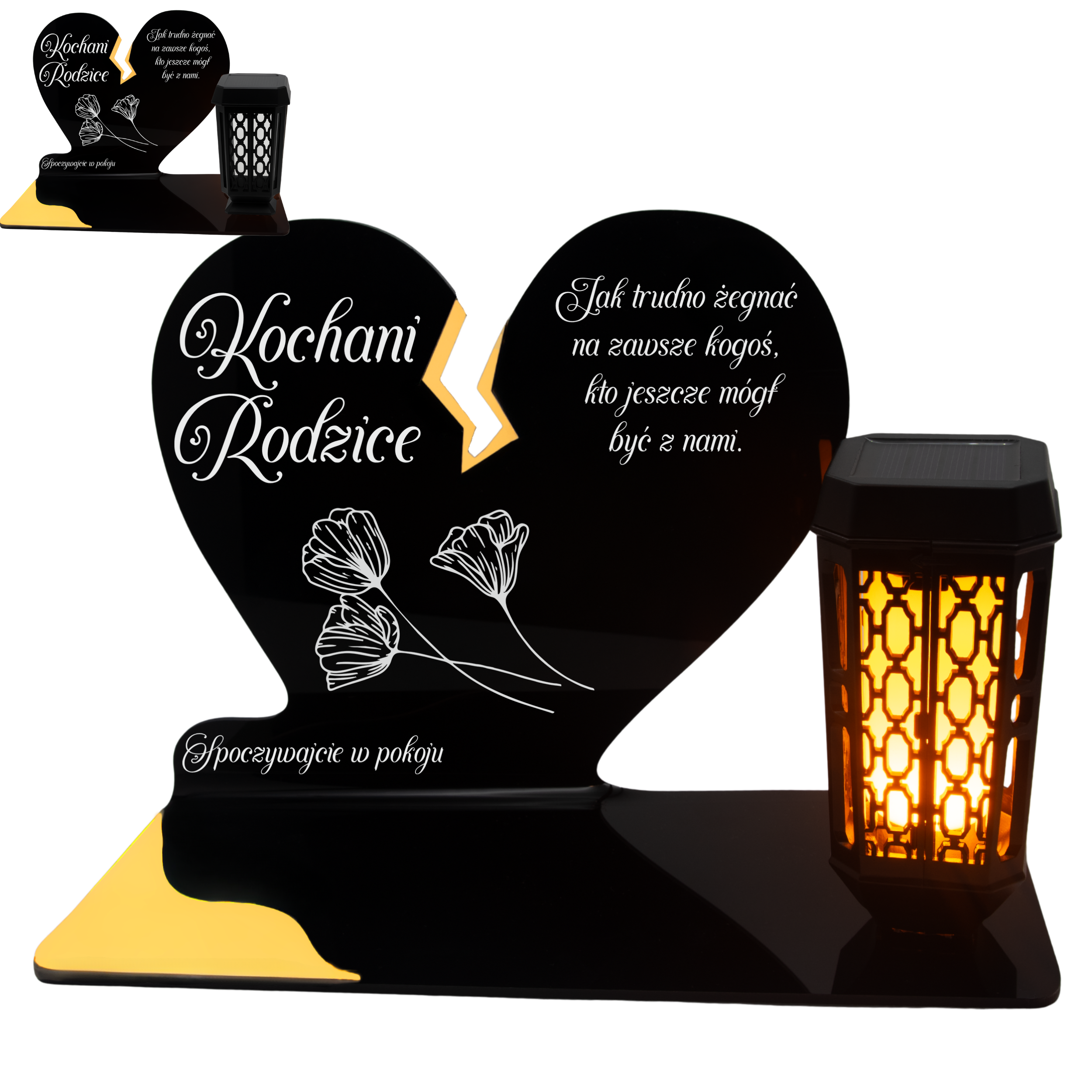 Ten wyjątkowy znicz nagrobny w formie czarnego serca z delikatnym złotym pęknięciem to piękny symbol miłości i pamięci, która nigdy nie gaśnie. Dedykacja „Kochani Rodzice” oraz subtelny motyw kwiatowy nadają całości wzruszającego i eleganckiego charakteru. Zestaw dopełnia nowoczesna lampka solarna LED, która po zmroku rozświetla pomnik ciepłym blaskiem, tworząc atmosferę zadumy i spokoju.