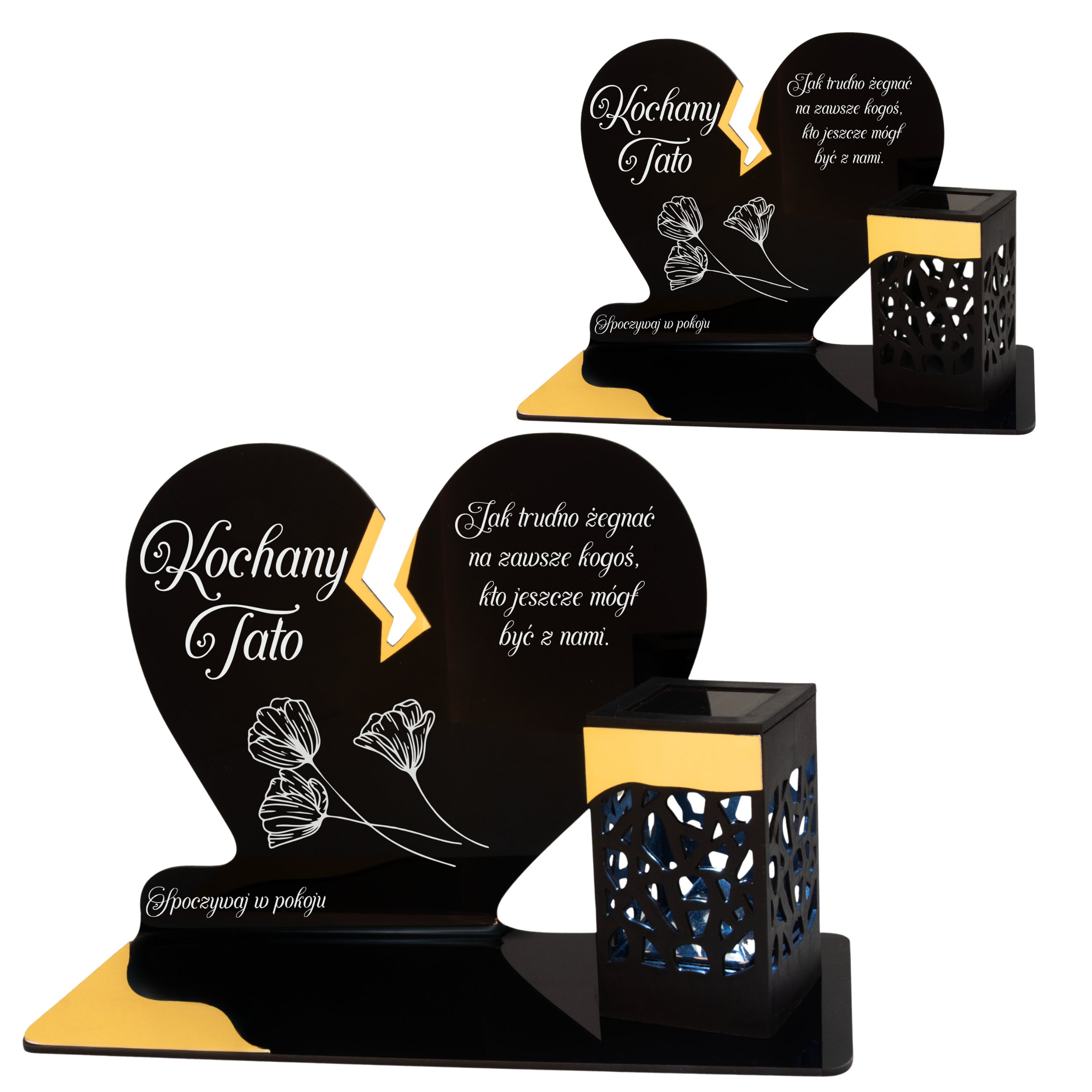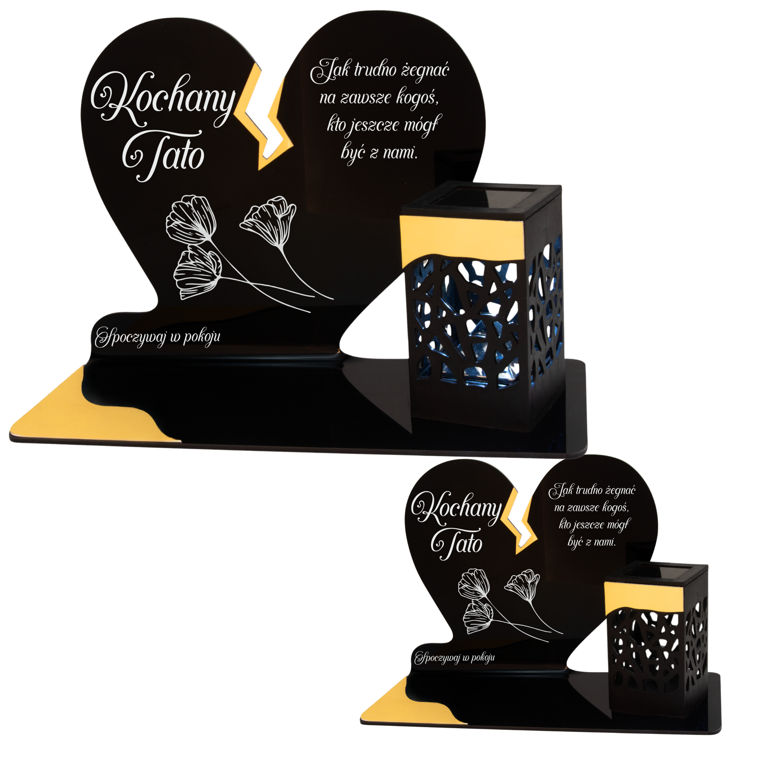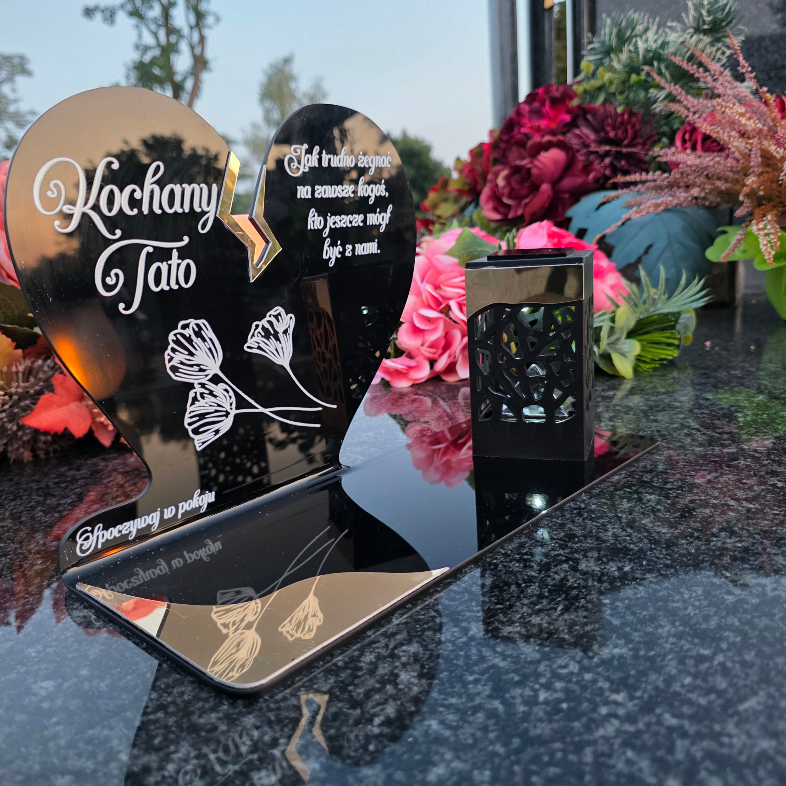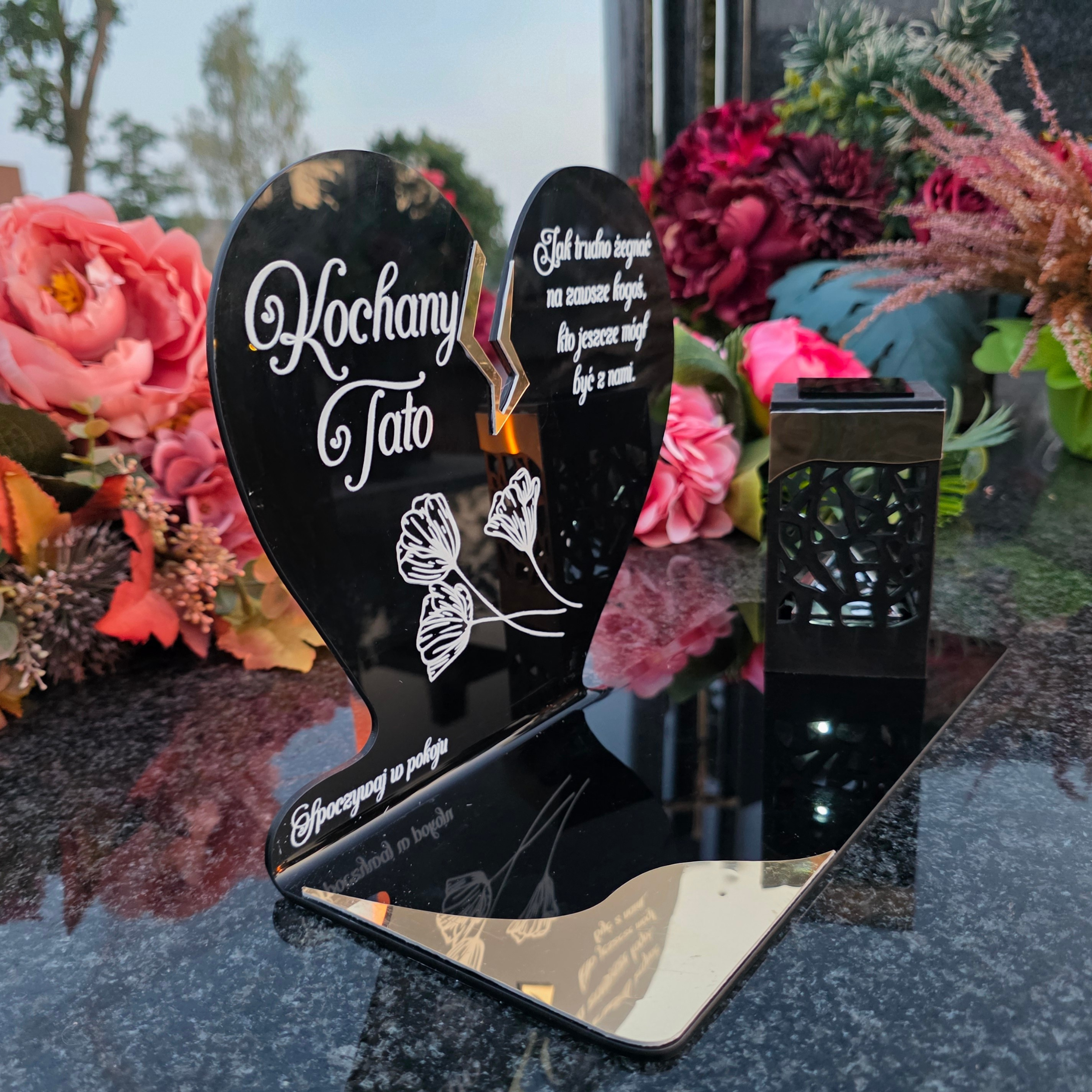 Elegancki znicz nagrobny dla Taty– serce ze złotymi akcentami i solarną lampką LED