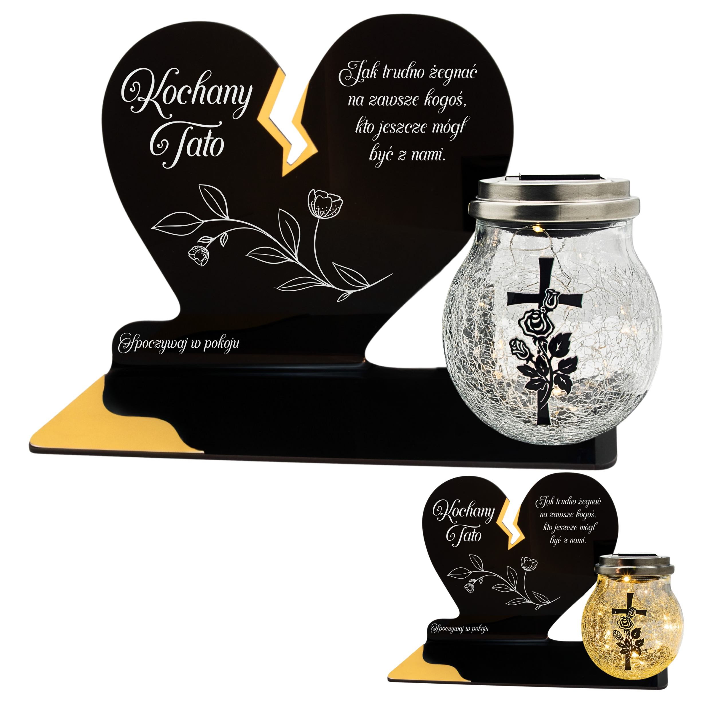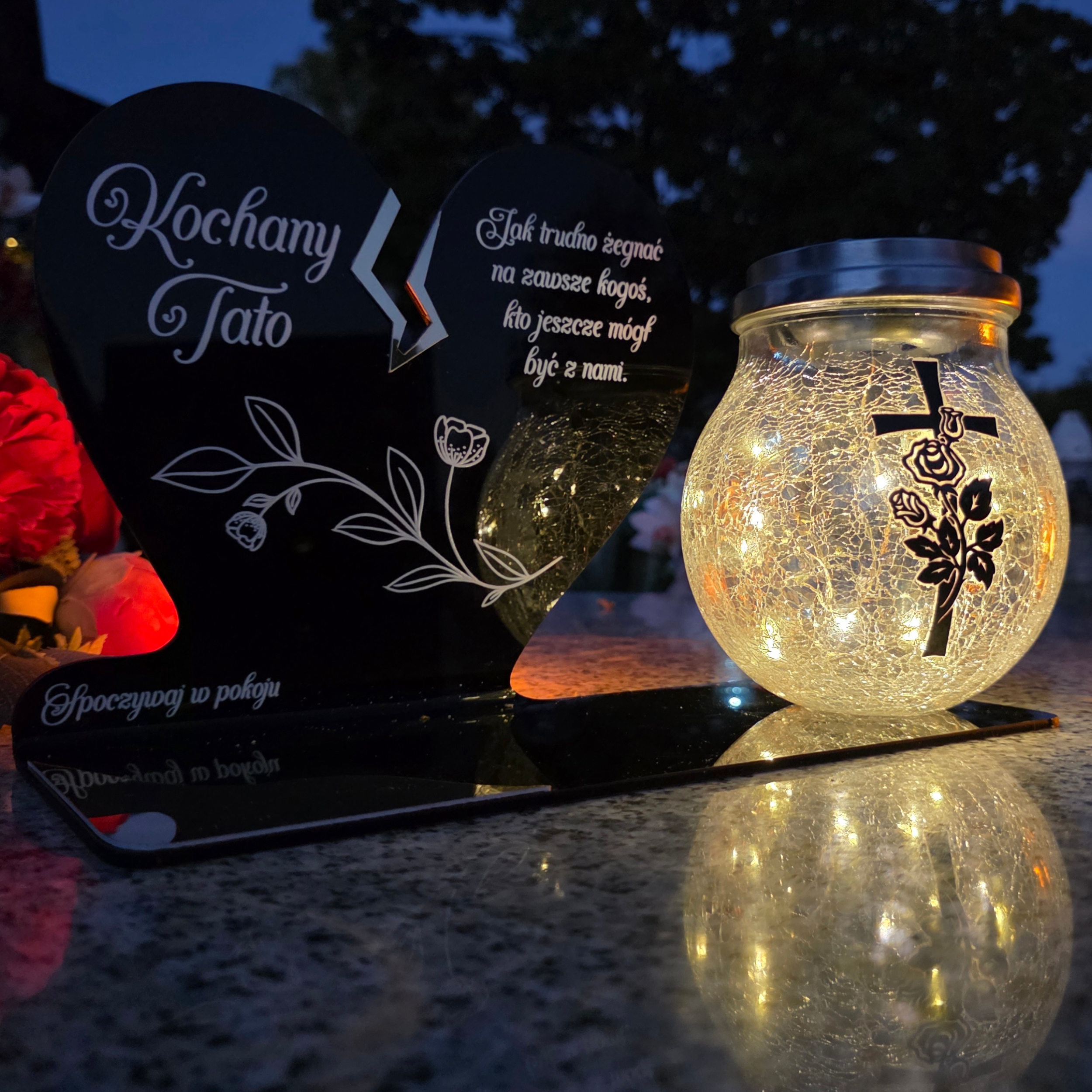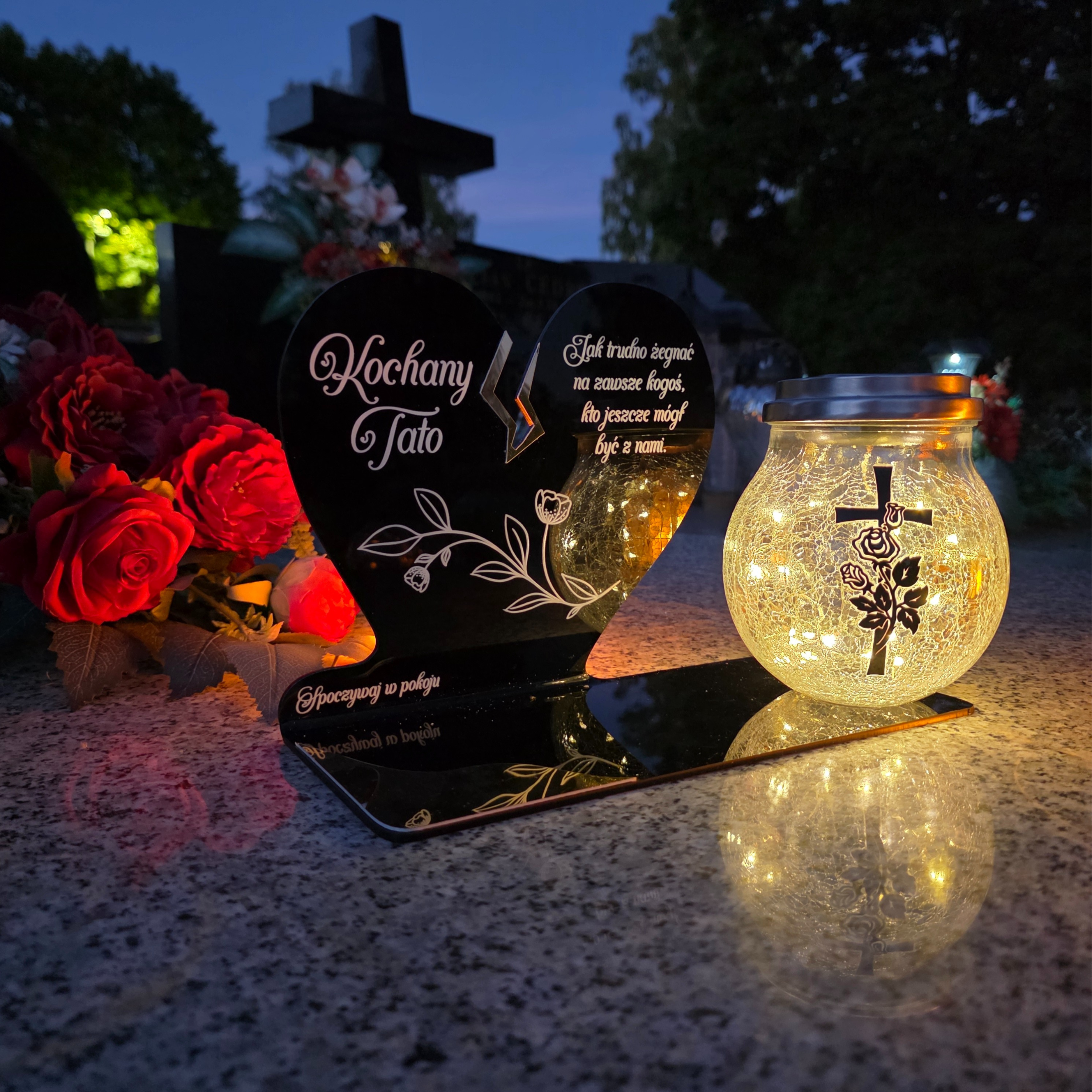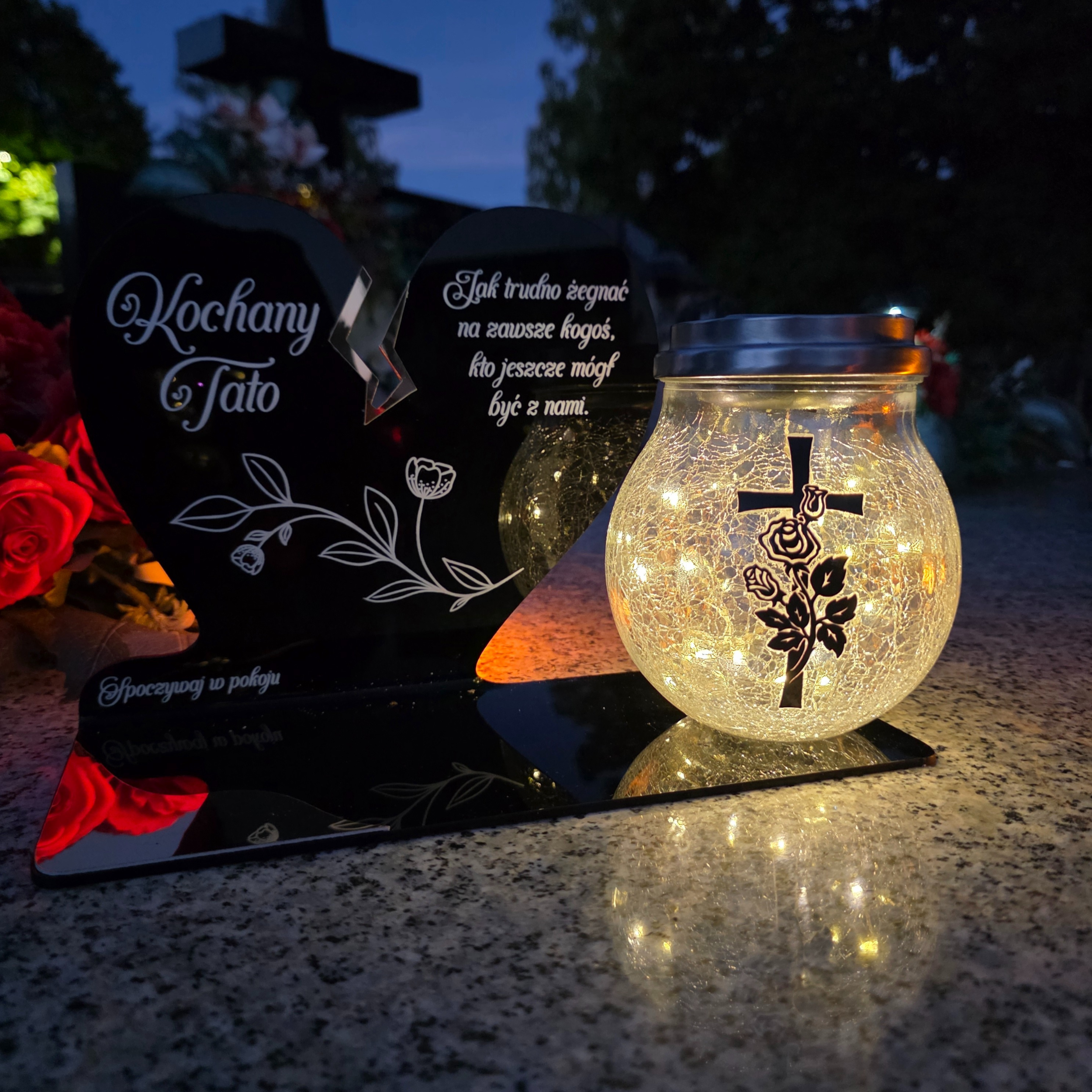 To wyjątkowa pamiątka, która łączy klasyczny wygląd z nowoczesnym rozwiązaniem. Serce ze złotym akcentem i dużą szklaną lampką crackle tworzy kompozycję, która nie tylko pięknie zdobi nagrobek, ale także zapewnia światło pamięci przez cały rok – bez potrzeby wymiany wkładów.