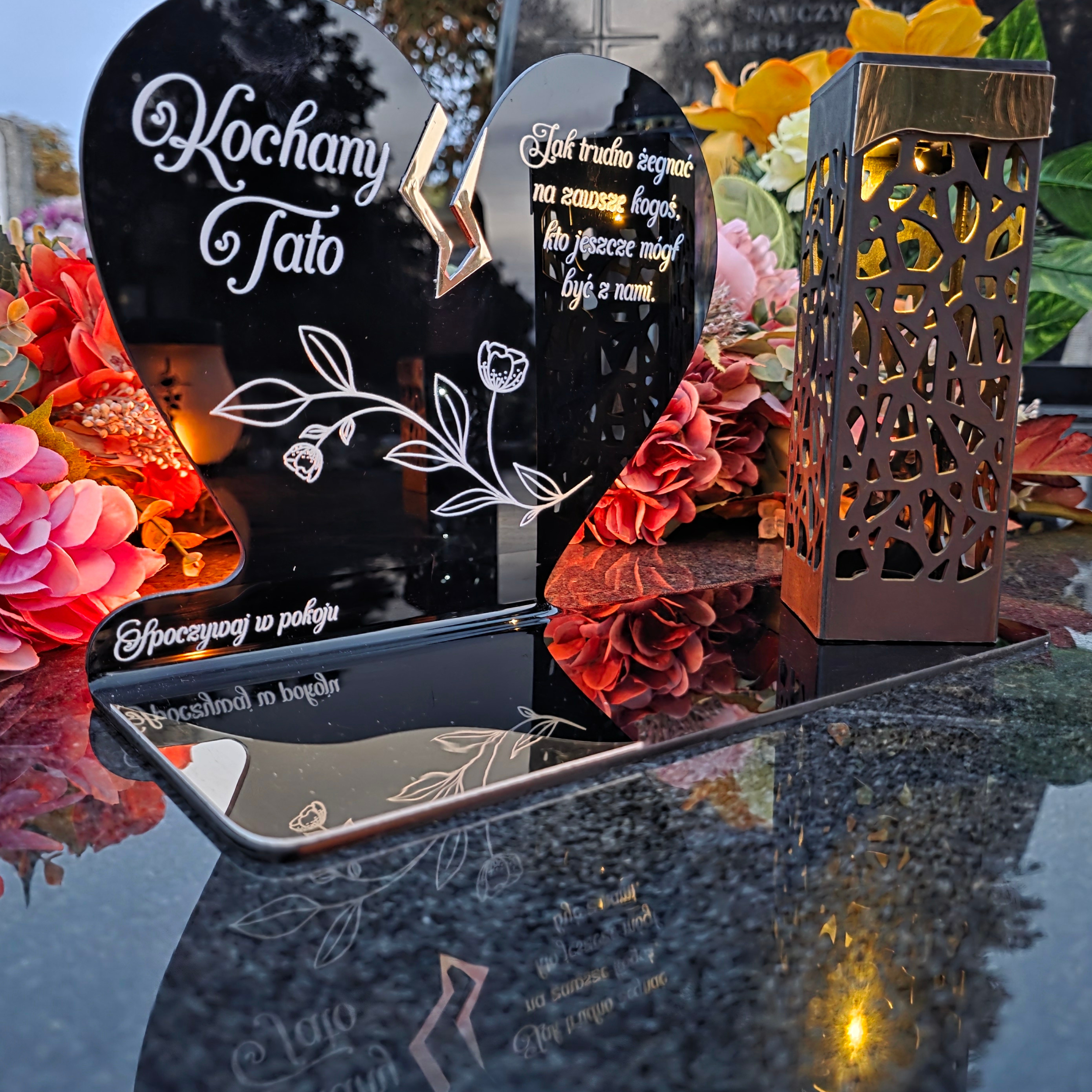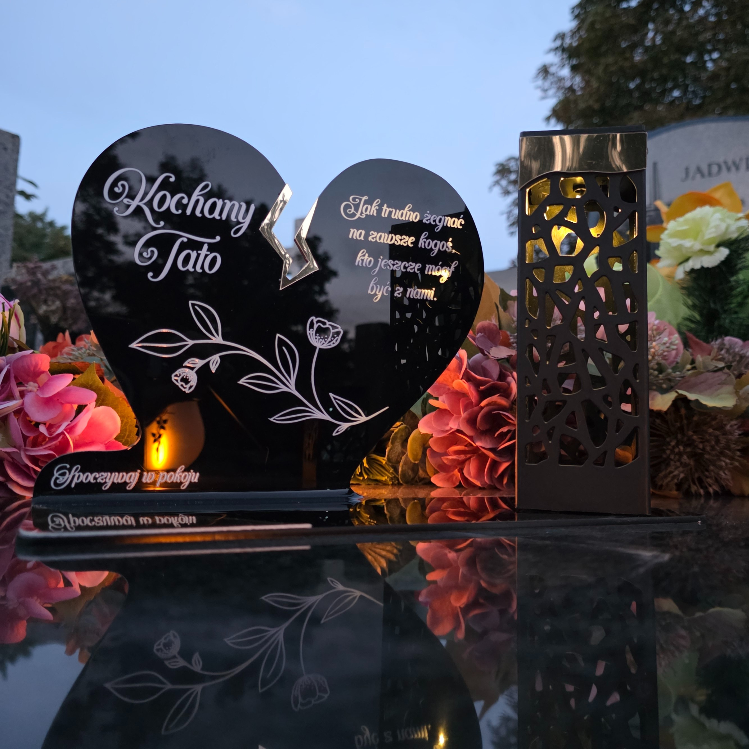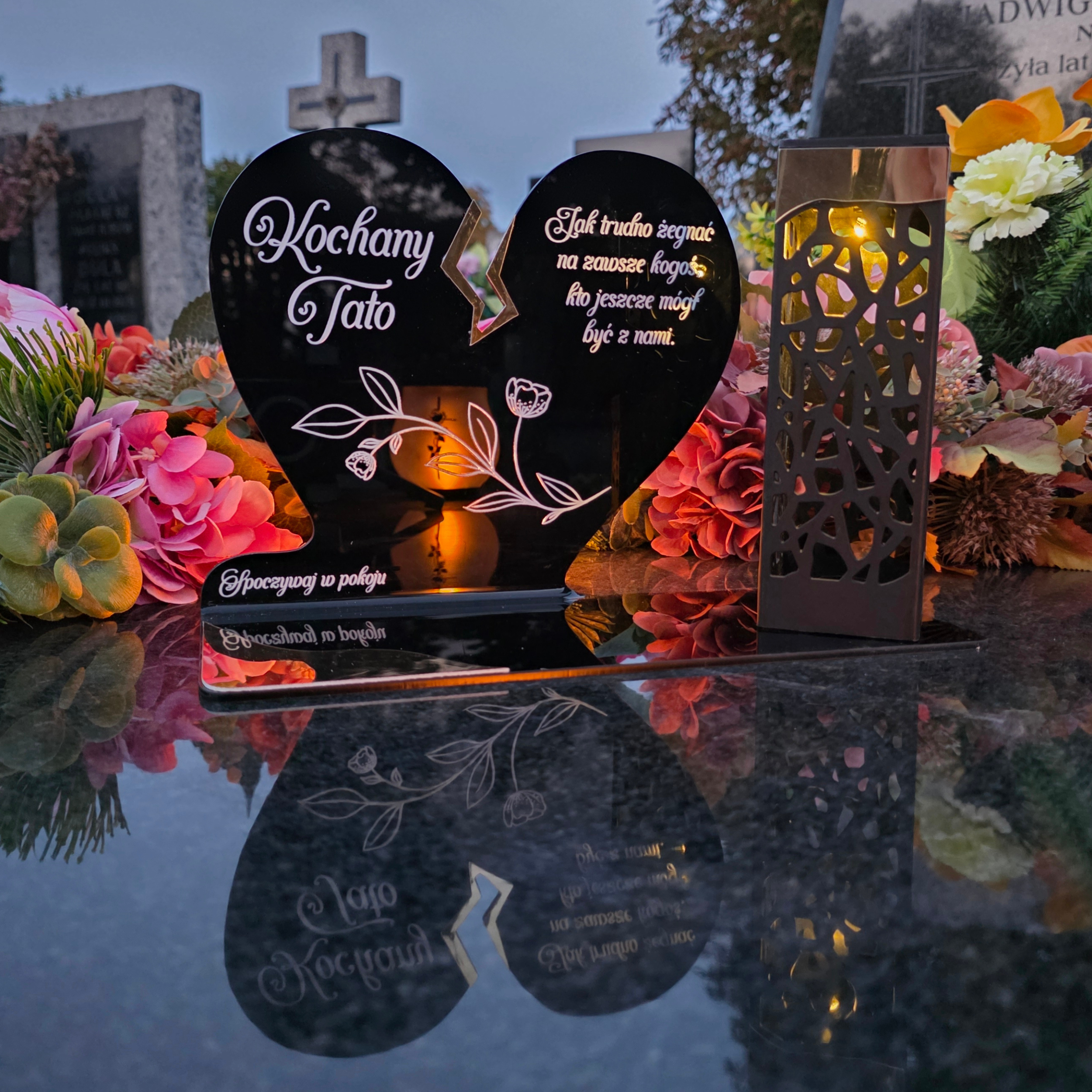 To niezwykła pamiątka łącząca tradycję z nowoczesnością. Zestawienie serca ze złotym akcentem i wysokiej lampki solarnej daje efekt elegancji oraz trwałego blasku pamięci, który rozświetla nagrobek przez cały rok – bez konieczności wymiany wkładów.