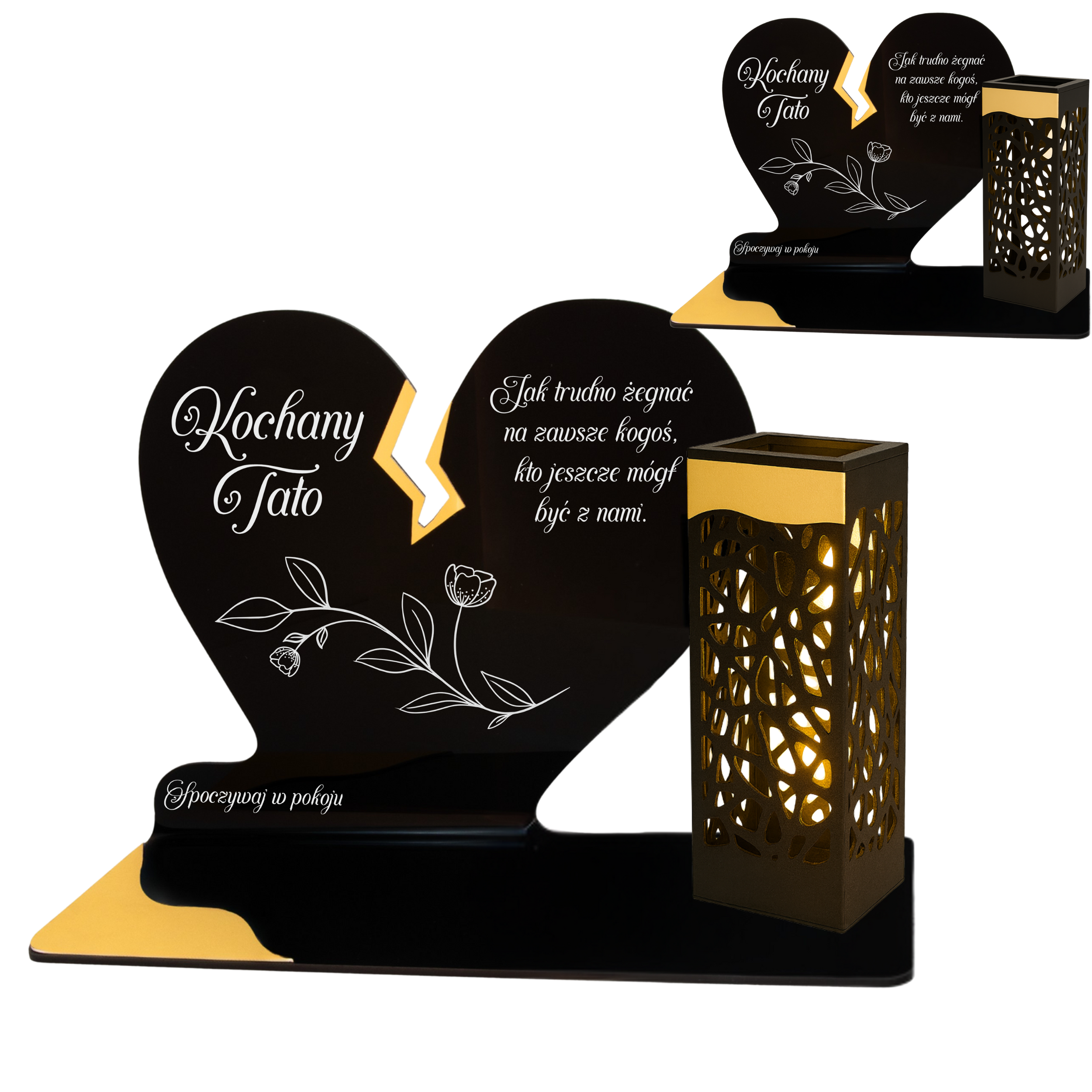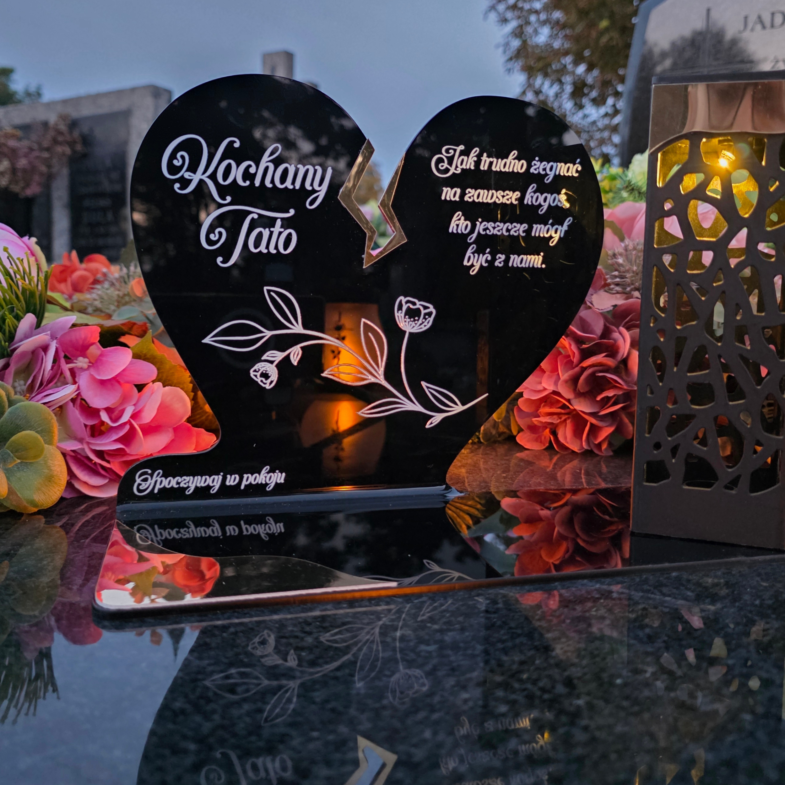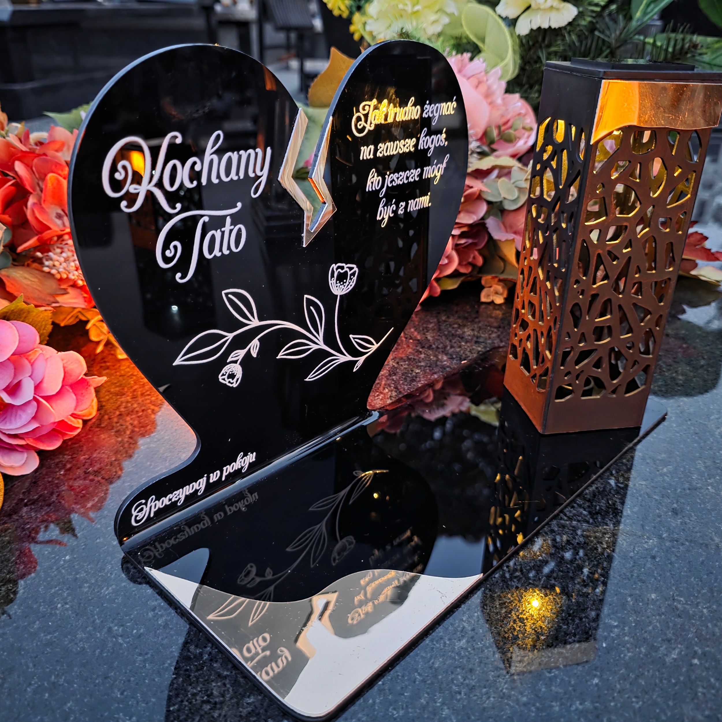 To niezwykła pamiątka łącząca tradycję z nowoczesnością. Zestawienie serca ze złotym akcentem i wysokiej lampki solarnej daje efekt elegancji oraz trwałego blasku pamięci, który rozświetla nagrobek przez cały rok – bez konieczności wymiany wkładów.