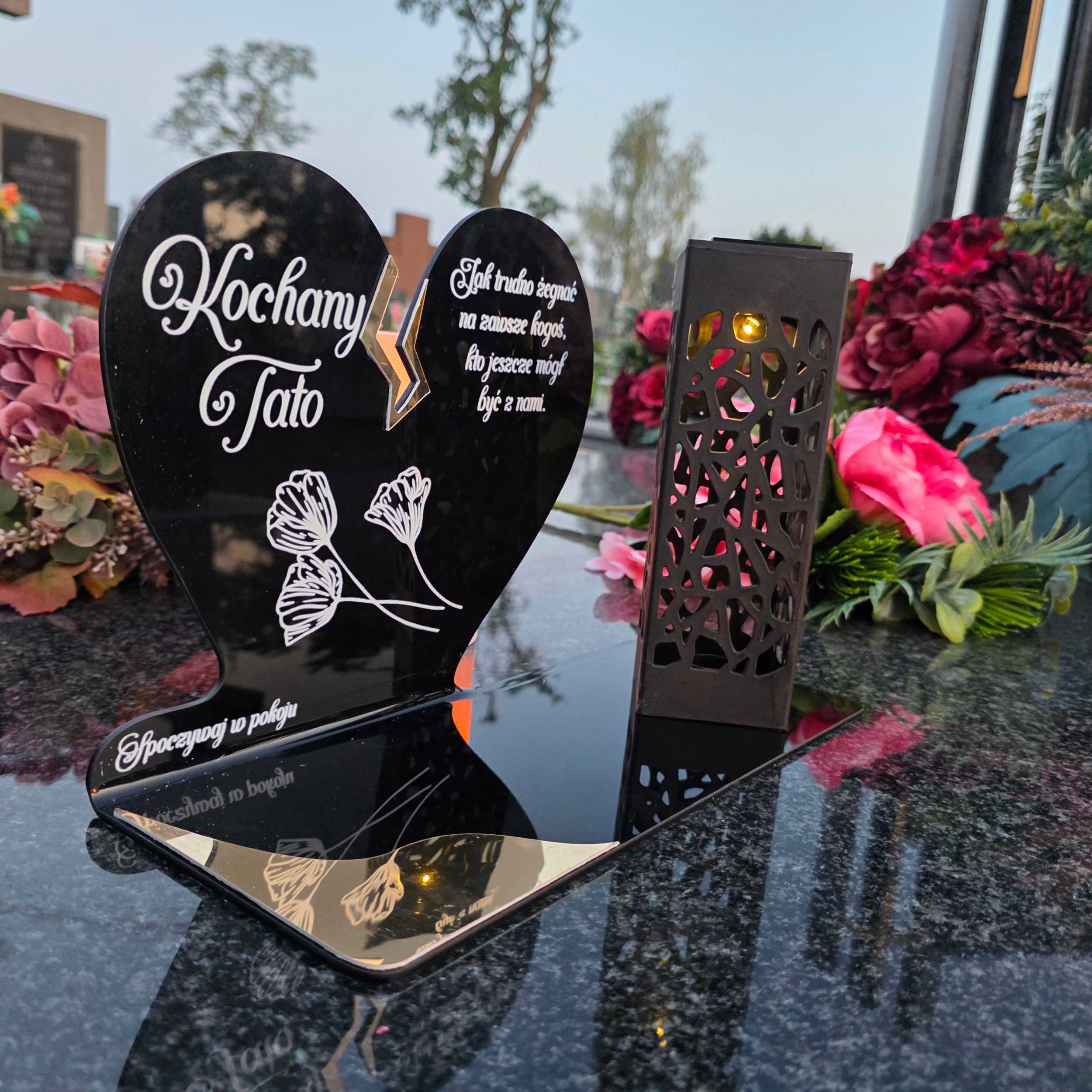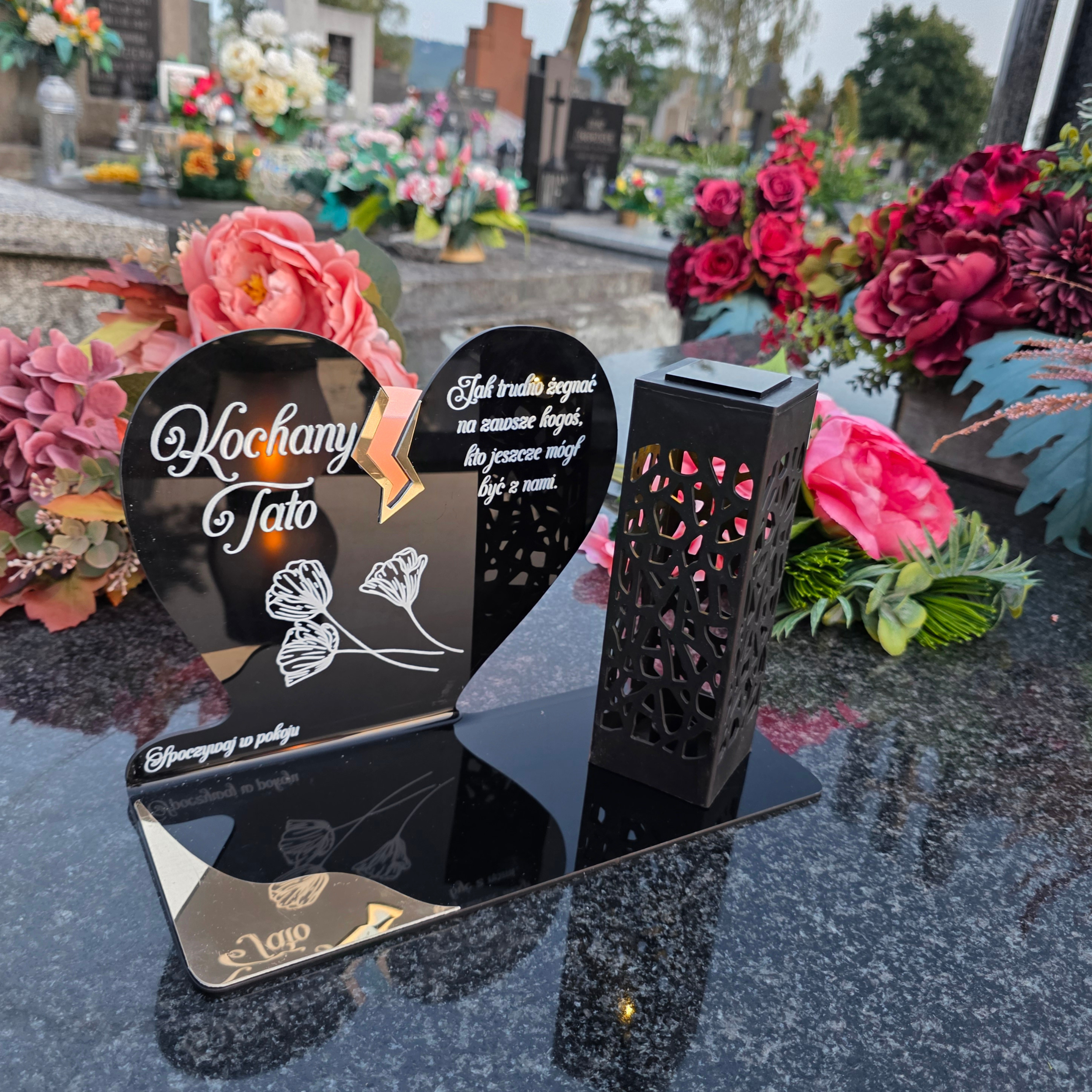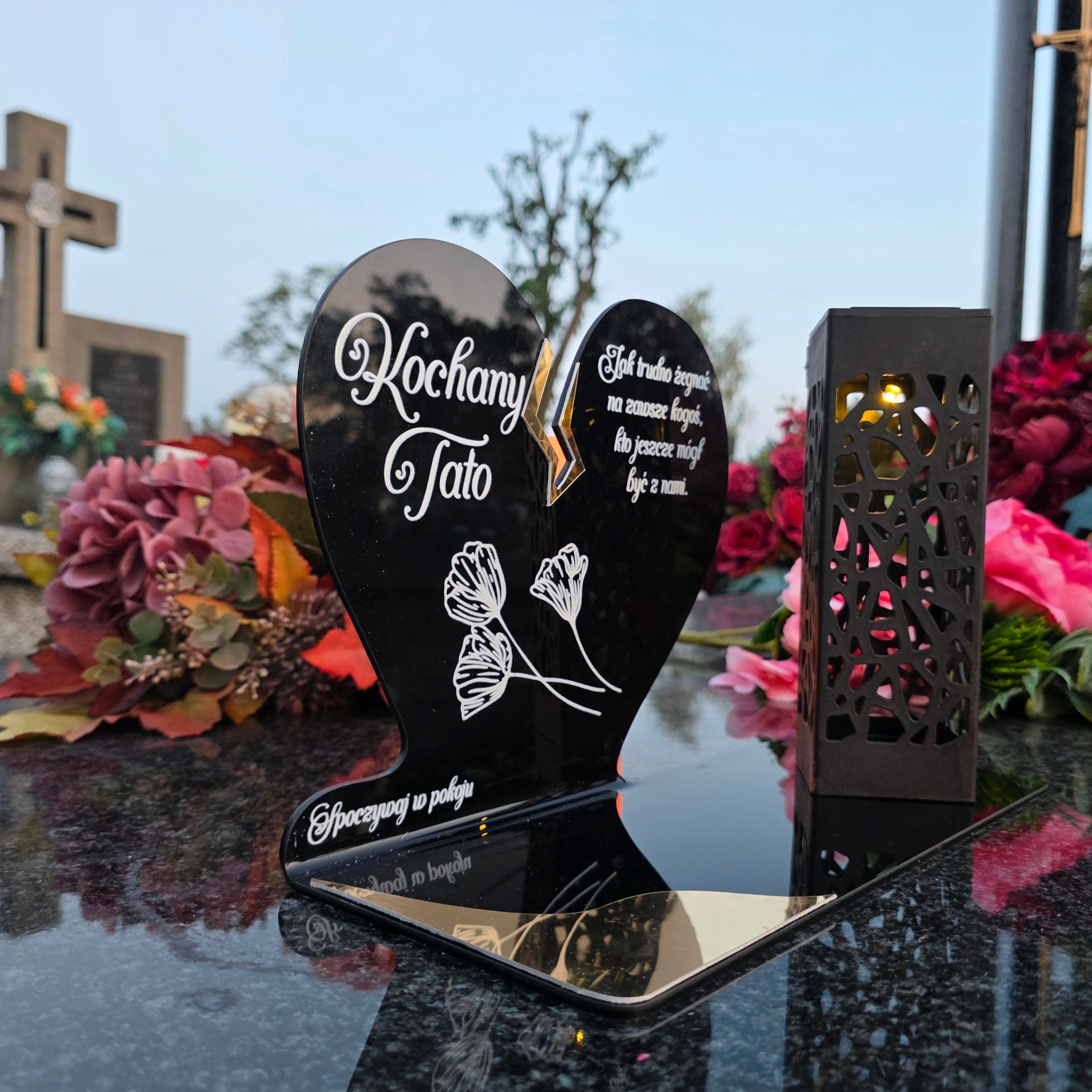 To niezwykła pamiątka łącząca tradycję z nowoczesnością. Zestawienie serca ze złotym akcentem i wysokiej lampki solarnej daje efekt elegancji oraz trwałego blasku pamięci, który rozświetla nagrobek przez cały rok – bez konieczności wymiany wkładów.
