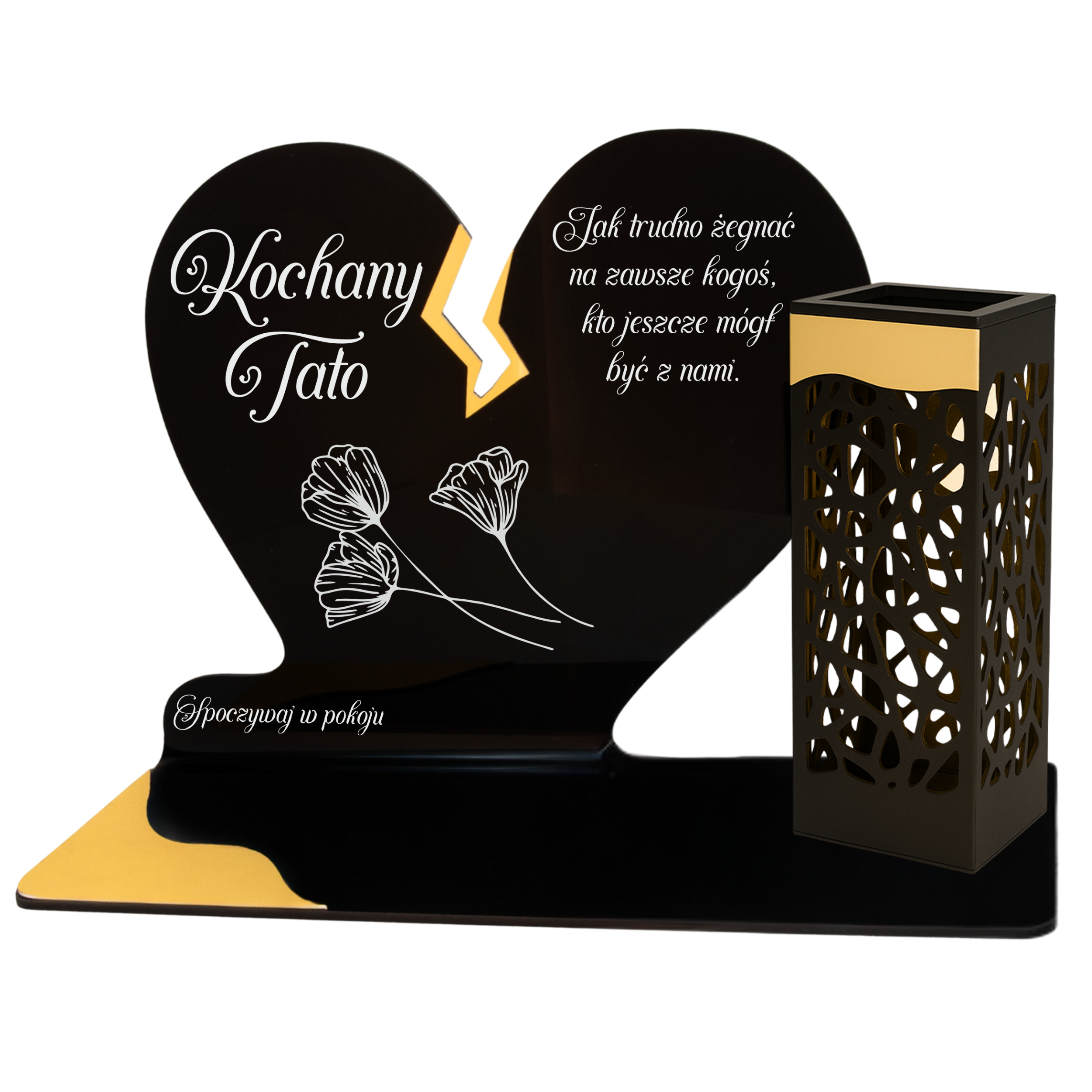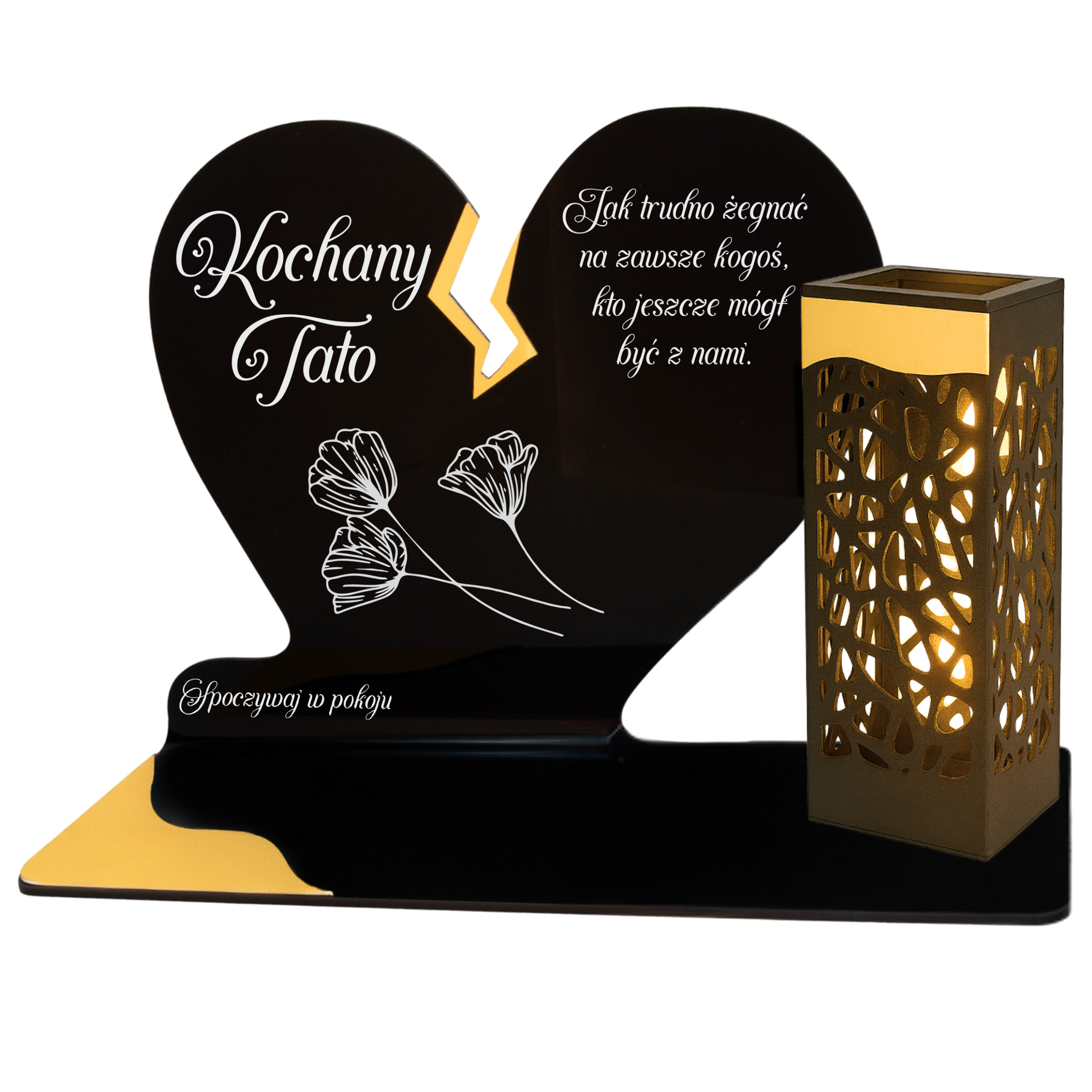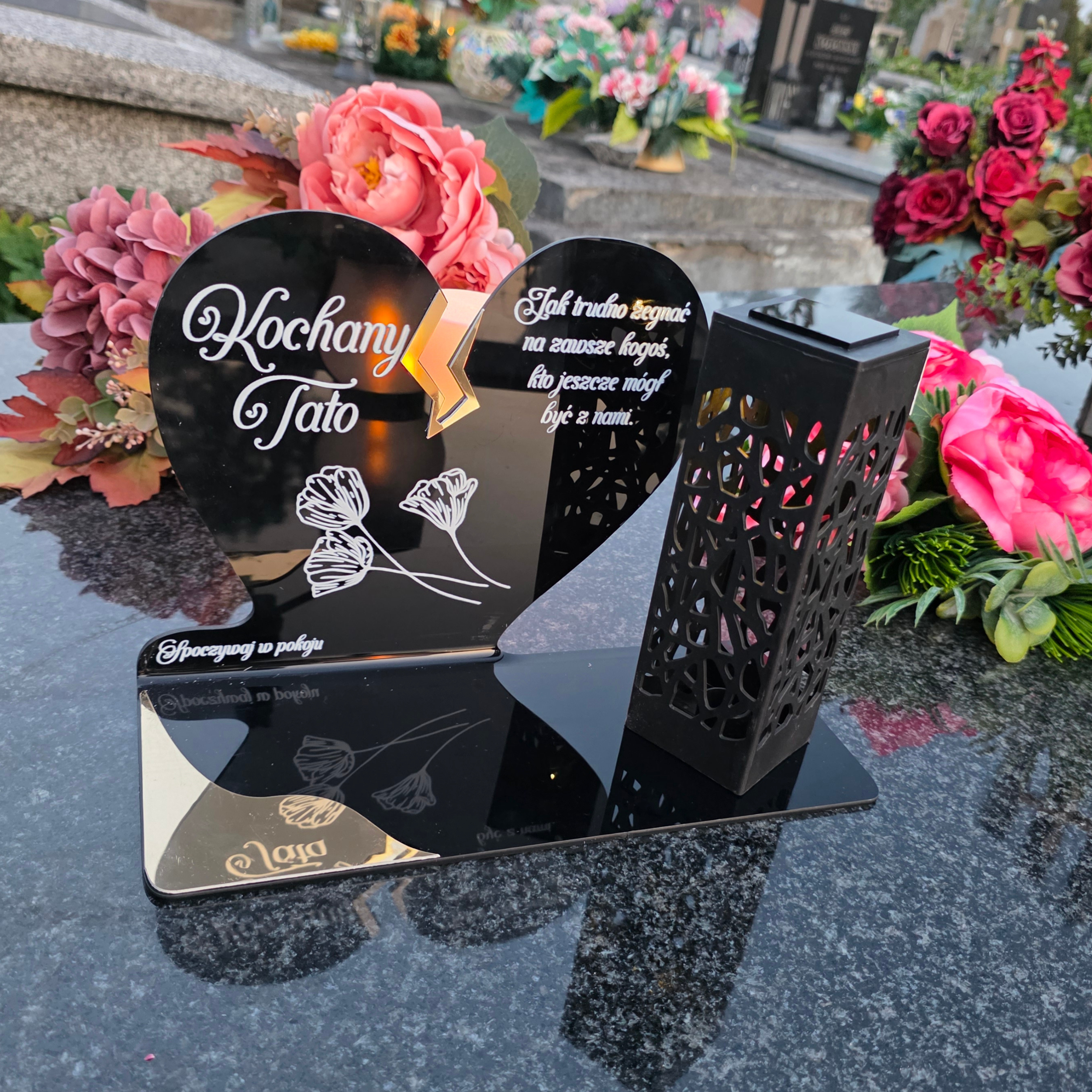 To niezwykła pamiątka łącząca tradycję z nowoczesnością. Zestawienie serca ze złotym akcentem i wysokiej lampki solarnej daje efekt elegancji oraz trwałego blasku pamięci, który rozświetla nagrobek przez cały rok – bez konieczności wymiany wkładów.
