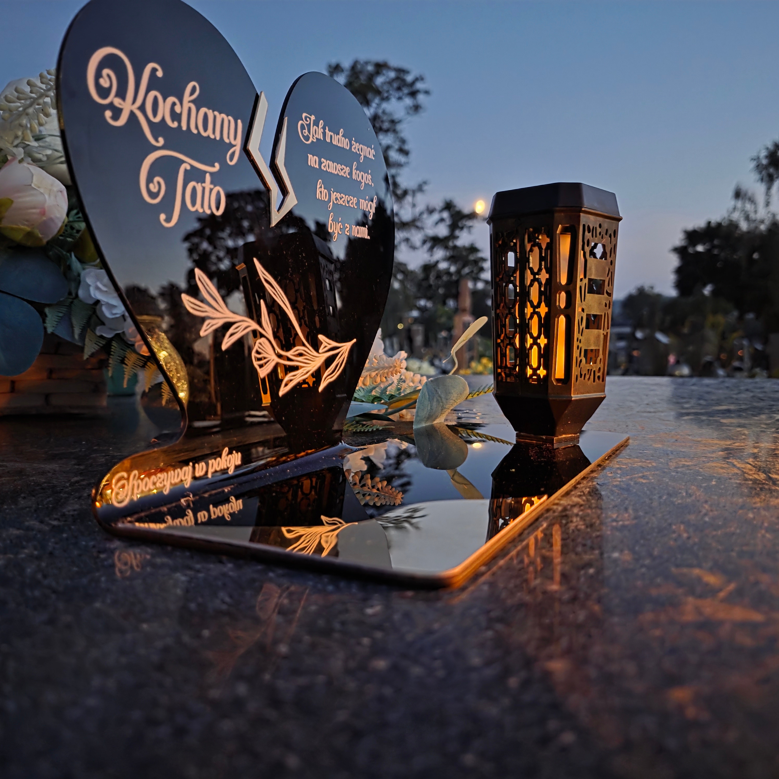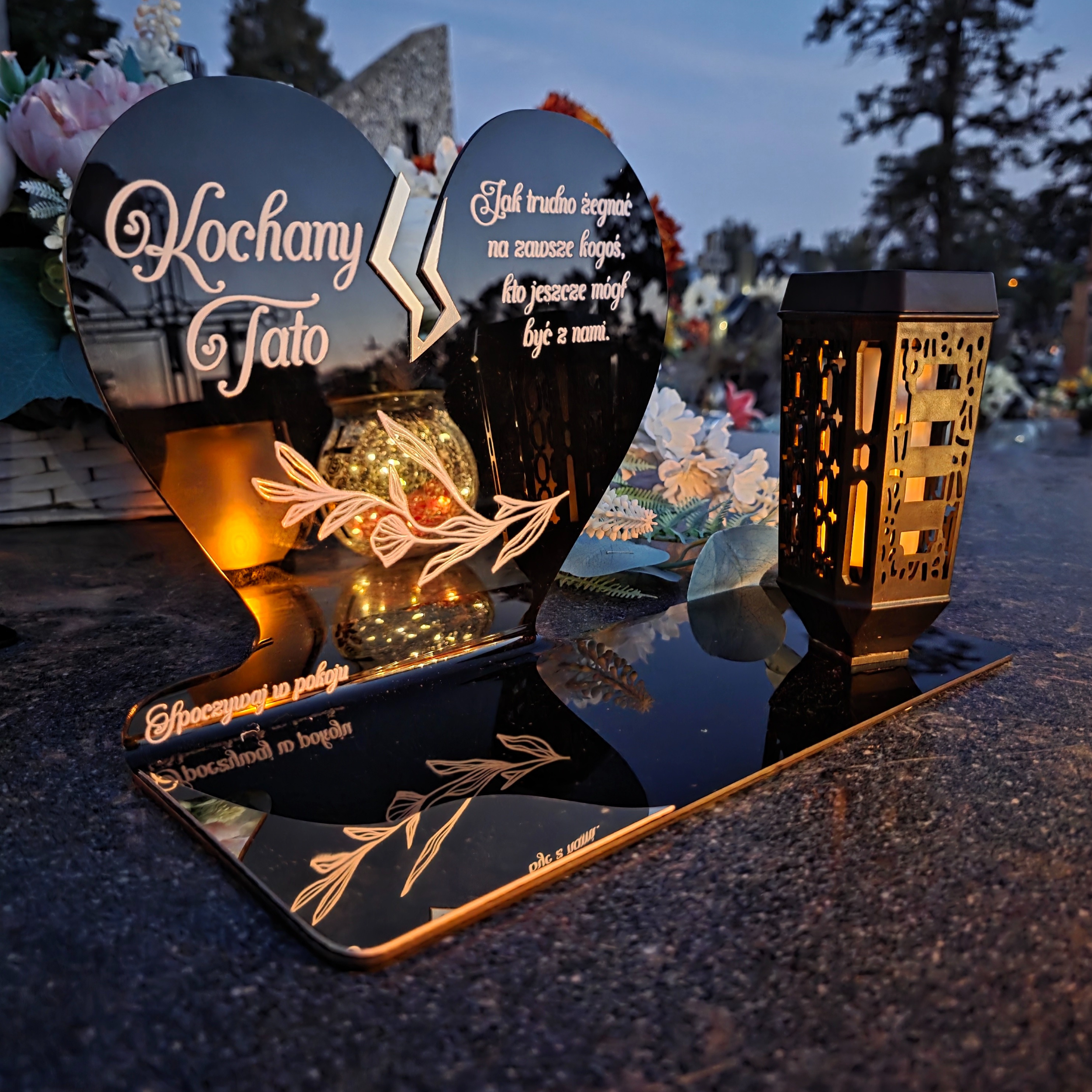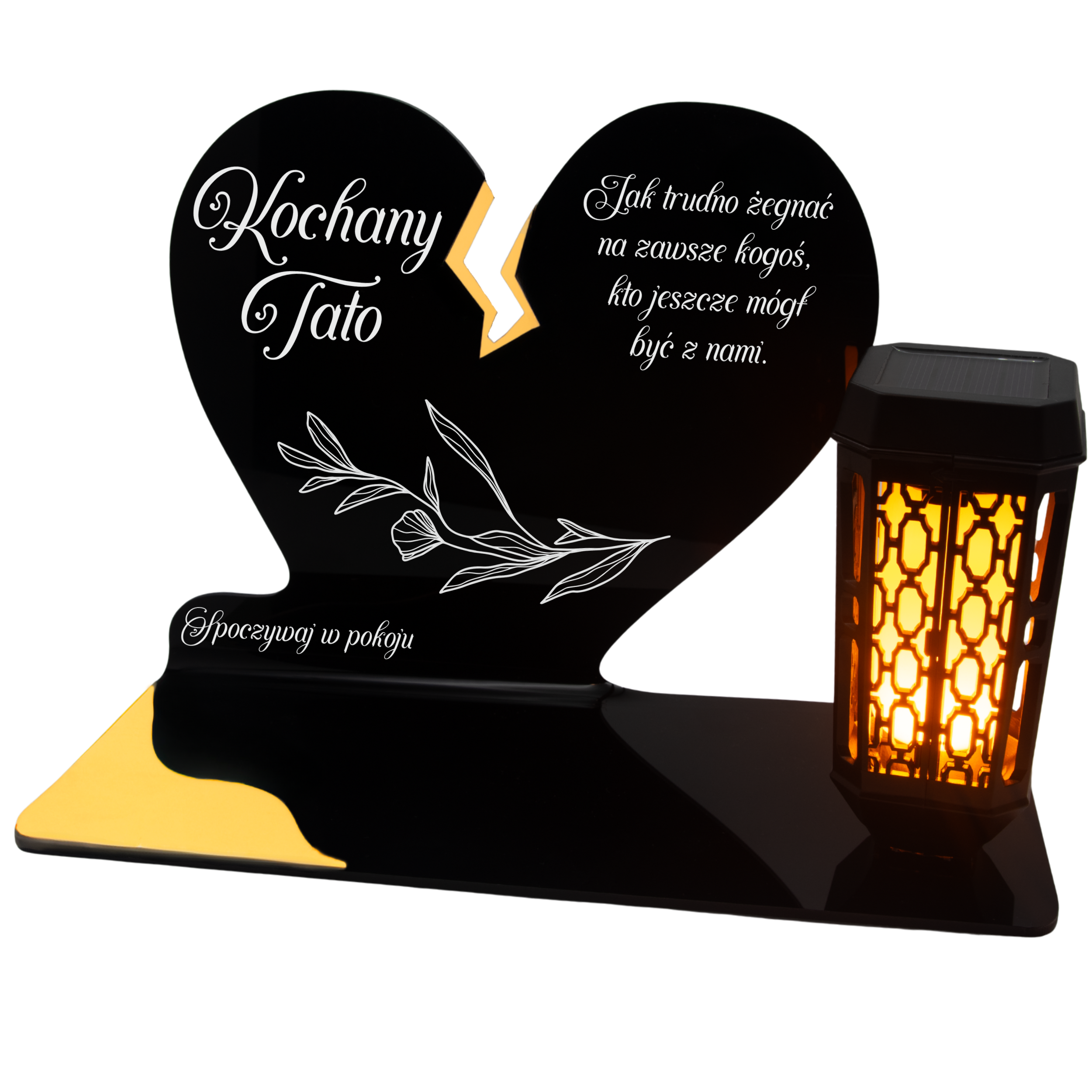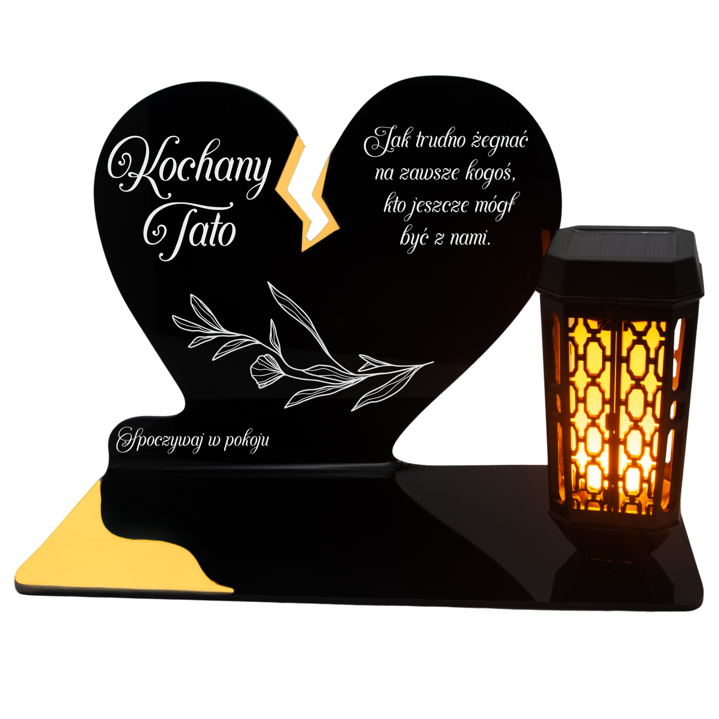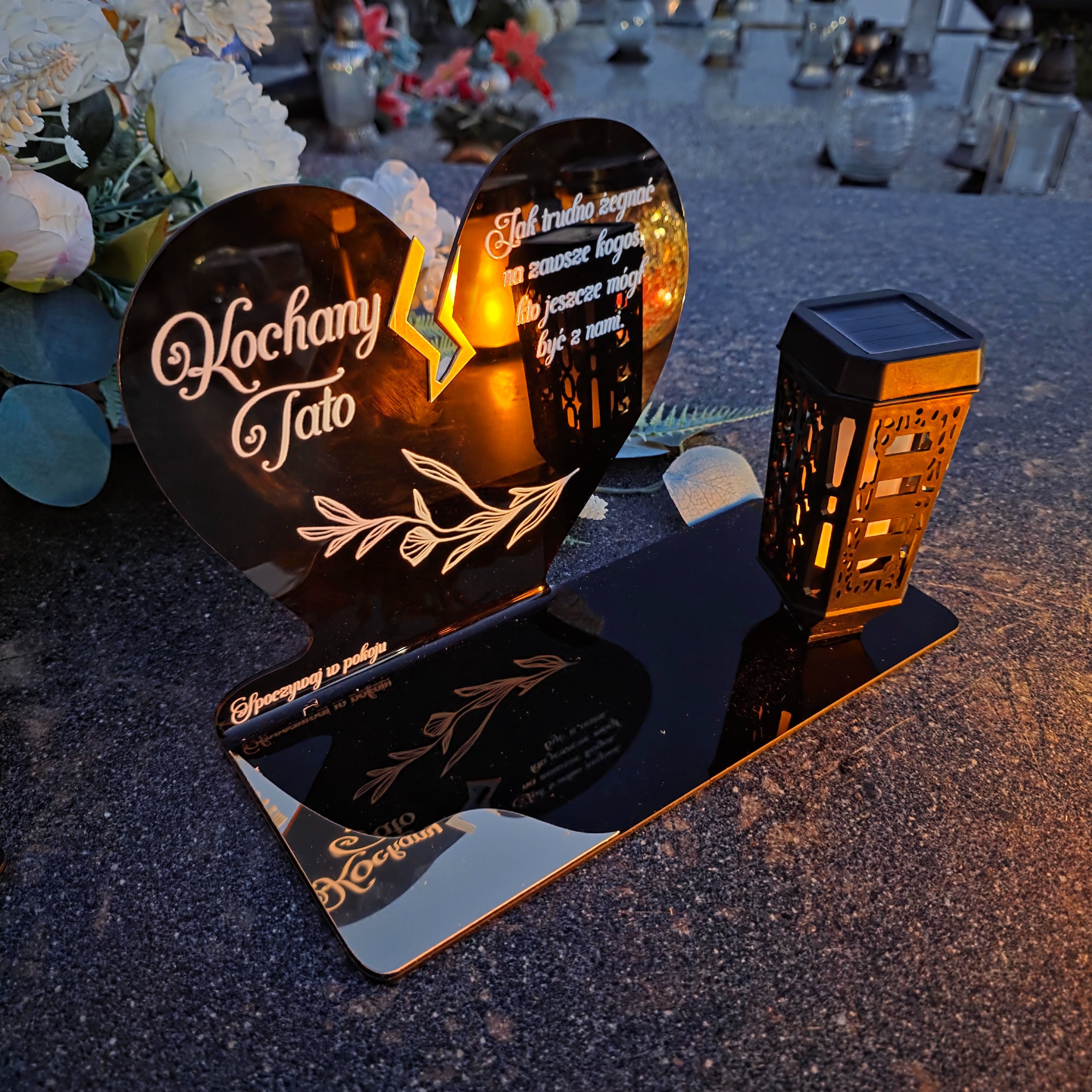 Ten wyjątkowy znicz nagrobny w formie czarnego serca z delikatnym złotym pęknięciem to piękny symbol miłości i pamięci, która nigdy nie gaśnie. Dedykacja „Kochany Tato” oraz subtelny ornament sprawiają, że całość nabiera wzruszającego i eleganckiego charakteru. Zestaw dopełnia nowoczesna lampka solarna LED, która po zmroku rozświetla pomnik ciepłym blaskiem, tworząc atmosferę zadumy i spokoju.