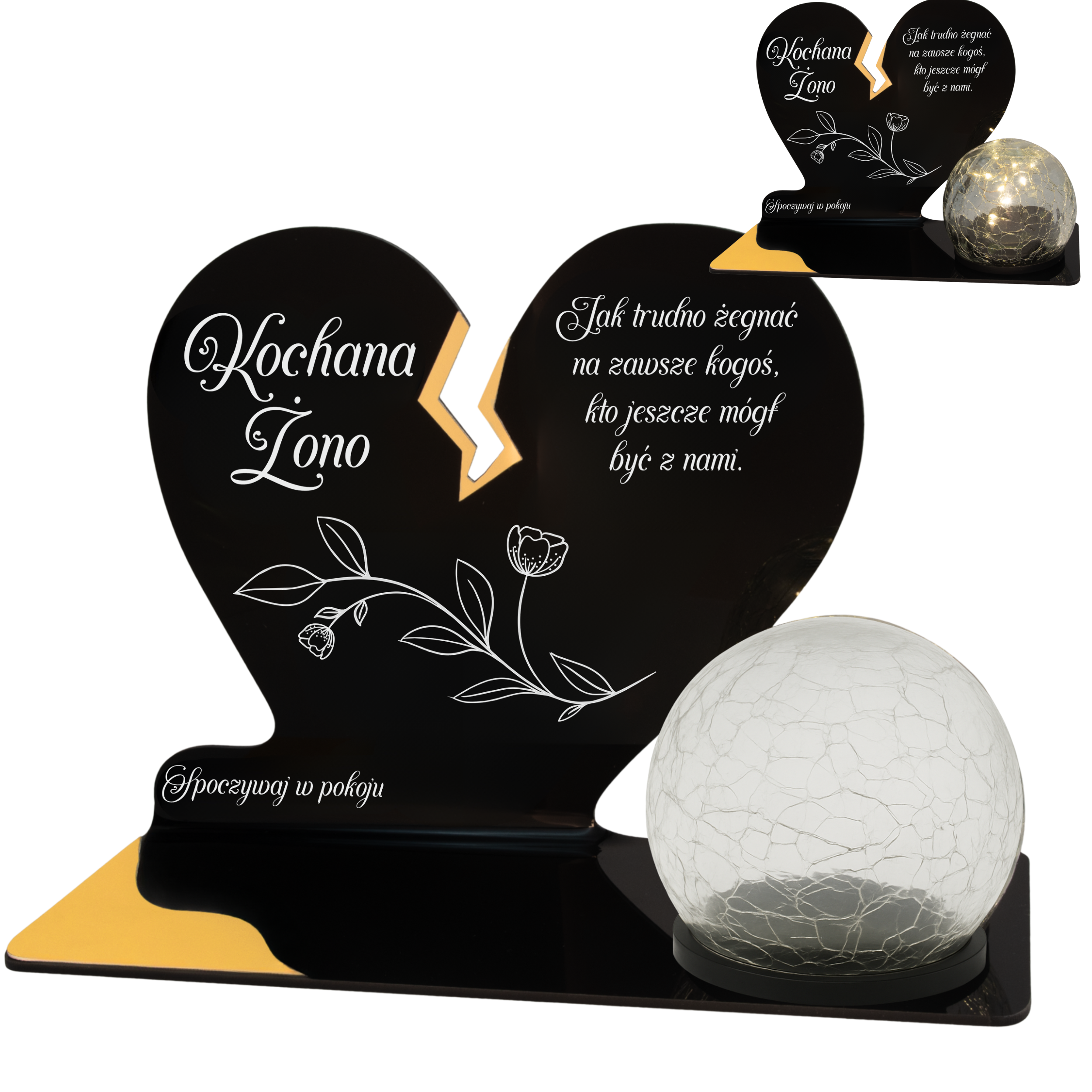 Elegancki znicz nagrobny dla Żony– serce ze złotymi akcentami i solarną kulą LED