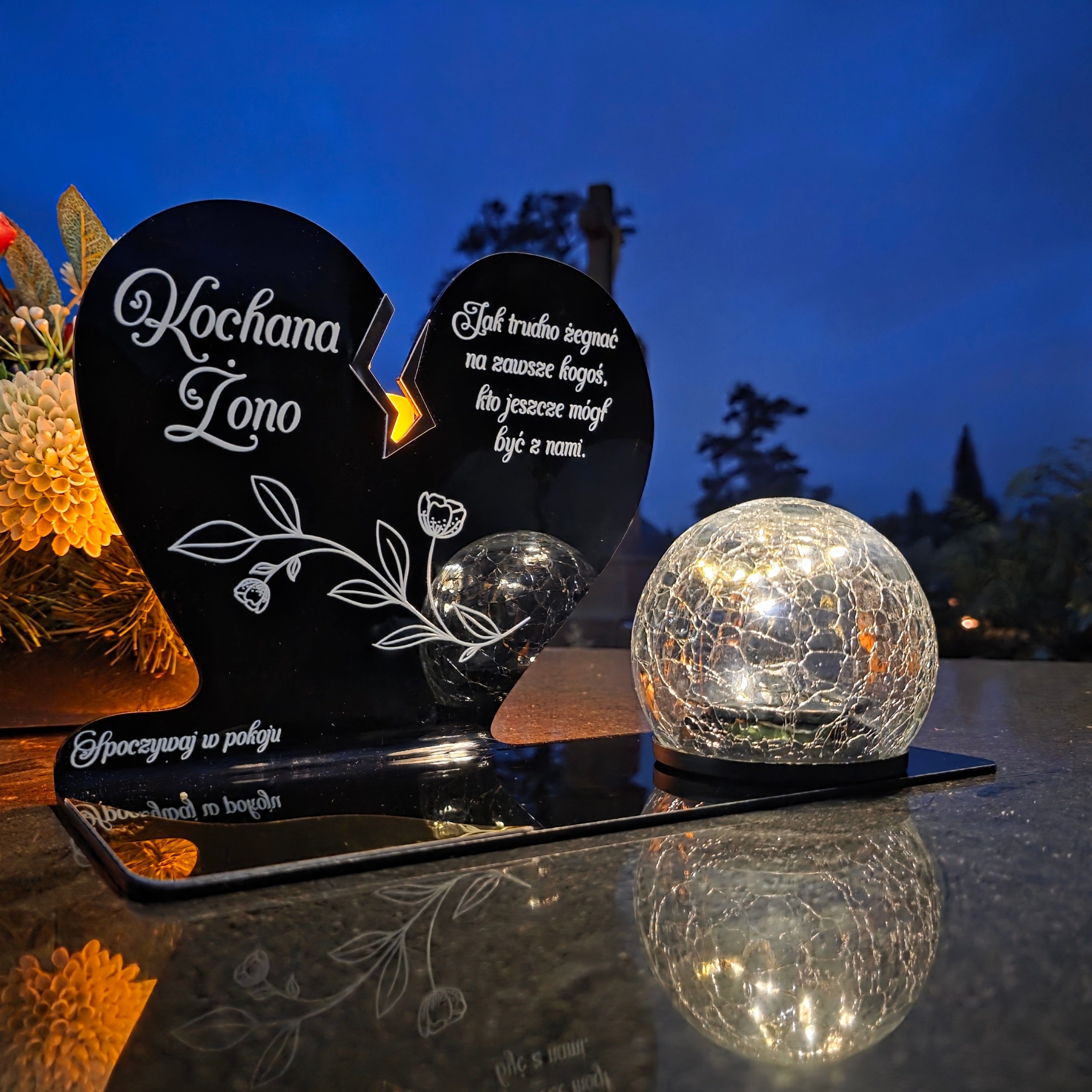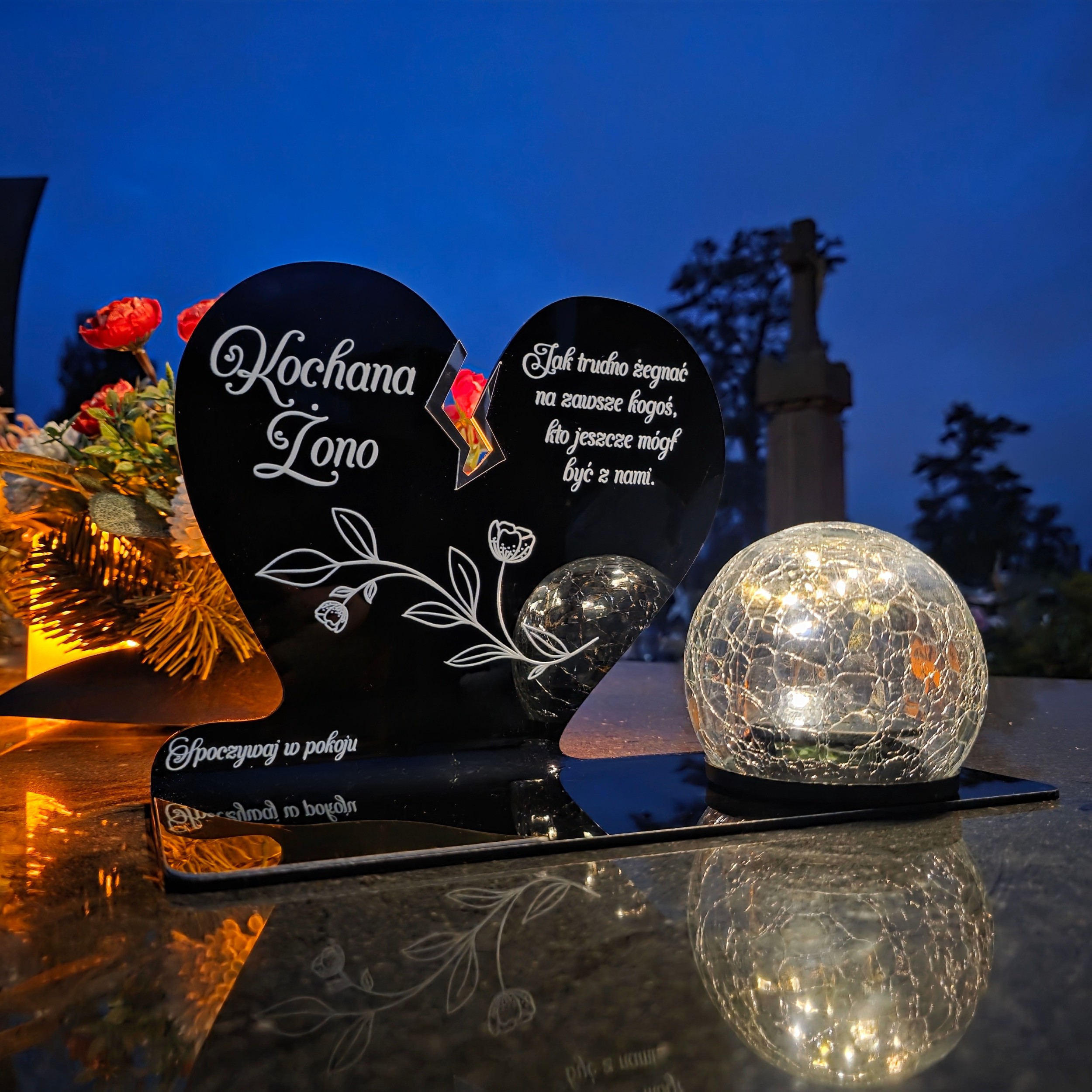 Kompozycję dopełnia solarna kula LED wykonana ze szkła dekoracyjnego typu crackle. Po zmroku rozświetla nagrobek ciepłym światłem, tworząc atmosferę zadumy i spokoju, a dzięki zasilaniu słonecznemu nie wymaga wkładów ani baterii.