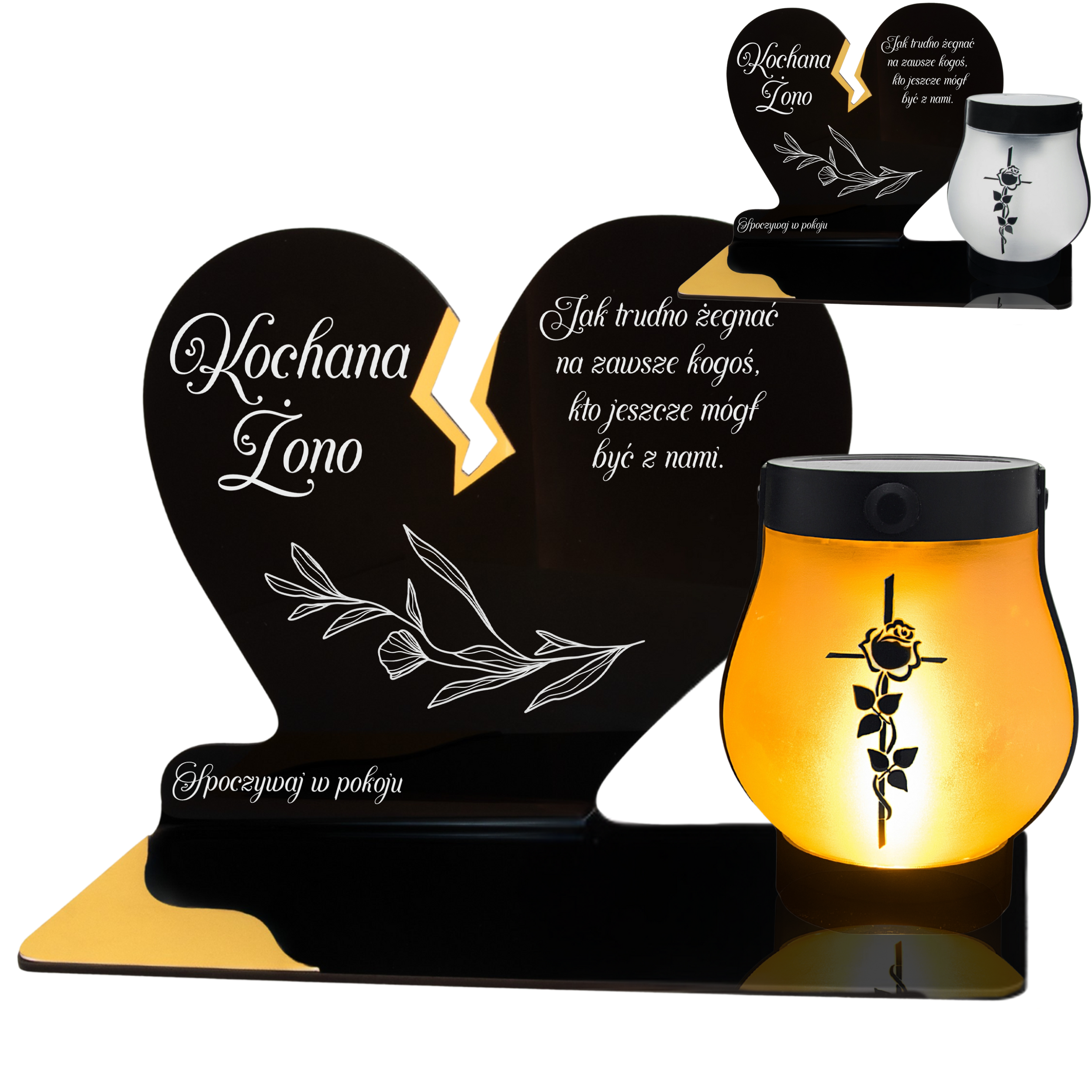 Elegancki znicz nagrobny dla Żony– serce ze złotymi akcentami i solarną lampką LED