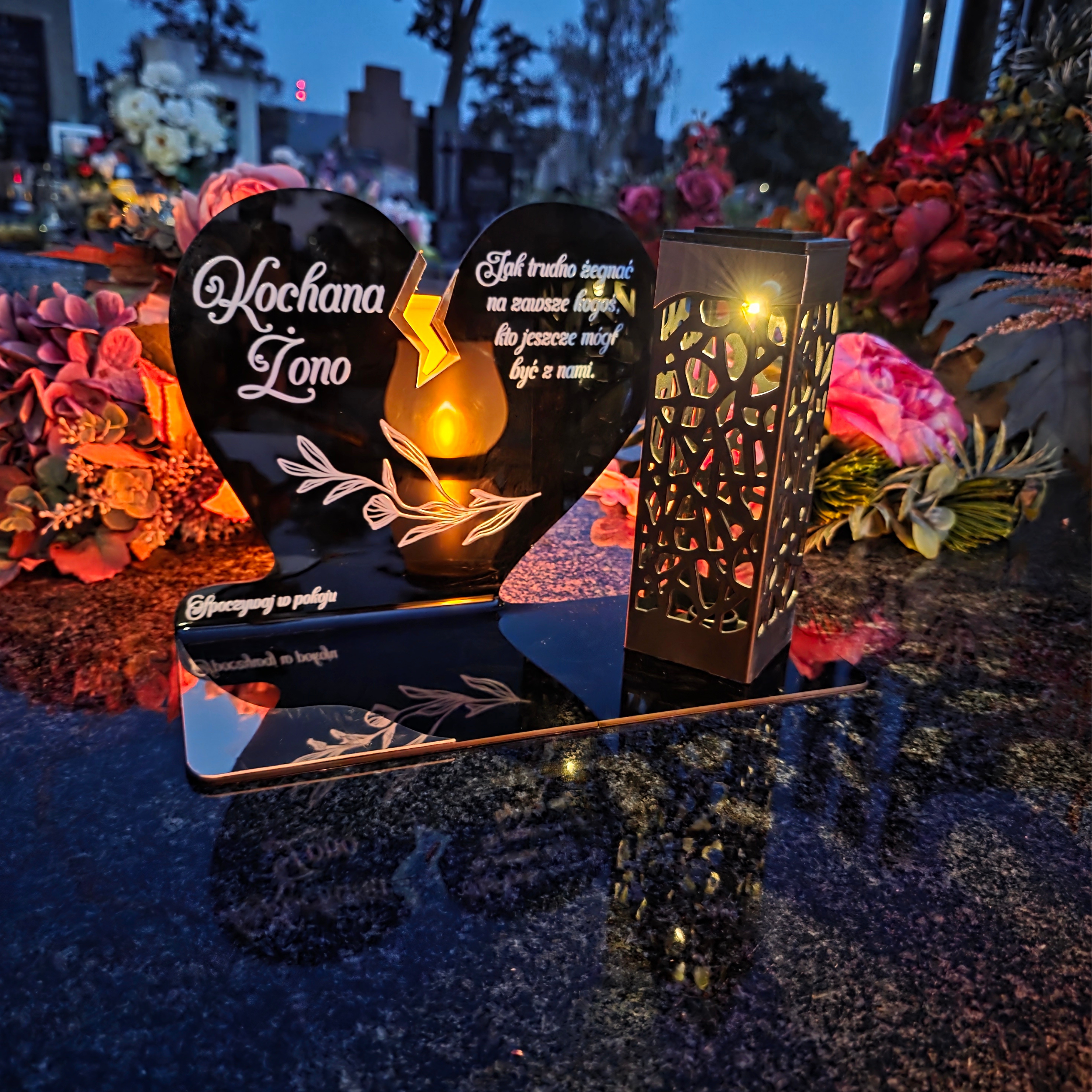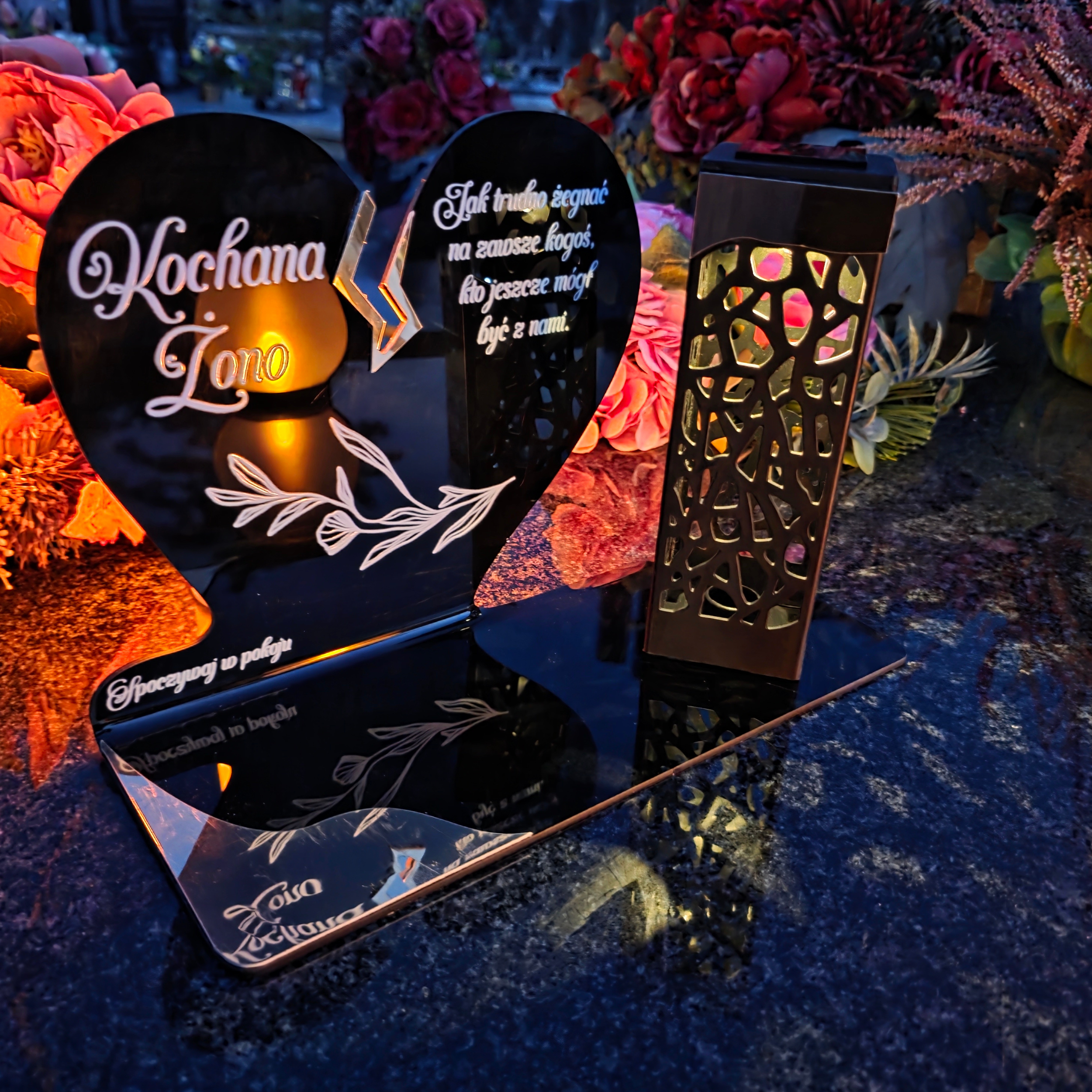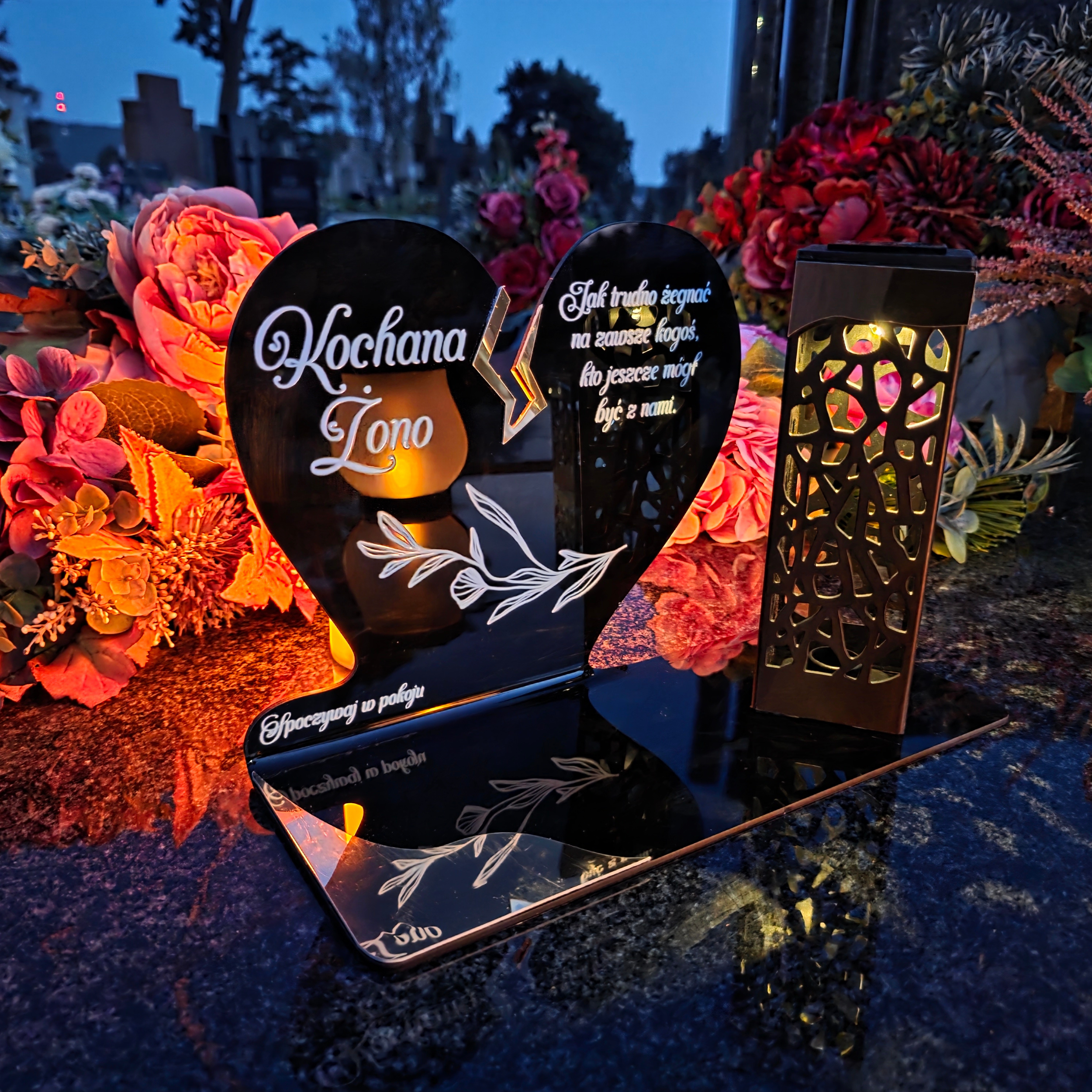 To niezwykła pamiątka łącząca tradycję z nowoczesnością. Zestawienie serca ze złotym akcentem i wysokiej lampki solarnej daje efekt elegancji oraz trwałego blasku pamięci, który rozświetla nagrobek przez cały rok – bez konieczności wymiany wkładów.