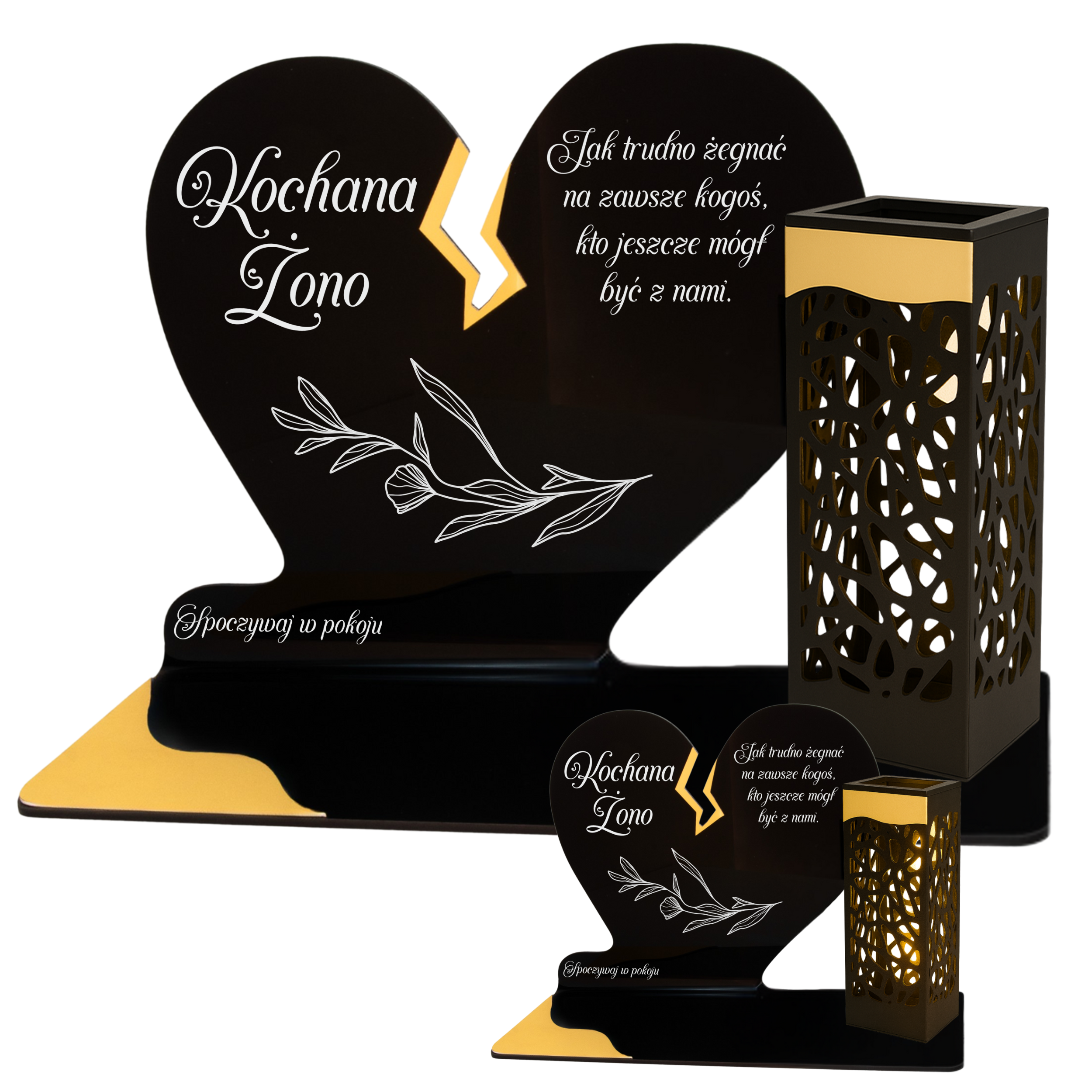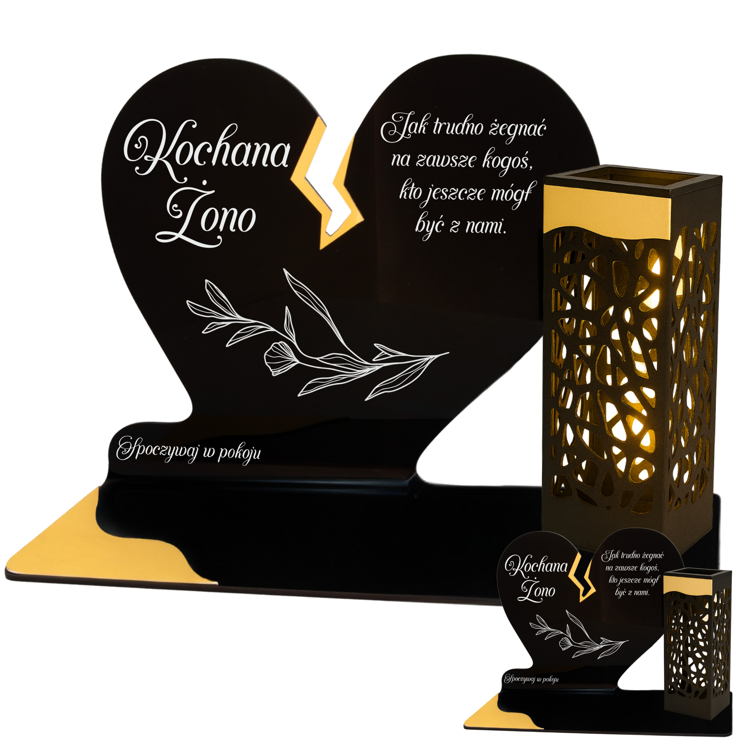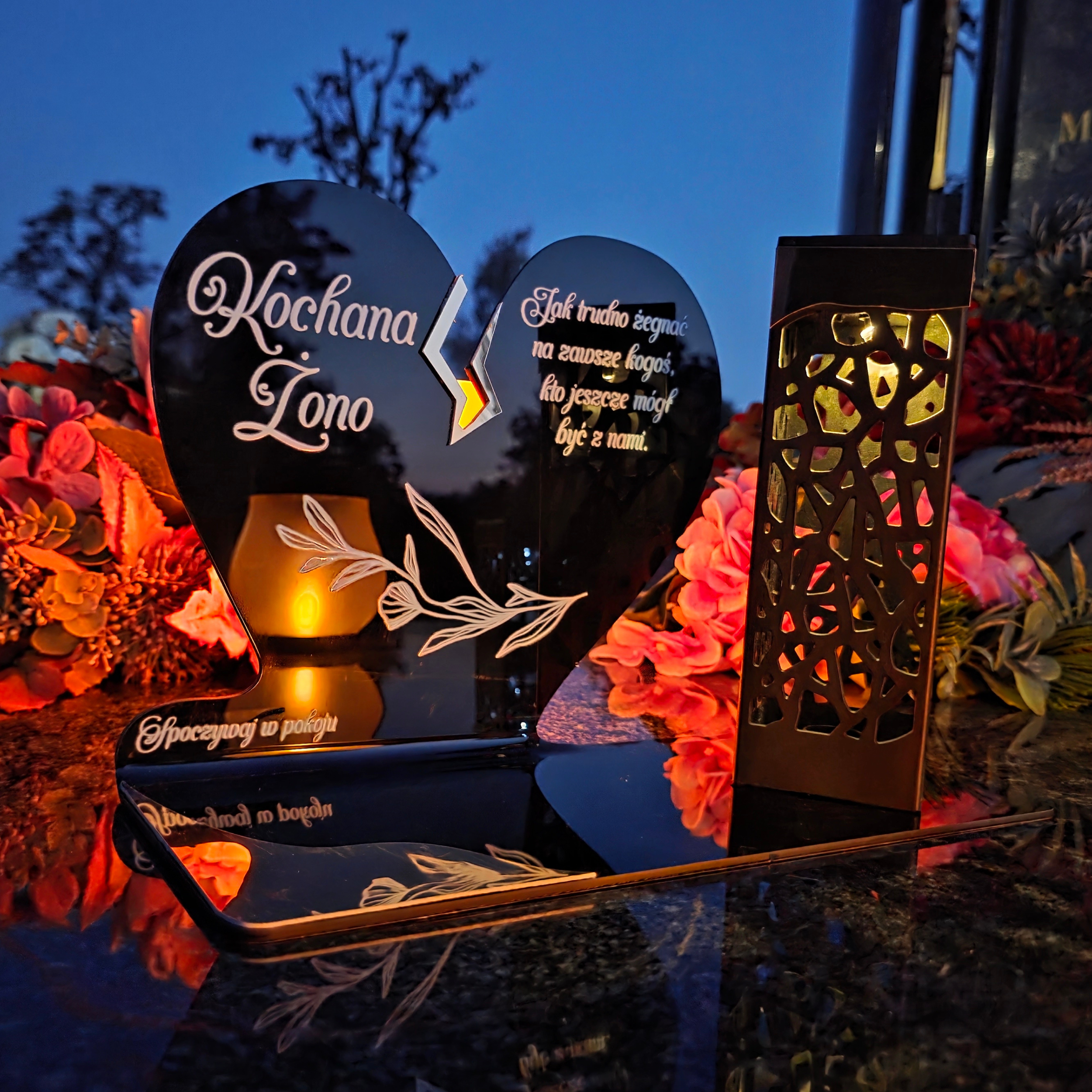 To niezwykła pamiątka łącząca tradycję z nowoczesnością. Zestawienie serca ze złotym akcentem i wysokiej lampki solarnej daje efekt elegancji oraz trwałego blasku pamięci, który rozświetla nagrobek przez cały rok – bez konieczności wymiany wkładów.