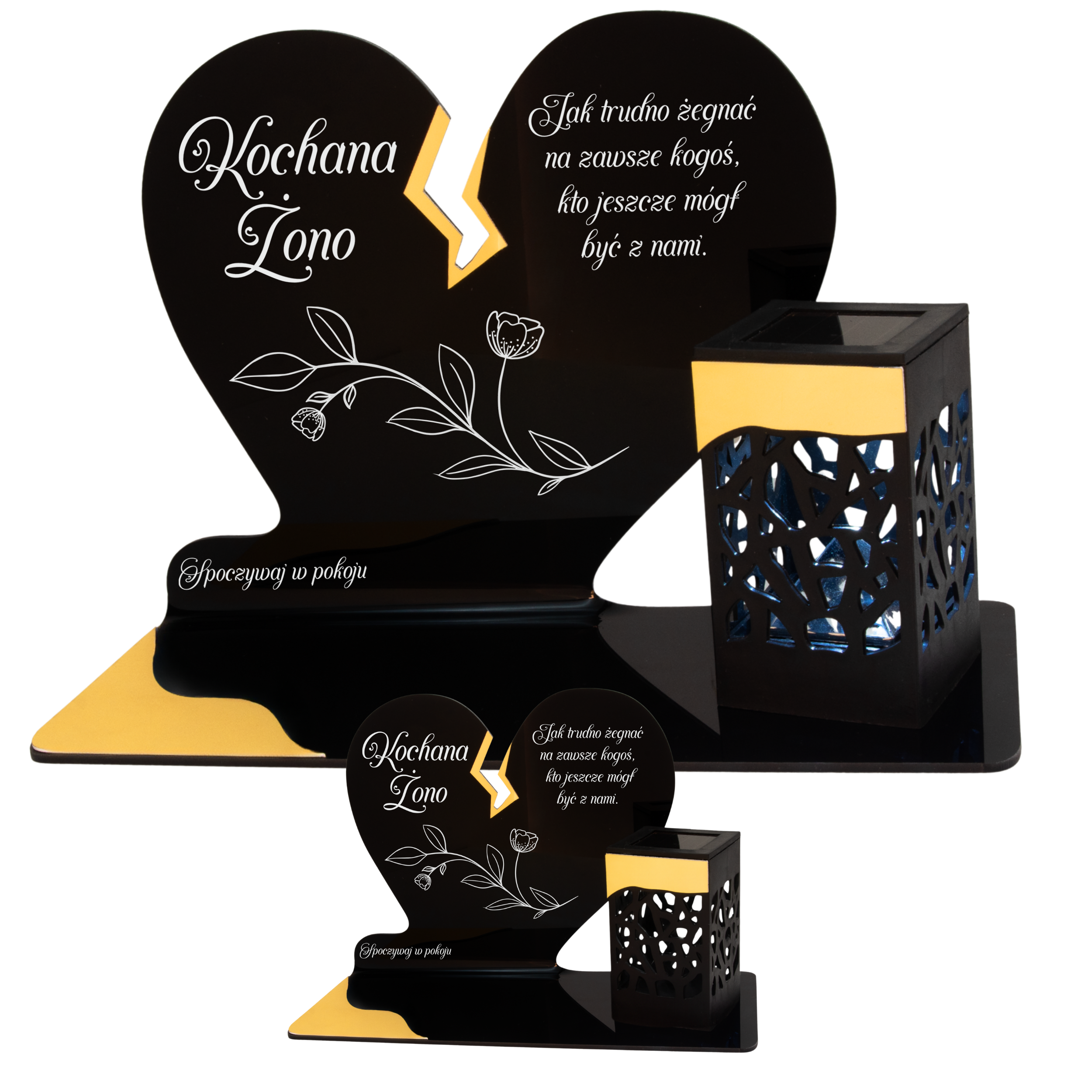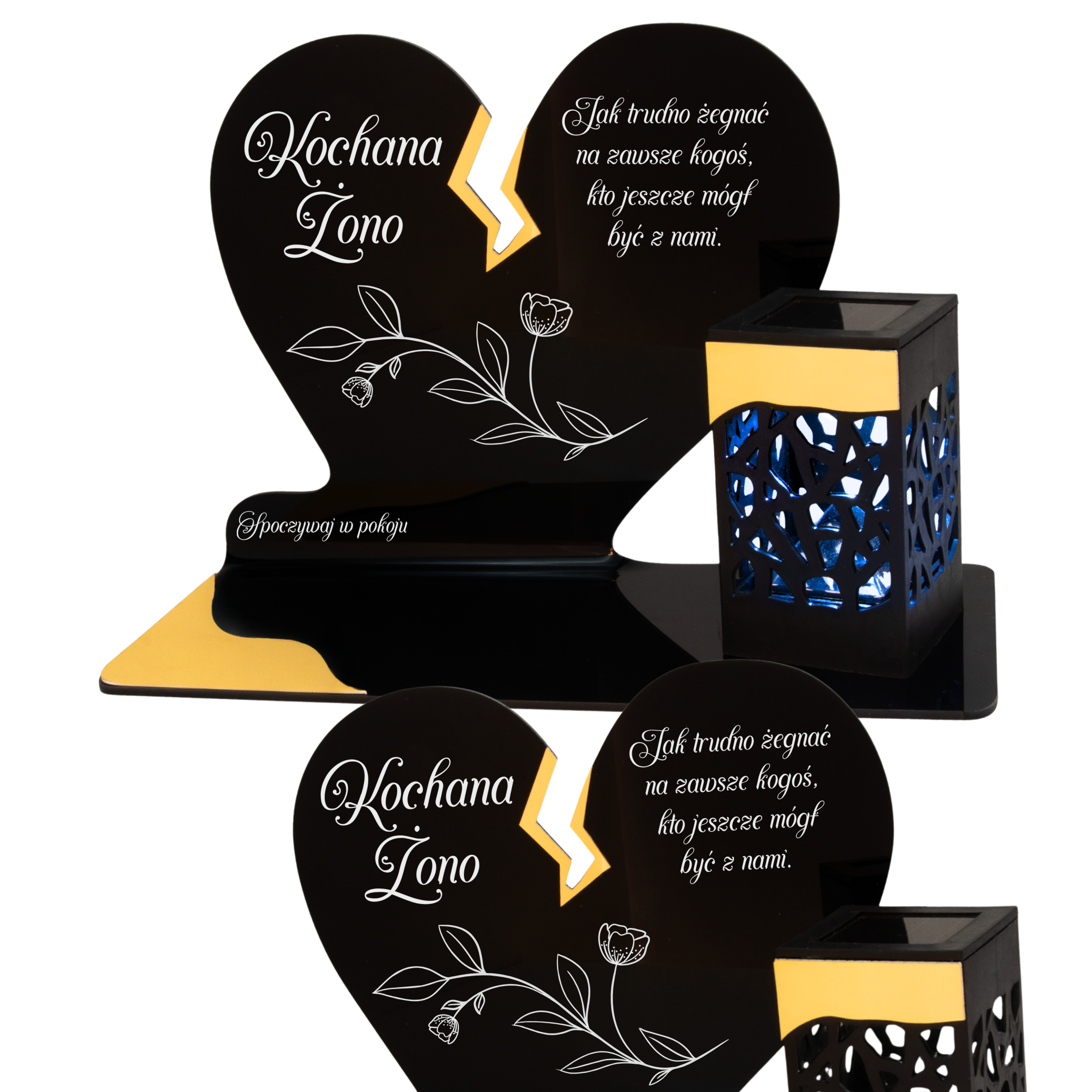 Elegancki znicz nagrobny dla Żony– serce ze złotymi akcentami i solarną lampką LED