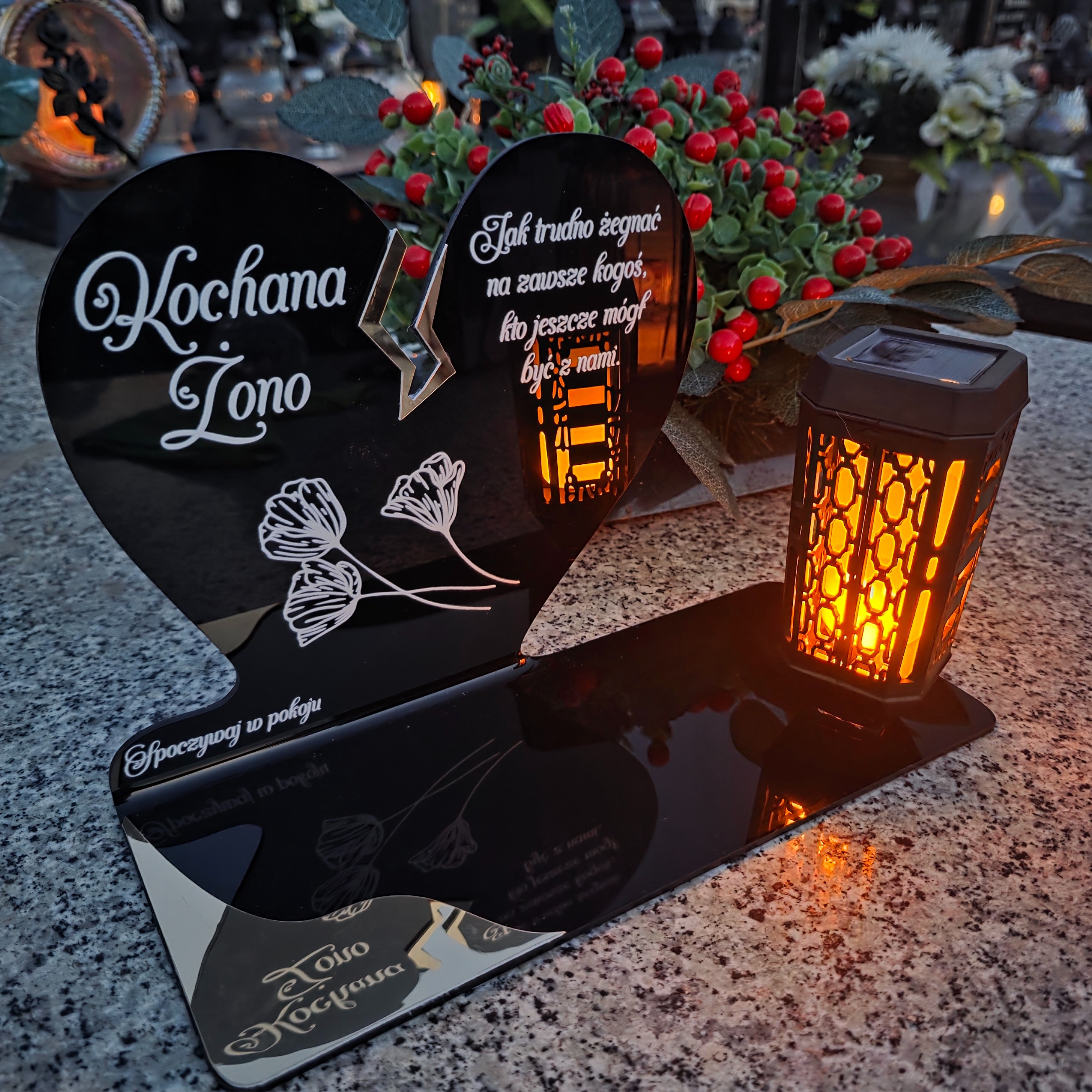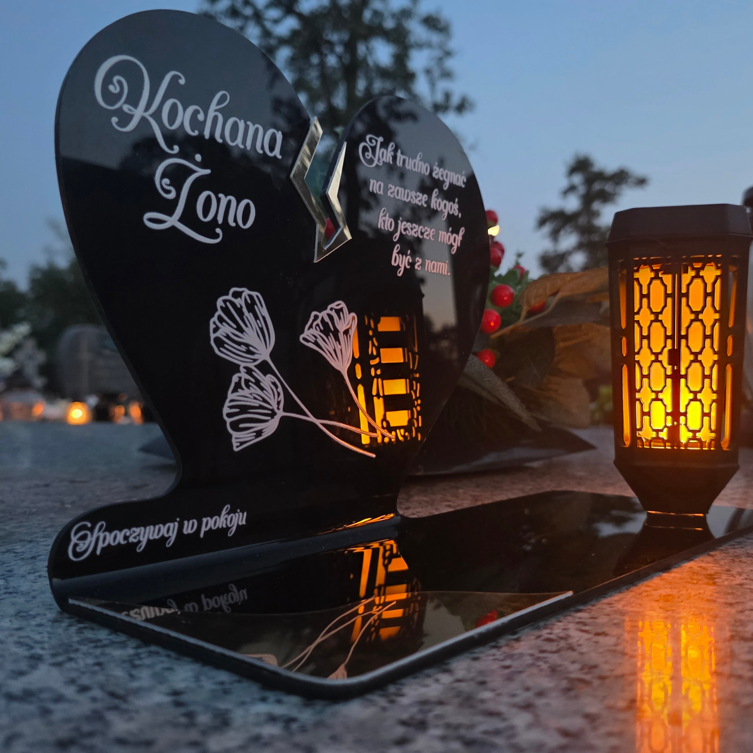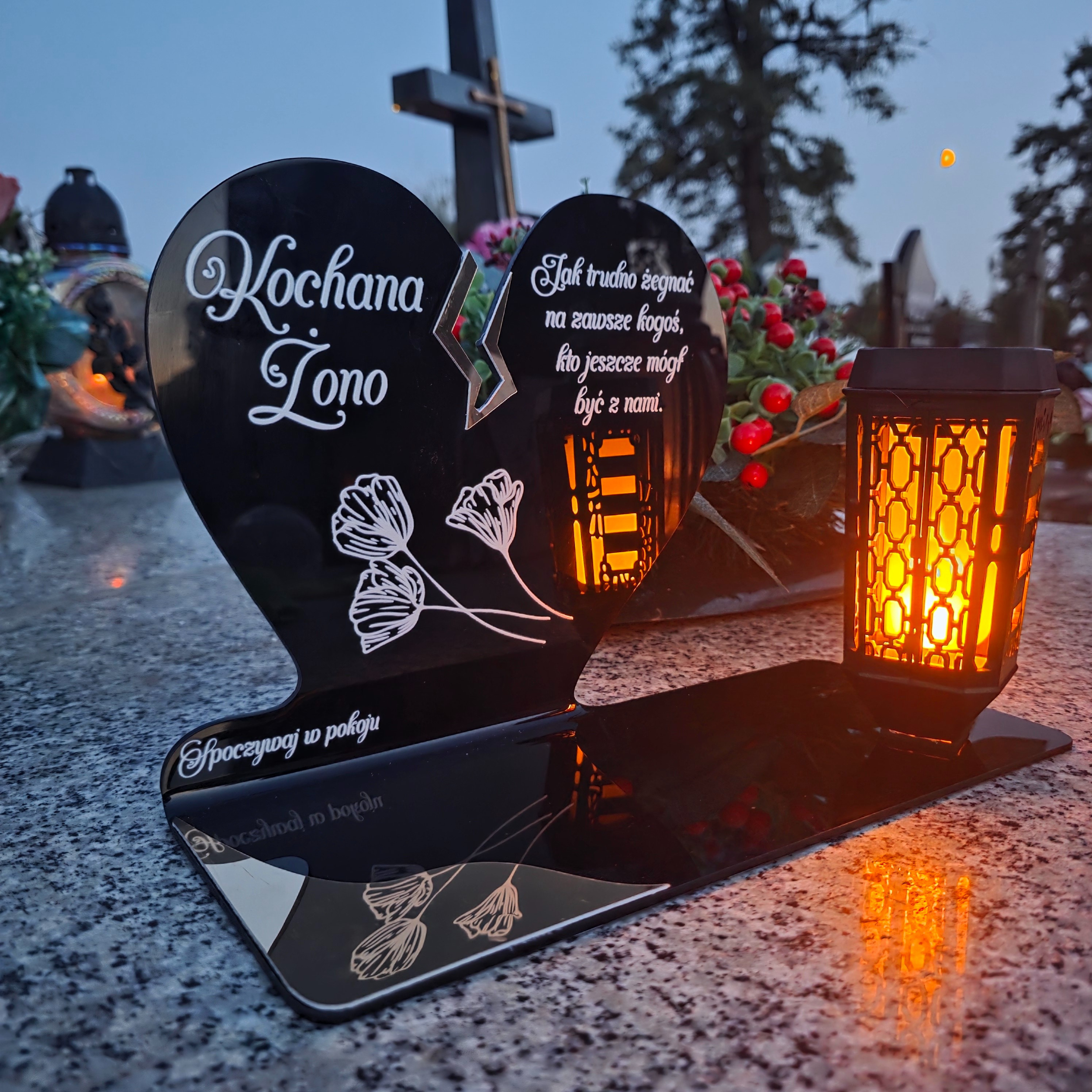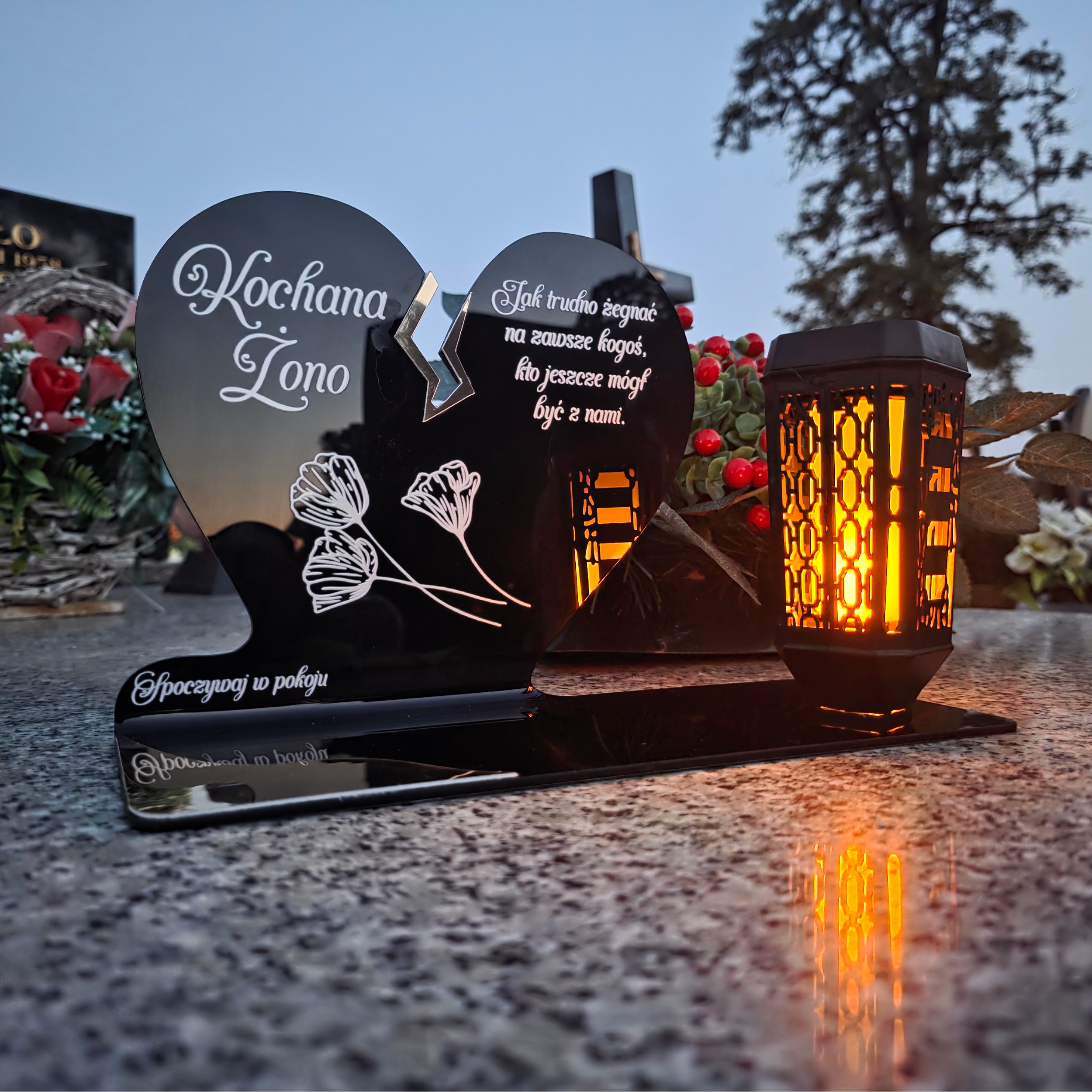 Ten wyjątkowy znicz nagrobny w formie czarnego serca z delikatnym złotym pęknięciem to piękny symbol miłości i pamięci, która nigdy nie gaśnie. Dedykacja „Kochana Żono” oraz subtelny motyw kwiatowy nadają całości wzruszającego i eleganckiego charakteru. Zestaw dopełnia nowoczesna lampka solarna LED, która po zmroku rozświetla pomnik ciepłym blaskiem, tworząc atmosferę zadumy i spokoju.
