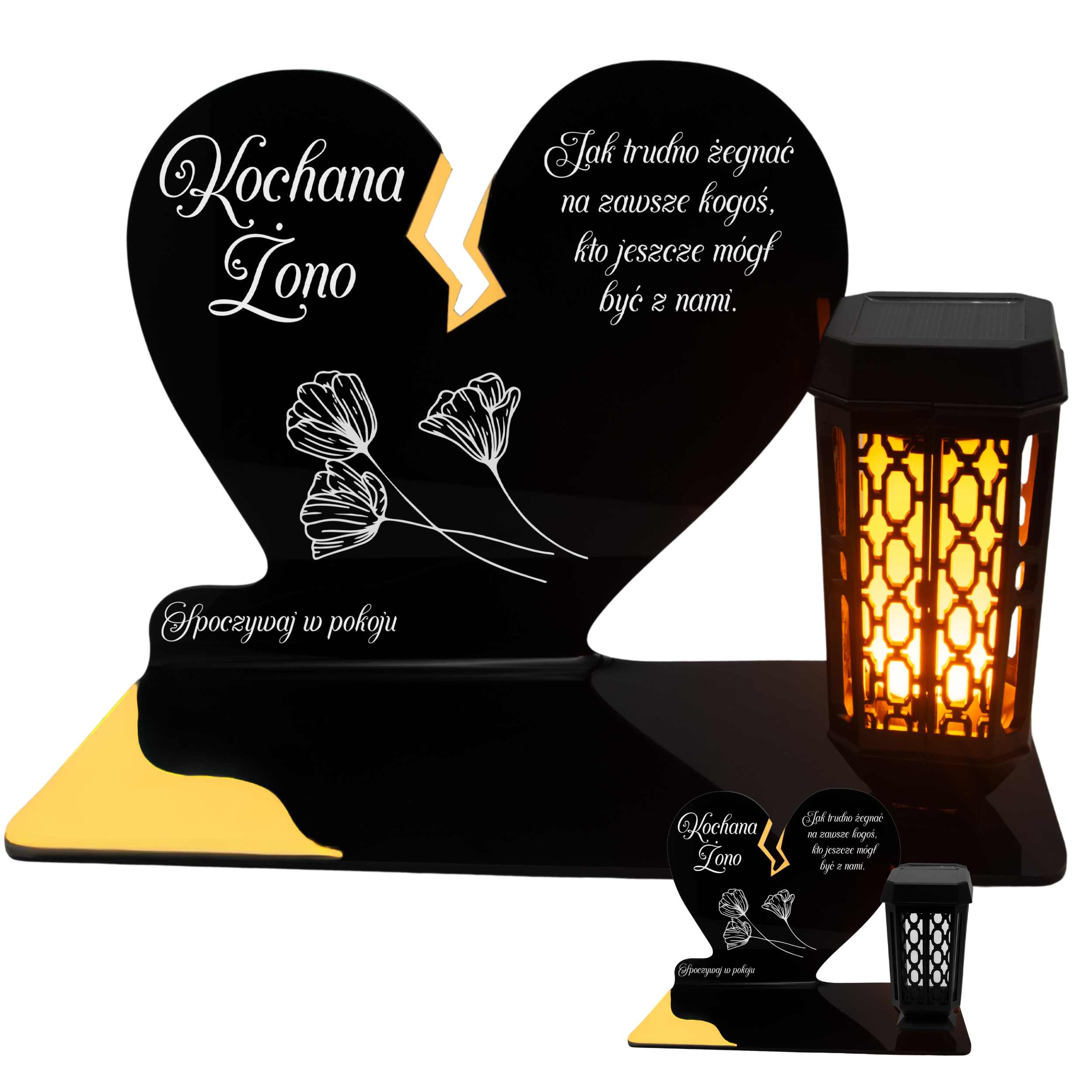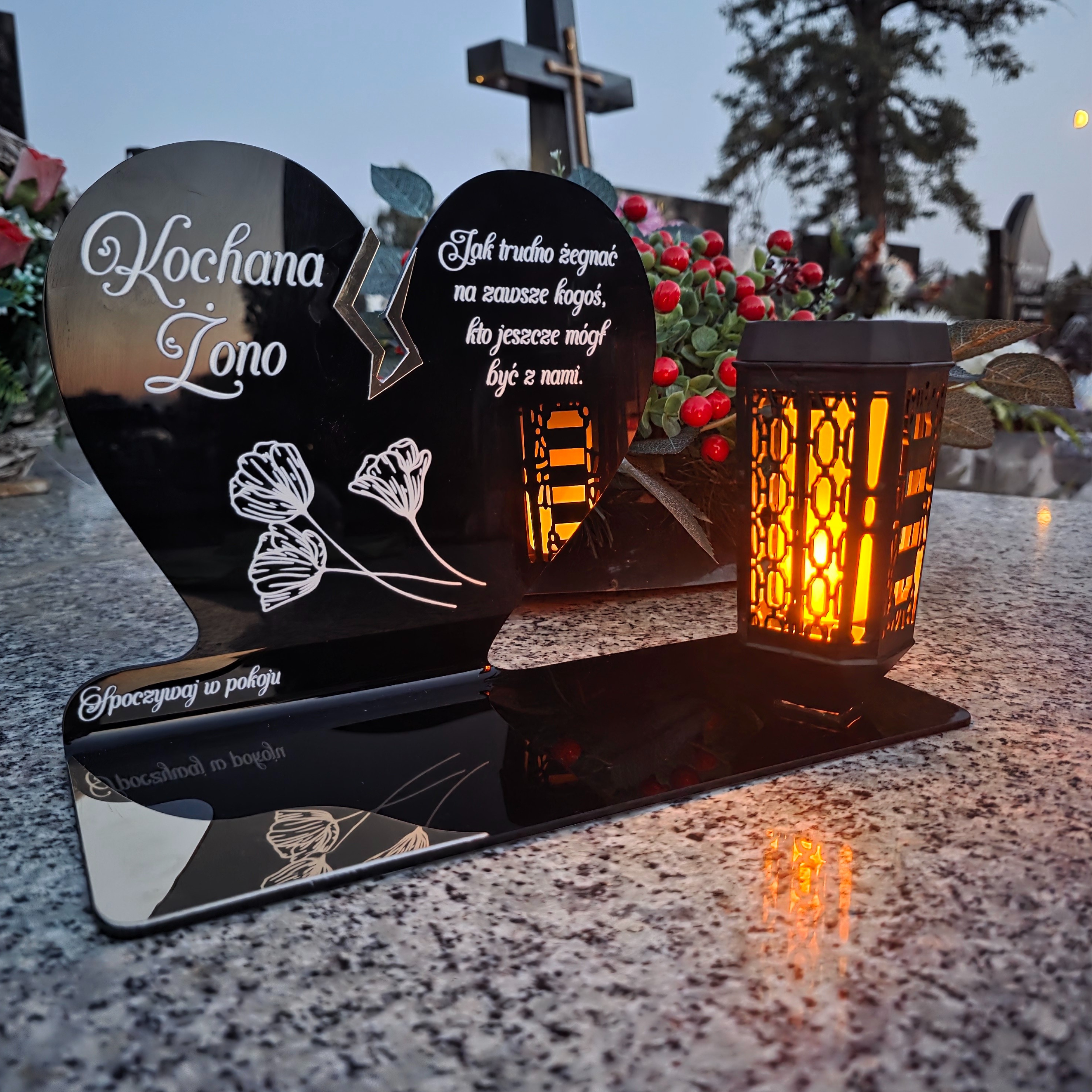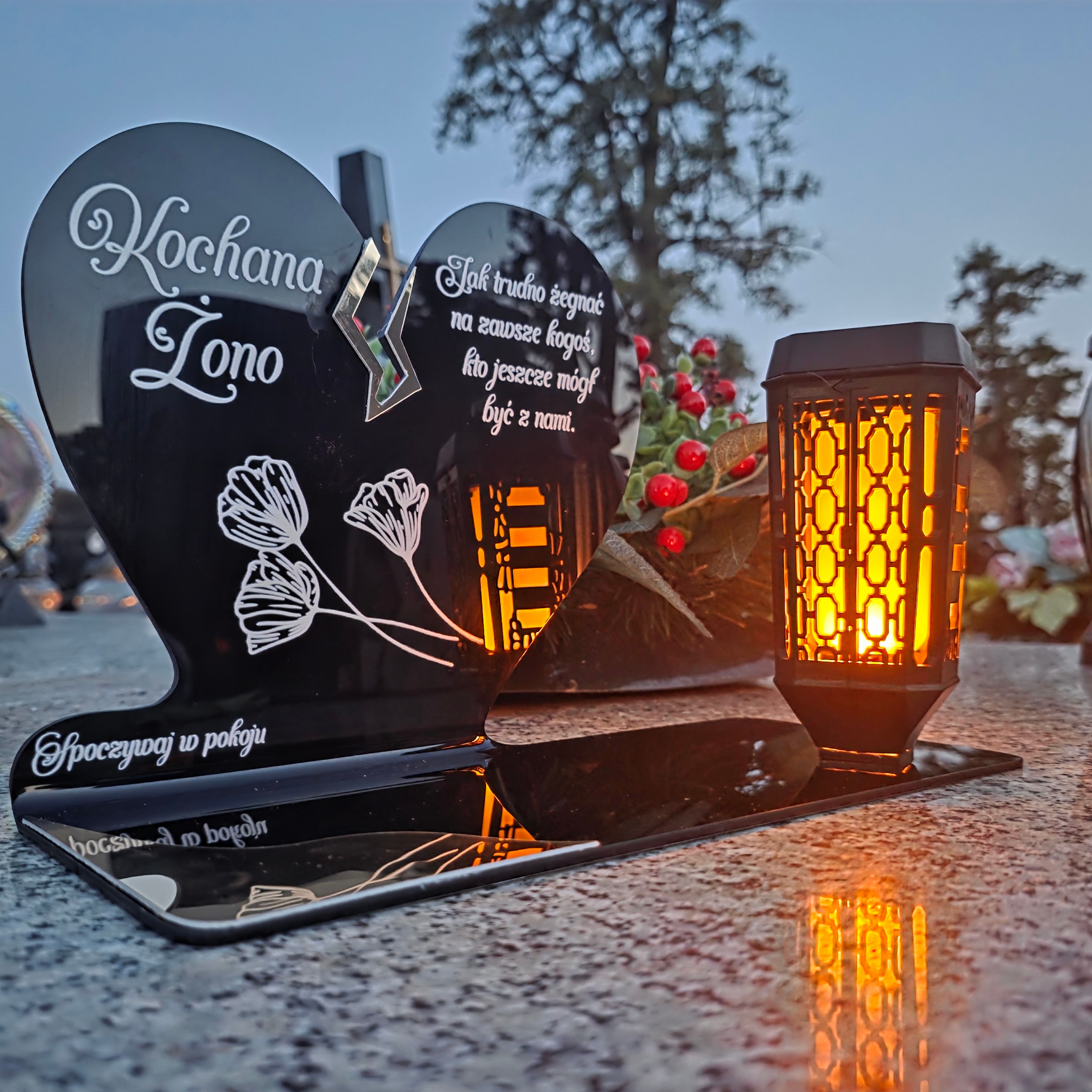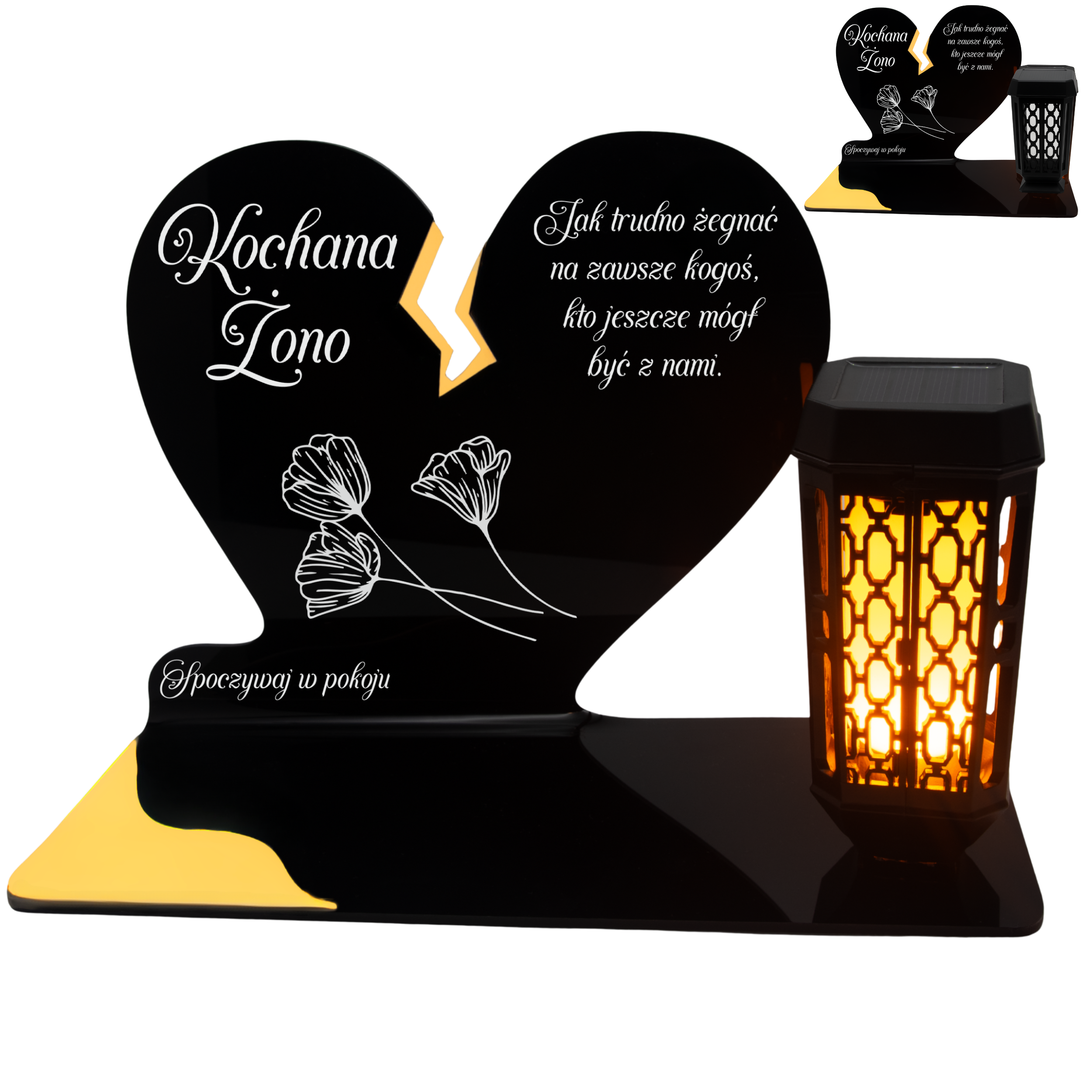 Ten wyjątkowy znicz nagrobny w formie czarnego serca z delikatnym złotym pęknięciem to piękny symbol miłości i pamięci, która nigdy nie gaśnie. Dedykacja „Kochana Żono” oraz subtelny motyw kwiatowy nadają całości wzruszającego i eleganckiego charakteru. Zestaw dopełnia nowoczesna lampka solarna LED, która po zmroku rozświetla pomnik ciepłym blaskiem, tworząc atmosferę zadumy i spokoju.