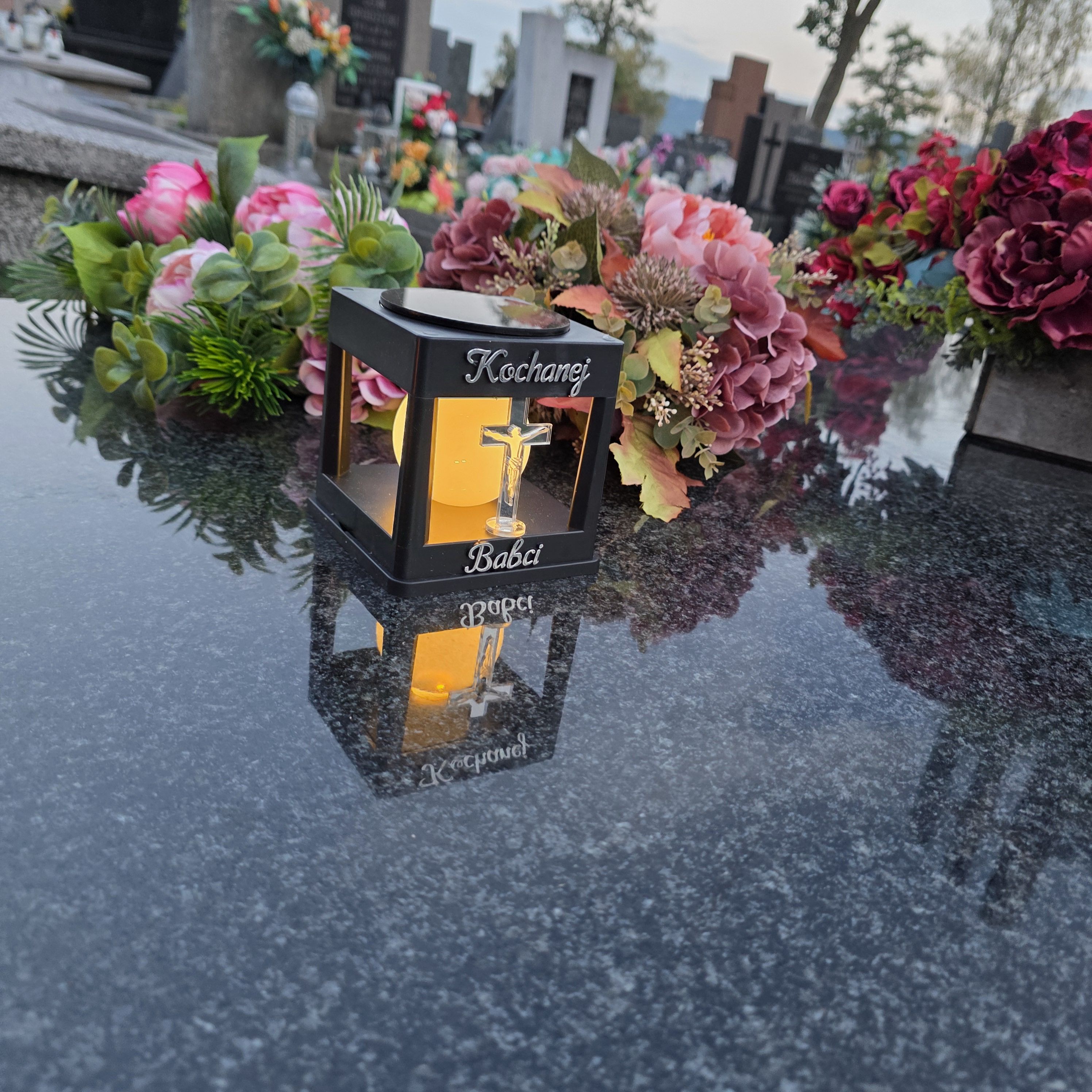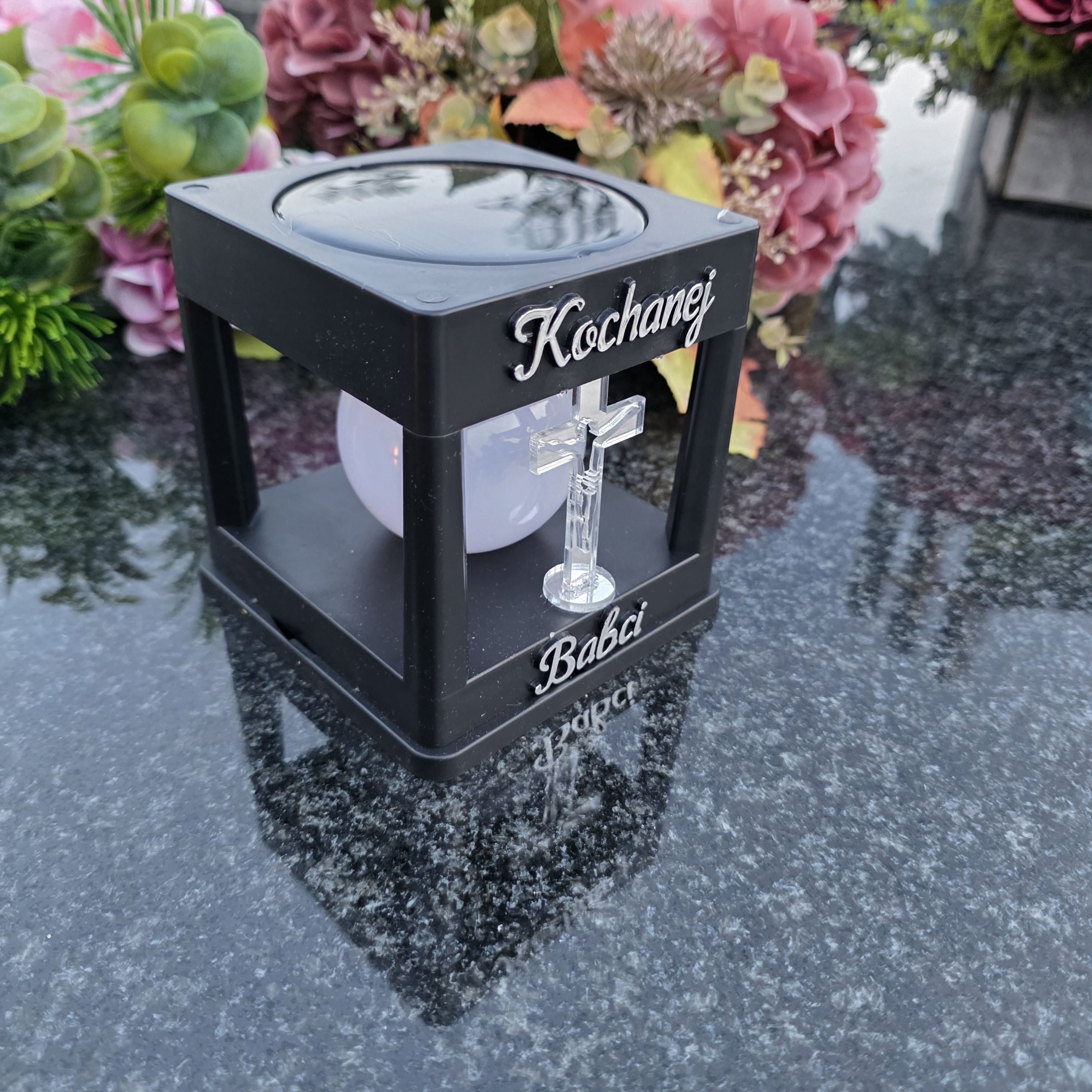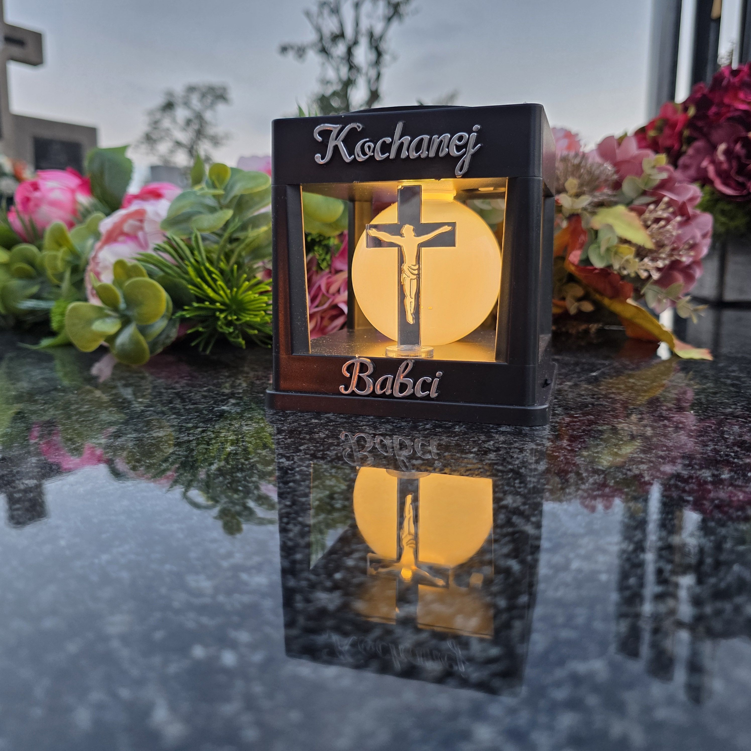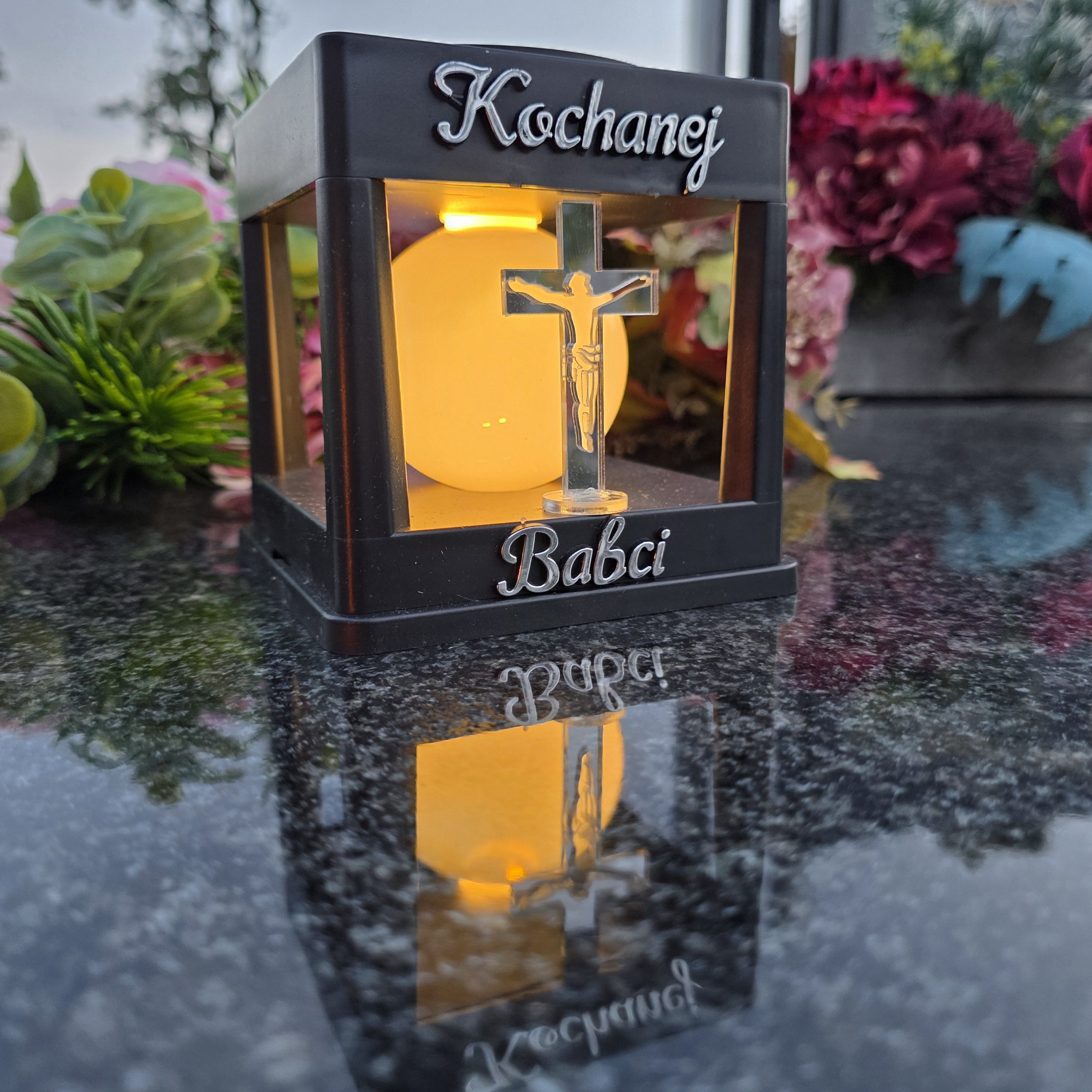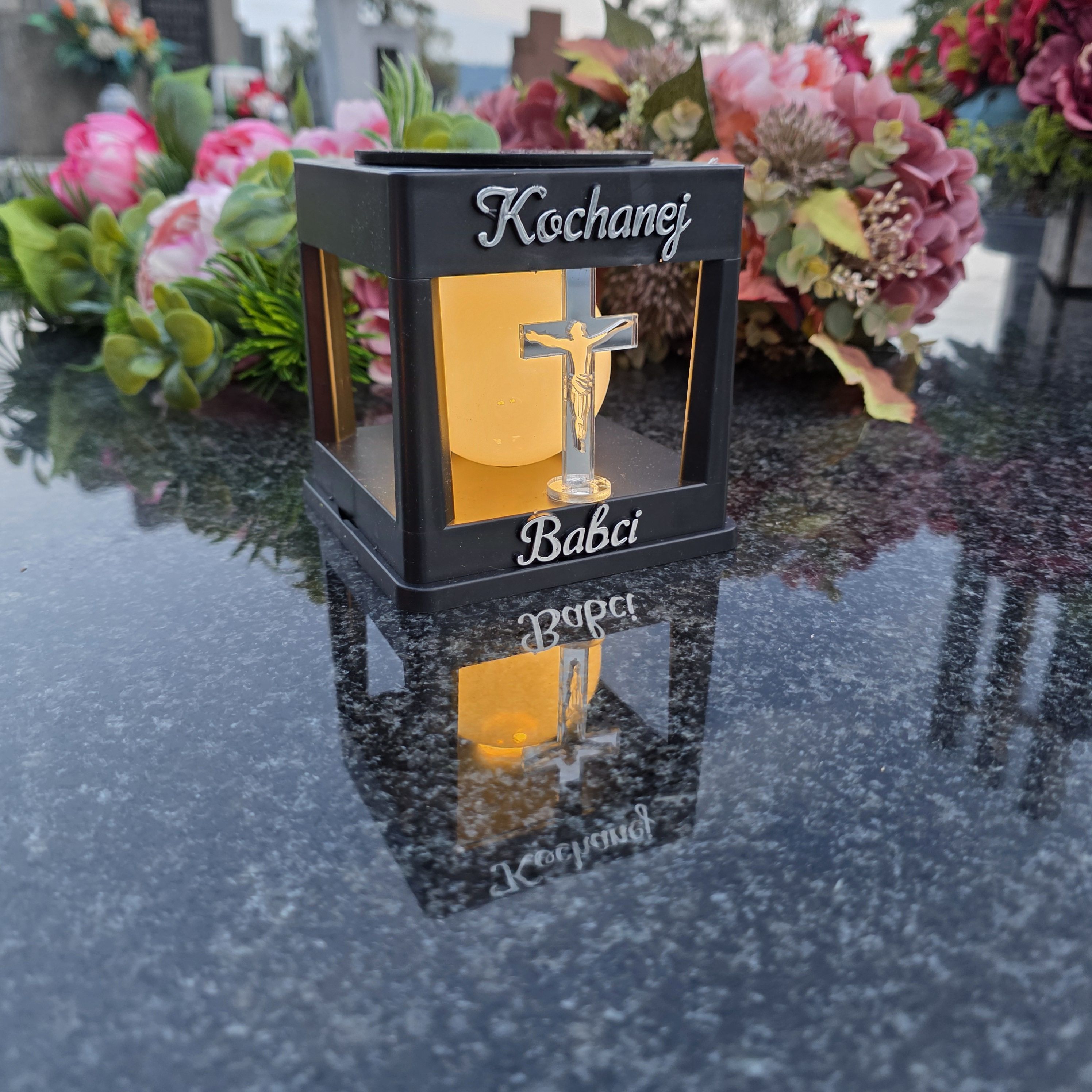 LAMPA SOLARNA ZNICZ NA GRÓB NOWOCZESNA INSPIROWANA KLASYKĄ ZE SREBRNYM KRZYŻEM