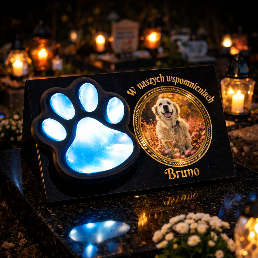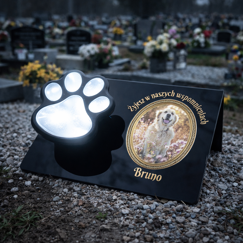 Elegancki, symboliczny znicz solarny, który pozwala w wyjątkowy sposób uczcić pamięć ukochanego psa lub kota.