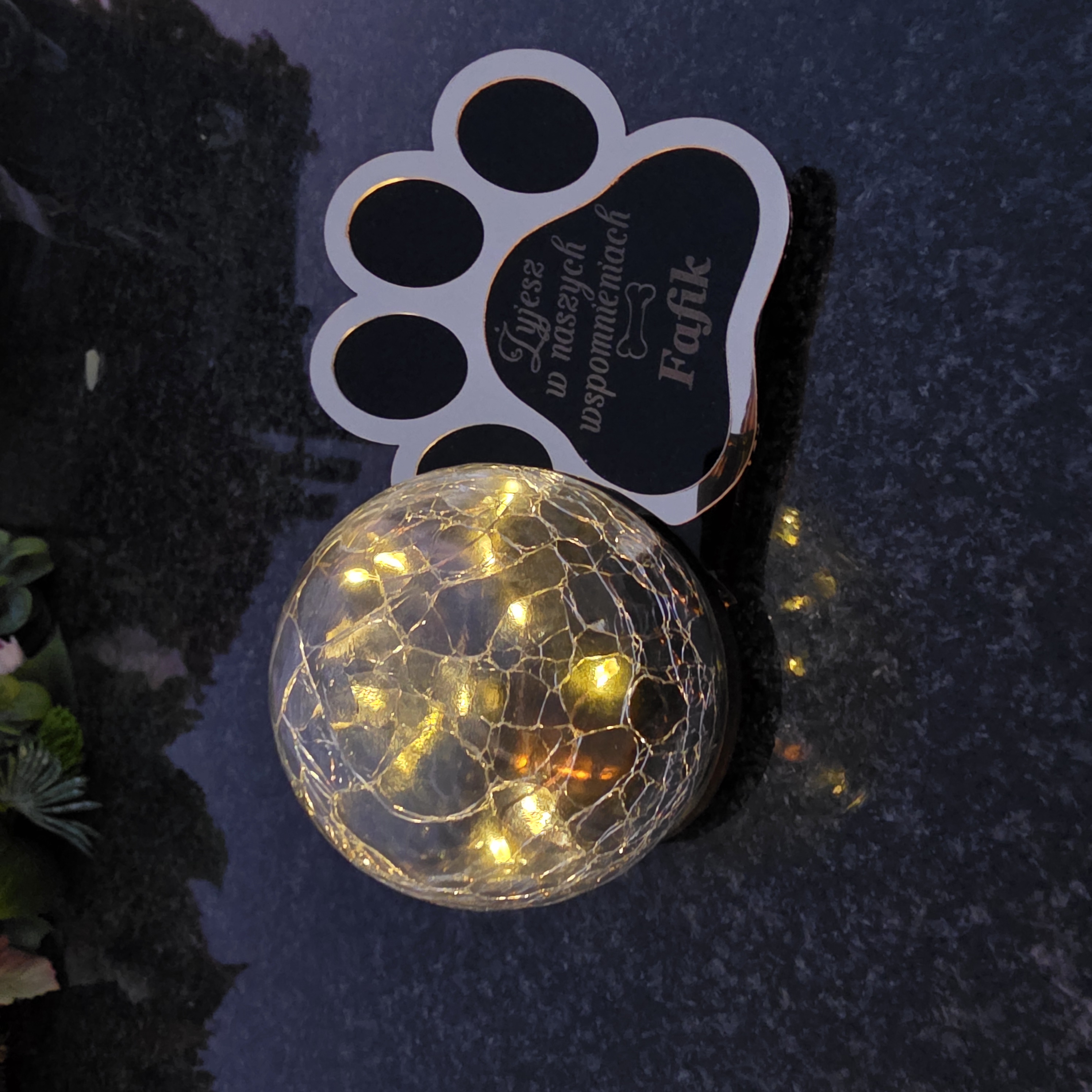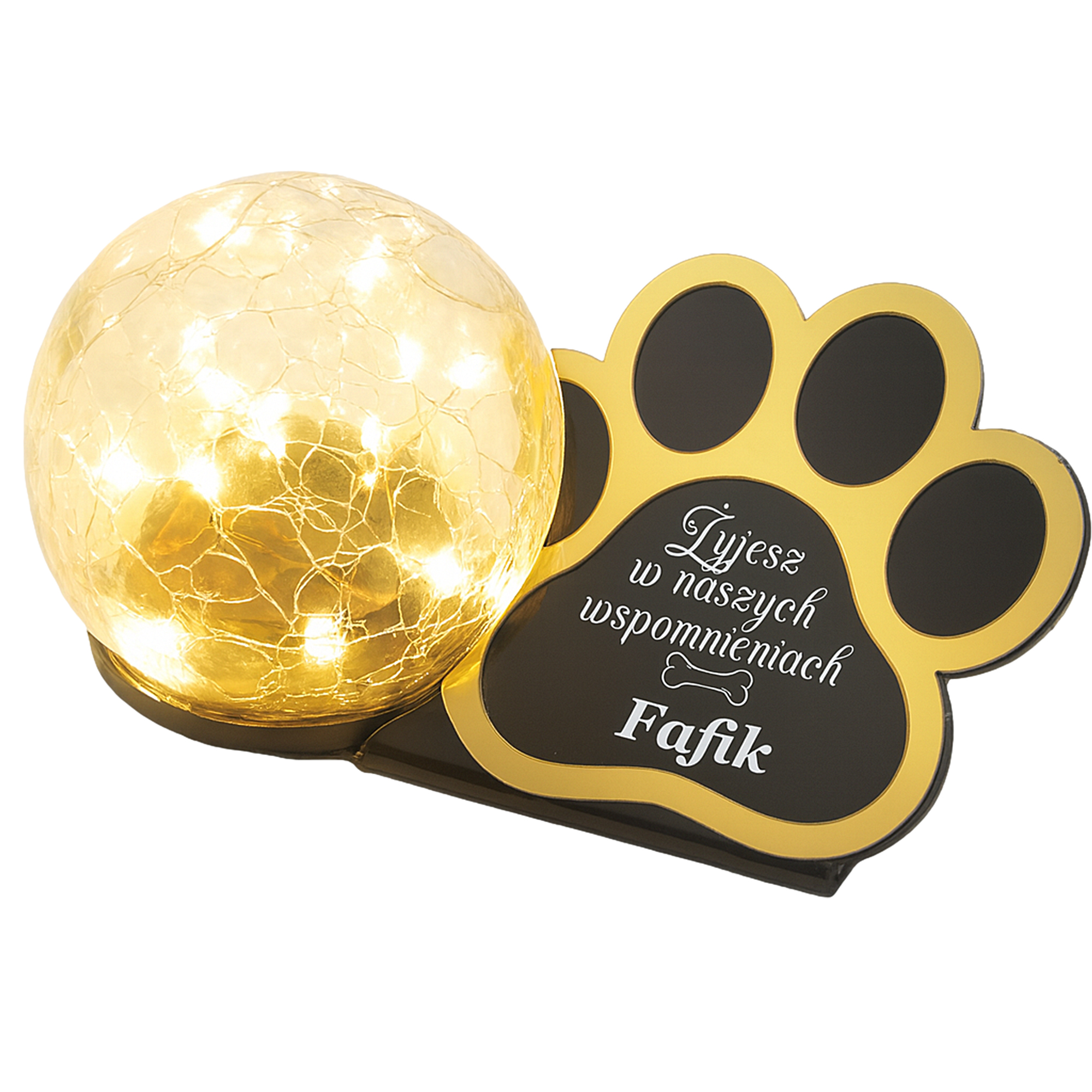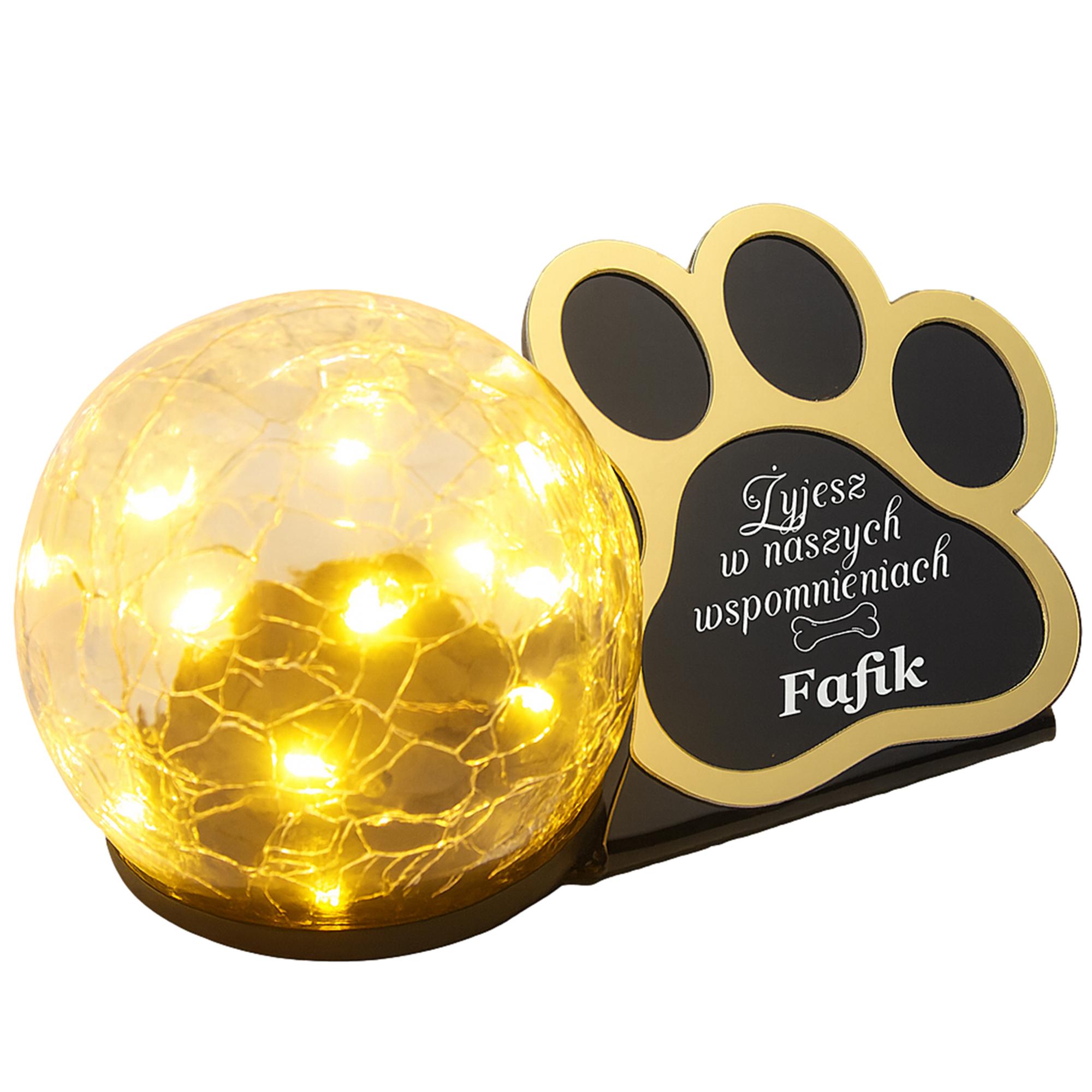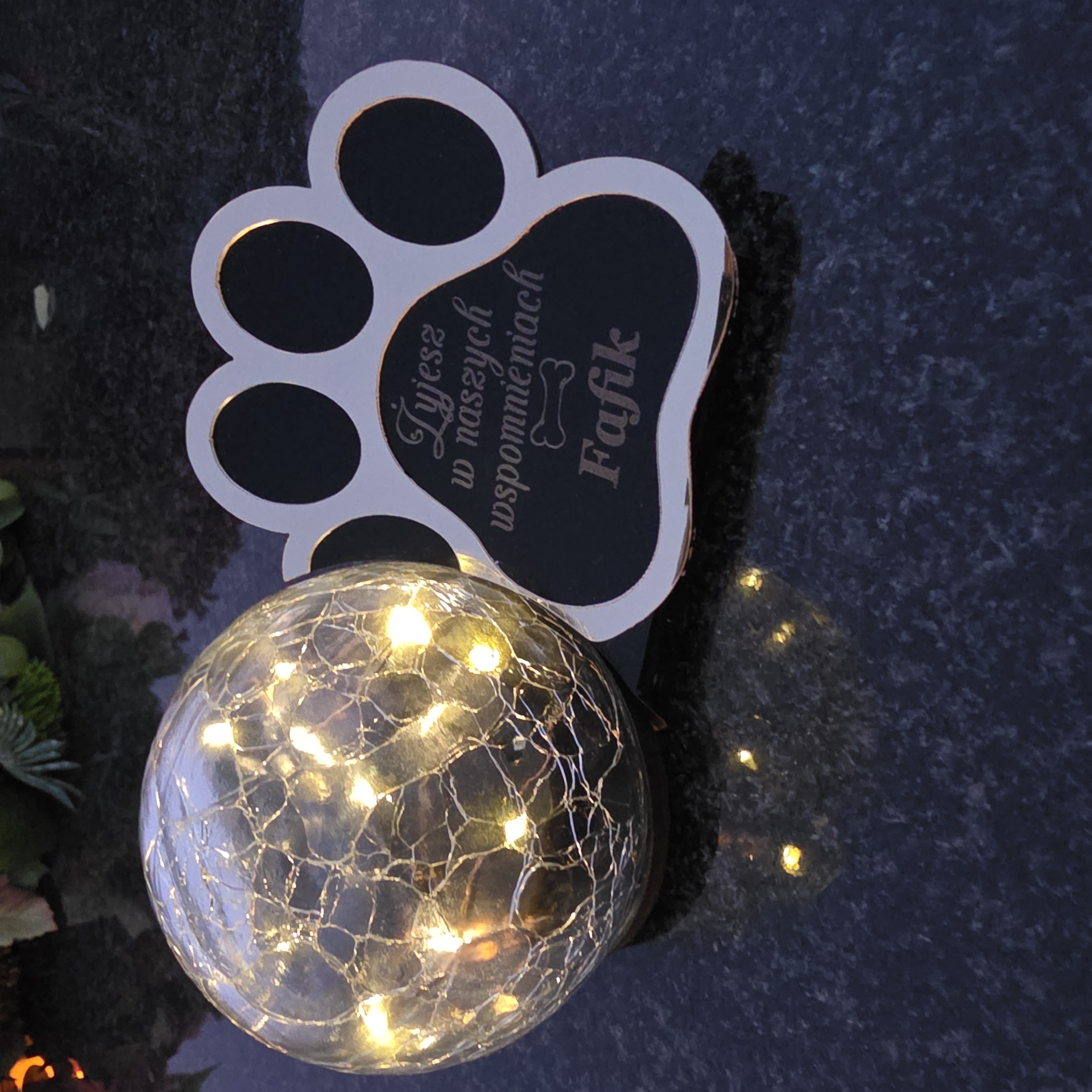 Statuetka–znicz z czarną, błyszczącą tabliczką i lampą LED ładowaną słońcem. Bez wkładów, bez baterii, bez kłopotu – trwała pamiątka po ukochanym Pupilu.