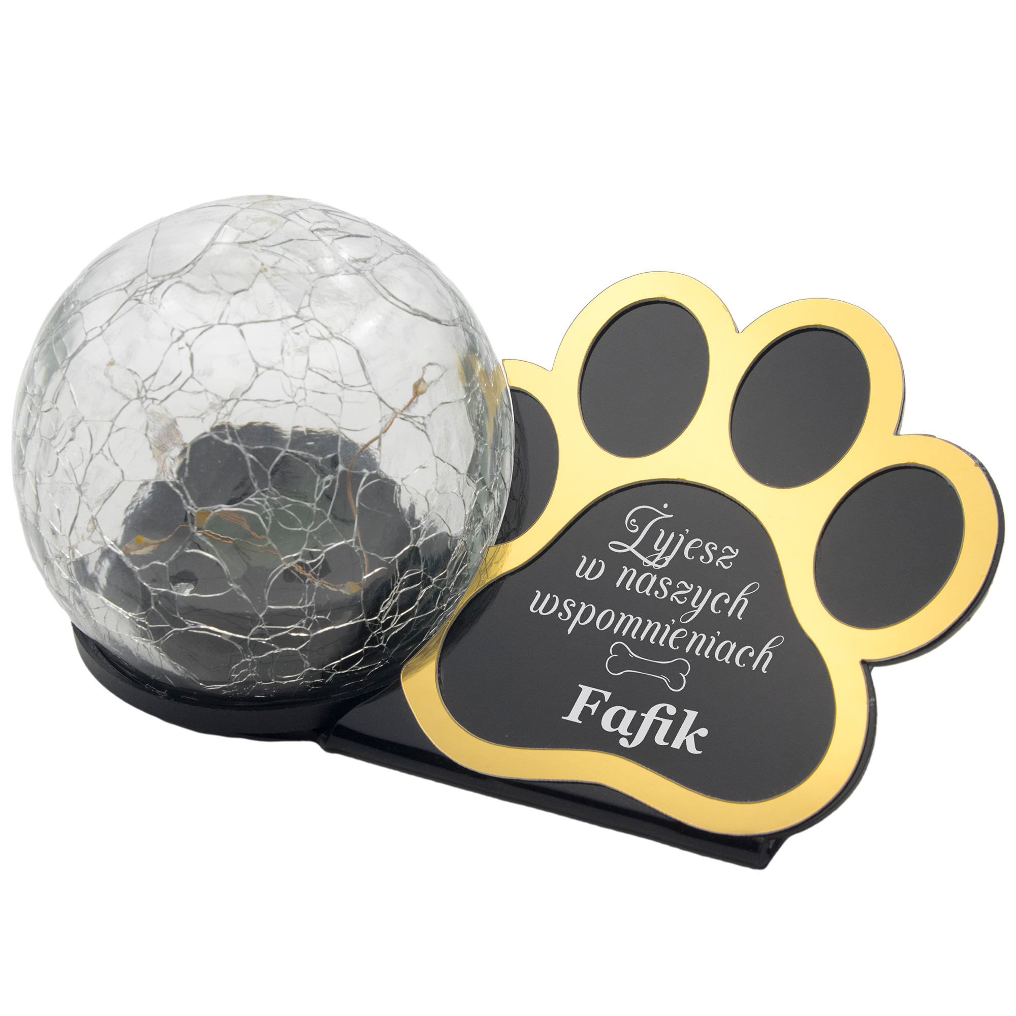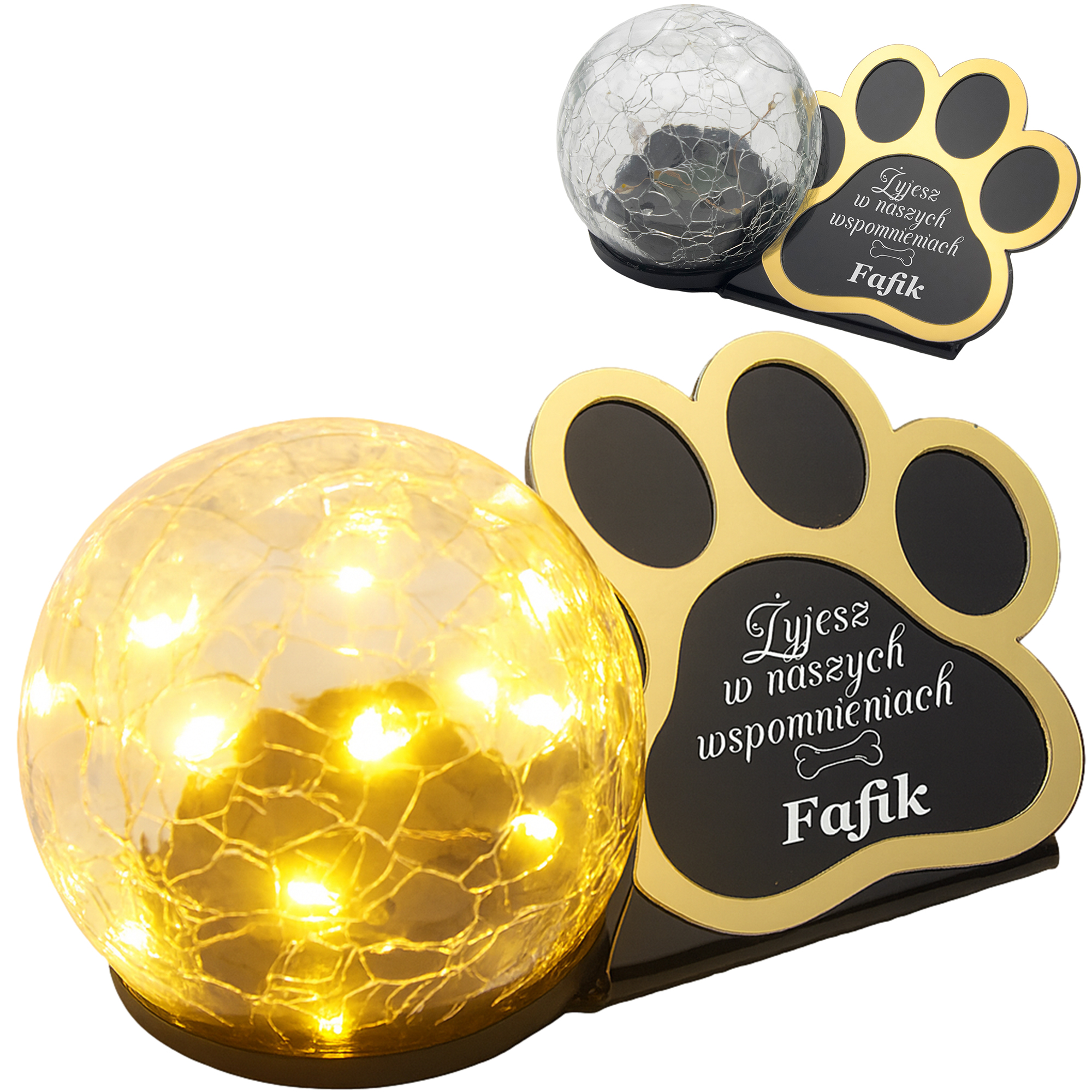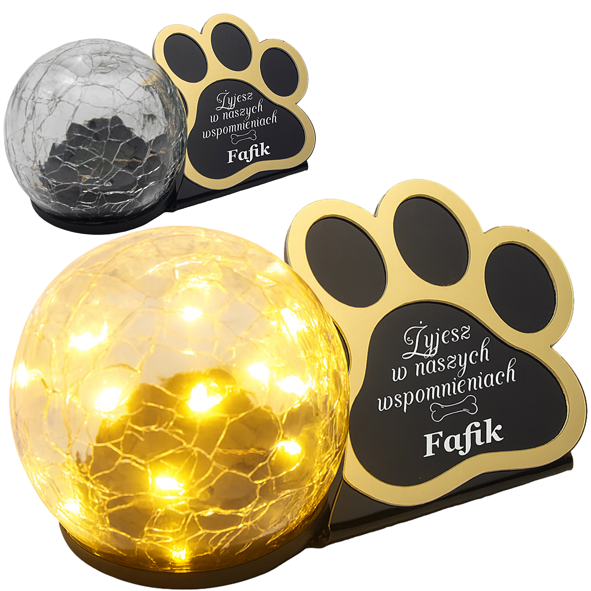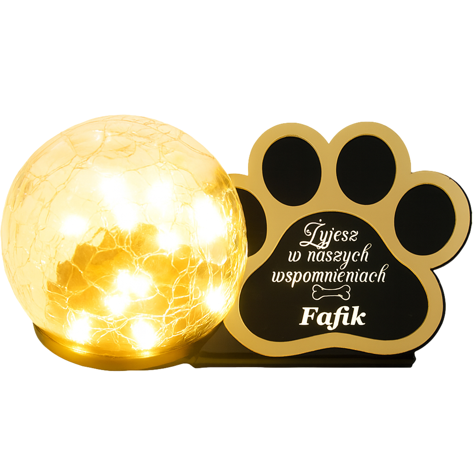 Statuetka–znicz z czarną, błyszczącą tabliczką i lampą LED ładowaną słońcem. Bez wkładów, bez baterii, bez kłopotu – trwała pamiątka po ukochanym Pupilu.