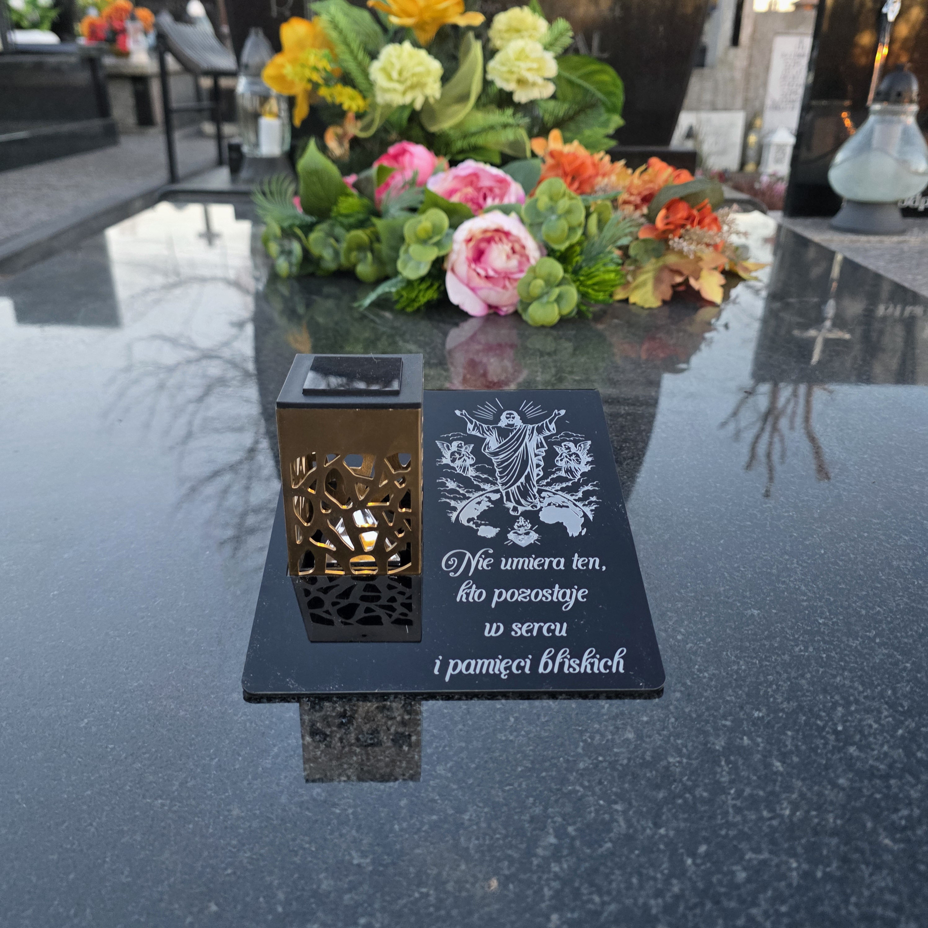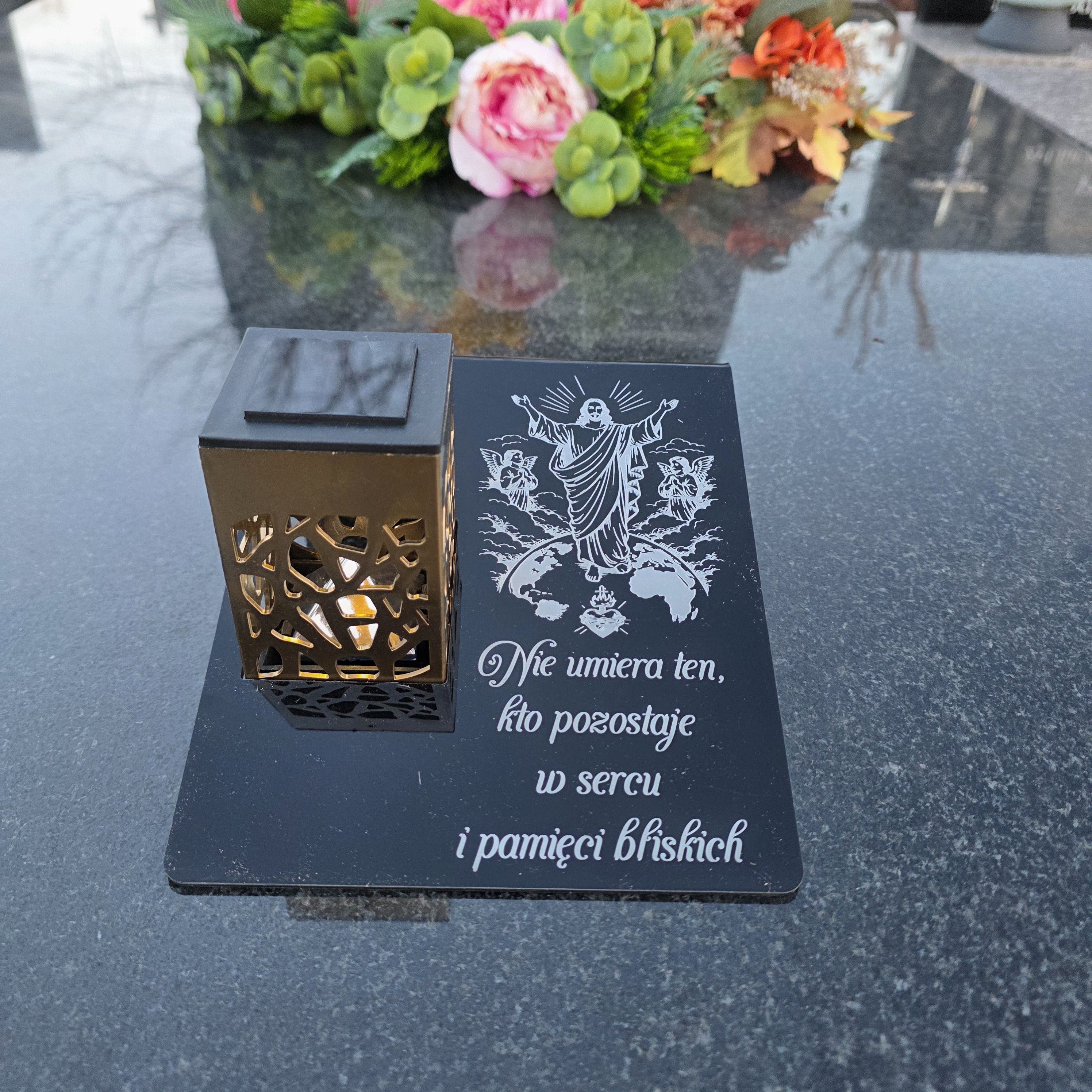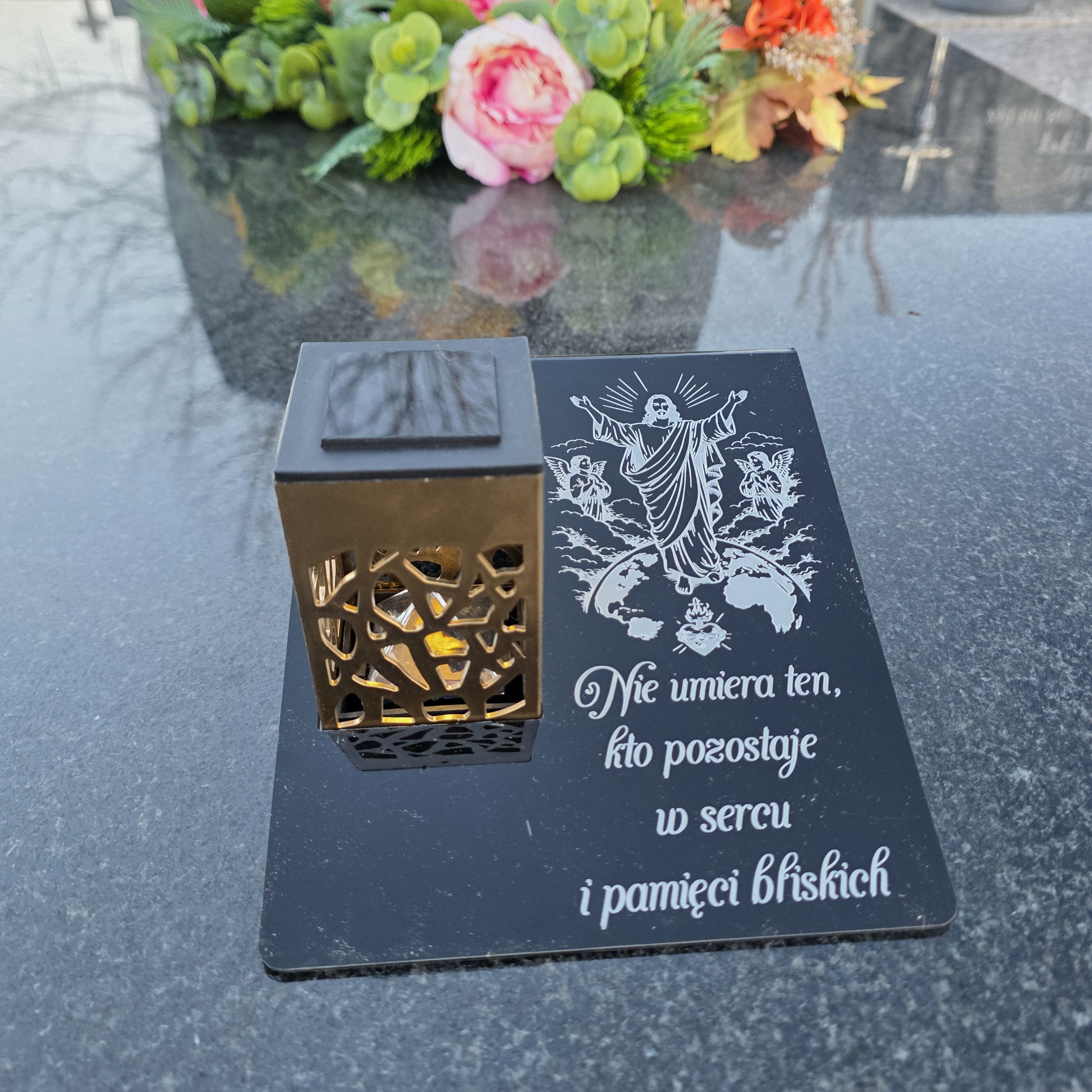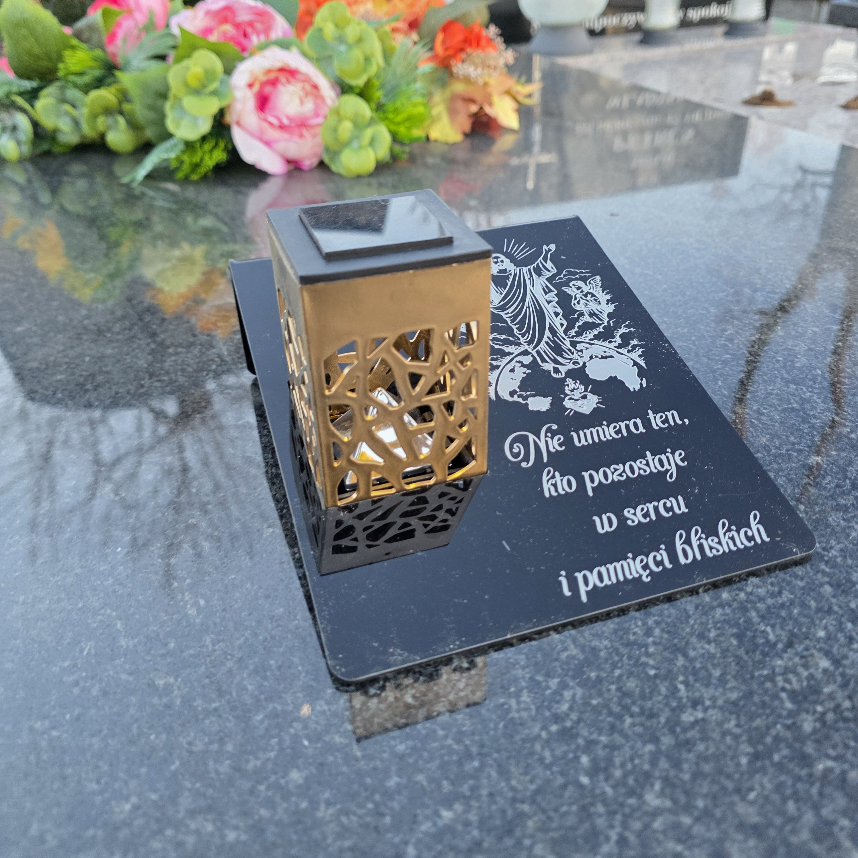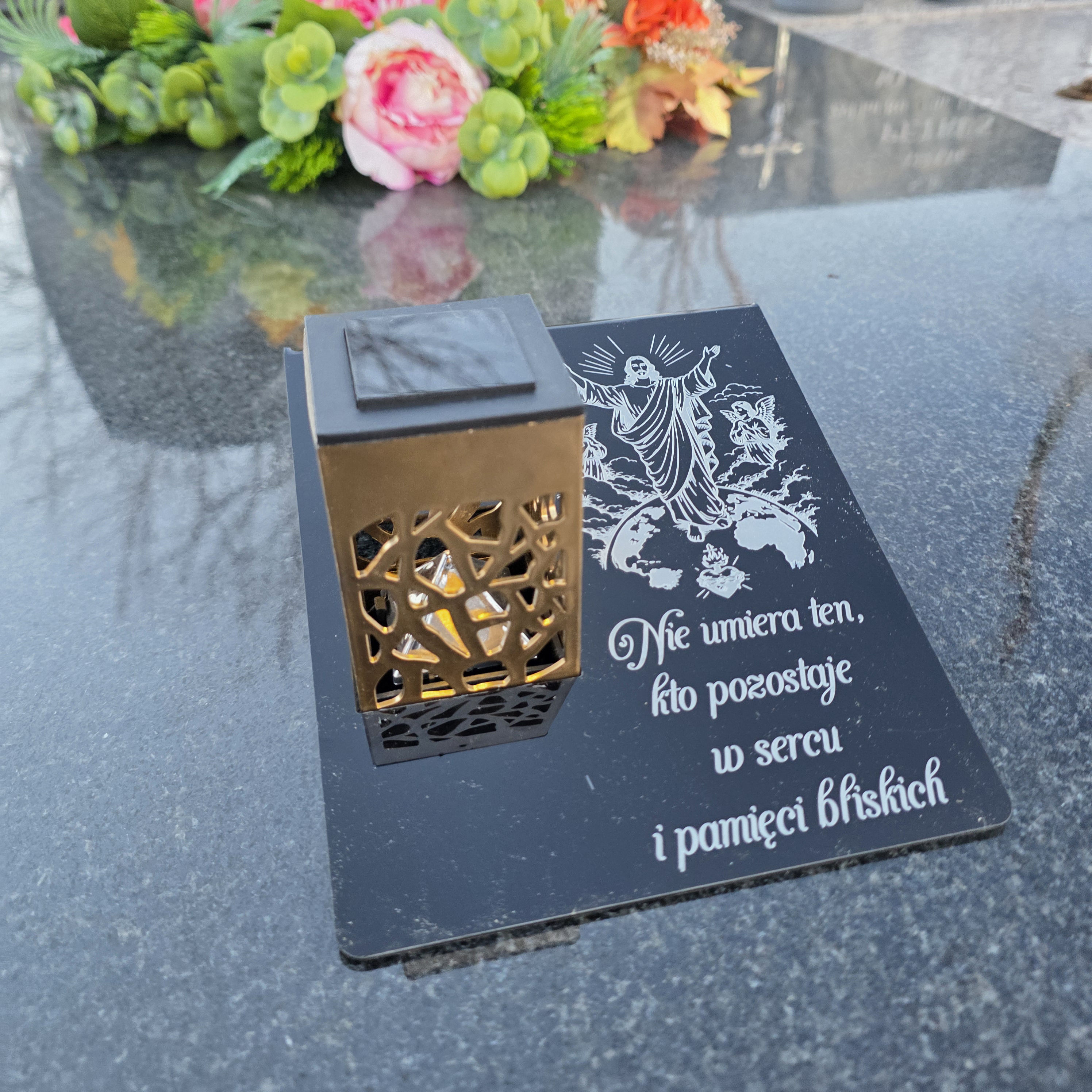 Połączenie lampionu solarnego LED z tabliczką z trwałym grawerem tworzy wyjątkową kompozycję pamięci i wiary.