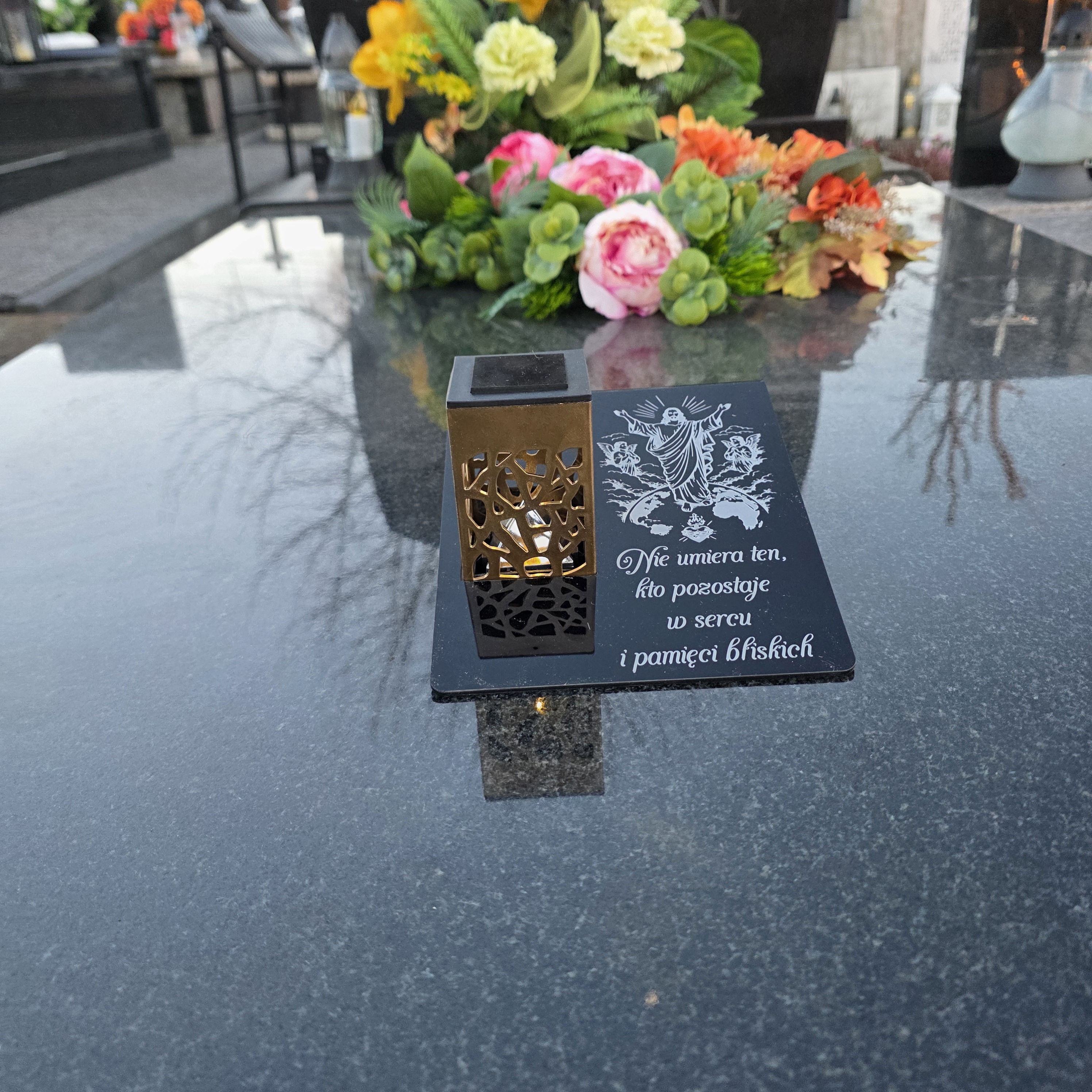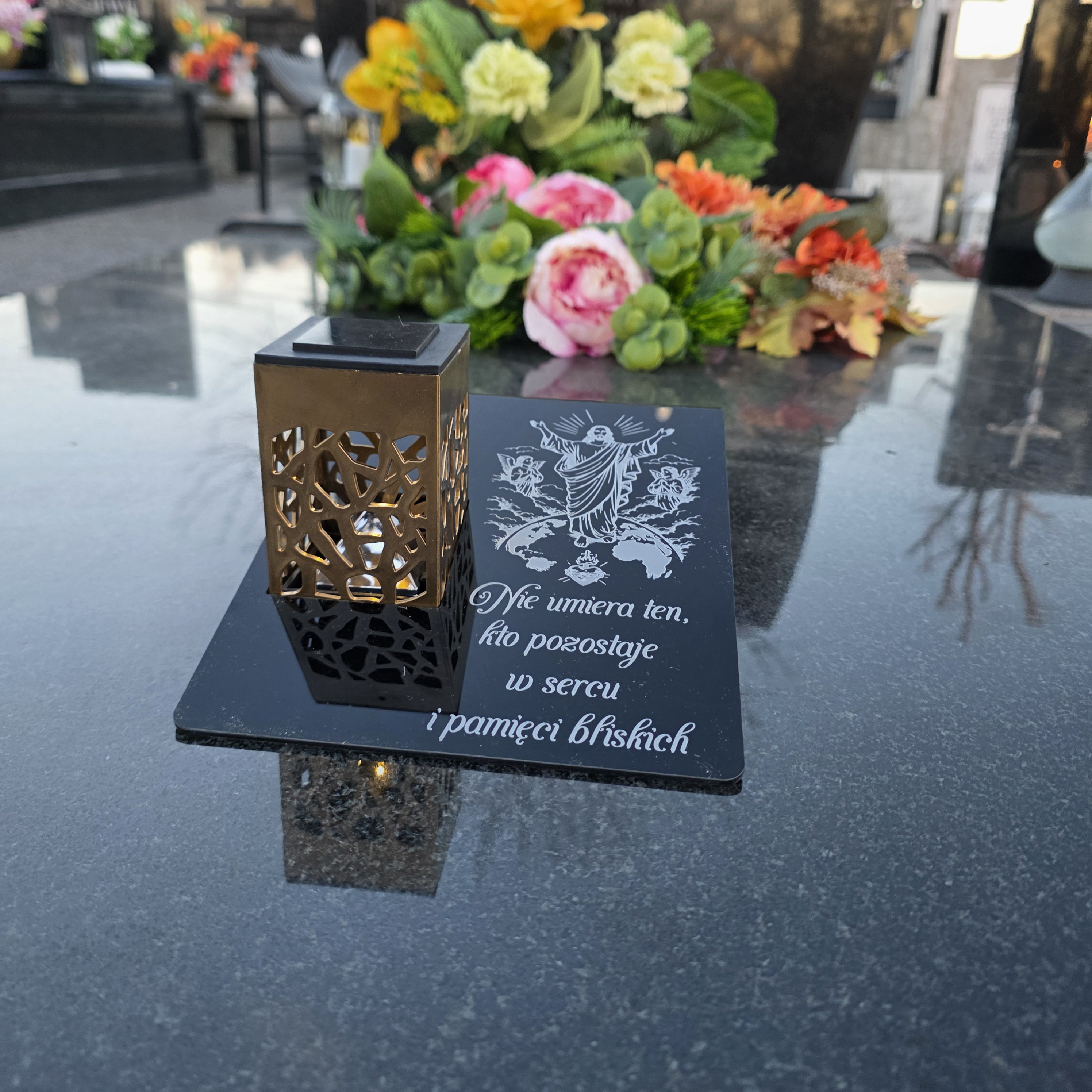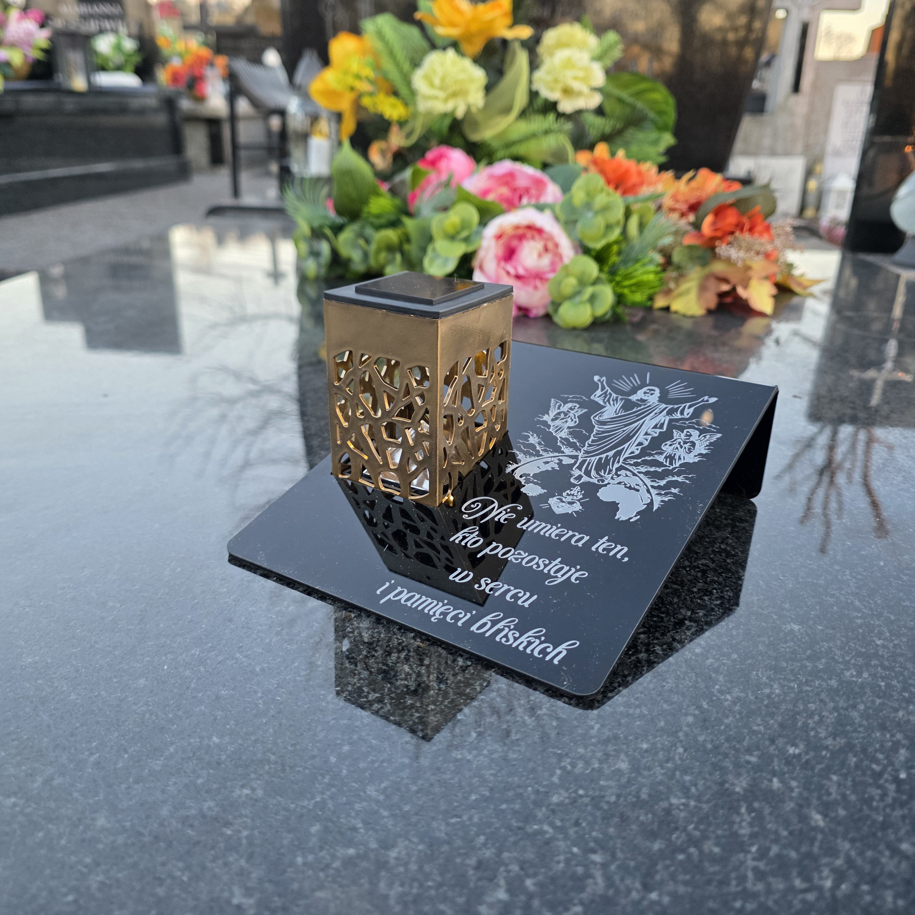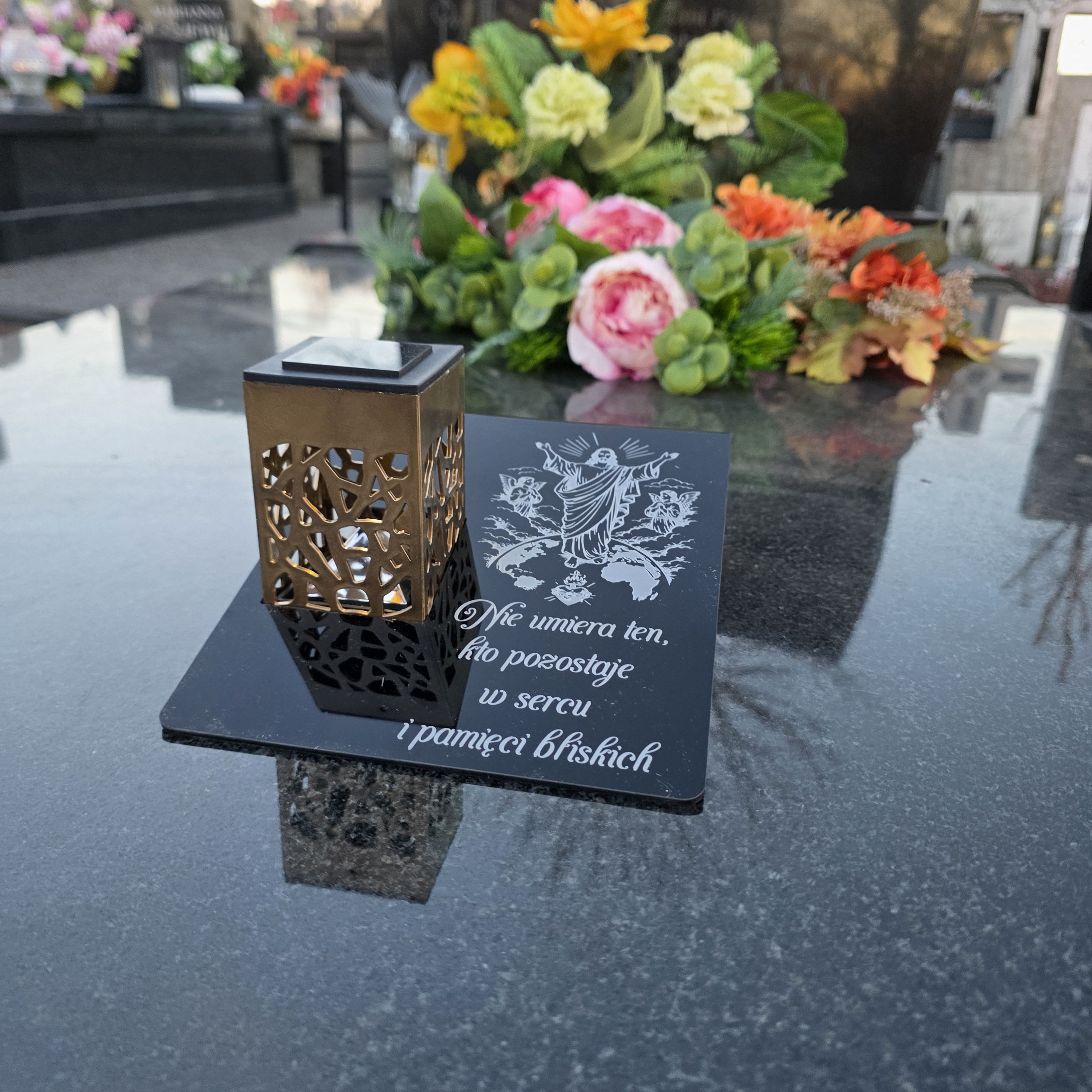Połączenie lampionu solarnego LED z tabliczką z trwałym grawerem tworzy wyjątkową kompozycję pamięci i wiary.