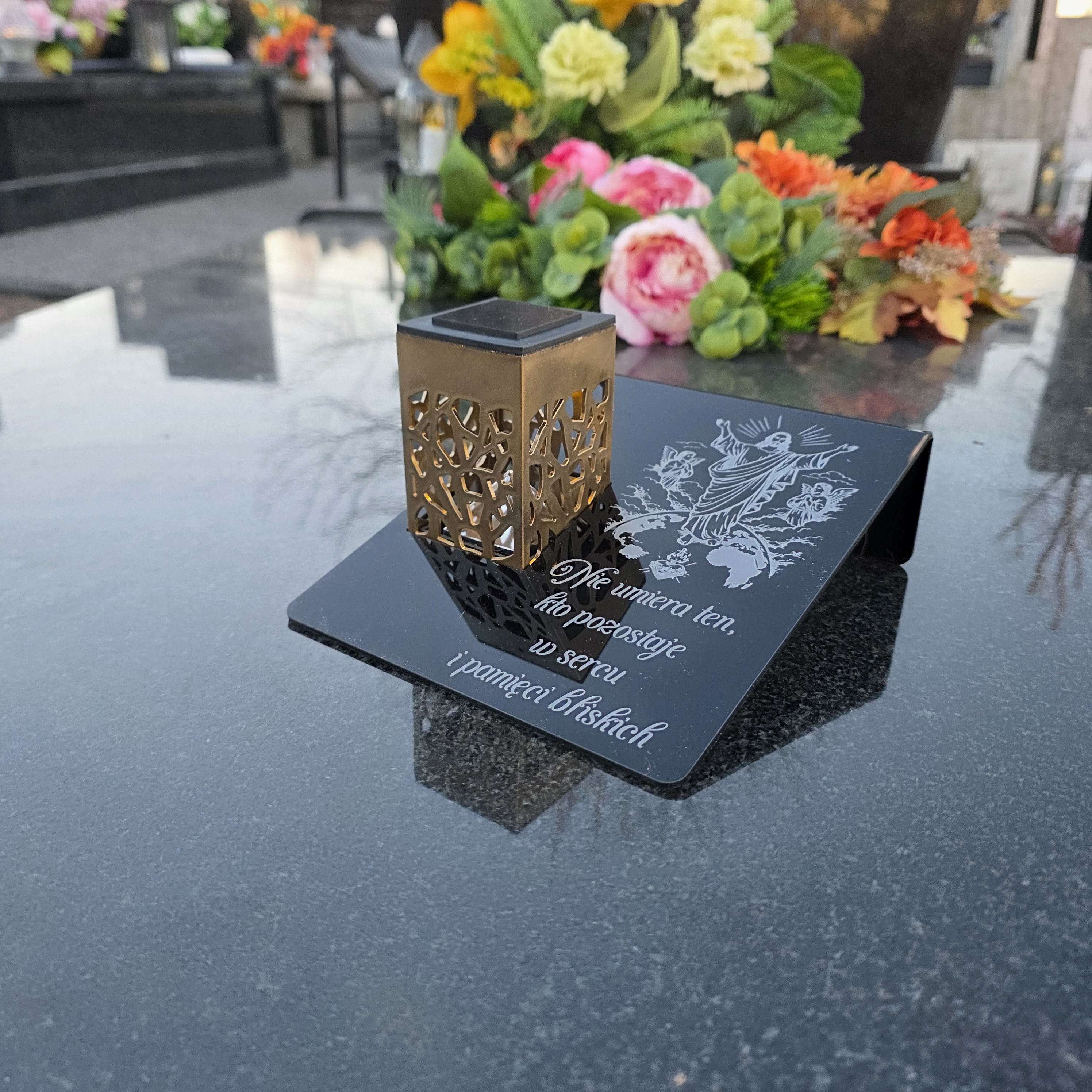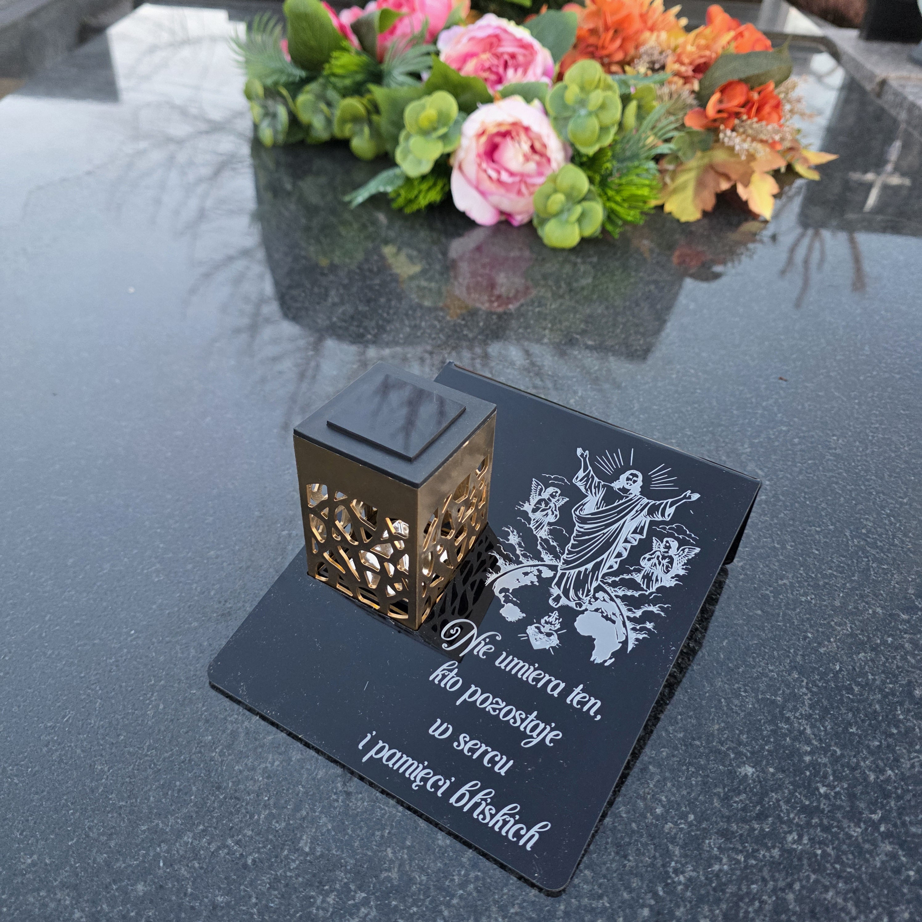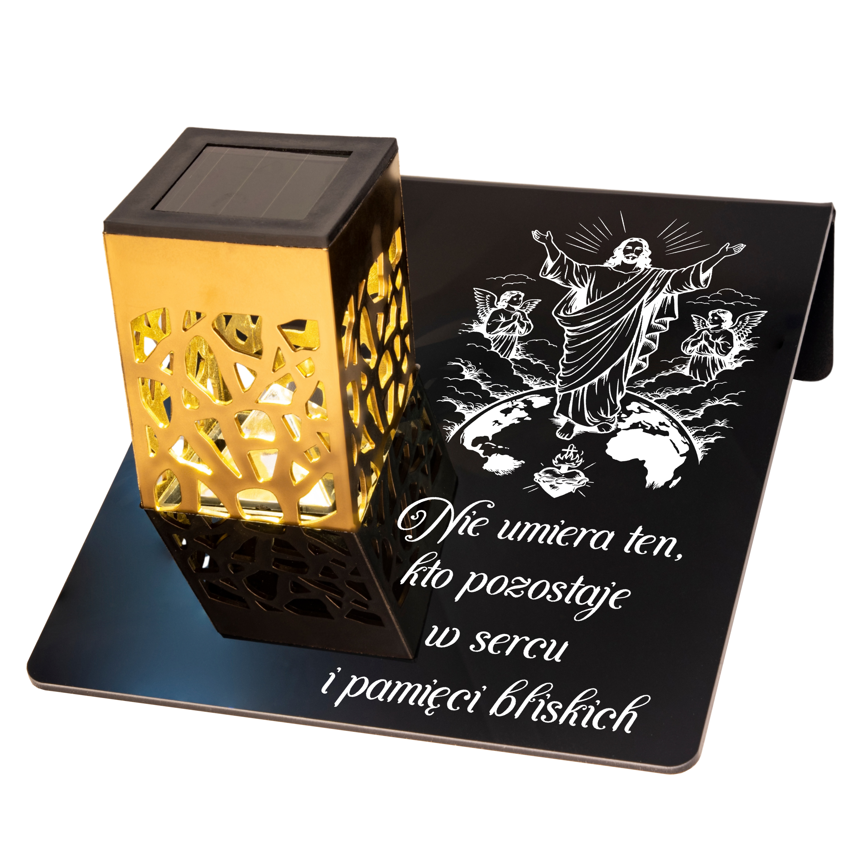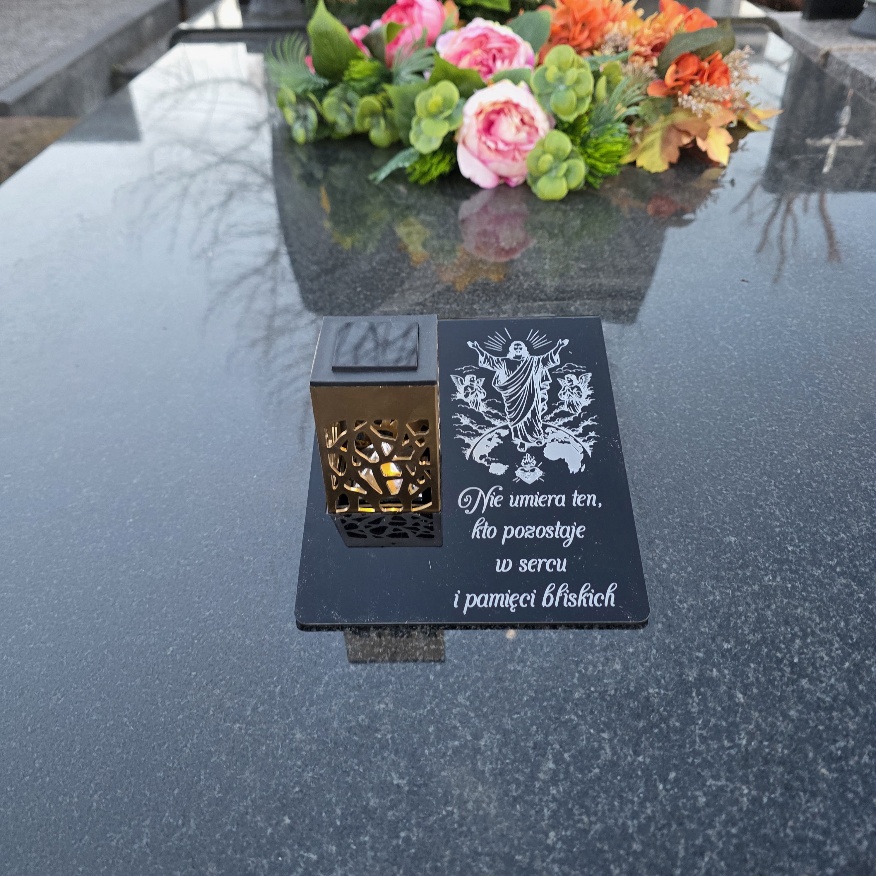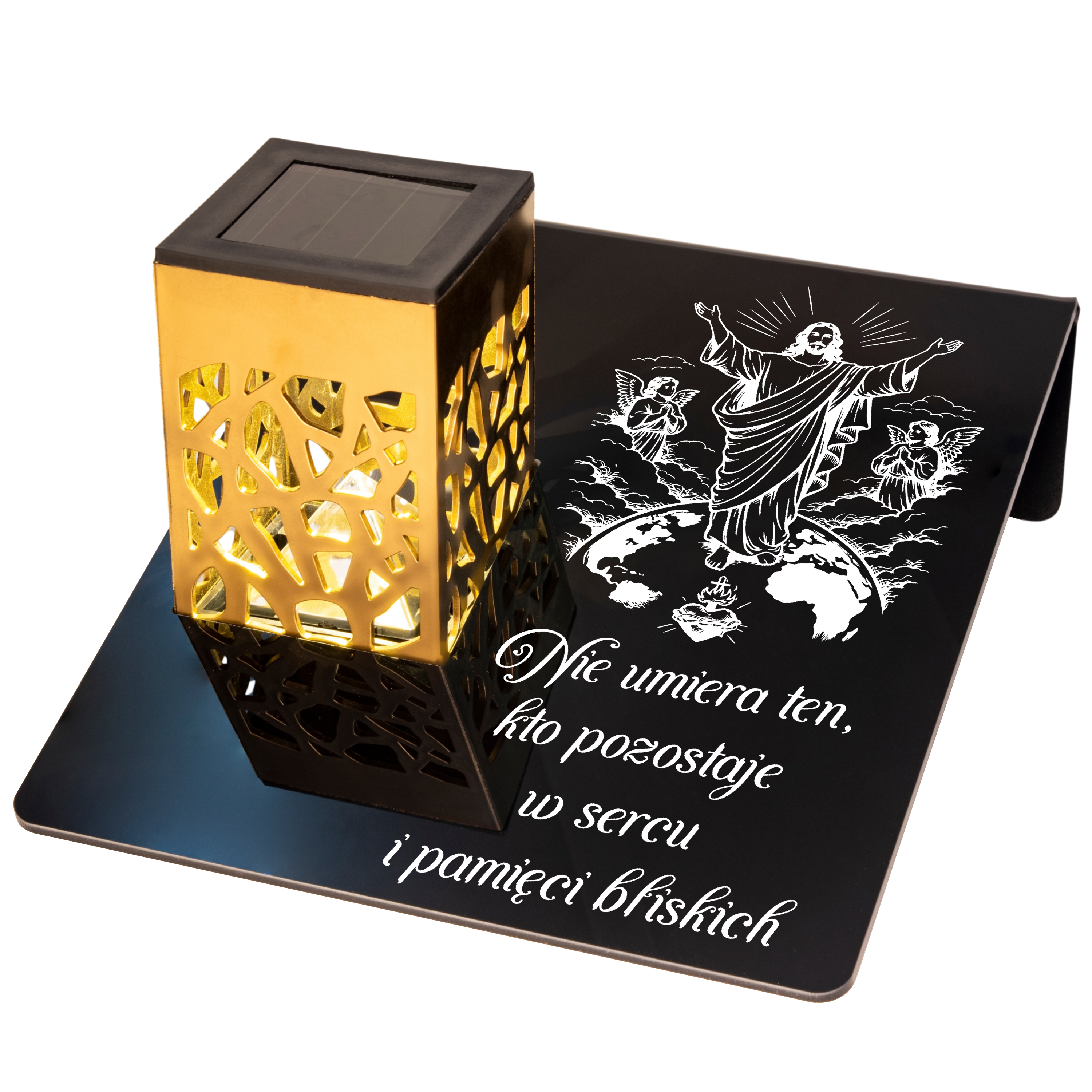 Połączenie lampionu solarnego LED z tabliczką z trwałym grawerem tworzy wyjątkową kompozycję pamięci i wiary.