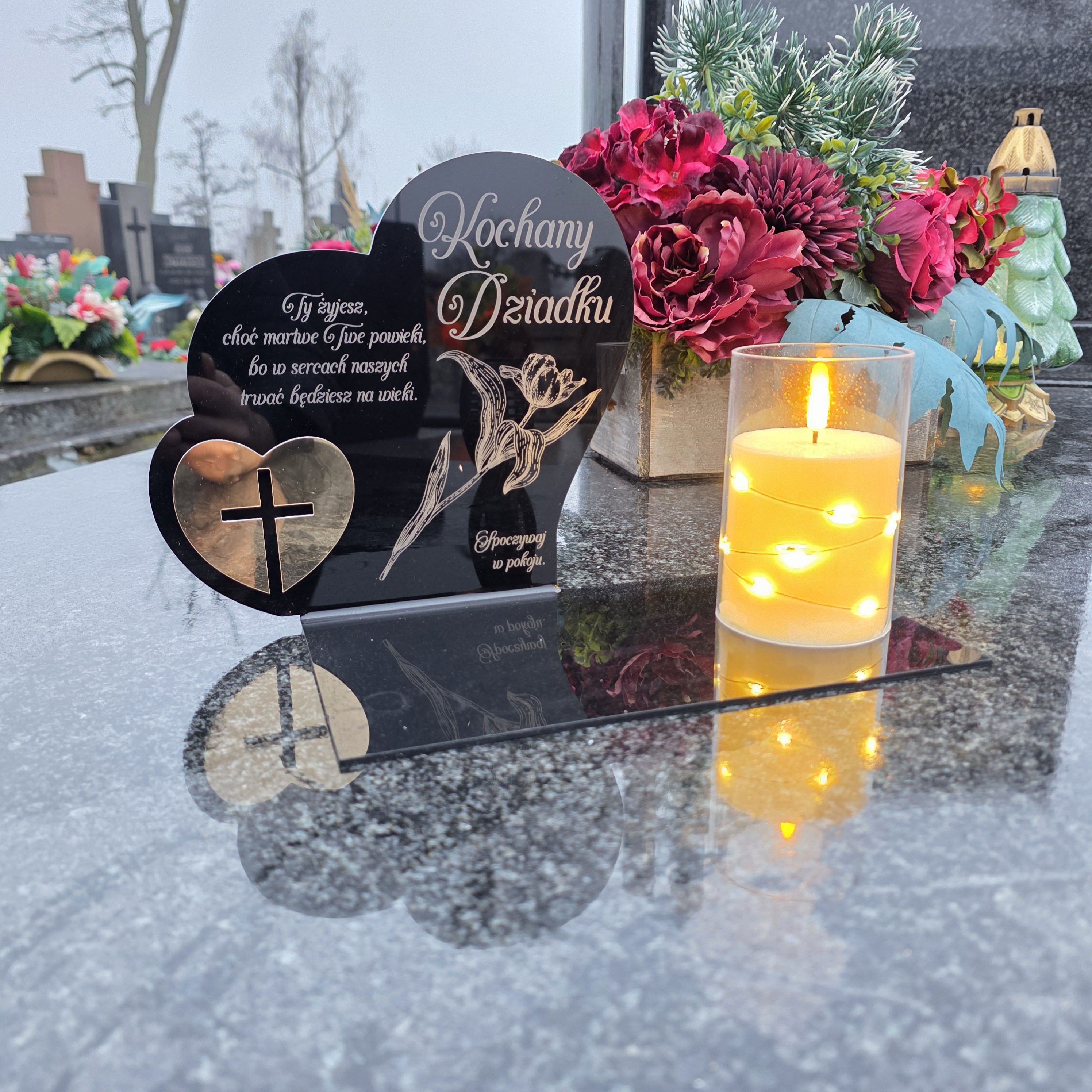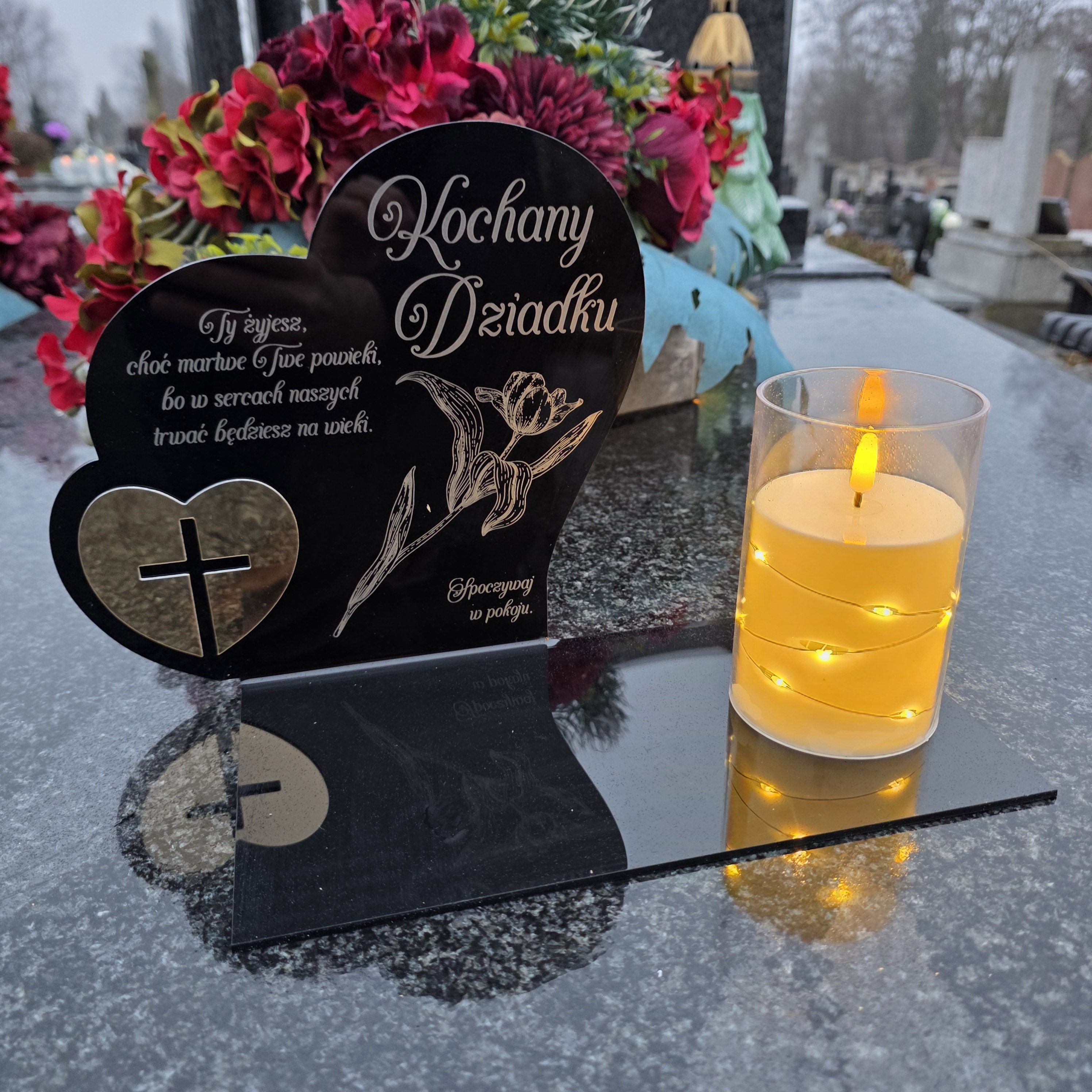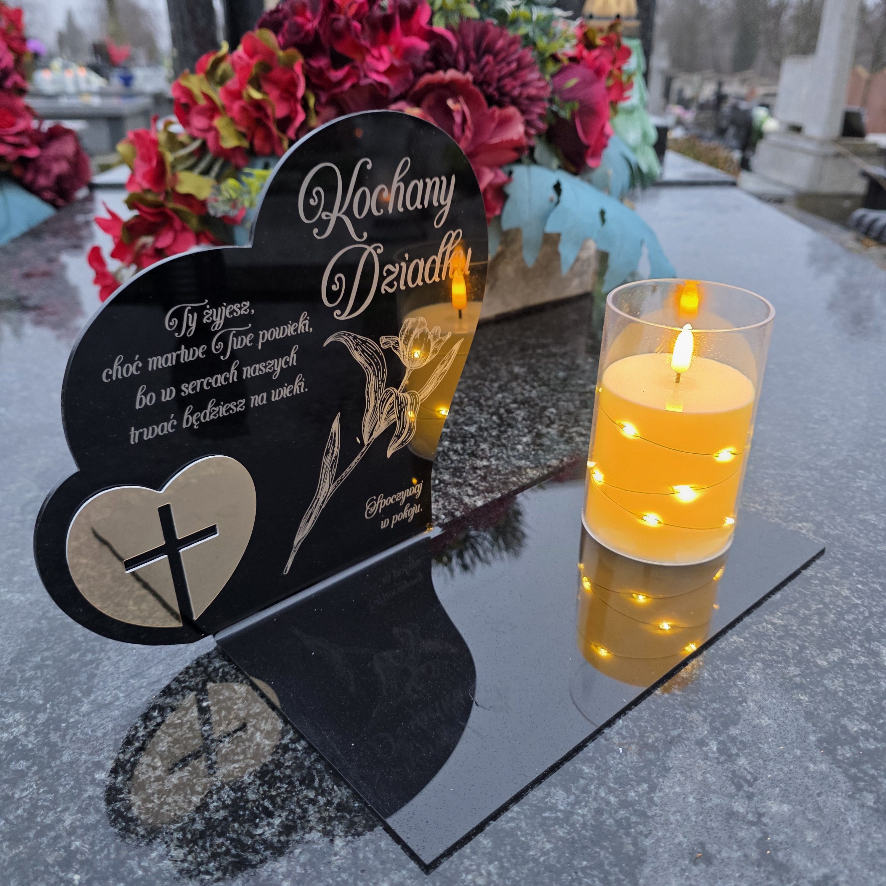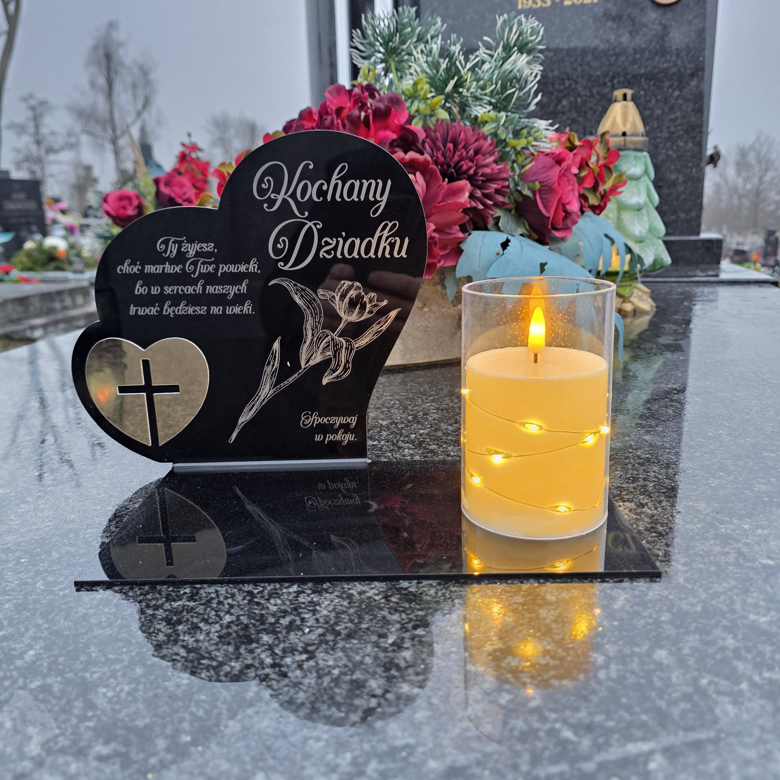 Znicz solarny nagrobny „Kochany Dziadku” z sercem i ozdobną lampką