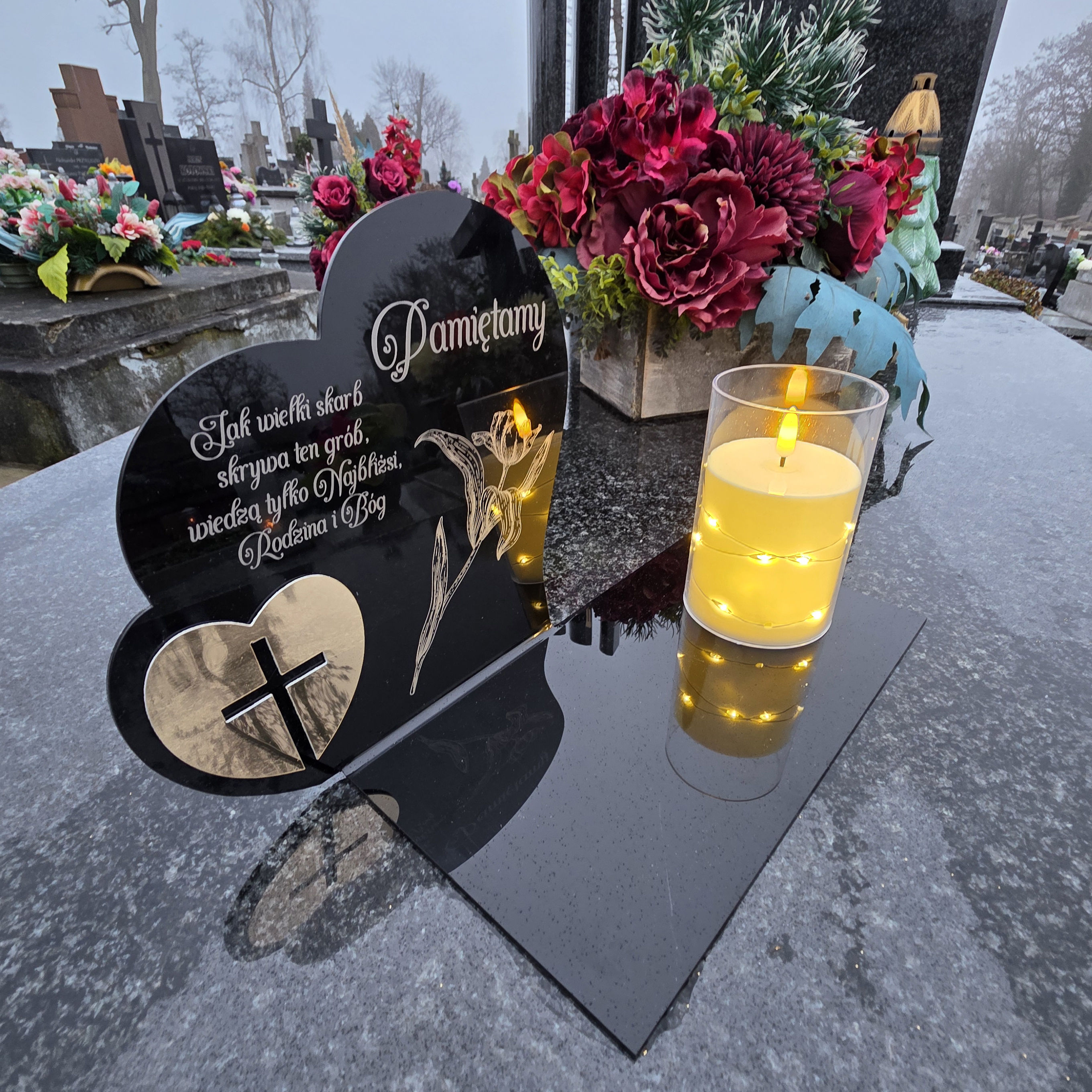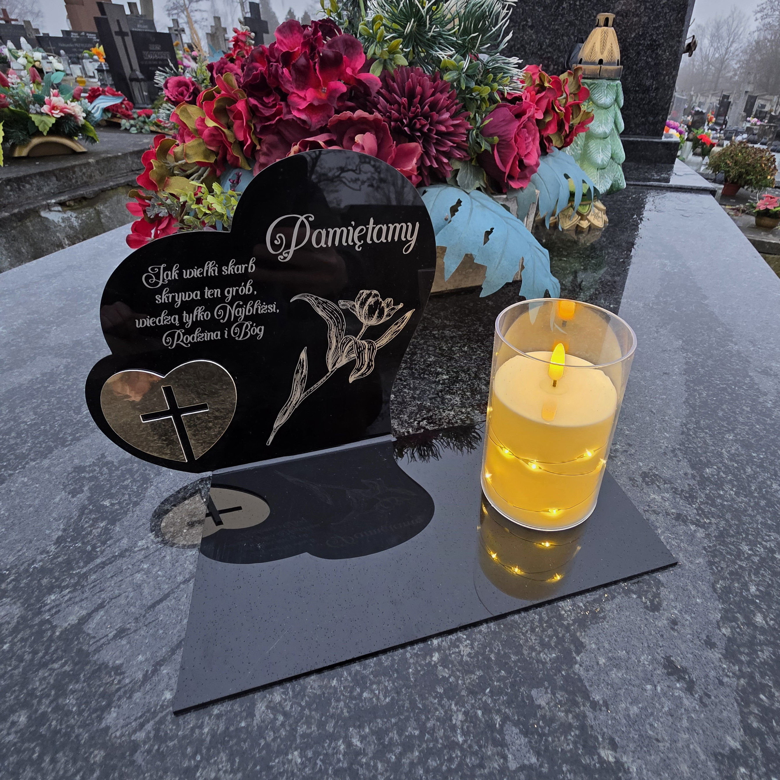 Znicz nagrobny z sercem i ozdobną lampką