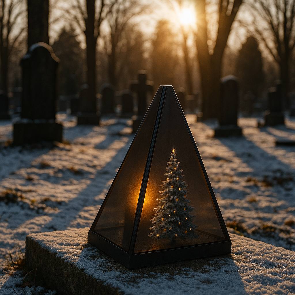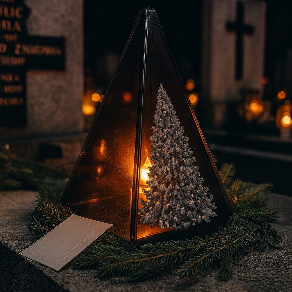 Ekskluzywny Znicz LED Piramida 20 cm – Lustro Weneckie z Ciepłym Płomieniem i Świąteczną Dekoracją
