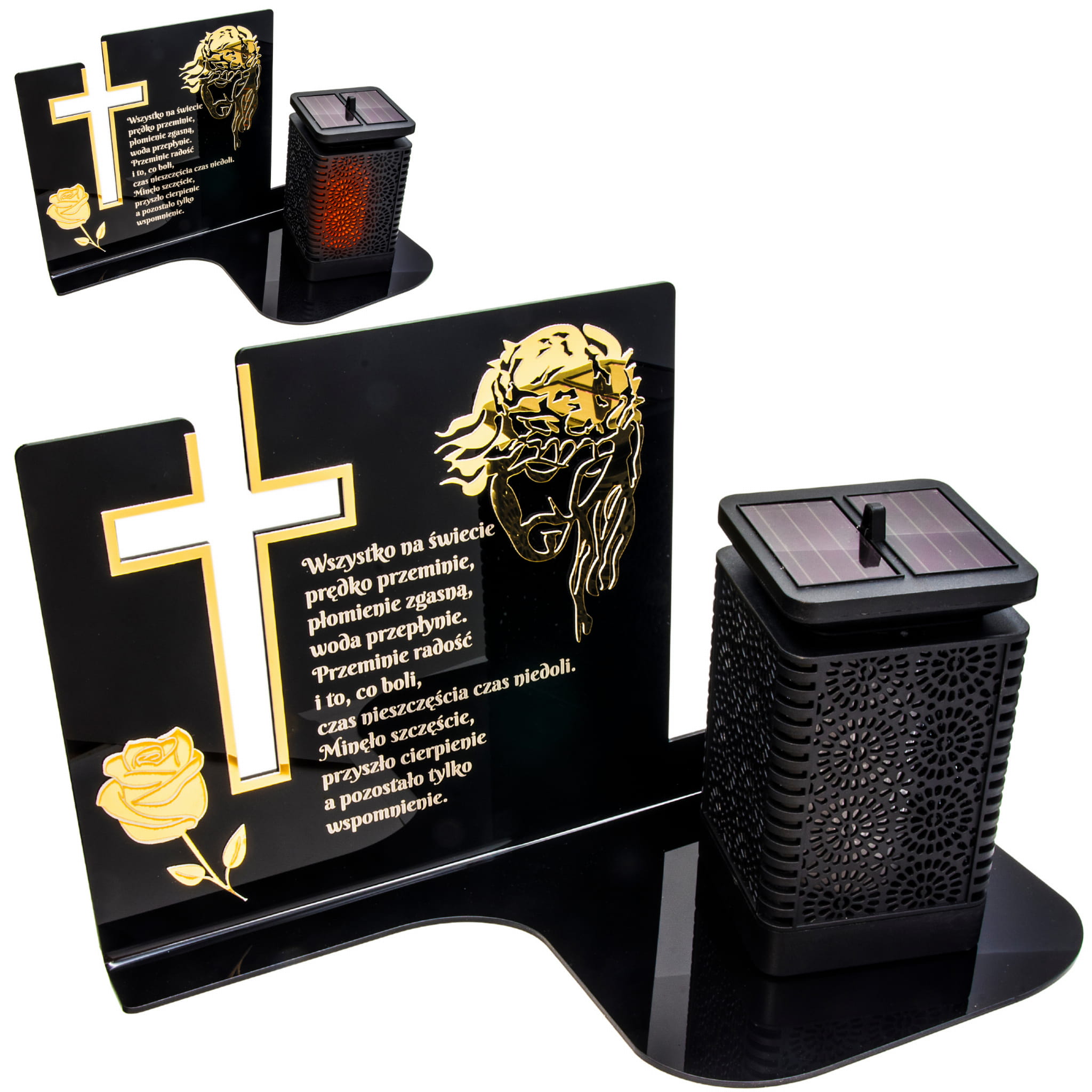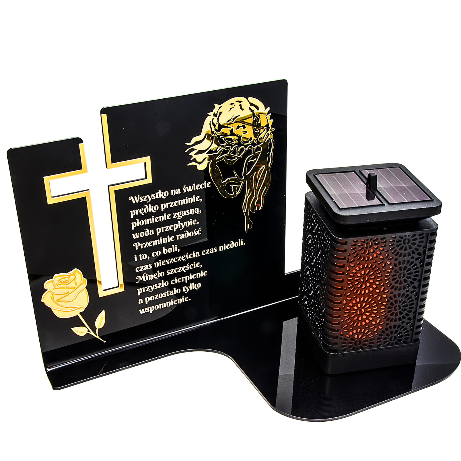 WIECZNY ZNICZ SOLARNY NA GRÓB Z GRAWEROWANĄ PODSTAWKĄ ZE SZKŁA AKRYLOWEGO OZDOBIONA ZŁOTYM MOTYWEM
