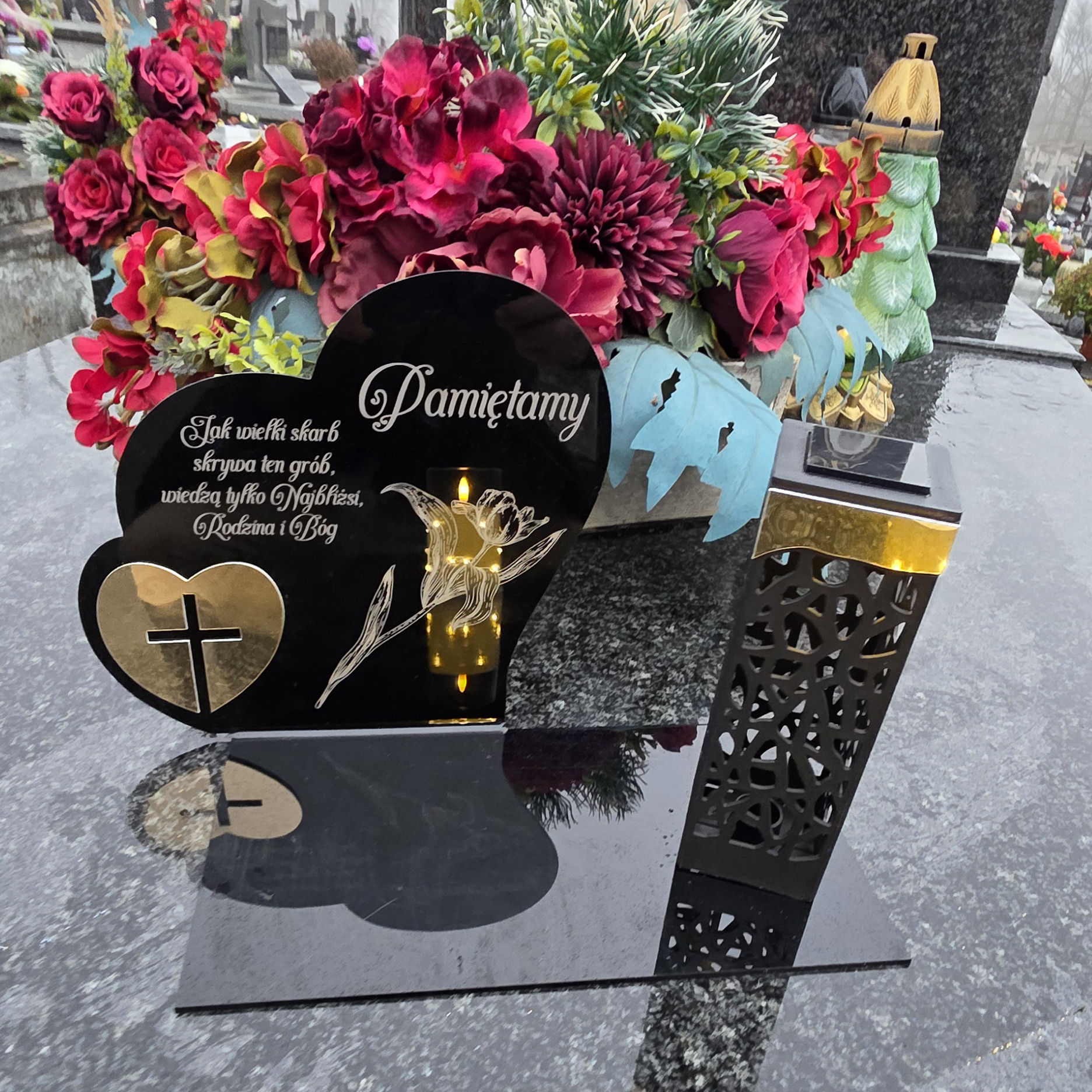 Znicz solarny nagrobny z sercem i ozdobną lampką