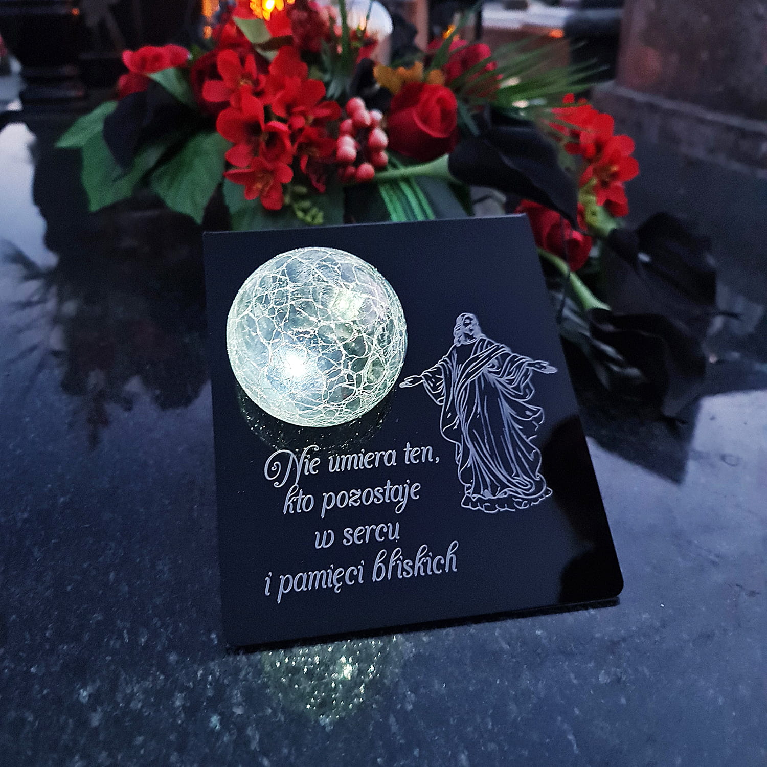 Elegancki znicz solarny LED na grób, który świeci w dwóch trybach: białym oraz kolorowym RGB, z grawerowaną podstawką ze szkła akrylowego.