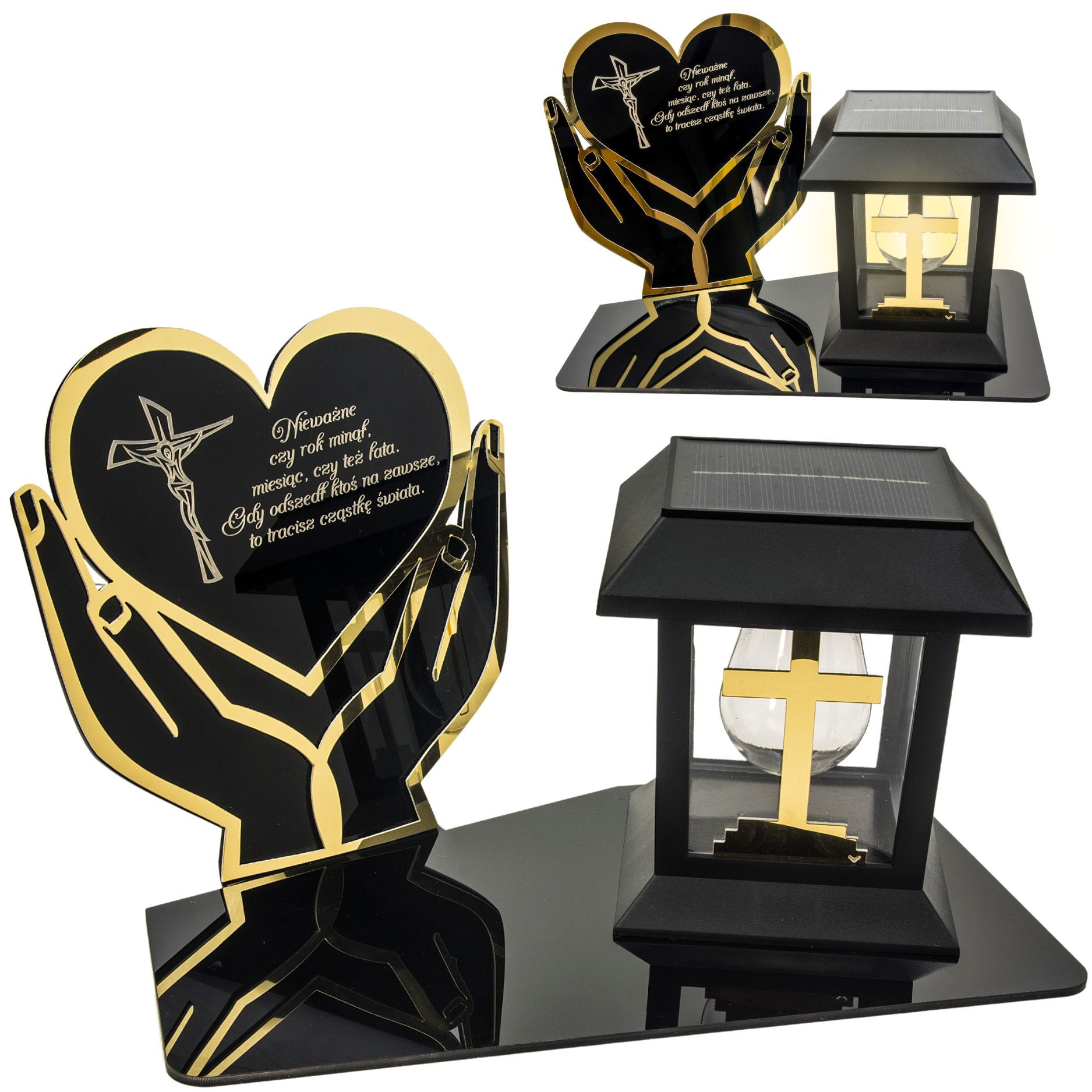 WIECZNY ZNICZ SOLARNY NA GRÓB Z GRAWEROWANĄ PODSTAWKĄ ZE SZKŁA AKRYLOWEGO OZDOBIONA MOTYWEM ZŁOTYCH RĄK Z SERCEM