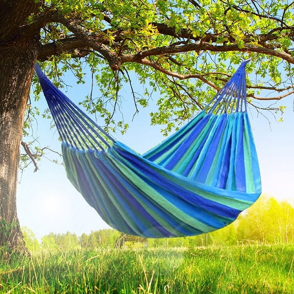 Wytrzymały hamak wiszący do ogrodu. Super wygodny! Nie ma nic lepszego niż wypoczynek na łonie natury, delikatnie kołysząc się w miękkim hamaku! Wystarczy przywiązać dwa końce hamaka do drzew lub wytrzymałych słupków i już możesz cieszyć się wygodą.